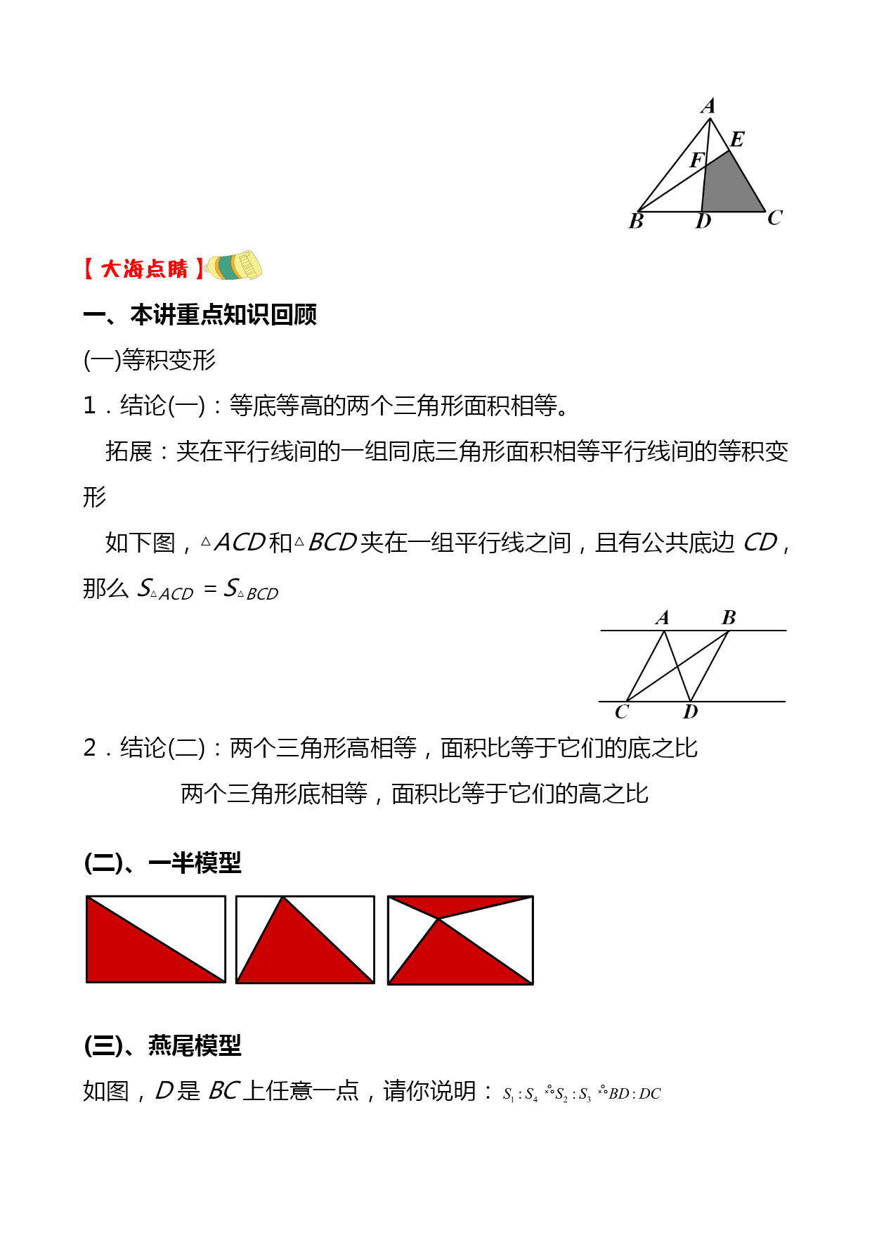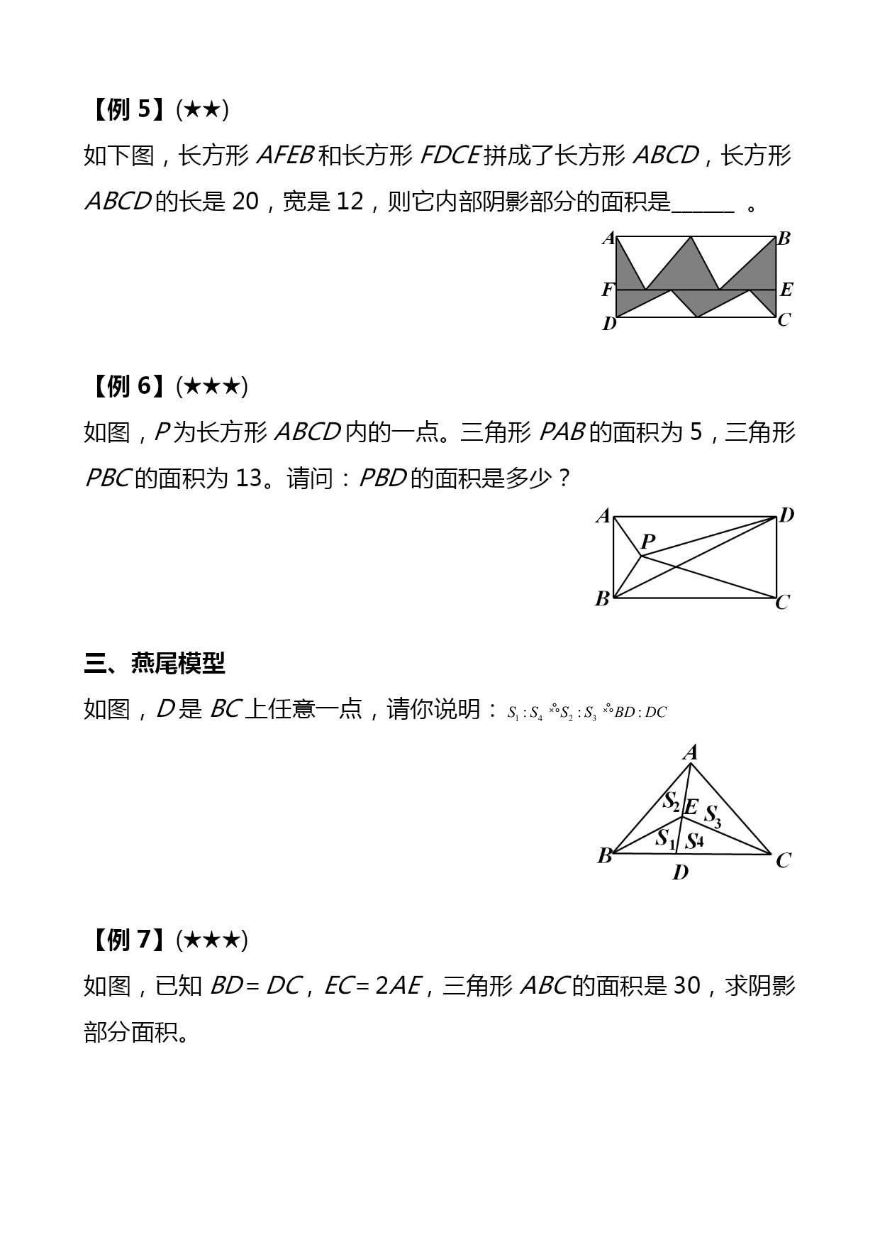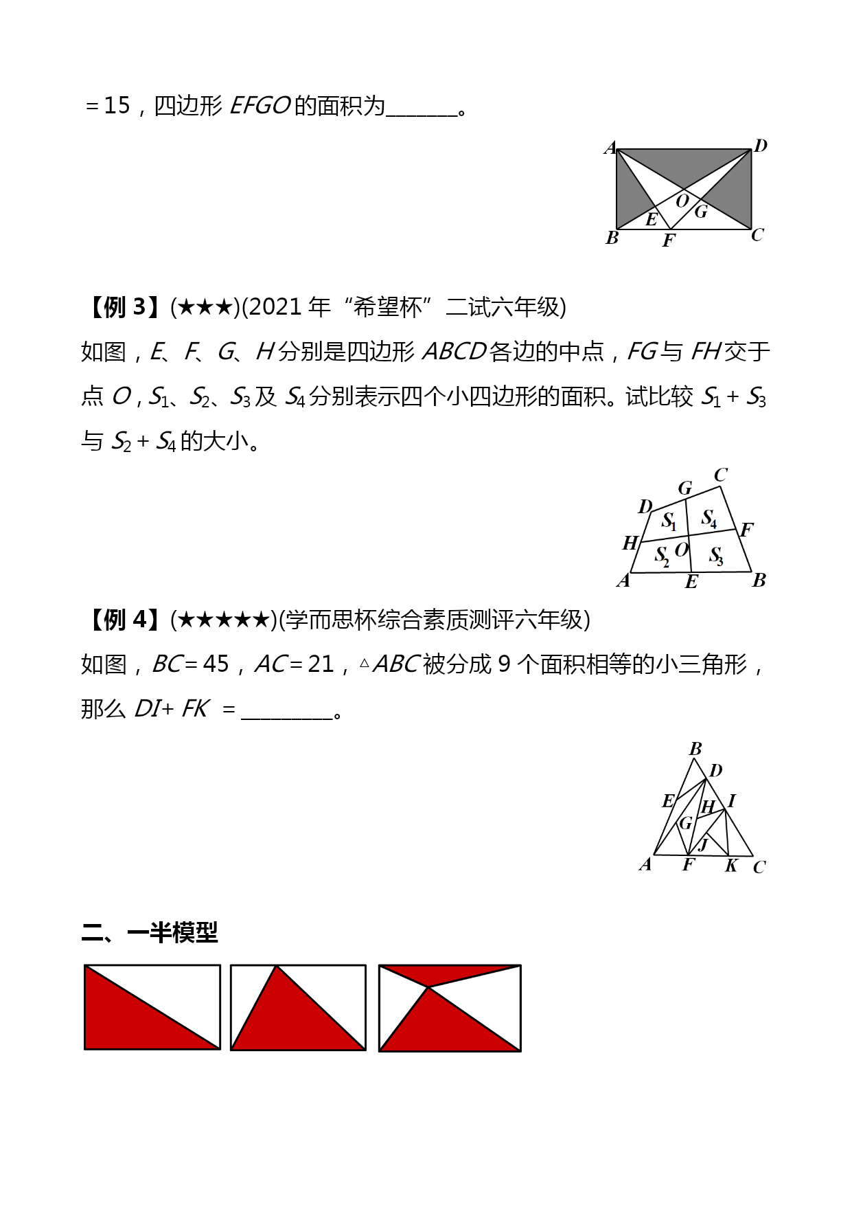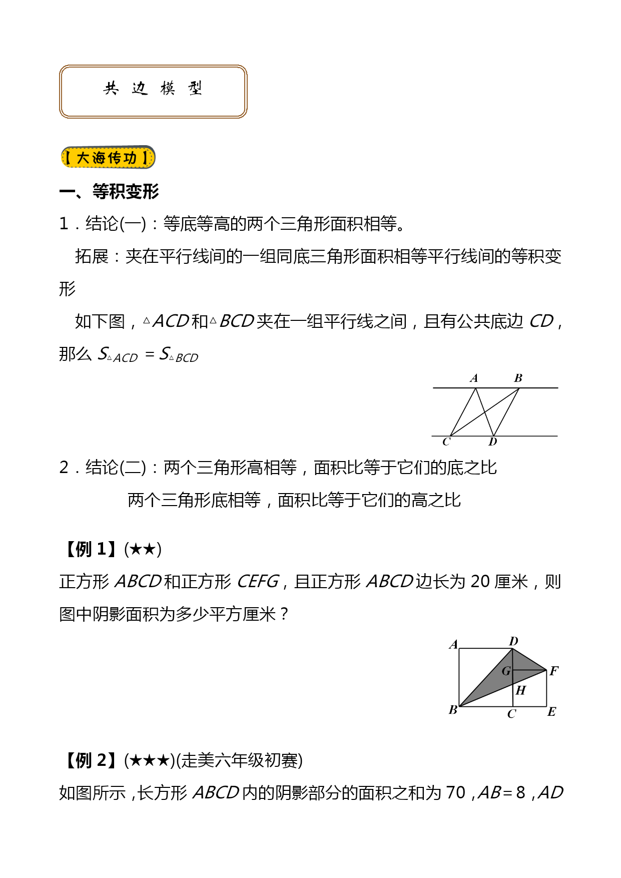 暑期五年级奥数竞赛班第4讲共边模型汇编(完整版)资料(可以直接使用,可编辑优秀版资料,欢迎下载)共边模型一、等积变形1.结论(一):等底等高的两个三角形面积相等。拓展:夹在平行线间的一组同底三角形面积相等平行线间的等积变形如下图,△ACD和△BCD夹在一组平行线之间,且有公共底边CD,那么S△ACD=S△BCD2.结论(二):两个三角形高相等,面积比等于它们的底之比两个三角形底相等,面积比等于它们的高之比【例1】(★★)正方形ABCD和正方形CEFG,且正方形ABCD边长为20厘米,则图中阴影面积为多少平方厘米?【例2】(★★★)(走美六年级初赛)如图所示,长方形ABCD内的阴影部分的面积之和为70,AB=8,AD=15,四边形EFGO的面积为_______。【例3】(★★★)(2021年“希望杯”二试六年级)如图,E、F、G、H分别是四边形ABCD各边的中点,FG与FH交于点O,S1、S2、S3及S4分别表示四个小四边形的面积。试比较S1+S3与S2+S4的大小。【例4】(★★★★★)(学而思杯综合素质测评六年级)如图,BC=45,AC=21,△ABC被分成9个面积相等的小三角形,那么DI+FK=_________。二、一半模型【例5】(★★)如下图,长方形AFEB和长方形FDCE拼成了长方形ABCD,长方形ABCD的长是20,宽是12,则它内部阴影部分的面积是______。【例6】(★★★)如图,P为长方形ABCD内的一点。三角形PAB的面积为5,三角形PBC的面积为13。请问:PBD的面积是多少?三、燕尾模型如图,D是BC上任意一点,请你说明:【例7】(★★★)如图,已知BD=DC,EC=2AE,三角形ABC的面积是30,求阴影部分面积。一、本讲重点知识回顾(一)等积变形1.结论(一):等底等高的两个三角形面积相等。拓展:夹在平行线间的一组同底三角形面积相等平行线间的等积变形如下图,△ACD和△BCD夹在一组平行线之间,且有公共底边CD,那么S△ACD=S△BCD2.结论(二):两个三角形高相等,面积比等于它们的底之比两个三角形底相等,面积比等于它们的高之比(二)、一半模型(三)、燕尾模型如图,D是BC上任意一点,请你说明:二、本讲经典例题例2,例3,例6,例7数的整除性一、填空题1.四位数“3AA1”是9的倍数,那么A=_____.2.在“25□79这个数的□内填上一个数字,使这个数能被11整除,方格内应填_____.3.能同时被2、3、5整除的最大三位数是_____.4.能同时被2、5、7整除的最大五位数是_____.5.1至100以内所有不能被3整除的数的和是_____.6.所有能被3整除的两位数的和是______.7.已知一个五位数□691□能被55整除,所有符合题意的五位数是_____.8.如果六位数1992□□能被105整除,那么它的最后两位数是_____.9.42□28□是99的倍数,这个数除以99所得的商是_____.10.从左向右编号为1至1991号的1991名同学排成一行,从左向右1至11报数,报数为11的同学原地不动,其余同学出列;然后留下的同学再从左向右1至11报数,报数为11的留下,其余同学出列;留下的同学第三次从左向右1至11报数,报到11的同学留下,其余同学出列,那么最后留下的同学中,从左边数第一个人的最初编号是_____号.二、解答题11.173□是个四位数字.数学老师说:“我在这个□中先后填入3个数字,所得到的3个四位数,依次可被9、11、6整除.”问:数学老师先后填入的3个数字的和是多少?12.在1992后面补上三个数字,组成一个七位数,使它们分别能被2、3、5、11整除,这个七位数最小值是多少?13.在“改革”村的黑市上,人们只要有心,总是可以把两张任意的食品票换成3张其他票券,也可以反过来交换.试问,合作社成员瓦夏能否将100张黄油票换成100张香肠票,并且在整个交换过程中刚好出手了1991张票券?14.试找出这样的最小自然数,它可被11整除,它的各位数字之和等于13.———————————————答案——————————————————————1.7已知四位数3AA1正好是9的倍数,则其各位数字之和3+A+A+1一定是9的倍数,可能是9的1倍或2倍,可用试验法试之.设3+A+A+1=9,则A=2.5,不合题意.再设3+A+A+1=18,则A=7,符合题意.事实上,37719=419.2.1这个数奇数位上数字和