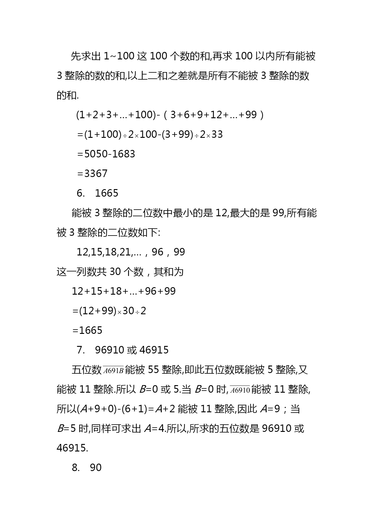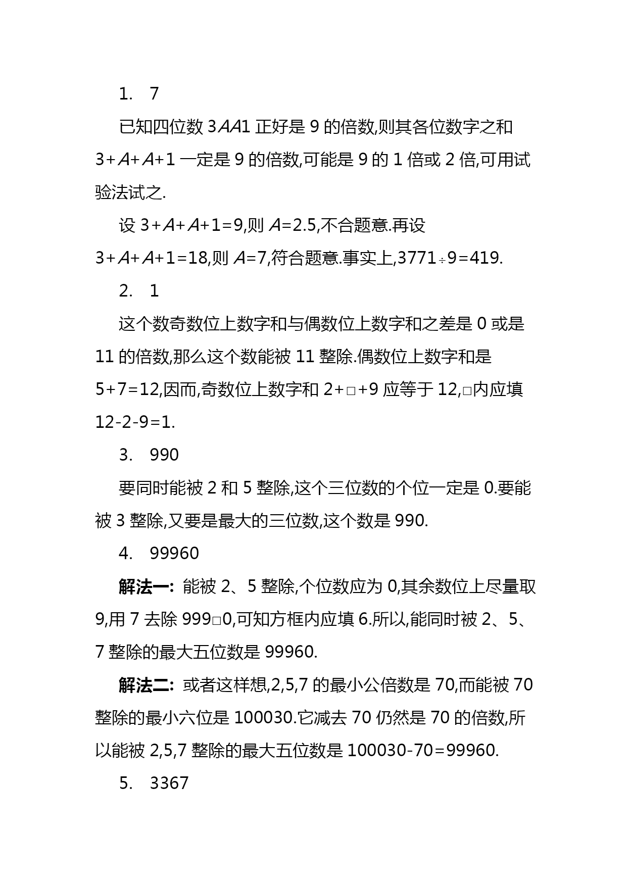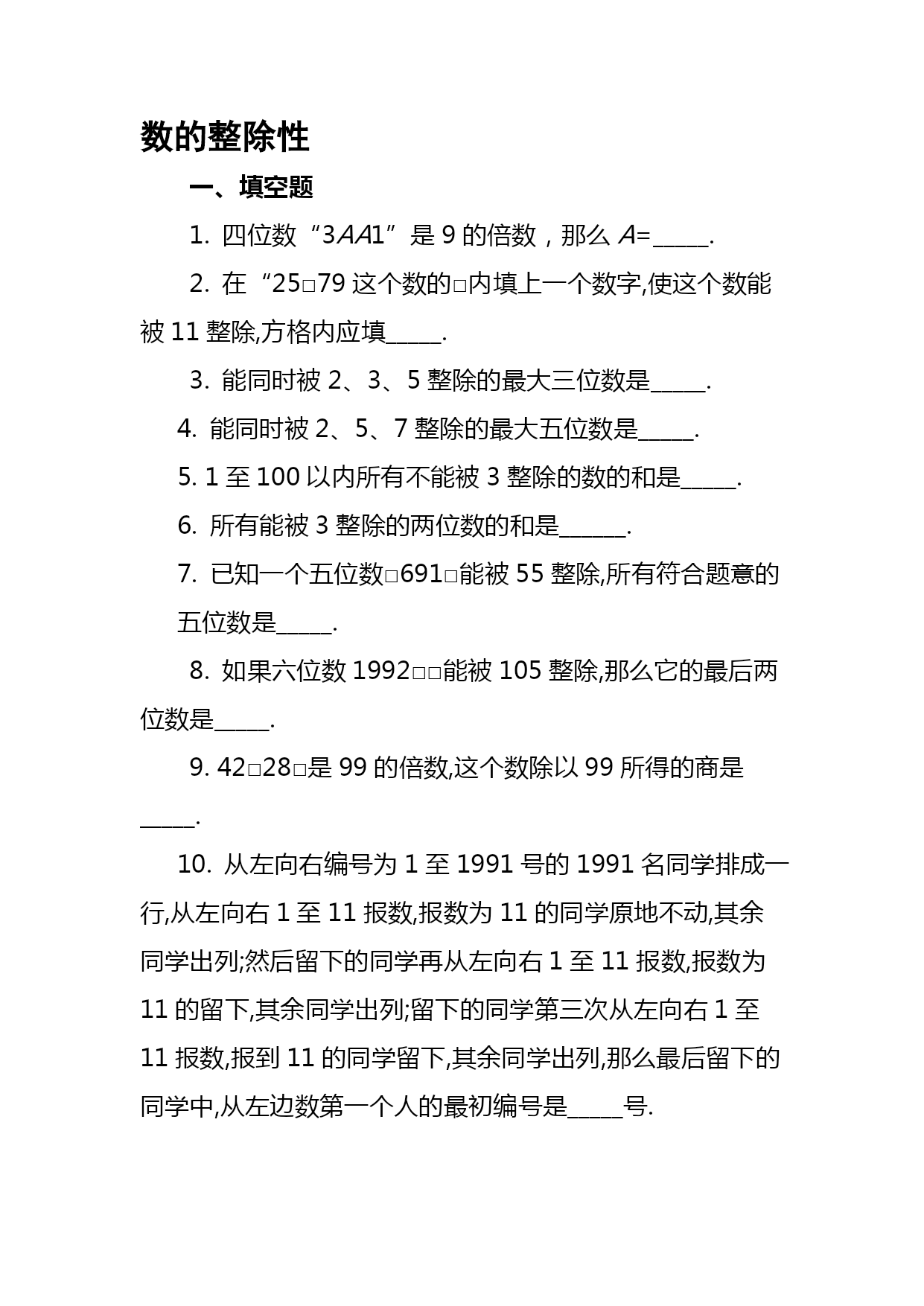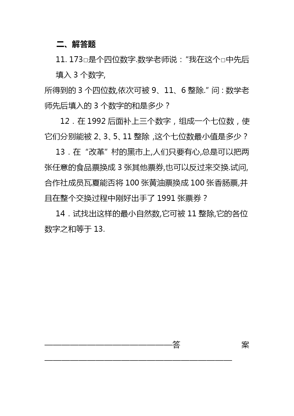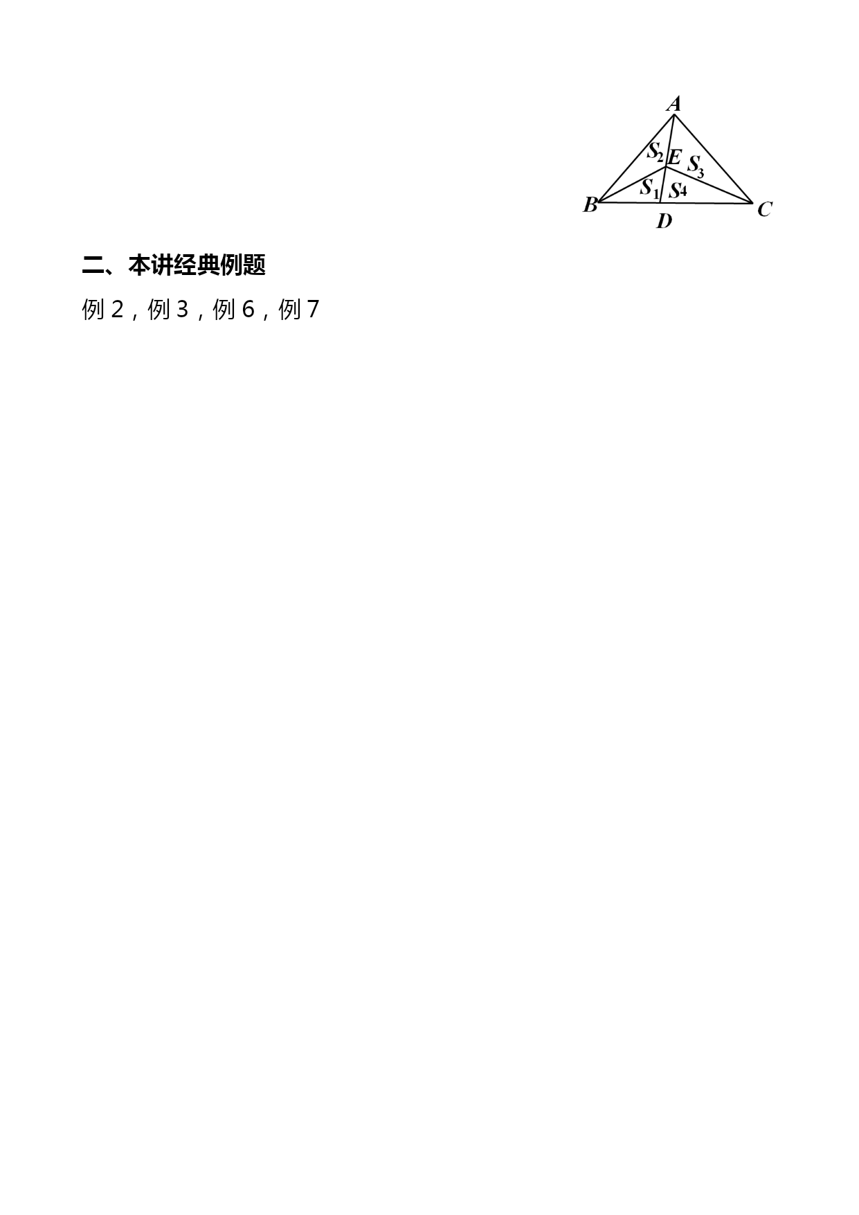 暑期五年级奥数竞赛班第4讲共边模型汇编(完整版)资料(可以直接使用,可编辑优秀版资料,欢迎下载)共边模型一、等积变形1.结论(一):等底等高的两个三角形面积相等。拓展:夹在平行线间的一组同底三角形面积相等平行线间的等积变形如下图,△ACD和△BCD夹在一组平行线之间,且有公共底边CD,那么S△ACD=S△BCD2.结论(二):两个三角形高相等,面积比等于它们的底之比两个三角形底相等,面积比等于它们的高之比【例1】(★★)正方形ABCD和正方形CEFG,且正方形ABCD边长为20厘米,则图中阴影面积为多少平方厘米?【例2】(★★★)(走美六年级初赛)如图所示,长方形ABCD内的阴影部分的面积之和为70,AB=8,AD=15,四边形EFGO的面积为_______。【例3】(★★★)(2021年“希望杯”二试六年级)如图,E、F、G、H分别是四边形ABCD各边的中点,FG与FH交于点O,S1、S2、S3及S4分别表示四个小四边形的面积。试比较S1+S3与S2+S4的大小。【例4】(★★★★★)(学而思杯综合素质测评六年级)如图,BC=45,AC=21,△ABC被分成9个面积相等的小三角形,那么DI+FK=_________。二、一半模型【例5】(★★)如下图,长方形AFEB和长方形FDCE拼成了长方形ABCD,长方形ABCD的长是20,宽是12,则它内部阴影部分的面积是______。【例6】(★★★)如图,P为长方形ABCD内的一点。三角形PAB的面积为5,三角形PBC的面积为13。请问:PBD的面积是多少?三、燕尾模型如图,D是BC上任意一点,请你说明:【例7】(★★★)如图,已知BD=DC,EC=2AE,三角形ABC的面积是30,求阴影部分面积。一、本讲重点知识回顾(一)等积变形1.结论(一):等底等高的两个三角形面积相等。拓展:夹在平行线间的一组同底三角形面积相等平行线间的等积变形如下图,△ACD和△BCD夹在一组平行线之间,且有公共底边CD,那么S△ACD=S△BCD2.结论(二):两个三角形高相等,面积比等于它们的底之比两个三角形底相等,面积比等于它们的高之比(二)、一半模型(三)、燕尾模型如图,D是BC上任意一点,请你说明:二、本讲经典例题例2,例3,例6,例7数的整除性一、填空题1.四位数“3AA1”是9的倍数,那么A=_____.2.在“25□79这个数的□内填上一个数字,使这个数能被11整除,方格内应填_____.3.能同时被2、3、5整除的最大三位数是_____.4.能同时被2、5、7整除的最大五位数是_____.5.1至100以内所有不能被3整除的数的和是_____.6.所有能被3整除的两位数的和是______.7.已知一个五位数□691□能被55整除,所有符合题意的五位数是_____.8.如果六位数1992□□能被105整除,那么它的最后两位数是_____.9.42□28□是99的倍数,这个数除以99所得的商是_____.10.从左向右编号为1至1991号的1991名同学排成一行,从左向右1至11报数,报数为11的同学原地不动,其余同学出列;然后留下的同学再从左向右1至11报数,报数为11的留下,其余同学出列;留下的同学第三次从左向右1至11报数,报到11的同学留下,其余同学出列,那么最后留下的同学中,从左边数第一个人的最初编号是_____号.二、解答题11.173□是个四位数字.数学老师说:“我在这个□中先后填入3个数字,所得到的3个四位数,依次可被9、11、6整除.”问:数学老师先后填入的3个数字的和是多少?12.在1992后面补上三个数字,组成一个七位数,使它们分别能被2、3、5、11整除,这个七位数最小值是多少?13.在“改革”村的黑市上,人们只要有心,总是可以把两张任意的食品票换成3张其他票券,也可以反过来交换.试问,合作社成员瓦夏能否将100张黄油票换成100张香肠票,并且在整个交换过程中刚好出手了1991张票券?14.试找出这样的最小自然数,它可被11整除,它的各位数字之和等于13.———————————————答案——————————————————————1.7已知四位数3AA1正好是9的倍数,则其各位数字之和3+A+A+1一定是9的倍数,可能是9的1倍或2倍,可用试验法试之.设3+A+A+1=9,则A=2.5,不合题意.再设3+A+A+1=18,则A=7,符合题意.事实上,37719=419.2.1这个数奇数位上数字和