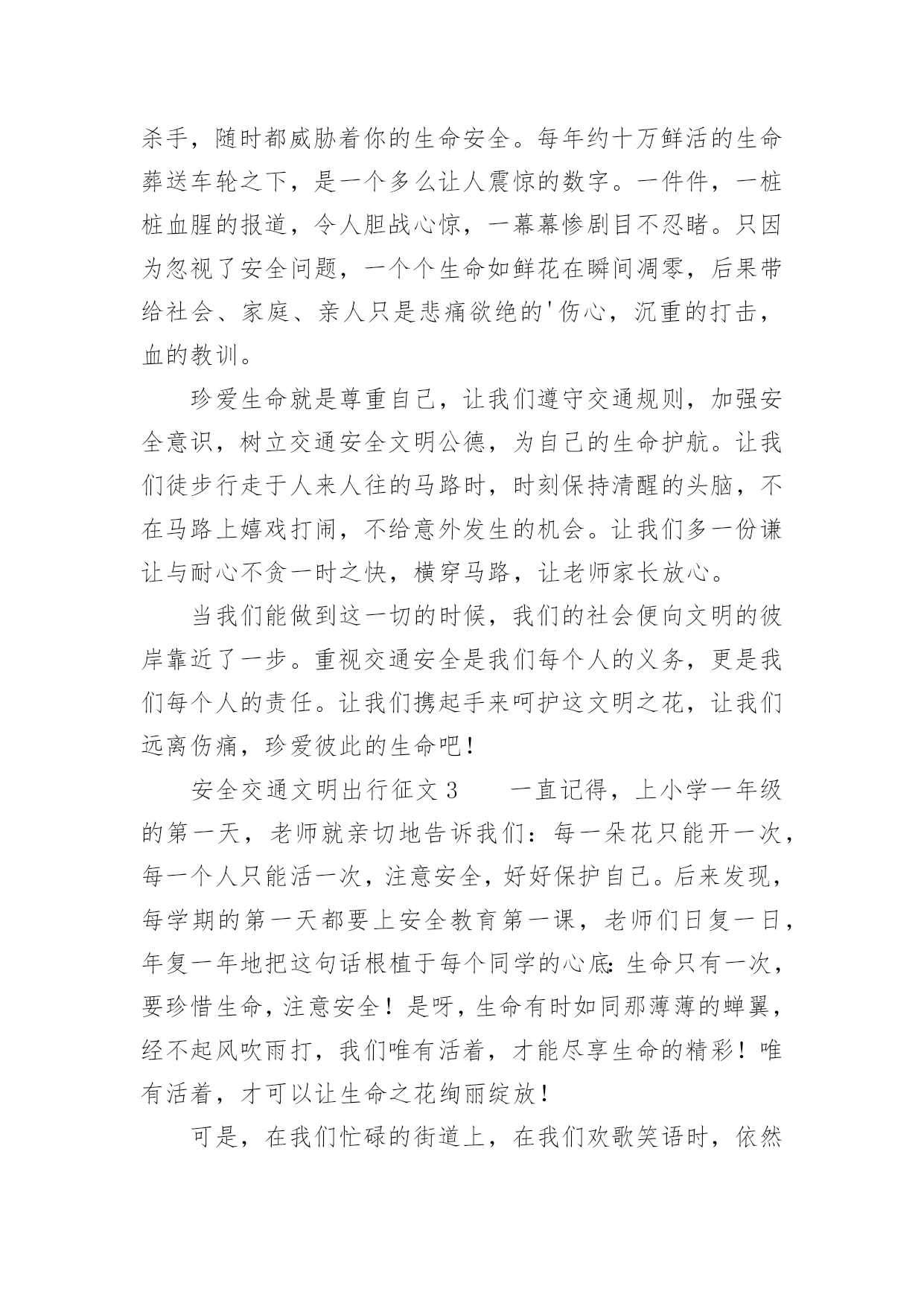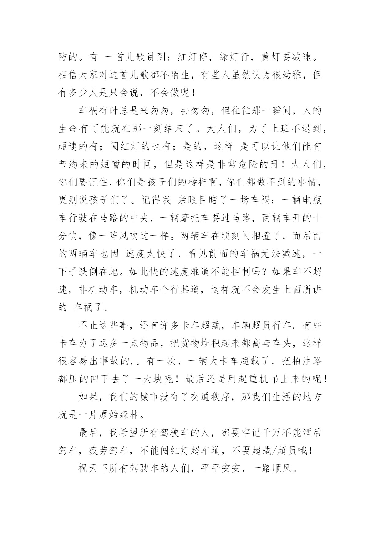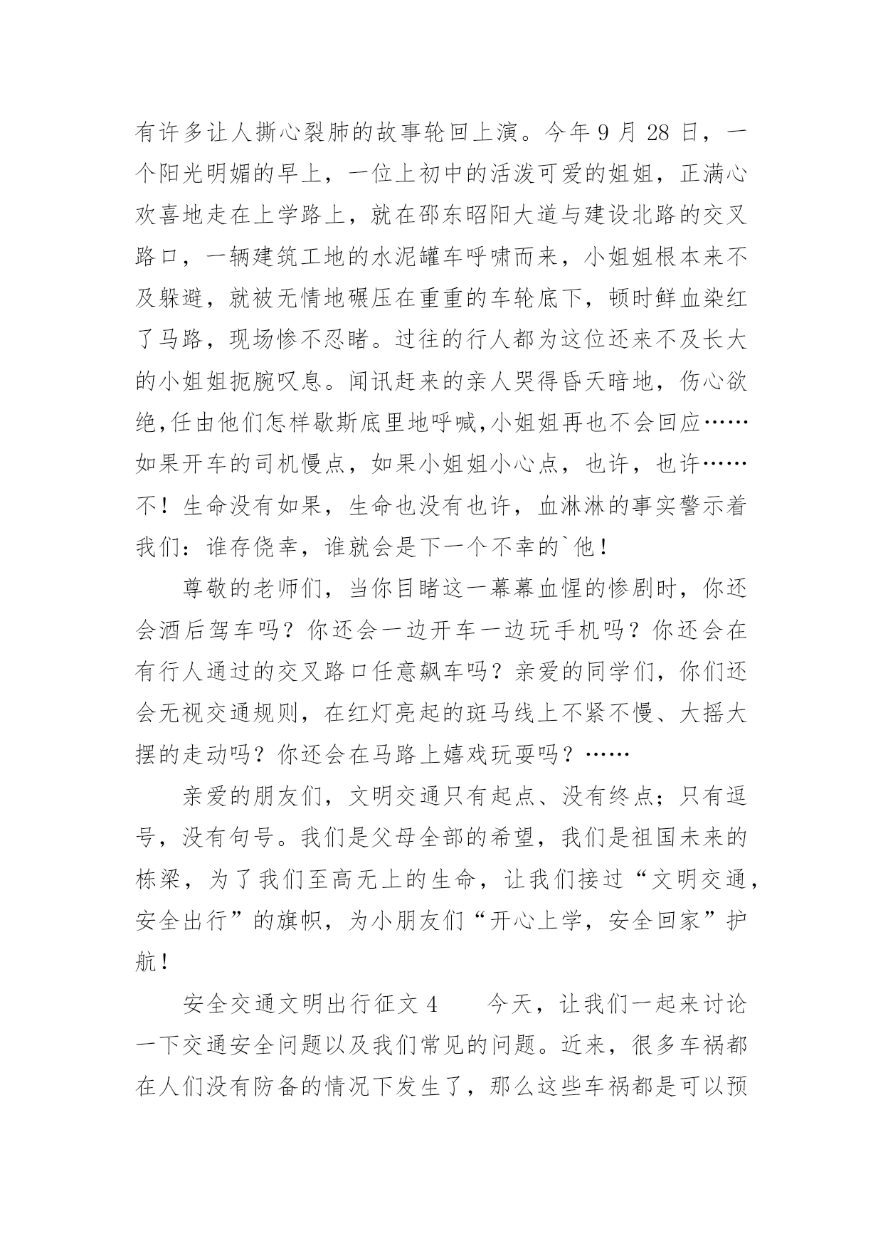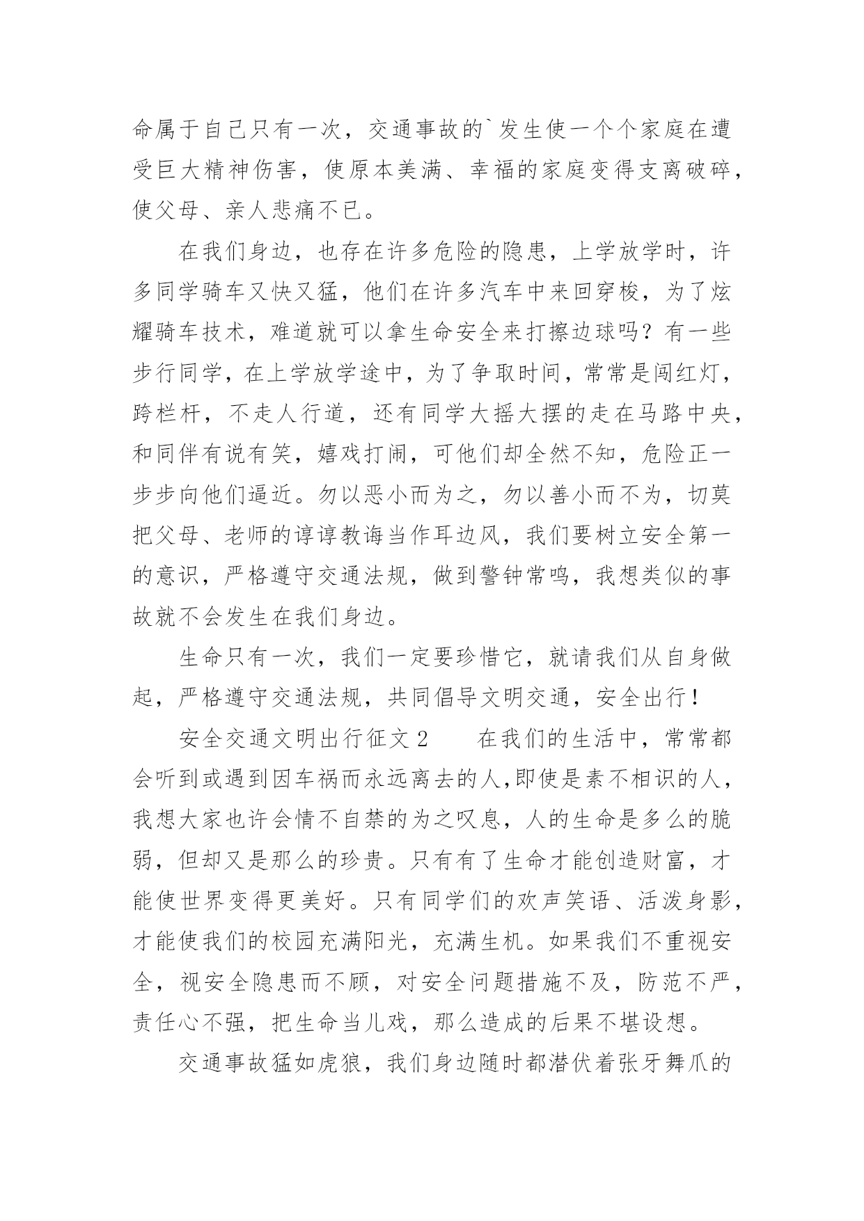 安全交通文明出行征文安全交通文明出行征文生命或似昙花一现转眼即逝,或似青松常绿长年健壮,愿我们的生命如鲜花般美丽动人,如青松般终年常绿,将生命的长度延伸到底。因此我们要做到交通安全,文明出行。下面是关于安全交通文明出行征文的内容,欢迎阅读!安全交通文明出行征文1如今的社会随着经济繁荣的发展,交通事业的发达,马路上的车辆川流不息,随着马路的日益拥挤,交通事故也出现越来越多。记得前一段时间,我听别人说在黄山区发生过一起严重车祸。一辆装满石子的大货车在左拐弯时与迎面而来的另一辆货车相撞,两车身均严重受损,驾驶室被撞得面目全非,两名驾驶员受伤严重,被送往就近医院抢救后来据当地交警称,两车速度过快、应处不当,是这起事故的主要原因。而每年,有多少生命因此被夺走,有多少个家庭被破坏,有多少人要失去亲人。这些都是血的教训,而作为中学生的我们不应该有所醒悟吗?交通事故往往都是人为的不遵守交通法规造成的。不闯红灯、不翻越护栏、不在马路中间逗留这些最普及的交通规则说起来是简单,但为什么总是有人不严格遵守呢?因为安全意识的淡薄,许多人在车水马龙的马路上演了一幕幕不可挽回的悲剧。当你看到一个个鲜活的生命已经消失,当你发现一阵阵欢声笑语已经湮没。当你面对那些触目惊心的场景时,能不感到痛心疾首吗?黄金有价,生命无价。我们的生命属于自己只有一次,交通事故的`发生使一个个家庭在遭受巨大精神伤害,使原本美满、幸福的家庭变得支离破碎,使父母、亲人悲痛不已。在我们身边,也存在许多危险的隐患,上学放学时,许多同学骑车又快又猛,他们在许多汽车中来回穿梭,为了炫耀骑车技术,难道就可以拿生命安全来打擦边球吗?有一些步行同学,在上学放学途中,为了争取时间,常常是闯红灯,跨栏杆,不走人行道,还有同学大摇大摆的走在马路中央,和同伴有说有笑,嬉戏打闹,可他们却全然不知,危险正一步步向他们逼近。勿以恶小而为之,勿以善小而不为,切莫把父母、老师的谆谆教诲当作耳边风,我们要树立安全第一的意识,严格遵守交通法规,做到警钟常鸣,我想类似的事故就不会发生在我们身边。生命只有一次,我们一定要珍惜它,就请我们从自身做起,严格遵守交通法规,共同倡导文明交通,安全出行!安全交通文明出行征文2在我们的生活中,常常都会听到或遇到因车祸而永远离去的人,即使是素不相识的人,我想大家也许会情不自禁的为之叹息,人的生命是多么的脆弱,但却又是那么的珍贵。只有有了生命才能创造财富,才能使世界变得更美好。只有同学们的欢声笑语、活泼身影,才能使我们的校园充满阳光,充满生机。如果我们不重视安全,视安全隐患而不顾,对安全问题措施不及,防范不严,责任心不强,把生命当儿戏,那么造成的后果不堪设想。交通事故猛如虎狼,我们身边随时都潜伏着张牙舞爪的杀手,随时都威胁着你的生命安全。每年约十万鲜活的生命葬送车轮之下,是一个多么让人震惊的数字。一件件,一桩桩血腥的报道,令人胆战心惊,一幕幕惨剧目不忍睹。只因为忽视了安全问题,一个个生命如鲜花在瞬间凋零,后果带给社会、家庭、亲人只是悲痛欲绝的'伤心,沉重的打击,血的教训。珍爱生命就是尊重自己,让我们遵守交通规则,加强安全意识,树立交通安全文明公德,为自己的生命护航。让我们徒步行走于人来人往的马路时,时刻保持清醒的头脑,不在马路上嬉戏打闹,不给意外发生的机会。让我们多一份谦让与耐心不贪一时之快,横穿马路,让老师家长放心。当我们能做到这一切的时候,我们的社会便向文明的彼岸靠近了一步。重视交通安全是我们每个人的义务,更是我们每个人的责任。让我们携起手来呵护这文明之花,让我们远离伤痛,珍爱彼此的生命吧!安全交通文明出行征文3一直记得,上小学一年级的第一天,老师就亲切地告诉我们:每一朵花只能开一次,每一个人只能活一次,注意安全,好好保护自己。后来发现,每学期的第一天都要上安全教育第一课,老师们日复一日,年复一年地把这句话根植于每个同学的心底:生命只有一次,要珍惜生命,注意安全!是呀,生命有时如同那薄薄的蝉翼,经不起风吹雨打,我们唯有活着,才能尽享生命的精彩!唯有活着,才可以让生命之花绚丽绽放!可是,在我们忙碌的街道上,在我们欢歌笑语时,依然有许多让人撕心裂肺的故事轮回上演。今年9月28日,一个阳光明媚的早上,一位上初中的活泼可爱的姐姐,正满心欢喜地走在上学路上,就在邵东昭阳大道与建设北路的交叉路口,一辆建筑工地的水泥罐车呼啸而来,小姐姐根本来不及躲避,就被无情地碾压在重重的车轮底下,顿时鲜血染红了马路,现场惨不忍睹。过往的行人都为这位还来不及长大的小姐姐扼腕叹息。闻讯赶来的亲人哭得昏天暗地,伤心欲绝,任由他们怎样歇斯底里地呼喊,小姐姐再也不会回应……如果开车的司机慢点,如果小姐姐小心点,也许,也许……不!生命没有如果,生命也没有也许,血淋淋的事实警示着我们:谁存侥幸,谁就会是下一个不幸的`他!尊敬