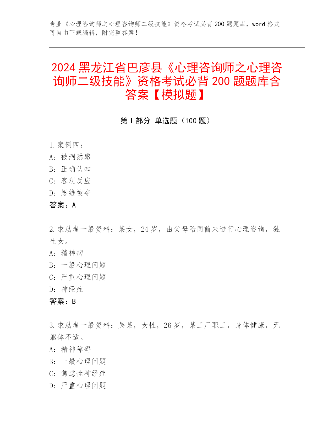 2024黑龙江省巴彦县《心理咨询师之心理咨询师二级技能》资格考试必背200题题库含答案【模拟题】