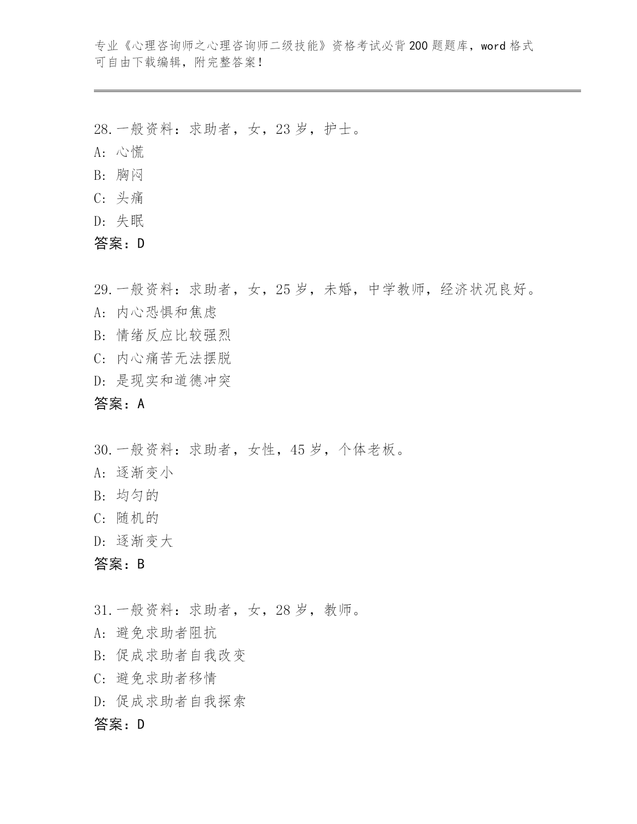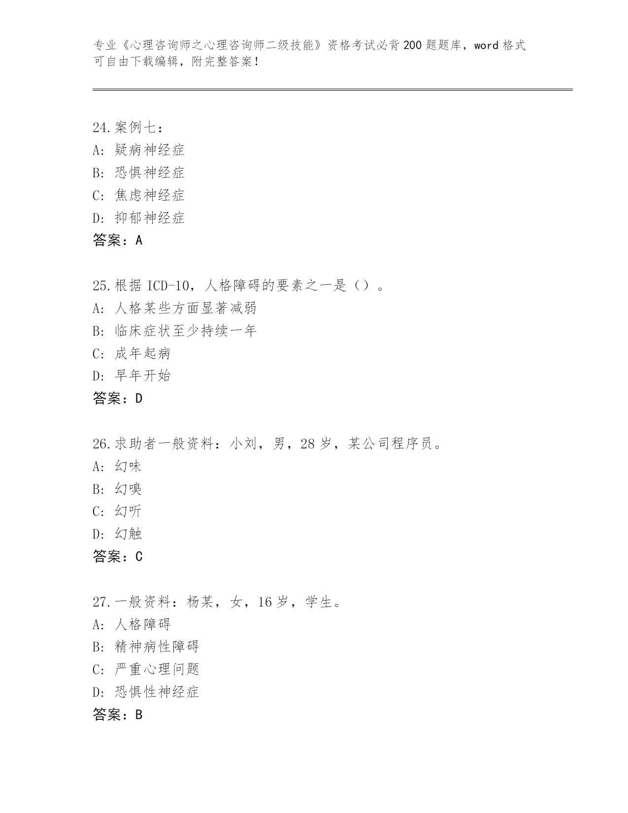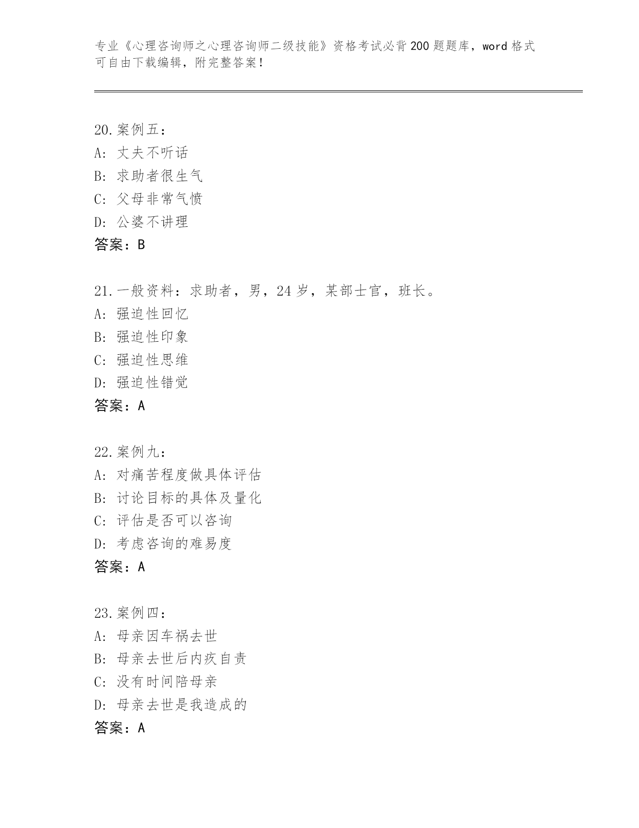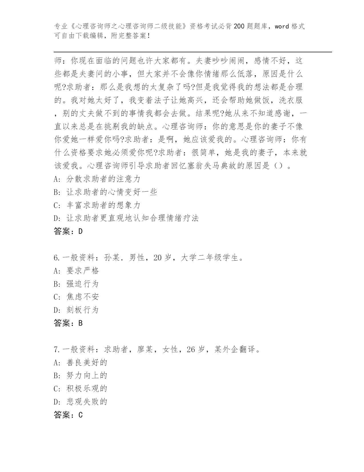 河南省睢阳区2024《心理咨询师之心理咨询师二级技能》资格考试必背200题(模拟题)