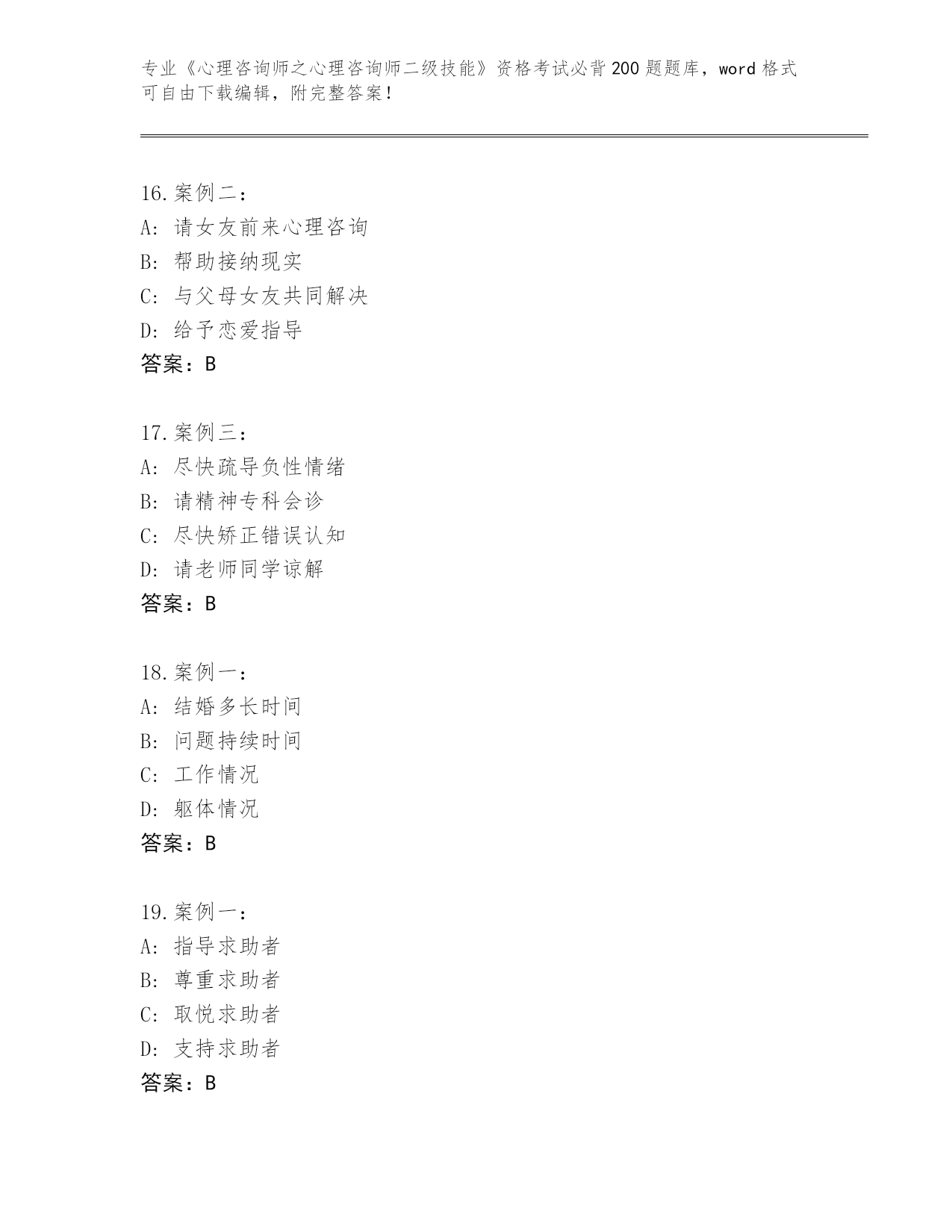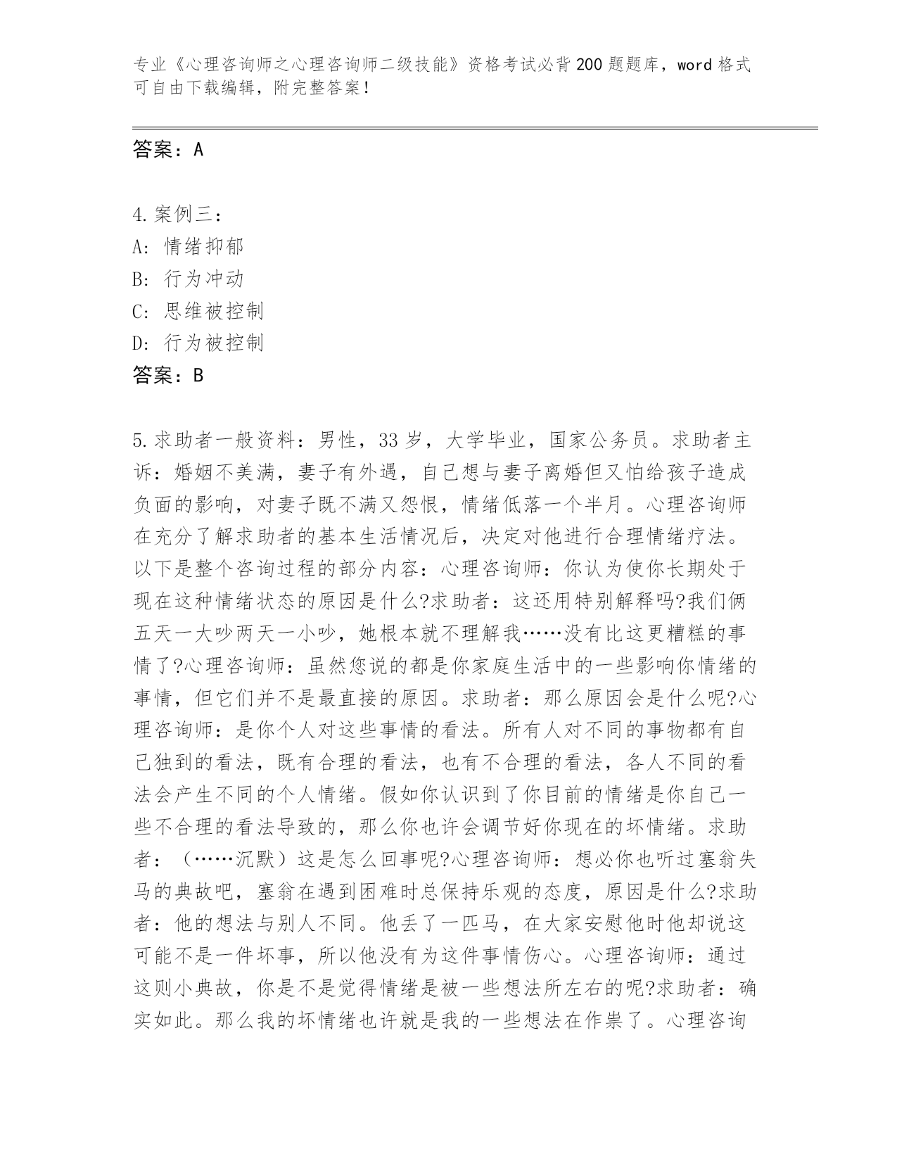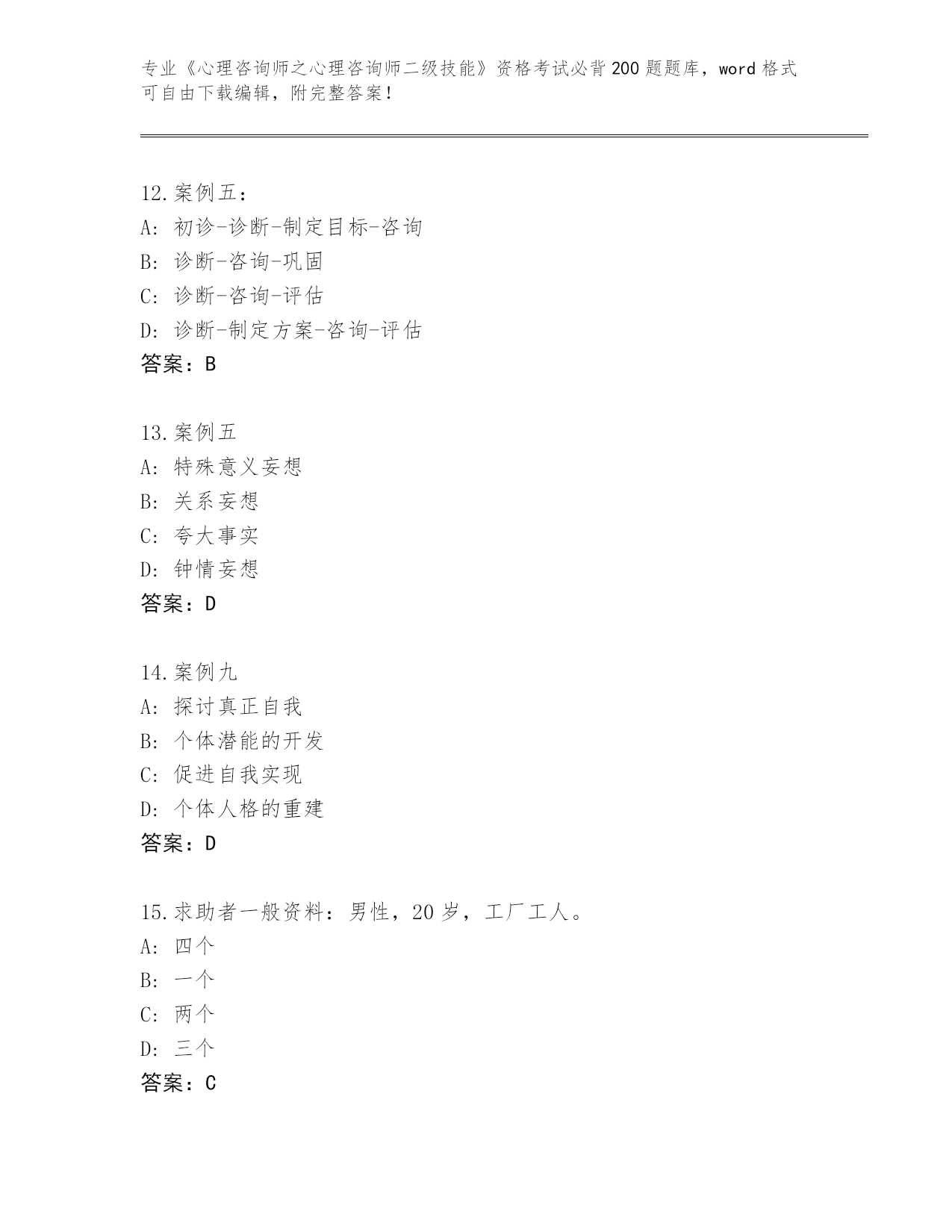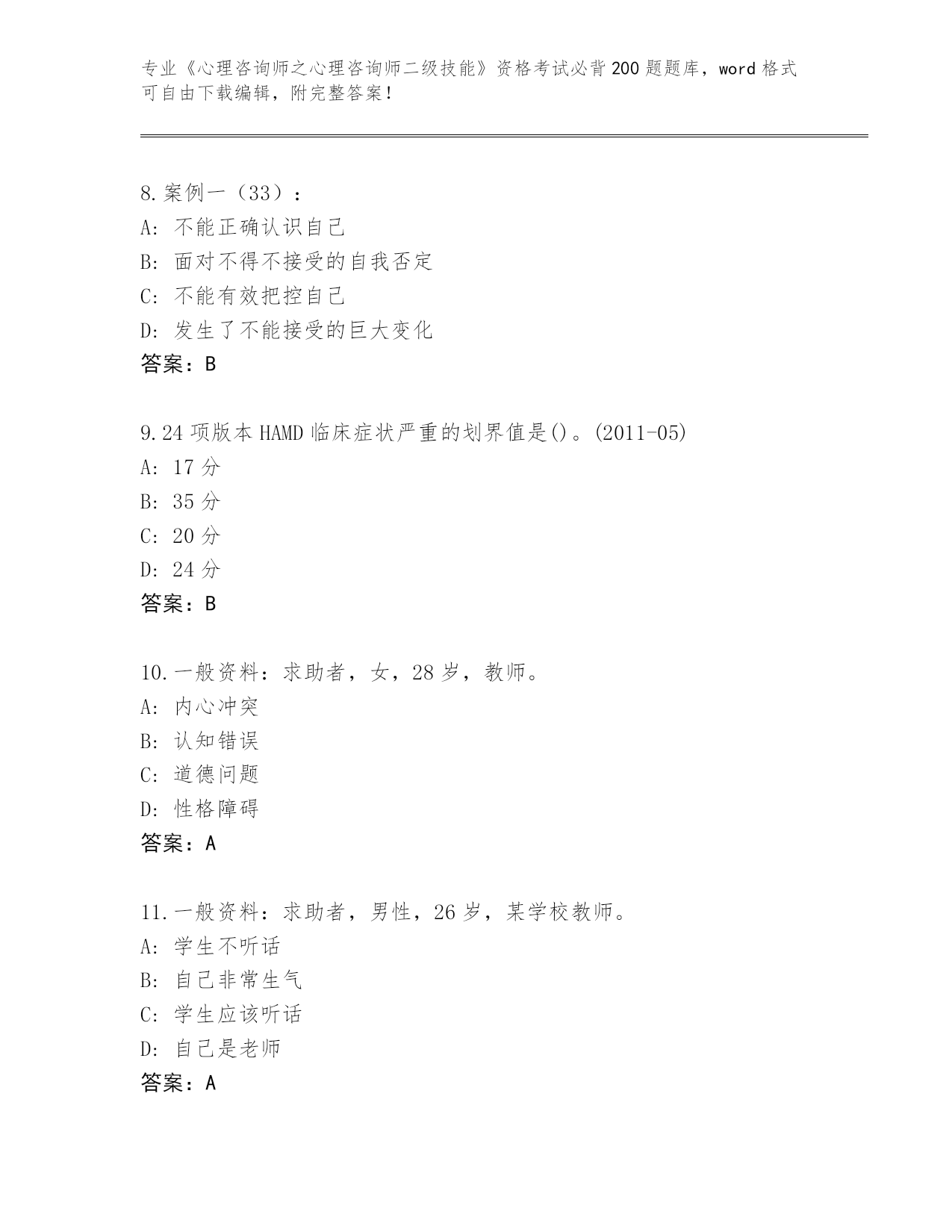河南省睢阳区2024《心理咨询师之心理咨询师二级技能》资格考试必背200题(模拟题)