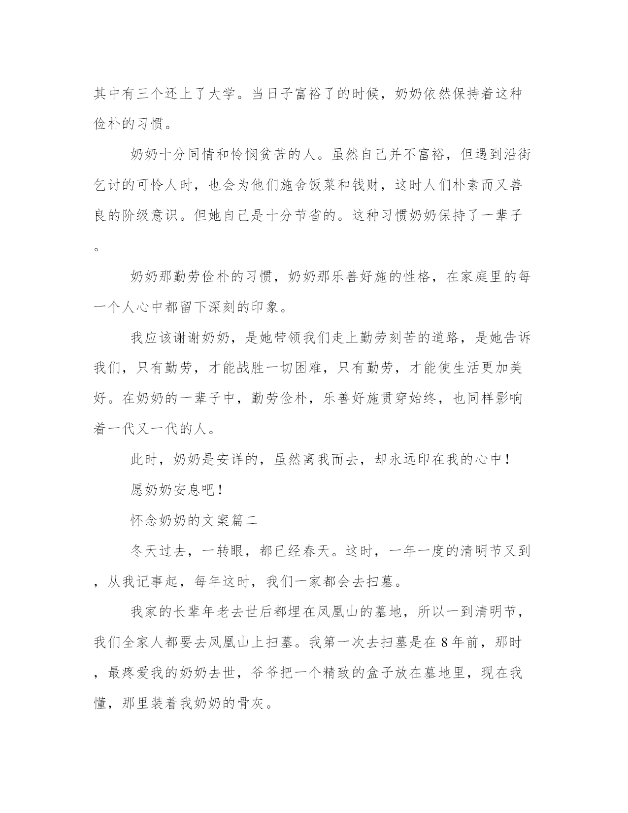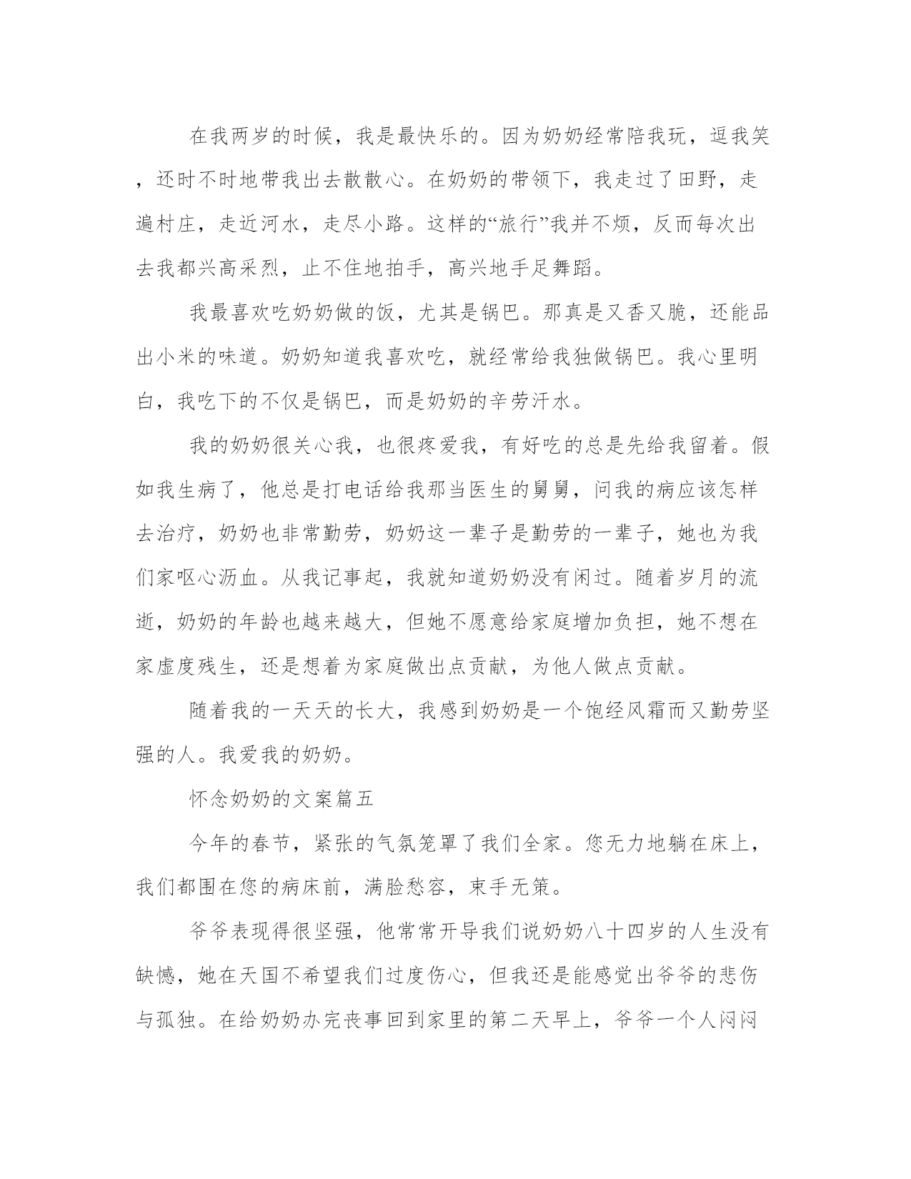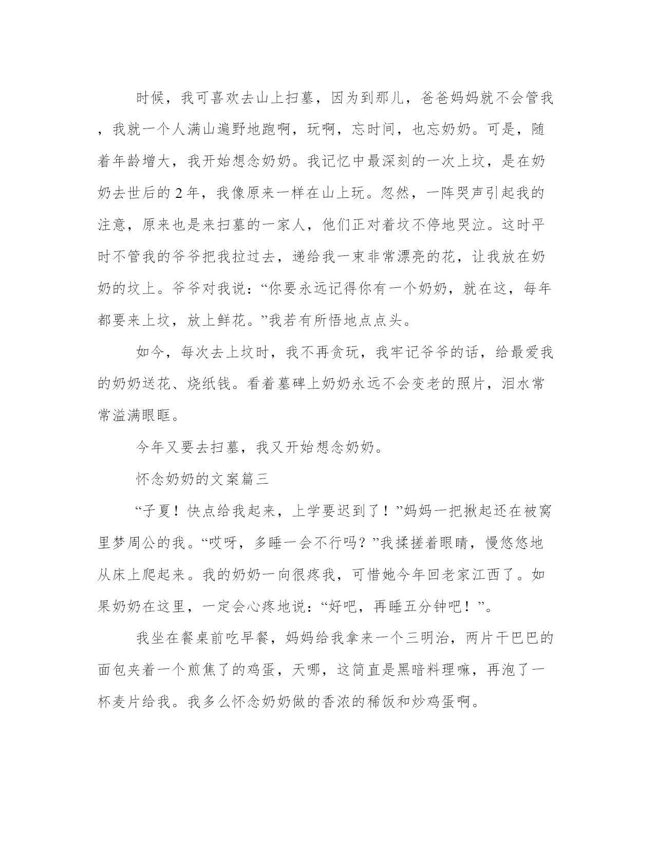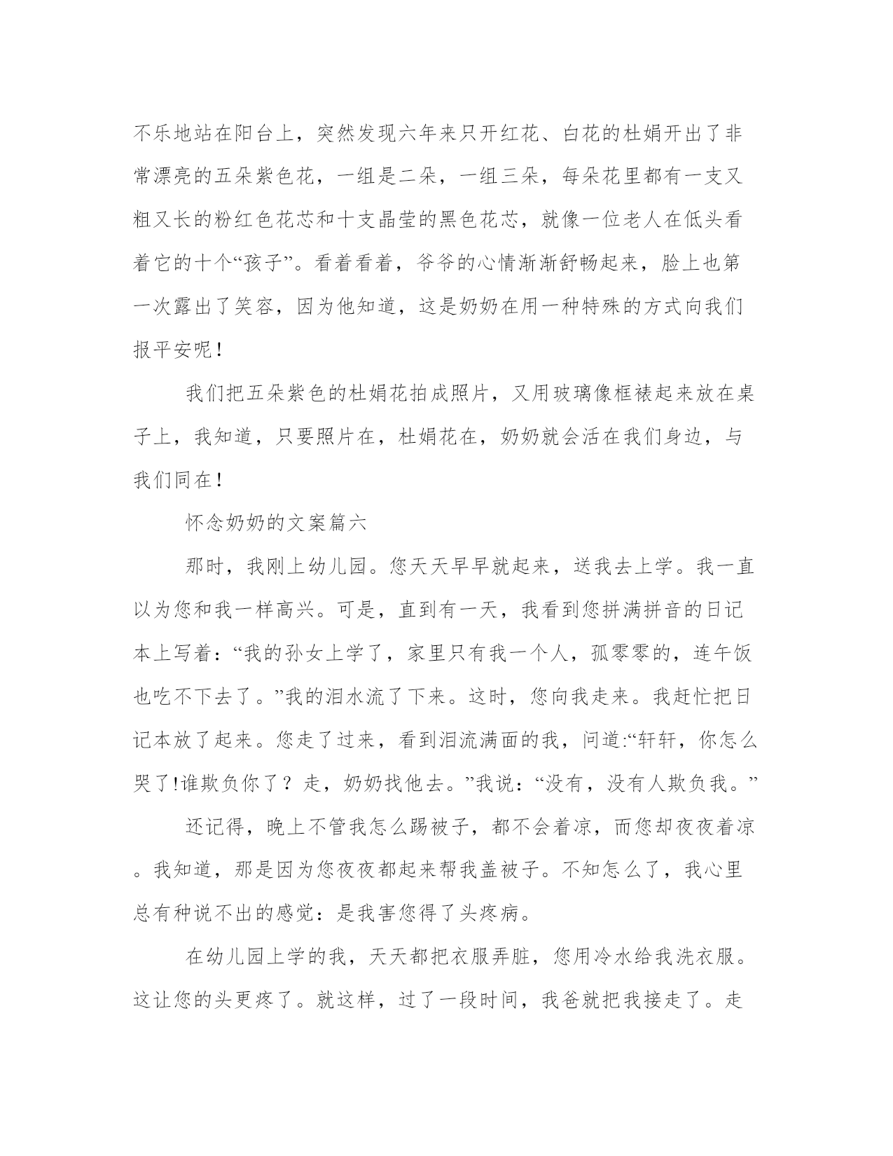 最新怀念奶奶的文案(汇总8篇)在日常学习、工作或生活中,大家总少不了接触作文或者范文吧,通过文章可以把我们那些零零散散的思想,聚集在一块。写范文的时候需要注意什么呢?有哪些格式需要注意呢?下面是小编帮大家整理的优质范文,仅供参考,大家一起来看看吧。怀念奶奶的文案篇一春节喜庆的气氛仍浓,却传来奶奶去世的消息,我很伤心。我爱我的奶奶,她勤劳、俭朴、善良。奶奶的一辈子,有许多事情是值得我永远回忆的。奶奶生活在一个并不起眼的小镇里,和那时的许多人一样,爷爷奶奶的家境并不富裕,爷爷常年在外打工以养家糊口,而在家中照顾孩子、洗衣做饭等繁重的家务,全部都落在了奶奶一个人的肩上。由于家境贫苦,奶奶总是过着节俭的生活。衣服大都是自己缝制,即使买上几件衣服,也是精挑细选货比三家。一套衣服,老大穿了,老二老三接着穿。奶奶总是吃着清淡的饭菜,很少沾上油水。有时做了肉,也都分给孩子们吃。即使生活是贫苦的,由于奶奶的聪明能干,日子也过得有滋有味。奶奶一共生养了七个子女,为了让子女们都能接受教育,为了能买书买本,奶奶省吃俭用,竟让七个子女都顺顺利利地读完了高中,其中有三个还上了大学。当日子富裕了的时候,奶奶依然保持着这种俭朴的习惯。奶奶十分同情和怜悯贫苦的人。虽然自己并不富裕,但遇到沿街乞讨的可怜人时,也会为他们施舍饭菜和钱财,这时人们朴素而又善良的阶级意识。但她自己是十分节省的。这种习惯奶奶保持了一辈子。奶奶那勤劳俭朴的习惯,奶奶那乐善好施的性格,在家庭里的每一个人心中都留下深刻的印象。我应该谢谢奶奶,是她带领我们走上勤劳刻苦的道路,是她告诉我们,只有勤劳,才能战胜一切困难,只有勤劳,才能使生活更加美好。在奶奶的一辈子中,勤劳俭朴,乐善好施贯穿始终,也同样影响着一代又一代的人。此时,奶奶是安详的,虽然离我而去,却永远印在我的心中!愿奶奶安息吧!怀念奶奶的文案篇二冬天过去,一转眼,都已经春天。这时,一年一度的清明节又到,从我记事起,每年这时,我们一家都会去扫墓。我家的长辈年老去世后都埋在凤凰山的墓地,所以一到清明节,我们全家人都要去凤凰山上扫墓。我第一次去扫墓是在8年前,那时,最疼爱我的奶奶去世,爷爷把一个精致的盒子放在墓地里,现在我懂,那里装着我奶奶的骨灰。时候,我可喜欢去山上扫墓,因为到那儿,爸爸妈妈就不会管我,我就一个人满山遍野地跑啊,玩啊,忘时间,也忘奶奶。可是,随着年龄增大,我开始想念奶奶。我记忆中最深刻的一次上坟,是在奶奶去世后的2年,我像原来一样在山上玩。忽然,一阵哭声引起我的注意,原来也是来扫墓的一家人,他们正对着坟不停地哭泣。这时平时不管我的爷爷把我拉过去,递给我一束非常漂亮的花,让我放在奶奶的坟上。爷爷对我说:“你要永远记得你有一个奶奶,就在这,每年都要来上坟,放上鲜花。”我若有所悟地点点头。如今,每次去上坟时,我不再贪玩,我牢记爷爷的话,给最爱我的奶奶送花、烧纸钱。看着墓碑上奶奶永远不会变老的照片,泪水常常溢满眼眶。今年又要去扫墓,我又开始想念奶奶。怀念奶奶的文案篇三“子夏!快点给我起来,上学要迟到了!”妈妈一把揪起还在被窝里梦周公的我。“哎呀,多睡一会不行吗?”我揉搓着眼睛,慢悠悠地从床上爬起来。我的奶奶一向很疼我,可惜她今年回老家江西了。如果奶奶在这里,一定会心疼地说:“好吧,再睡五分钟吧!”。我坐在餐桌前吃早餐,妈妈给我拿来一个三明治,两片干巴巴的面包夹着一个煎焦了的鸡蛋,天哪,这简直是黑暗料理嘛,再泡了一杯麦片给我。我多么怀念奶奶做的香浓的稀饭和炒鸡蛋啊。吃好饭,快迟到了,妈妈催促。“奇怪?水杯呢?”我怎么也找不到。要是奶奶在这里,她肯定会帮我把水杯装满水,放在餐桌上,为我节省了不少时间。晚上回家,作业出奇的多,得赶紧写。一回到家,我就坐到书房里,写起了作业。“子夏,来陪我玩好吗?”我的妹妹小橙子跑进我的书房。不行,我得写作业,妹妹在旁边不断地打扰我。唉……看来我的作业又要写到半夜了。如果奶奶在这里就好啦,奶奶一定会说:“橙子乖,奶奶带你去玩。”,我的作业也会早早地完成。没有奶奶在的日子,真是不习惯啊。以前奶奶在我家的时候,我有时候还跟奶奶顶嘴,奶奶都容忍着我。现在想想真后悔。连妹妹都经常跑到奶奶睡过的房间,大声问:“奶奶,你在哪里呢?”我姐妹俩都天天思念着奶奶。亲爱的奶奶,你什么时候能再来我家呢?怀念奶奶的文案篇四离开家乡多年了,我真想念她。常常一闭上眼睛,她就出现在我的眼前,因为我从小就在她的怀抱里长大。她中等身材,常喜欢穿灰色的衣裤。由于常年的操劳,她的手背粗糙得像老松树皮,裂开了一道口子,手心上磨出了几个厚厚的老茧。无情的岁月如流水般地把她那张白白的脸上刻下一道道深深的皱纹,她那乌黑的头发也变成了灰色的了,只有那双眼睛依然是那么瞳瞳有神。在我两岁的时候,我是最快