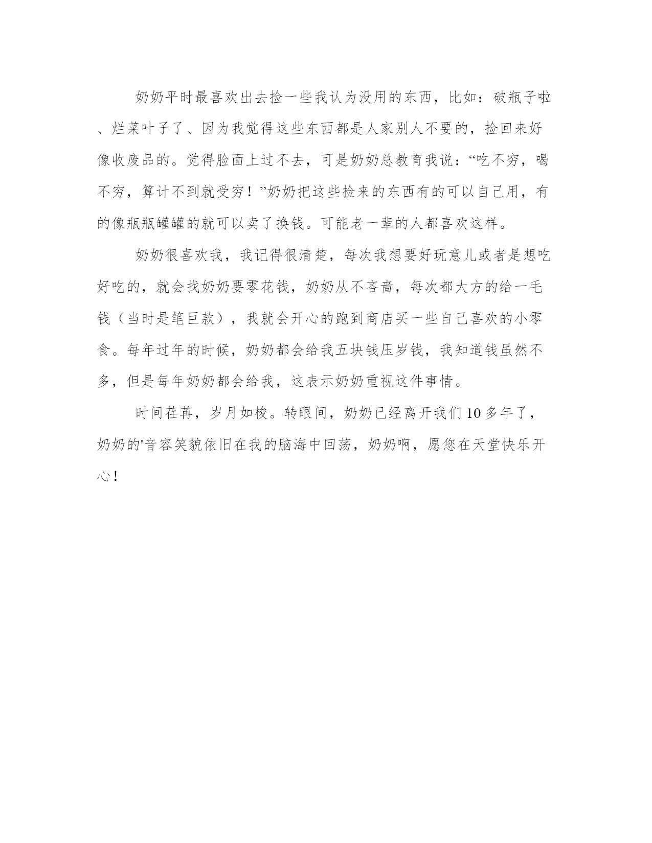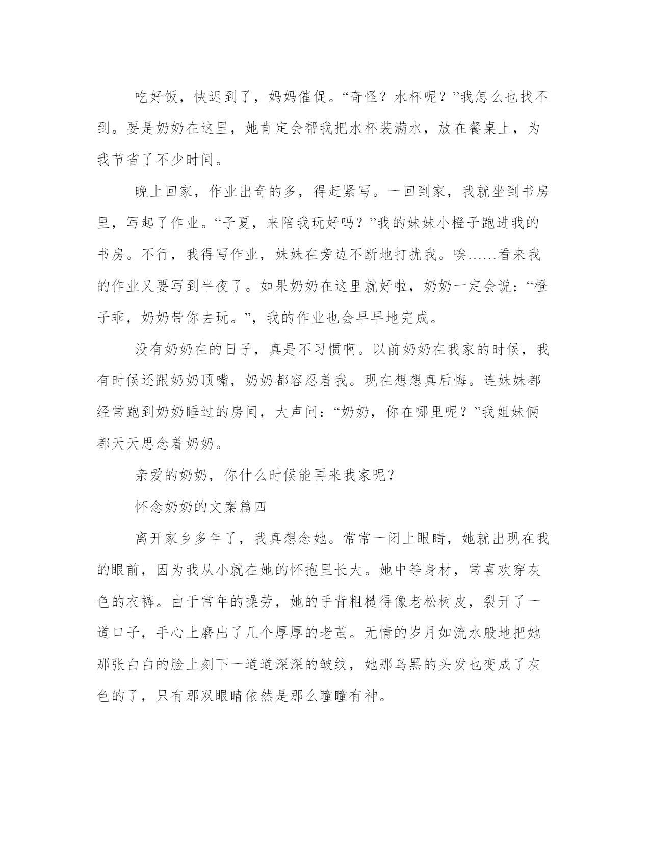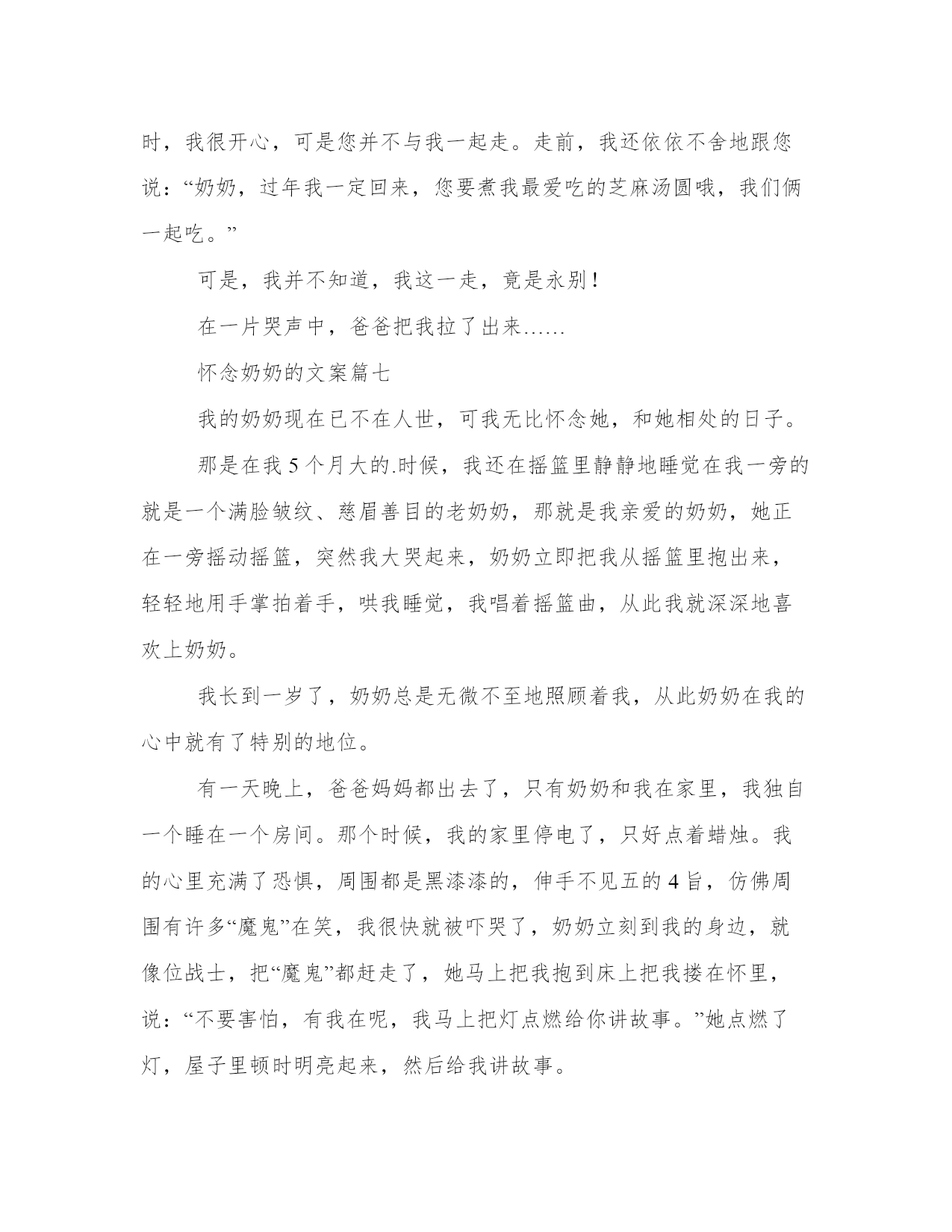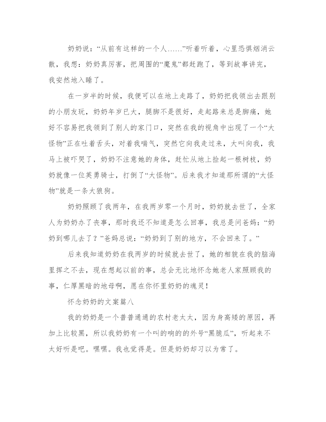 最新怀念奶奶的文案(汇总8篇)在日常学习、工作或生活中,大家总少不了接触作文或者范文吧,通过文章可以把我们那些零零散散的思想,聚集在一块。写范文的时候需要注意什么呢?有哪些格式需要注意呢?下面是小编帮大家整理的优质范文,仅供参考,大家一起来看看吧。怀念奶奶的文案篇一春节喜庆的气氛仍浓,却传来奶奶去世的消息,我很伤心。我爱我的奶奶,她勤劳、俭朴、善良。奶奶的一辈子,有许多事情是值得我永远回忆的。奶奶生活在一个并不起眼的小镇里,和那时的许多人一样,爷爷奶奶的家境并不富裕,爷爷常年在外打工以养家糊口,而在家中照顾孩子、洗衣做饭等繁重的家务,全部都落在了奶奶一个人的肩上。由于家境贫苦,奶奶总是过着节俭的生活。衣服大都是自己缝制,即使买上几件衣服,也是精挑细选货比三家。一套衣服,老大穿了,老二老三接着穿。奶奶总是吃着清淡的饭菜,很少沾上油水。有时做了肉,也都分给孩子们吃。即使生活是贫苦的,由于奶奶的聪明能干,日子也过得有滋有味。奶奶一共生养了七个子女,为了让子女们都能接受教育,为了能买书买本,奶奶省吃俭用,竟让七个子女都顺顺利利地读完了高中,其中有三个还上了大学。当日子富裕了的时候,奶奶依然保持着这种俭朴的习惯。奶奶十分同情和怜悯贫苦的人。虽然自己并不富裕,但遇到沿街乞讨的可怜人时,也会为他们施舍饭菜和钱财,这时人们朴素而又善良的阶级意识。但她自己是十分节省的。这种习惯奶奶保持了一辈子。奶奶那勤劳俭朴的习惯,奶奶那乐善好施的性格,在家庭里的每一个人心中都留下深刻的印象。我应该谢谢奶奶,是她带领我们走上勤劳刻苦的道路,是她告诉我们,只有勤劳,才能战胜一切困难,只有勤劳,才能使生活更加美好。在奶奶的一辈子中,勤劳俭朴,乐善好施贯穿始终,也同样影响着一代又一代的人。此时,奶奶是安详的,虽然离我而去,却永远印在我的心中!愿奶奶安息吧!怀念奶奶的文案篇二冬天过去,一转眼,都已经春天。这时,一年一度的清明节又到,从我记事起,每年这时,我们一家都会去扫墓。我家的长辈年老去世后都埋在凤凰山的墓地,所以一到清明节,我们全家人都要去凤凰山上扫墓。我第一次去扫墓是在8年前,那时,最疼爱我的奶奶去世,爷爷把一个精致的盒子放在墓地里,现在我懂,那里装着我奶奶的骨灰。时候,我可喜欢去山上扫墓,因为到那儿,爸爸妈妈就不会管我,我就一个人满山遍野地跑啊,玩啊,忘时间,也忘奶奶。可是,随着年龄增大,我开始想念奶奶。我记忆中最深刻的一次上坟,是在奶奶去世后的2年,我像原来一样在山上玩。忽然,一阵哭声引起我的注意,原来也是来扫墓的一家人,他们正对着坟不停地哭泣。这时平时不管我的爷爷把我拉过去,递给我一束非常漂亮的花,让我放在奶奶的坟上。爷爷对我说:“你要永远记得你有一个奶奶,就在这,每年都要来上坟,放上鲜花。”我若有所悟地点点头。如今,每次去上坟时,我不再贪玩,我牢记爷爷的话,给最爱我的奶奶送花、烧纸钱。看着墓碑上奶奶永远不会变老的照片,泪水常常溢满眼眶。今年又要去扫墓,我又开始想念奶奶。怀念奶奶的文案篇三“子夏!快点给我起来,上学要迟到了!”妈妈一把揪起还在被窝里梦周公的我。“哎呀,多睡一会不行吗?”我揉搓着眼睛,慢悠悠地从床上爬起来。我的奶奶一向很疼我,可惜她今年回老家江西了。如果奶奶在这里,一定会心疼地说:“好吧,再睡五分钟吧!”。我坐在餐桌前吃早餐,妈妈给我拿来一个三明治,两片干巴巴的面包夹着一个煎焦了的鸡蛋,天哪,这简直是黑暗料理嘛,再泡了一杯麦片给我。我多么怀念奶奶做的香浓的稀饭和炒鸡蛋啊。吃好饭,快迟到了,妈妈催促。“奇怪?水杯呢?”我怎么也找不到。要是奶奶在这里,她肯定会帮我把水杯装满水,放在餐桌上,为我节省了不少时间。晚上回家,作业出奇的多,得赶紧写。一回到家,我就坐到书房里,写起了作业。“子夏,来陪我玩好吗?”我的妹妹小橙子跑进我的书房。不行,我得写作业,妹妹在旁边不断地打扰我。唉……看来我的作业又要写到半夜了。如果奶奶在这里就好啦,奶奶一定会说:“橙子乖,奶奶带你去玩。”,我的作业也会早早地完成。没有奶奶在的日子,真是不习惯啊。以前奶奶在我家的时候,我有时候还跟奶奶顶嘴,奶奶都容忍着我。现在想想真后悔。连妹妹都经常跑到奶奶睡过的房间,大声问:“奶奶,你在哪里呢?”我姐妹俩都天天思念着奶奶。亲爱的奶奶,你什么时候能再来我家呢?怀念奶奶的文案篇四离开家乡多年了,我真想念她。常常一闭上眼睛,她就出现在我的眼前,因为我从小就在她的怀抱里长大。她中等身材,常喜欢穿灰色的衣裤。由于常年的操劳,她的手背粗糙得像老松树皮,裂开了一道口子,手心上磨出了几个厚厚的老茧。无情的岁月如流水般地把她那张白白的脸上刻下一道道深深的皱纹,她那乌黑的头发也变成了灰色的了,只有那双眼睛依然是那么瞳瞳有神。在我两岁的时候,我是最快