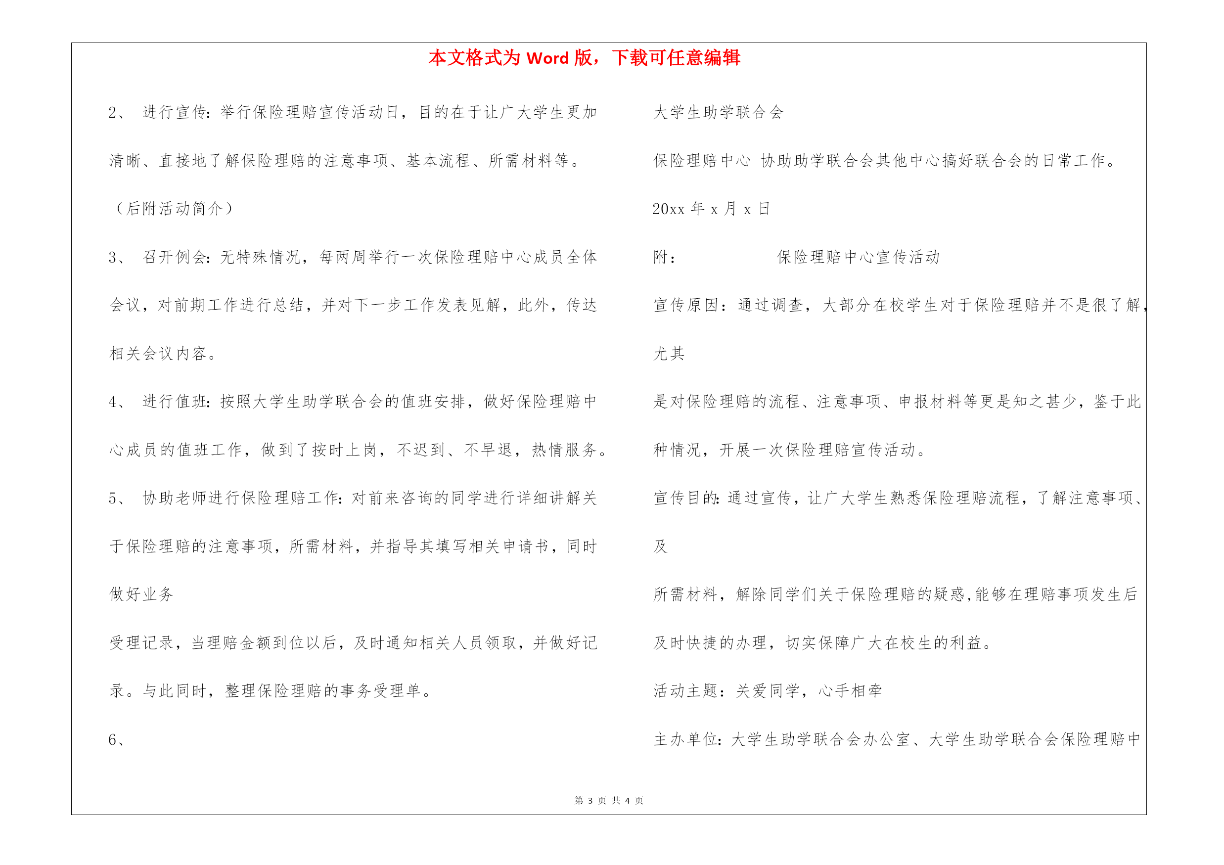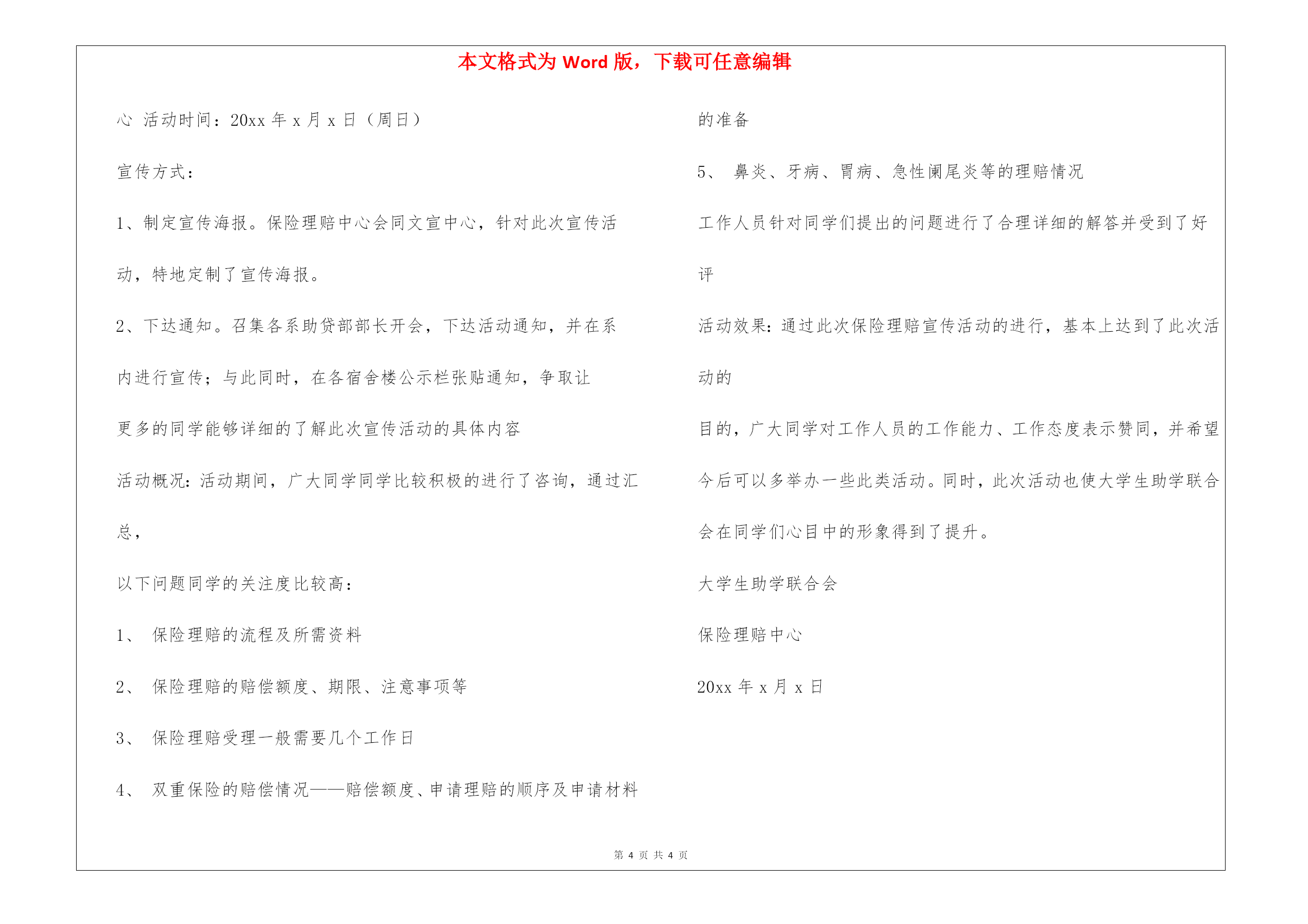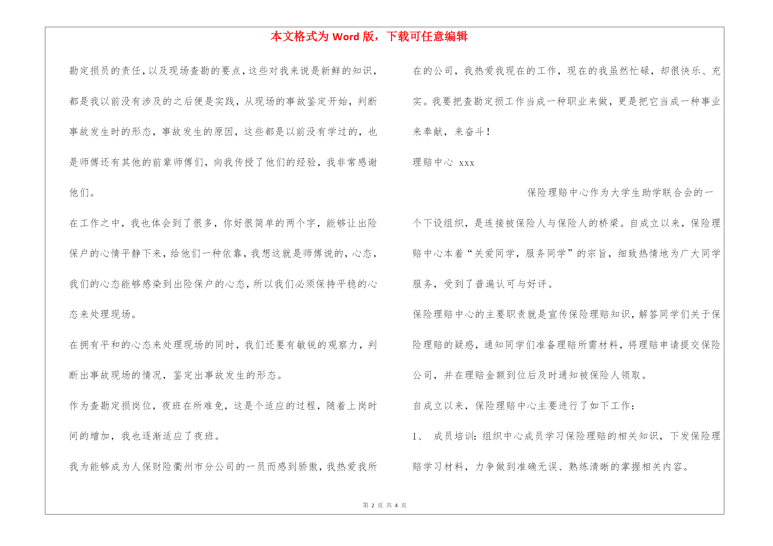 本文格式为Word版,下载可任意编辑第PAGE\*MERGEFORMAT4页共NUMPAGES\*MERGEFORMAT4页保险理赔中心新员工总结个人总结时光荏苒五个月的时间,转瞬即逝,在过去的五个月中,我跟着师傅一起,看过农险,看过车险,真正体会到了,人民保险,造福于民这八个字的涵义。刚从学校出来,我是一名既无保险理论知识,又无保险工作经验的新员工,刚刚走出了校园,对业务的不熟悉,对工作的恐惧和迷茫,让我在工作之前不知从何入手,也不知该怎样与客户交流,在事故处理现场,在出险保户面前,显的是有些手足无措。但是,这一切都很快过去了。公司领导和部门领导都十分关心新员工的工作生活情况,常常对我们新员工嘘寒问暖;周围的同事都是那么和蔼,主动与我聊天,问我有什么难题他们可以帮忙的。他们的关怀是我更快地融入这个大家庭中,也让我更快地掌握理赔查勘定损的技巧。责任,心态,这个是我五个月工作下来最深刻的体会。投入工作以后,我更加深切体会到了人民保险,造福于民这八个字的涵义。初入公司,跟着师傅就是看农险,作为国家政策性的保险,农险和我国最广大农民的利益紧紧相连。几天下来,我对这些都有了自己的以前所想象不到的体会,农户们一个电话所承载的希望,不仅仅是保险的那些赔偿,更加是国家对他们的保障,让他们能够安心地养殖,务农。师傅和我说过,在农户心里,并分不清那么多的保险公司,他们只知道,保险公司能他们提供保障,我们出来,代表的不止是我们公司,更加是整个保险业的形象。这句话,我想了很久,这就是责任,这是以前在学校里面学不到,体会不到的。俗话说,活到老学到老,农险让我体会到了责任,车险则让我学到更多。初看车险时,师傅和我说的第一件事情就是要学会调节自己的心态,保户着急,我们却不能跟着着急。师傅把他编写的查勘定损的资料都给我看,让我先初步了解了车险查勘定损员的责任,以及现场查勘的要点,这些对我来说是新鲜的知识,都是我以前没有涉及的之后便是实践,从现场的事故鉴定开始,判断事故发生时的形态,事故发生的原因,这些都是以前没有学过的,也是师傅还有其他的前辈师傅们,向我传授了他们的经验,我非常感谢他们。在工作之中,我也体会到了很多,你好很简单的两个字,能够让出险保户的心情平静下来,给他们一种依靠,我想这就是师傅说的,心态,我们的心态能够感染到出险保户的心态,所以我们必须保持平稳的心态来处理现场。在拥有平和的心态来处理现场的同时,我们还要有敏锐的观察力,判断出事故现场的情况,鉴定出事故发生的形态。作为查勘定损岗位,夜班在所难免,这是个适应的过程,随着上岗时间的增加,我也逐渐适应了夜班。我为能够成为人保财险衢州市分公司的一员而感到骄傲,我热爱我所在的公司,我热爱我现在的工作,现在的我虽然忙碌,却很快乐、充实。我要把查勘定损工作当成一种职业来做,更是把它当成一种事业来奉献,来奋斗!理赔中心xxx保险理赔中心作为大学生助学联合会的一个下设组织,是连接被保险人与保险人的桥梁。自成立以来,保险理赔中心本着“关爱同学,服务同学”的宗旨,细致热情地为广大同学服务,受到了普遍认可与好评。保险理赔中心的主要职责就是宣传保险理赔知识,解答同学们关于保险理赔的疑惑,通知同学们准备理赔所需材料,将理赔申请提交保险公司,并在理赔金额到位后及时通知被保险人领取。自成立以来,保险理赔中心主要进行了如下工作:1、成员培训:组织中心成员学习保险理赔的相关知识,下发保险理赔学习材料,力争做到准确无误、熟练清晰的掌握相关内容。2、进行宣传:举行保险理赔宣传活动日,目的在于让广大学生更加清晰、直接地了解保险理赔的注意事项、基本流程、所需材料等。(后附活动简介)3、召开例会:无特殊情况,每两周举行一次保险理赔中心成员全体会议,对前期工作进行总结,并对下一步工作发表见解,此外,传达相关会议内容。4、进行值班:按照大学生助学联合会的值班安排,做好保险理赔中心成员的值班工作,做到了按时上岗,不迟到、不早退,热情服务。5、协助老师进行保险理赔工作:对前来咨询的同学进行详细讲解关于保险理赔的注意事项,所需材料,并指导其填写相关申请书,同时做好业务受理记录,当理赔金额到位以后,及时通知相关人员领取,并做好记录。与此同时,整理保险理赔的事务受理单。6、大学生助学联合会保险理赔中心协助助学联合会其他中心搞好联合会的日常工作。20xx年x月x日附:保险理赔中心宣传活动宣传原因:通过调查,大部分在校学生对于保险理赔并不是很了解,尤其是对保险理赔的流程、注意事项、申报材料等更是知之甚少,鉴于此种情况,开展一次保险理赔宣传活动。宣传目的:通过宣传,让广大学生熟悉保险理赔流程,了解注意事项、及所需材料,解除同学们关于保险理赔的疑惑,能够在理赔事项发生后及时快捷的办理,切实保障广大在校生的利益。活动主题:关爱同学,心手相牵