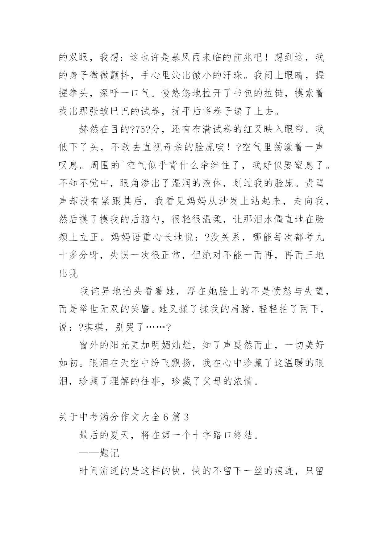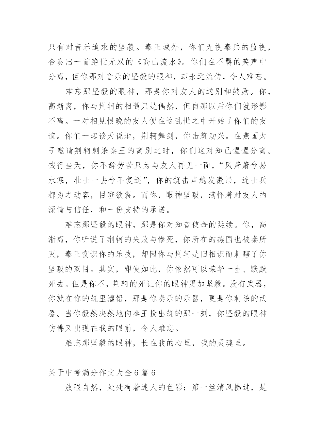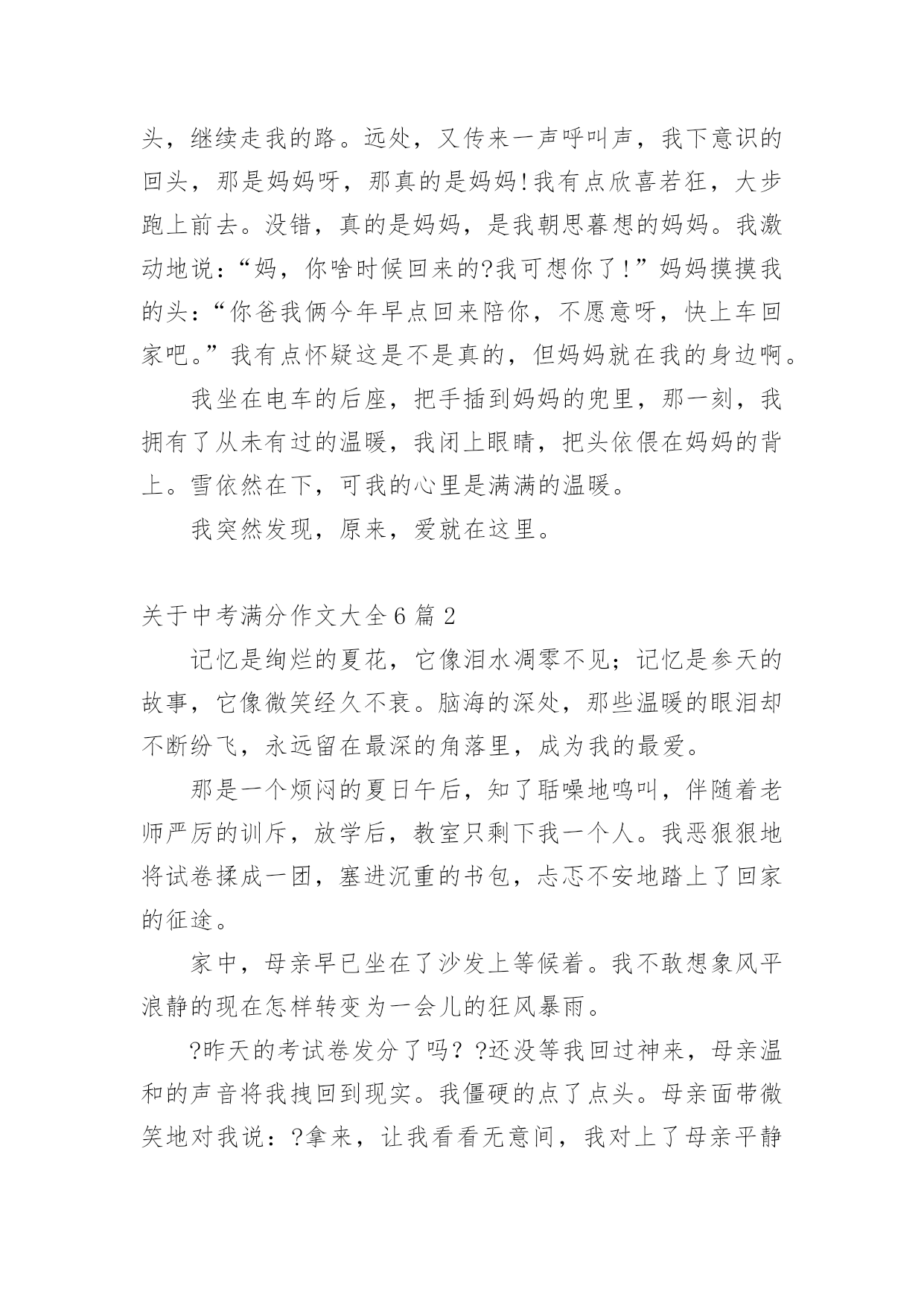 中考满分作文关于中考满分作文大全6篇在学习、工作乃至生活中,大家都有写作文的经历,对作文很是熟悉吧,作文可分为小学作文、中学作文、大学作文(论文)。相信许多人会觉得作文很难写吧,以下是小编为大家收集的关于中考满分作文大全6篇,欢迎阅读与收藏。关于中考满分作文大全6篇1从小到大,我习惯了一个人的平淡,就不再幻想从别人世界中寻找幸福。但是,一次偶然的机会我却发现,爱就在身边。从小,我跟着奶奶长大,由于家庭原因,爸爸妈妈都在外地打工,只有在过年的时候才能见到一面。我童年的记忆里似乎充满了不公平,我认为我应该是个不幸的孩子。又是一个星期五,我又要一个人回家。天空飘着洋洋洒洒的雪花,我缩着脖子,背着沉甸甸的书包,穿过熙熙攘攘的人流,羡慕地望着那些被爸爸妈妈接到的同学们,走了很长一段路,去坐公交车。终于,公交车来了,我搓搓手,来不及抖掉衣服上的雪,急忙窜上去,坐在角落里。车窗外的树,一棵棵从眼前晃过。天气好冷,我的心里也凉凉的。到站了,我从车上下来。还要再走一段路,才能到家。“儿子!”一个激动的声音跃入我的耳朵,我感觉好熟悉。可是,我明明知道,那不可能是妈妈的声音。我没有回头,继续走我的路。远处,又传来一声呼叫声,我下意识的回头,那是妈妈呀,那真的是妈妈!我有点欣喜若狂,大步跑上前去。没错,真的是妈妈,是我朝思暮想的妈妈。我激动地说:“妈,你啥时候回来的?我可想你了!”妈妈摸摸我的头:“你爸我俩今年早点回来陪你,不愿意呀,快上车回家吧。”我有点怀疑这是不是真的,但妈妈就在我的身边啊。我坐在电车的后座,把手插到妈妈的兜里,那一刻,我拥有了从未有过的温暖,我闭上眼睛,把头依偎在妈妈的背上。雪依然在下,可我的心里是满满的温暖。我突然发现,原来,爱就在这里。关于中考满分作文大全6篇2记忆是绚烂的夏花,它像泪水凋零不见;记忆是参天的故事,它像微笑经久不衰。脑海的深处,那些温暖的眼泪却不断纷飞,永远留在最深的角落里,成为我的最爱。那是一个烦闷的夏日午后,知了聒噪地鸣叫,伴随着老师严厉的训斥,放学后,教室只剩下我一个人。我恶狠狠地将试卷揉成一团,塞进沉重的书包,忐忑不安地踏上了回家的征途。家中,母亲早已坐在了沙发上等候着。我不敢想象风平浪静的现在怎样转变为一会儿的狂风暴雨。?昨天的考试卷发分了吗??还没等我回过神来,母亲温和的声音将我拽回到现实。我僵硬的点了点头。母亲面带微笑地对我说:?拿来,让我看看无意间,我对上了母亲平静的双眼,我想:这也许是暴风雨来临的前兆吧!想到这,我的身子微微颤抖,手心里沁出微小的汗珠。我闭上眼睛,握握拳头,深呼一口气。慢悠悠地拉开了书包的拉链,摸索着找出那张皱巴巴的试卷,抚平后将卷子递了上去。赫然在目的?75?分,还有布满试卷的红叉映入眼帘。我低下了头,不敢去直视母亲的脸庞唉!?空气里荡漾着一声叹息。周围的`空气似乎背什么牵绊住了,我好似要窒息了。不知不觉中,眼角渗出了湿润的液体,划过我的脸庞。责骂声却没有紧跟其后,我看见妈妈从沙发上站起来,走向我,然后摸了摸我的后脑勺,很轻很温柔,让那泪水僵直地在脸颊上立正。妈妈语重心长地说:?没关系,哪能每次都考九十多分呀,失误一次很正常,但绝对不能一而再,再而三地出现我诧异地抬头看着她,浮在她脸上的不是愤怒与失望,而是举世无双的笑靥。她又揉了揉我的肩膀,轻轻拍了两下,说:?琪琪,别哭了……?窗外的阳光更加明媚灿烂,知了声戛然而止,一切美好如初。眼泪在天空中纷飞飘扬,我在心中珍藏了这温暖的眼泪,珍藏了理解的往事,珍藏了父母的浓情。关于中考满分作文大全6篇3最后的夏天,将在第一个十字路口终结。——题记时间流逝的是这样的快,快的不留下一丝的痕迹,只留下一片模糊而又空白的记忆。不知不觉已到了最后的一个夏天,而这又是在第一个十字路口。这意味着什么?是别离,是悲欢,还是又一次重新的开始?还有五十多天,我们将在第一个十字路口处踏上自己又一次的征程。我讨厌离别的时候,因为我舍不得,因为每个人都会流下那滴“不舍之晶”,因为这里承载着我们的梦想,因为这里有我们快乐的回忆、有我们努力的汗水、有我们最珍惜最痴迷的时光。陪伴了我十几年的父母,历经了多少沧桑的岁月,终于看到我长大、懂事,我们一起走过的日子是那么轻易地勾起我的回忆。看着你们的双鬓在风中飘舞,看着你们饱经风霜的双手在雪中皲裂,我的心中总有一种莫名的触动,眼帘中的泪珠也禁不住流出。是的,我曾埋怨过,埋怨他们的身份地位,埋怨他们为什么不理解我、为什么不尊重我、为什么总是我的错,但我从未对他们说出,因为我懂得。将陪我走过最后一个夏天的老师,我永远也忘不掉你们。因为在这时的你们是毫不保留地把什么都都给了我们,包括像对子女一样的关爱。你们的关心就像一股温暖的甘泉注入我们的心中,让我们永生难忘,刻骨铭心。无法用言语表达出我对你们的敬重与感激,你们每个人都用自