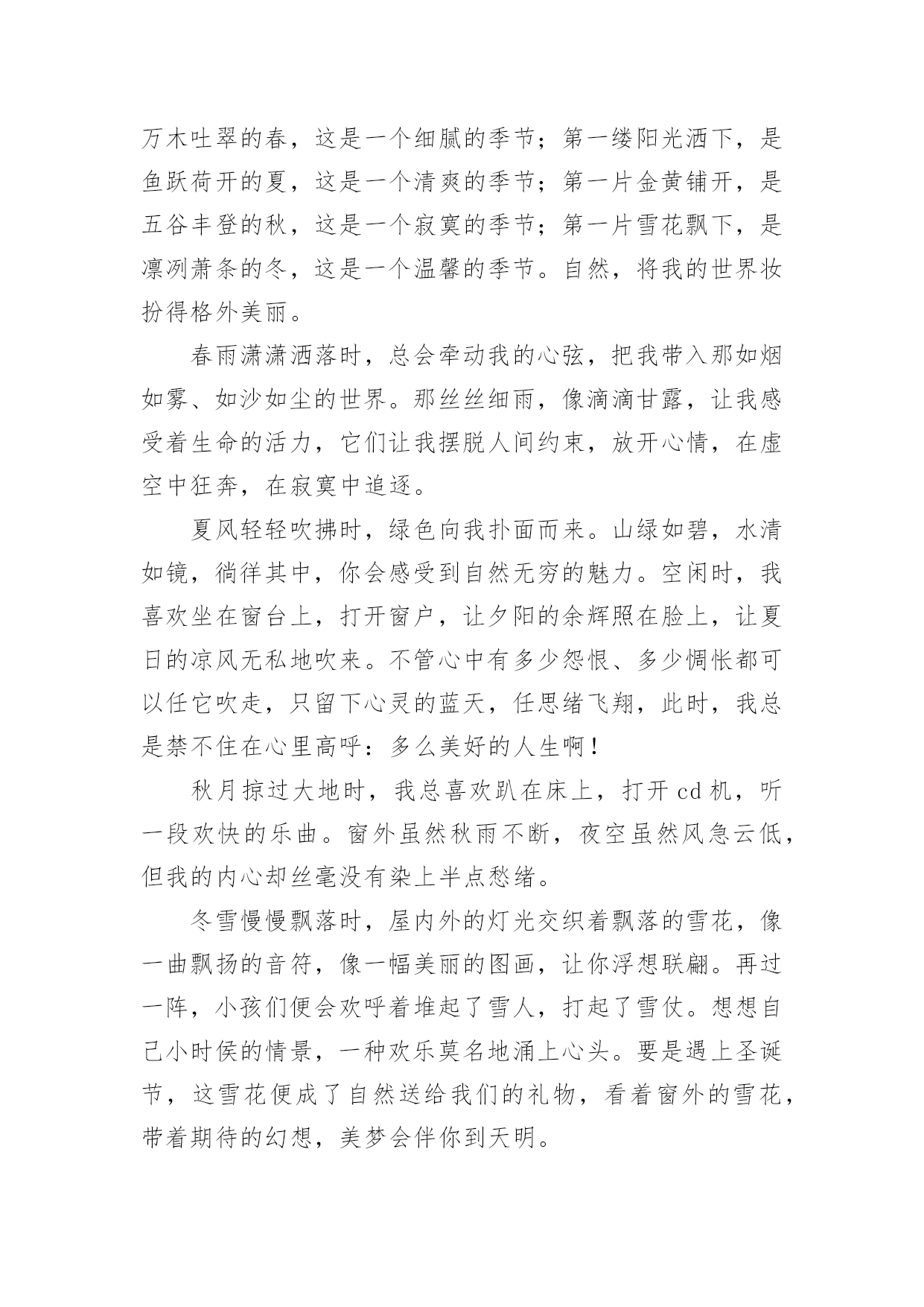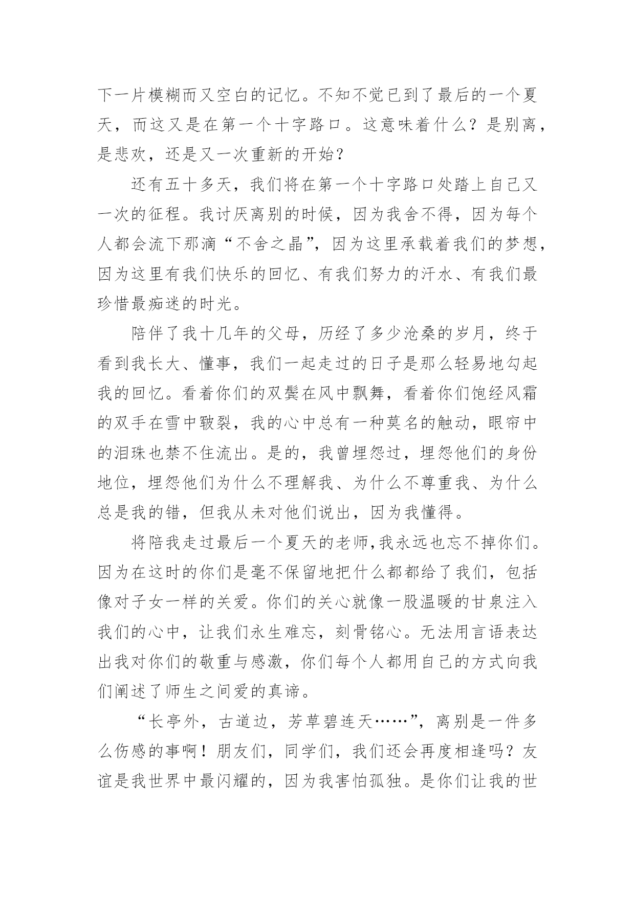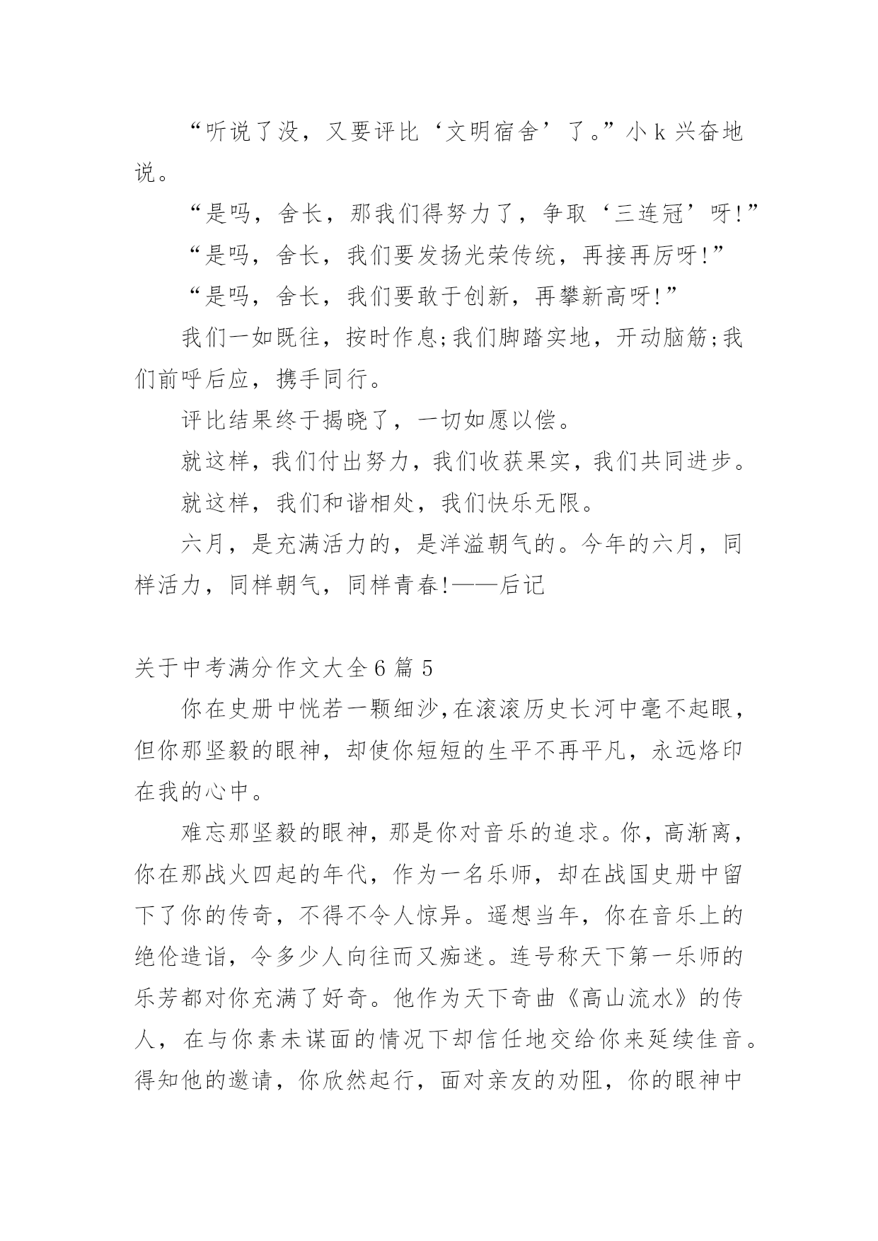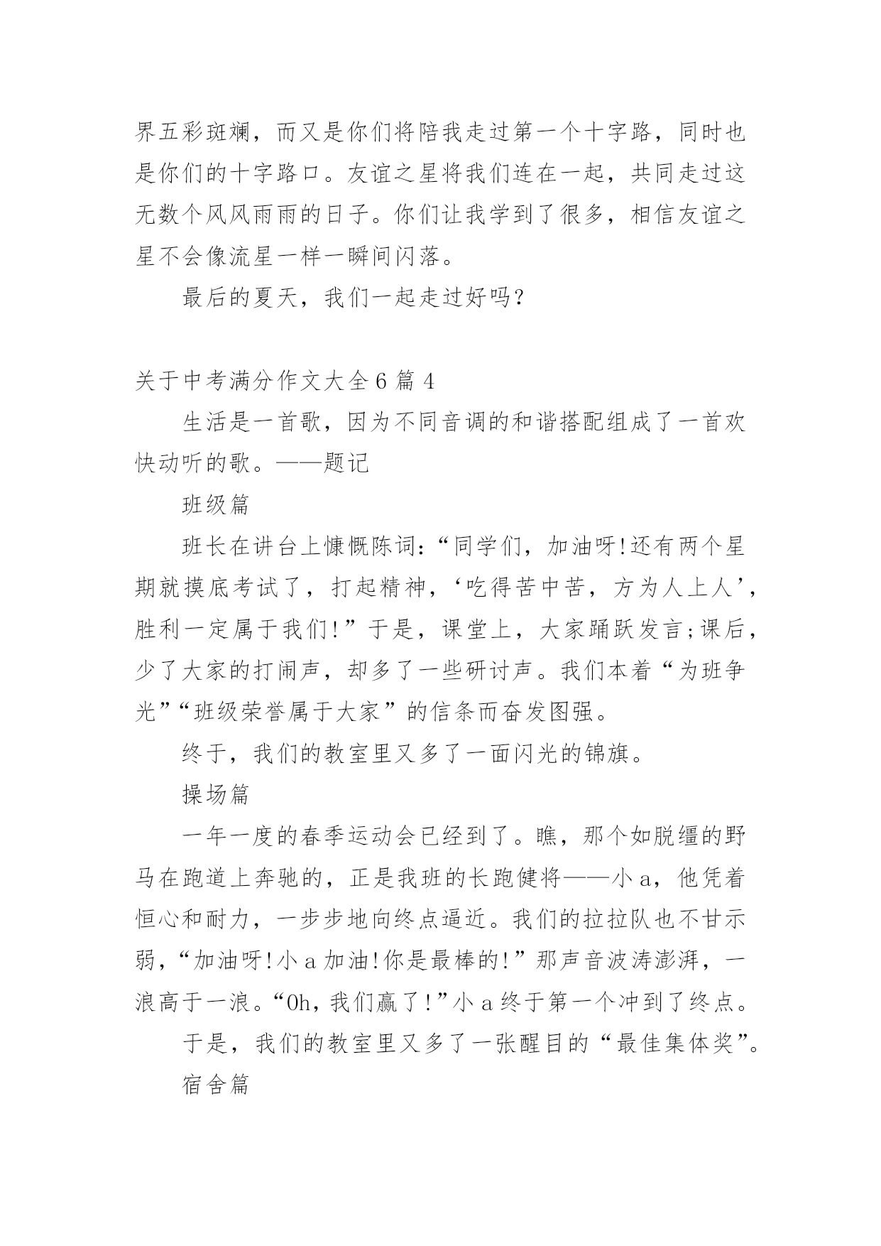 中考满分作文关于中考满分作文大全6篇在学习、工作乃至生活中,大家都有写作文的经历,对作文很是熟悉吧,作文可分为小学作文、中学作文、大学作文(论文)。相信许多人会觉得作文很难写吧,以下是小编为大家收集的关于中考满分作文大全6篇,欢迎阅读与收藏。关于中考满分作文大全6篇1从小到大,我习惯了一个人的平淡,就不再幻想从别人世界中寻找幸福。但是,一次偶然的机会我却发现,爱就在身边。从小,我跟着奶奶长大,由于家庭原因,爸爸妈妈都在外地打工,只有在过年的时候才能见到一面。我童年的记忆里似乎充满了不公平,我认为我应该是个不幸的孩子。又是一个星期五,我又要一个人回家。天空飘着洋洋洒洒的雪花,我缩着脖子,背着沉甸甸的书包,穿过熙熙攘攘的人流,羡慕地望着那些被爸爸妈妈接到的同学们,走了很长一段路,去坐公交车。终于,公交车来了,我搓搓手,来不及抖掉衣服上的雪,急忙窜上去,坐在角落里。车窗外的树,一棵棵从眼前晃过。天气好冷,我的心里也凉凉的。到站了,我从车上下来。还要再走一段路,才能到家。“儿子!”一个激动的声音跃入我的耳朵,我感觉好熟悉。可是,我明明知道,那不可能是妈妈的声音。我没有回头,继续走我的路。远处,又传来一声呼叫声,我下意识的回头,那是妈妈呀,那真的是妈妈!我有点欣喜若狂,大步跑上前去。没错,真的是妈妈,是我朝思暮想的妈妈。我激动地说:“妈,你啥时候回来的?我可想你了!”妈妈摸摸我的头:“你爸我俩今年早点回来陪你,不愿意呀,快上车回家吧。”我有点怀疑这是不是真的,但妈妈就在我的身边啊。我坐在电车的后座,把手插到妈妈的兜里,那一刻,我拥有了从未有过的温暖,我闭上眼睛,把头依偎在妈妈的背上。雪依然在下,可我的心里是满满的温暖。我突然发现,原来,爱就在这里。关于中考满分作文大全6篇2记忆是绚烂的夏花,它像泪水凋零不见;记忆是参天的故事,它像微笑经久不衰。脑海的深处,那些温暖的眼泪却不断纷飞,永远留在最深的角落里,成为我的最爱。那是一个烦闷的夏日午后,知了聒噪地鸣叫,伴随着老师严厉的训斥,放学后,教室只剩下我一个人。我恶狠狠地将试卷揉成一团,塞进沉重的书包,忐忑不安地踏上了回家的征途。家中,母亲早已坐在了沙发上等候着。我不敢想象风平浪静的现在怎样转变为一会儿的狂风暴雨。?昨天的考试卷发分了吗??还没等我回过神来,母亲温和的声音将我拽回到现实。我僵硬的点了点头。母亲面带微笑地对我说:?拿来,让我看看无意间,我对上了母亲平静的双眼,我想:这也许是暴风雨来临的前兆吧!想到这,我的身子微微颤抖,手心里沁出微小的汗珠。我闭上眼睛,握握拳头,深呼一口气。慢悠悠地拉开了书包的拉链,摸索着找出那张皱巴巴的试卷,抚平后将卷子递了上去。赫然在目的?75?分,还有布满试卷的红叉映入眼帘。我低下了头,不敢去直视母亲的脸庞唉!?空气里荡漾着一声叹息。周围的`空气似乎背什么牵绊住了,我好似要窒息了。不知不觉中,眼角渗出了湿润的液体,划过我的脸庞。责骂声却没有紧跟其后,我看见妈妈从沙发上站起来,走向我,然后摸了摸我的后脑勺,很轻很温柔,让那泪水僵直地在脸颊上立正。妈妈语重心长地说:?没关系,哪能每次都考九十多分呀,失误一次很正常,但绝对不能一而再,再而三地出现我诧异地抬头看着她,浮在她脸上的不是愤怒与失望,而是举世无双的笑靥。她又揉了揉我的肩膀,轻轻拍了两下,说:?琪琪,别哭了……?窗外的阳光更加明媚灿烂,知了声戛然而止,一切美好如初。眼泪在天空中纷飞飘扬,我在心中珍藏了这温暖的眼泪,珍藏了理解的往事,珍藏了父母的浓情。关于中考满分作文大全6篇3最后的夏天,将在第一个十字路口终结。——题记时间流逝的是这样的快,快的不留下一丝的痕迹,只留下一片模糊而又空白的记忆。不知不觉已到了最后的一个夏天,而这又是在第一个十字路口。这意味着什么?是别离,是悲欢,还是又一次重新的开始?还有五十多天,我们将在第一个十字路口处踏上自己又一次的征程。我讨厌离别的时候,因为我舍不得,因为每个人都会流下那滴“不舍之晶”,因为这里承载着我们的梦想,因为这里有我们快乐的回忆、有我们努力的汗水、有我们最珍惜最痴迷的时光。陪伴了我十几年的父母,历经了多少沧桑的岁月,终于看到我长大、懂事,我们一起走过的日子是那么轻易地勾起我的回忆。看着你们的双鬓在风中飘舞,看着你们饱经风霜的双手在雪中皲裂,我的心中总有一种莫名的触动,眼帘中的泪珠也禁不住流出。是的,我曾埋怨过,埋怨他们的身份地位,埋怨他们为什么不理解我、为什么不尊重我、为什么总是我的错,但我从未对他们说出,因为我懂得。将陪我走过最后一个夏天的老师,我永远也忘不掉你们。因为在这时的你们是毫不保留地把什么都都给了我们,包括像对子女一样的关爱。你们的关心就像一股温暖的甘泉注入我们的心中,让我们永生难忘,刻骨铭心。无法用言语表达出我对你们的敬重与感激,你们每个人都用自