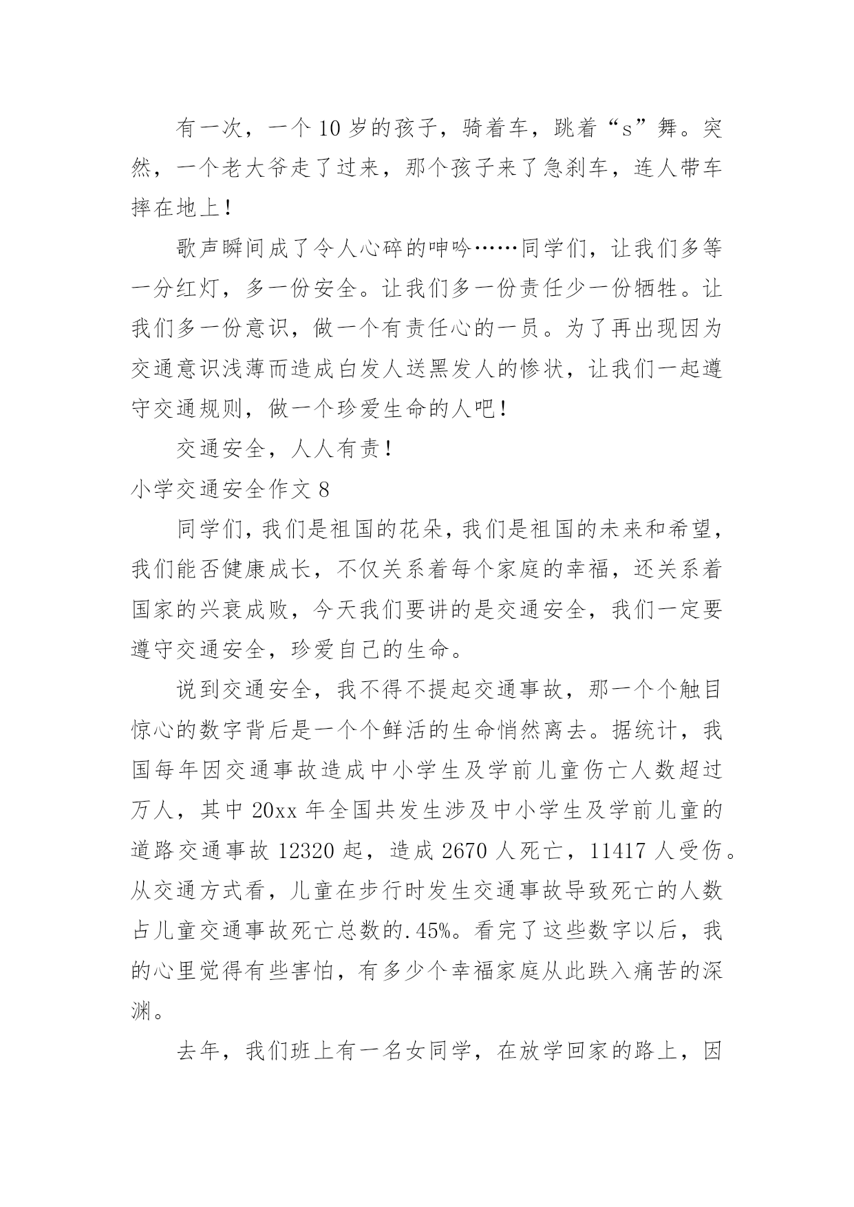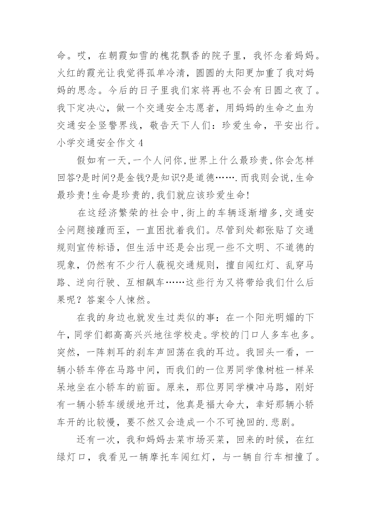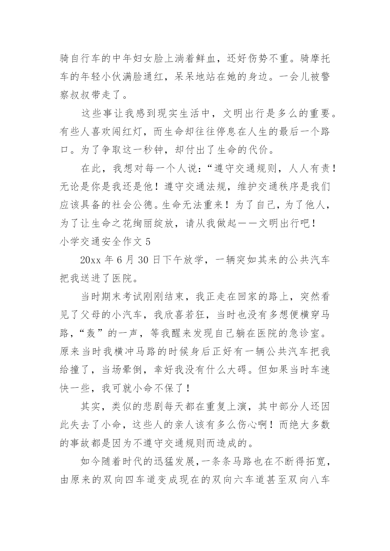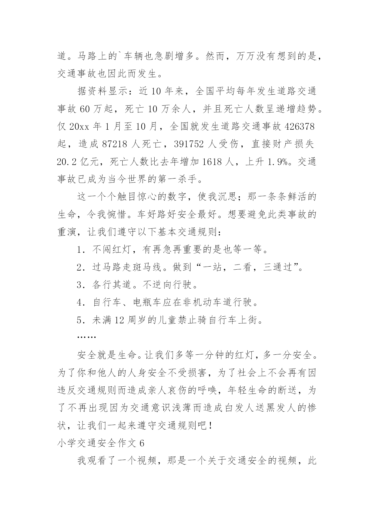 小学交通安全作文小学交通安全作文15篇在学习、工作乃至生活中,大家都不可避免地会接触到作文吧,作文一定要做到主题集中,围绕同一主题作深入阐述,切忌东拉西扯,主题涣散甚至无主题。你知道作文怎样写才规范吗?以下是小编为大家收集的小学交通安全作文,欢迎阅读与收藏。小学交通安全作文1交通事故时时刻刻都会发生,它就像颗威力十足的炸药,一时大意,这颗埋伏在我们生活中的炸药就会爆炸,炸得家庭破碎,炸得人心悲苦。所以我们要遵守交通规则。我们家附近有一个小女孩,她的父亲就是因为一次交通事故而离开了她。小女孩家里并不富裕,但是她和父亲母亲一起生活得很开心。每天早晨起来,母亲都会给她和父亲做上一顿美味的早餐,一家人很温馨。吃完早餐,父亲骑车送她去上学。一路上,父女俩总是有说有笑。放学后,不管风雨多大,小女孩总是看见父亲耐心地在等待着。回家的路上,小女孩总是开开心心地向父亲诉说学校一天所发生的一些有趣的事。有一天,小女孩的父亲像平常一样到学校去接小女孩。然而,一辆迎面而来的大卡车由于违规行驶,把小女孩的父亲撞倒在地,父亲当场就死去了。一刹那间,死神就夺走了他的生命,他多么希望自己还活着,他多么希望陪在小女孩身边,他多么希望能够看着女儿长大??小女孩并不知道自己的父亲已经去世了,她还是像平常一样在学校门口等她的`父亲来接,等了好久,还是没人来接她,小女孩心里想:为什么到这时候父亲还没来接呢?是不是出事了?还是家里有什么事?小女孩心里很着急。当小女孩得知自己的父亲已经死去,她似乎傻了,她扑在父亲的尸体上不断哀求:“父亲快醒醒!我要父亲!我要父亲??”她多么希望这场交通事故没有发生,多么渴望父亲能够醒来,象平常一样用自行车载着她上下学啊!交通事故是那么可怕,一刹那间,就夺走了人的生命。现在路上的车辆越来越多,马路越来越拥挤,同时交通事故也越来越多,每年,有多少的生命被夺走,有多少个家庭被破坏,有多少人要失去亲人了。如果我们每个人心中都有交通规则,每个人都能自觉遵守交通规则。我相信一定可以避免很多悲惨的交通事故。让交通法规在我人们心中生根吧,让我们牢牢记住:遵守交通规则就是珍爱生命!小学交通安全作文2随着经济地日益发展,我们的生活环境已变得越来越美丽,马路上车辆川流不息的景象随处可见。然而由于有些人交通安全意识淡薄,在车水马龙的马路上,上演了一幕幕不可挽回的悲剧。当你看到一个个鲜活的生命消失于车轮之下,当你发现一阵阵欢声笑语淹没在尖锐的汽笛声中,当你面对那些触目惊心的场景,能不感到痛心疾首吗?道路交通安全事故依然是各种事故领域的“头号杀手”。而导致悲剧发生的一个重要原因,就是我们欠缺安全防范知识。因此,对少年儿童进行安全教育的形势相当紧迫。有专家指出,通过安全教育,提高小学生的自我保护能力,80%的意外伤害事故是可以避免的。红灯短暂而生命长久,所以我们应该认真学习交通安全法律法规,遵守交通规则,加强安全意识,树立交通安全文明公德;徒步横穿马路时,时刻保持一颗清醒的头脑,不在马路上嬉戏打闹;过红绿灯时,多一分谦让与耐心,不闯红灯,走人行横道,绝不能贪一时之快。人让车,让出一片温情,让出一片秩序;车让人,让出一片安全,让出一份理解。只有人与车互相谦让,才能尽可能地避免交通事故,我们只有懂得更多,生命才会多一份保障。有这样一个故事:几个学者与一个老者同船共渡。学者们问老者是否懂得什么叫哲学,老者连连摇头。学者们纷纷叹息:“那你已经失去了一半的生命。”这时一个巨浪打来,小船被掀翻了,老者问:“你们会不会游泳?”学者们异口同声地说:“不会。”老者叹口气:“那你们就失去了全部的`生命。”虽然这只是个故事,但其蕴含的哲理耐人寻味:灾难发生时,如果人们缺少应有的警惕,不懂起码的安全常识,那么,危险一旦降临,生命就将无可挽回。生命,因安全而“美丽”!小学交通安全作文3月亮下去了,朝霞如血出来了。花儿、草儿绽开笑脸,扭着腰枝,醒来了,但是,我可爱的妈妈,却再也回不来了。一场突如其来的车祸,夺走了她年青的生命,打散了全家的幸福。我再也不能撒娇的喊一声“妈妈”了。落日的余晖不时的变换着颜色,好像上帝在天空涂上了金色、红色和黄色,那里有妈妈的鲜血。珍宝失去了还可以找到,而生命丢失了却永远无法找回。生命之花是刚毅的,它让人思索,它让人追求,他让人领悟,只要有毅力,它可以克服一切困难。然而,生命又如一颗弱不禁风的小草,那么脆弱,只要稍不注意,它就会从你的手中溜走。可见我们的生命多么需要安全啊!车祸是夺取人类生命的无形车手,一天里、一年里,不知因车祸消失的生命有多少,无数个无辜的孩子失去了母爱、父爱;无数个家庭失去了顶梁柱;无数个父母失去了孩子。那一声声喊,一滴滴泪,触目惊心、撼天动地。血的教训,“开快车,”血的`教训,“疲劳驾车,”血的教训,“酒后驾车。”有生命,有健康,才有未来;有