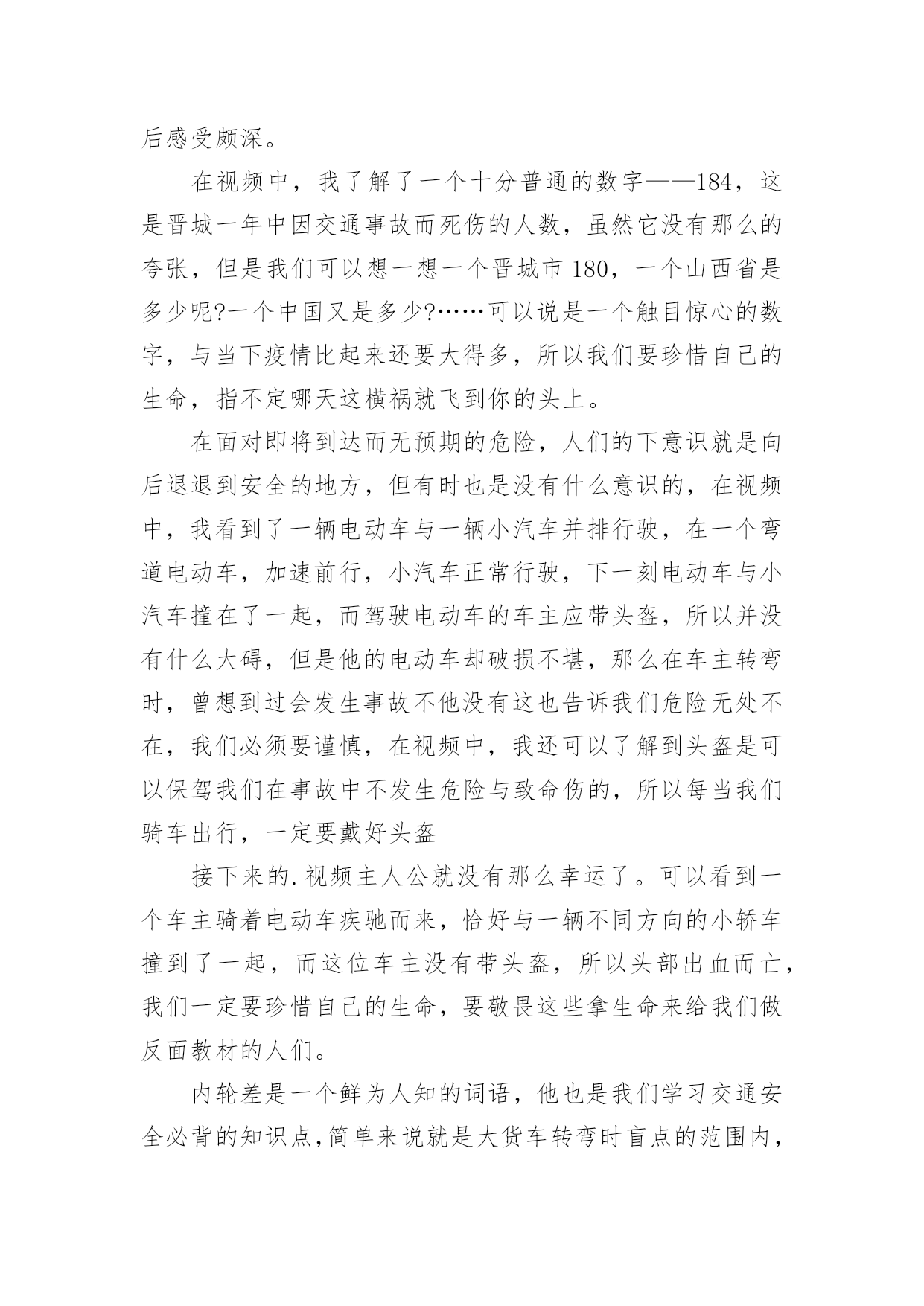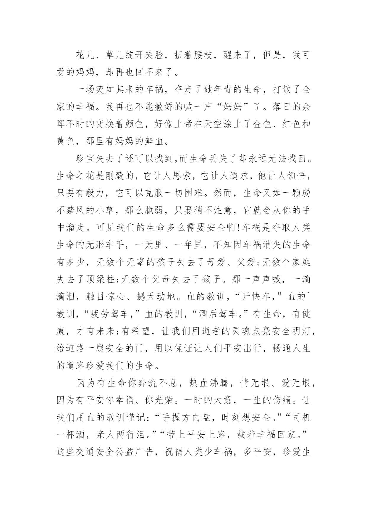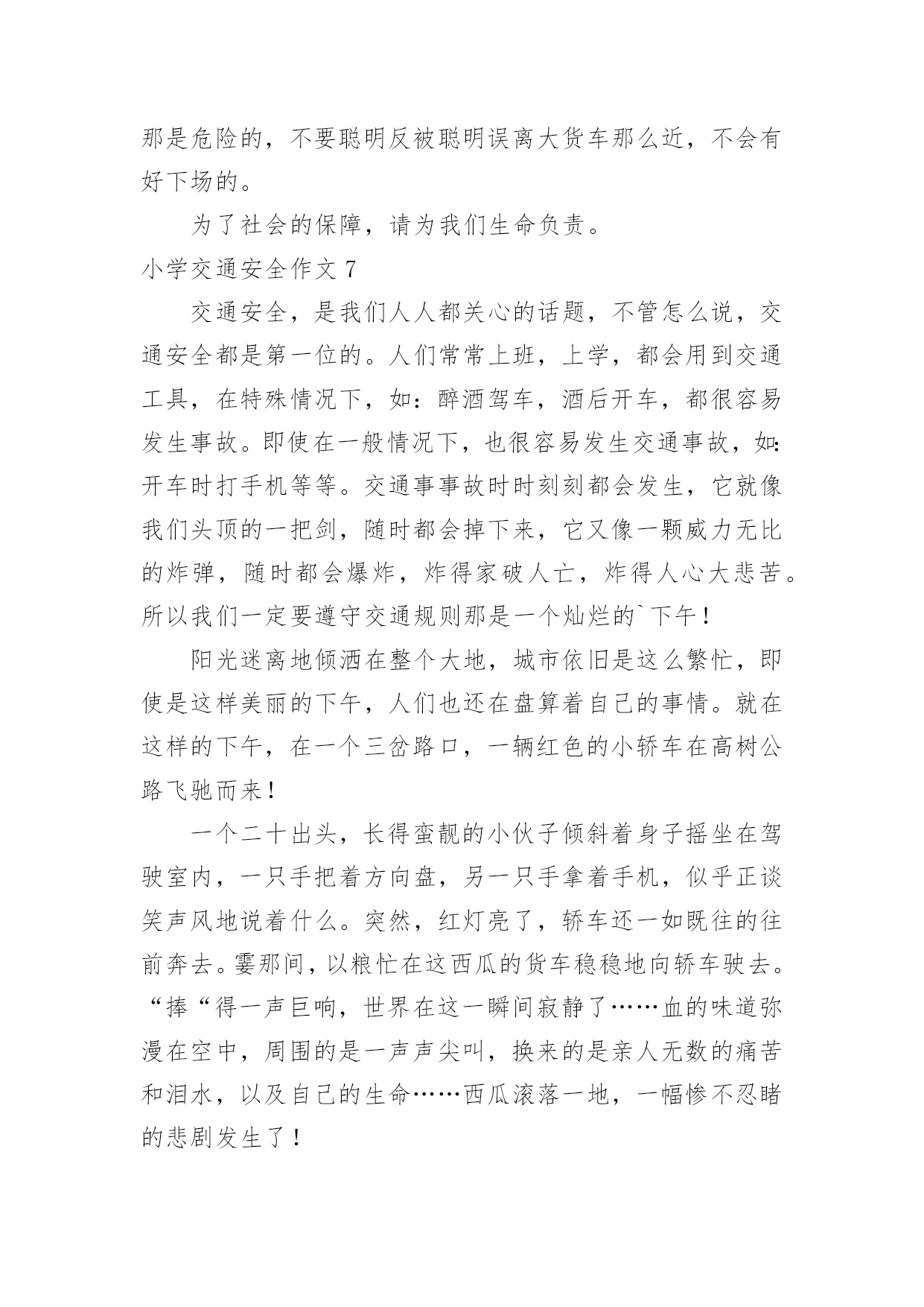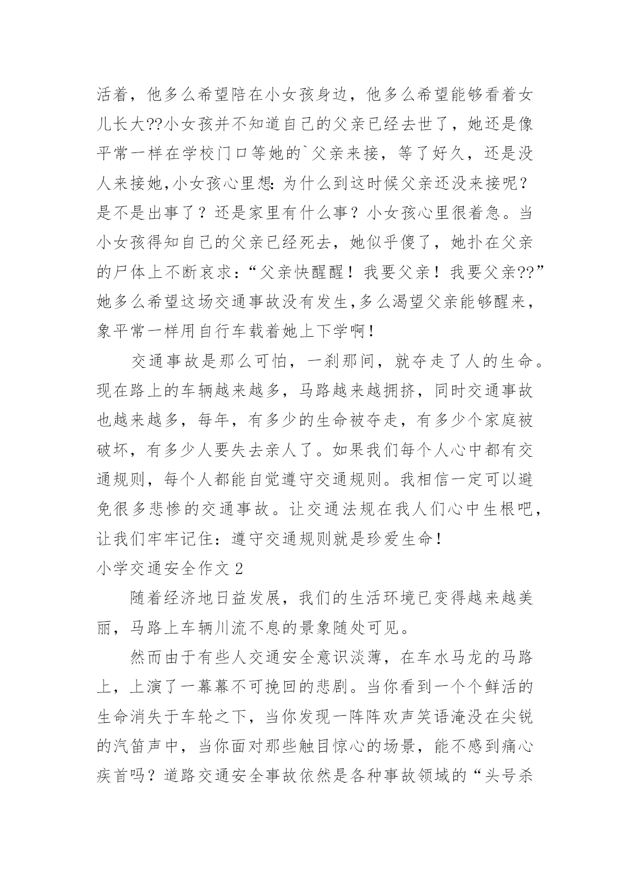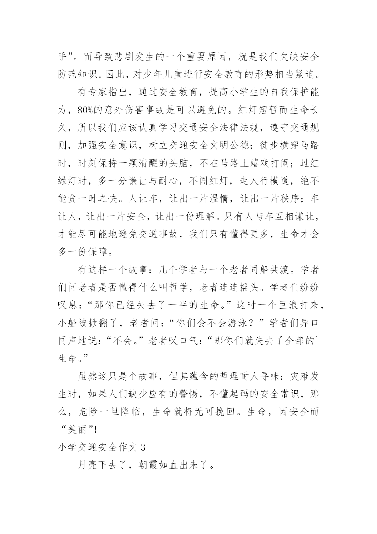 小学交通安全作文小学交通安全作文15篇在学习、工作乃至生活中,大家都不可避免地会接触到作文吧,作文一定要做到主题集中,围绕同一主题作深入阐述,切忌东拉西扯,主题涣散甚至无主题。你知道作文怎样写才规范吗?以下是小编为大家收集的小学交通安全作文,欢迎阅读与收藏。小学交通安全作文1交通事故时时刻刻都会发生,它就像颗威力十足的炸药,一时大意,这颗埋伏在我们生活中的炸药就会爆炸,炸得家庭破碎,炸得人心悲苦。所以我们要遵守交通规则。我们家附近有一个小女孩,她的父亲就是因为一次交通事故而离开了她。小女孩家里并不富裕,但是她和父亲母亲一起生活得很开心。每天早晨起来,母亲都会给她和父亲做上一顿美味的早餐,一家人很温馨。吃完早餐,父亲骑车送她去上学。一路上,父女俩总是有说有笑。放学后,不管风雨多大,小女孩总是看见父亲耐心地在等待着。回家的路上,小女孩总是开开心心地向父亲诉说学校一天所发生的一些有趣的事。有一天,小女孩的父亲像平常一样到学校去接小女孩。然而,一辆迎面而来的大卡车由于违规行驶,把小女孩的父亲撞倒在地,父亲当场就死去了。一刹那间,死神就夺走了他的生命,他多么希望自己还活着,他多么希望陪在小女孩身边,他多么希望能够看着女儿长大??小女孩并不知道自己的父亲已经去世了,她还是像平常一样在学校门口等她的`父亲来接,等了好久,还是没人来接她,小女孩心里想:为什么到这时候父亲还没来接呢?是不是出事了?还是家里有什么事?小女孩心里很着急。当小女孩得知自己的父亲已经死去,她似乎傻了,她扑在父亲的尸体上不断哀求:“父亲快醒醒!我要父亲!我要父亲??”她多么希望这场交通事故没有发生,多么渴望父亲能够醒来,象平常一样用自行车载着她上下学啊!交通事故是那么可怕,一刹那间,就夺走了人的生命。现在路上的车辆越来越多,马路越来越拥挤,同时交通事故也越来越多,每年,有多少的生命被夺走,有多少个家庭被破坏,有多少人要失去亲人了。如果我们每个人心中都有交通规则,每个人都能自觉遵守交通规则。我相信一定可以避免很多悲惨的交通事故。让交通法规在我人们心中生根吧,让我们牢牢记住:遵守交通规则就是珍爱生命!小学交通安全作文2随着经济地日益发展,我们的生活环境已变得越来越美丽,马路上车辆川流不息的景象随处可见。然而由于有些人交通安全意识淡薄,在车水马龙的马路上,上演了一幕幕不可挽回的悲剧。当你看到一个个鲜活的生命消失于车轮之下,当你发现一阵阵欢声笑语淹没在尖锐的汽笛声中,当你面对那些触目惊心的场景,能不感到痛心疾首吗?道路交通安全事故依然是各种事故领域的“头号杀手”。而导致悲剧发生的一个重要原因,就是我们欠缺安全防范知识。因此,对少年儿童进行安全教育的形势相当紧迫。有专家指出,通过安全教育,提高小学生的自我保护能力,80%的意外伤害事故是可以避免的。红灯短暂而生命长久,所以我们应该认真学习交通安全法律法规,遵守交通规则,加强安全意识,树立交通安全文明公德;徒步横穿马路时,时刻保持一颗清醒的头脑,不在马路上嬉戏打闹;过红绿灯时,多一分谦让与耐心,不闯红灯,走人行横道,绝不能贪一时之快。人让车,让出一片温情,让出一片秩序;车让人,让出一片安全,让出一份理解。只有人与车互相谦让,才能尽可能地避免交通事故,我们只有懂得更多,生命才会多一份保障。有这样一个故事:几个学者与一个老者同船共渡。学者们问老者是否懂得什么叫哲学,老者连连摇头。学者们纷纷叹息:“那你已经失去了一半的生命。”这时一个巨浪打来,小船被掀翻了,老者问:“你们会不会游泳?”学者们异口同声地说:“不会。”老者叹口气:“那你们就失去了全部的`生命。”虽然这只是个故事,但其蕴含的哲理耐人寻味:灾难发生时,如果人们缺少应有的警惕,不懂起码的安全常识,那么,危险一旦降临,生命就将无可挽回。生命,因安全而“美丽”!小学交通安全作文3月亮下去了,朝霞如血出来了。花儿、草儿绽开笑脸,扭着腰枝,醒来了,但是,我可爱的妈妈,却再也回不来了。一场突如其来的车祸,夺走了她年青的生命,打散了全家的幸福。我再也不能撒娇的喊一声“妈妈”了。落日的余晖不时的变换着颜色,好像上帝在天空涂上了金色、红色和黄色,那里有妈妈的鲜血。珍宝失去了还可以找到,而生命丢失了却永远无法找回。生命之花是刚毅的,它让人思索,它让人追求,他让人领悟,只要有毅力,它可以克服一切困难。然而,生命又如一颗弱不禁风的小草,那么脆弱,只要稍不注意,它就会从你的手中溜走。可见我们的生命多么需要安全啊!车祸是夺取人类生命的无形车手,一天里、一年里,不知因车祸消失的生命有多少,无数个无辜的孩子失去了母爱、父爱;无数个家庭失去了顶梁柱;无数个父母失去了孩子。那一声声喊,一滴滴泪,触目惊心、撼天动地。血的教训,“开快车,”血的`教训,“疲劳驾车,”血的教训,“酒后驾车。”有生命,有健康,才有未来;有