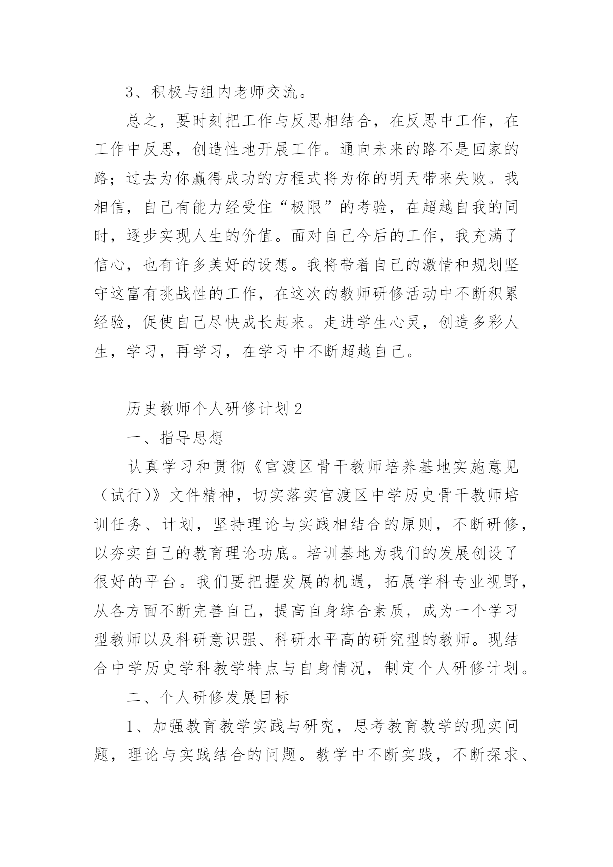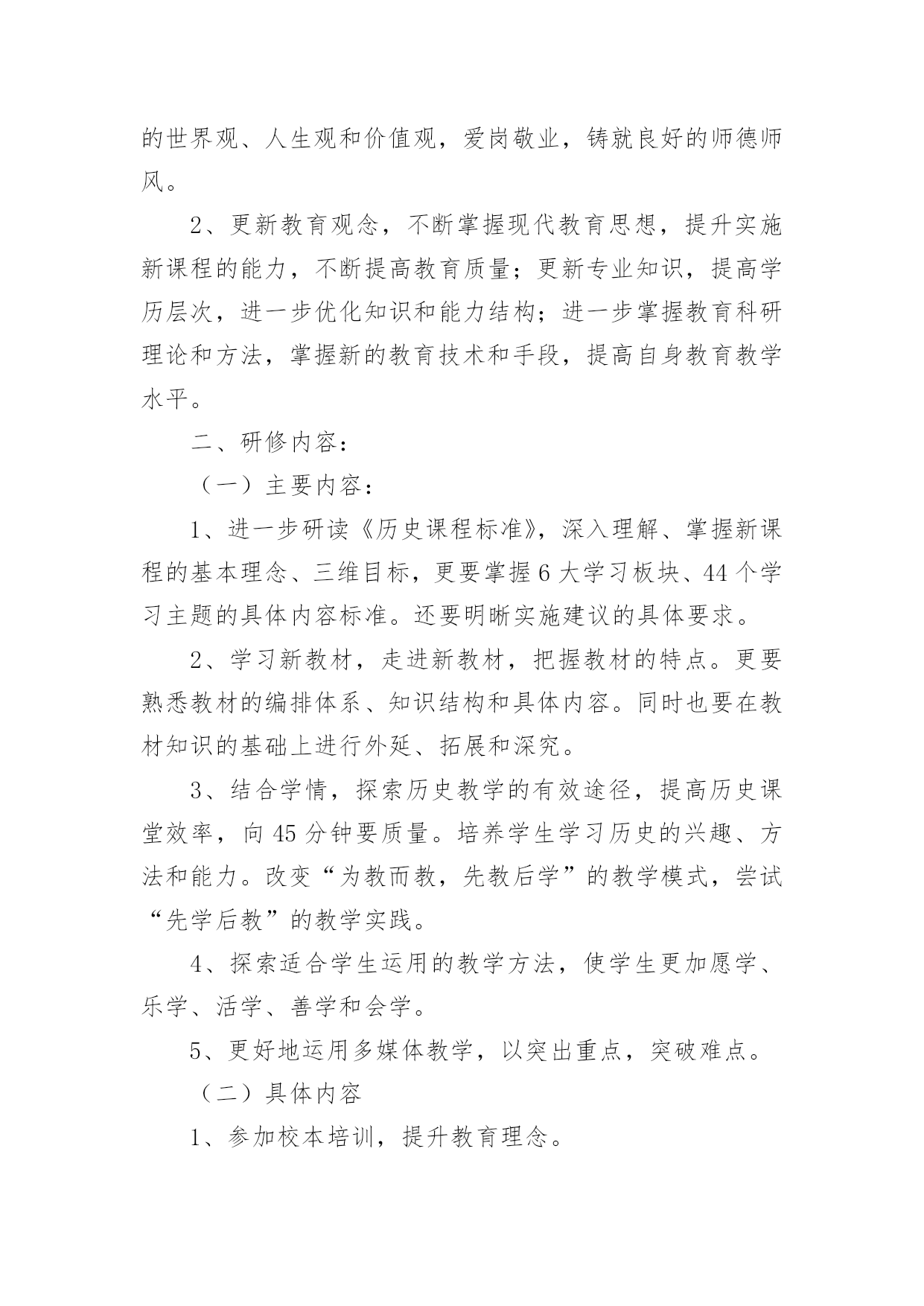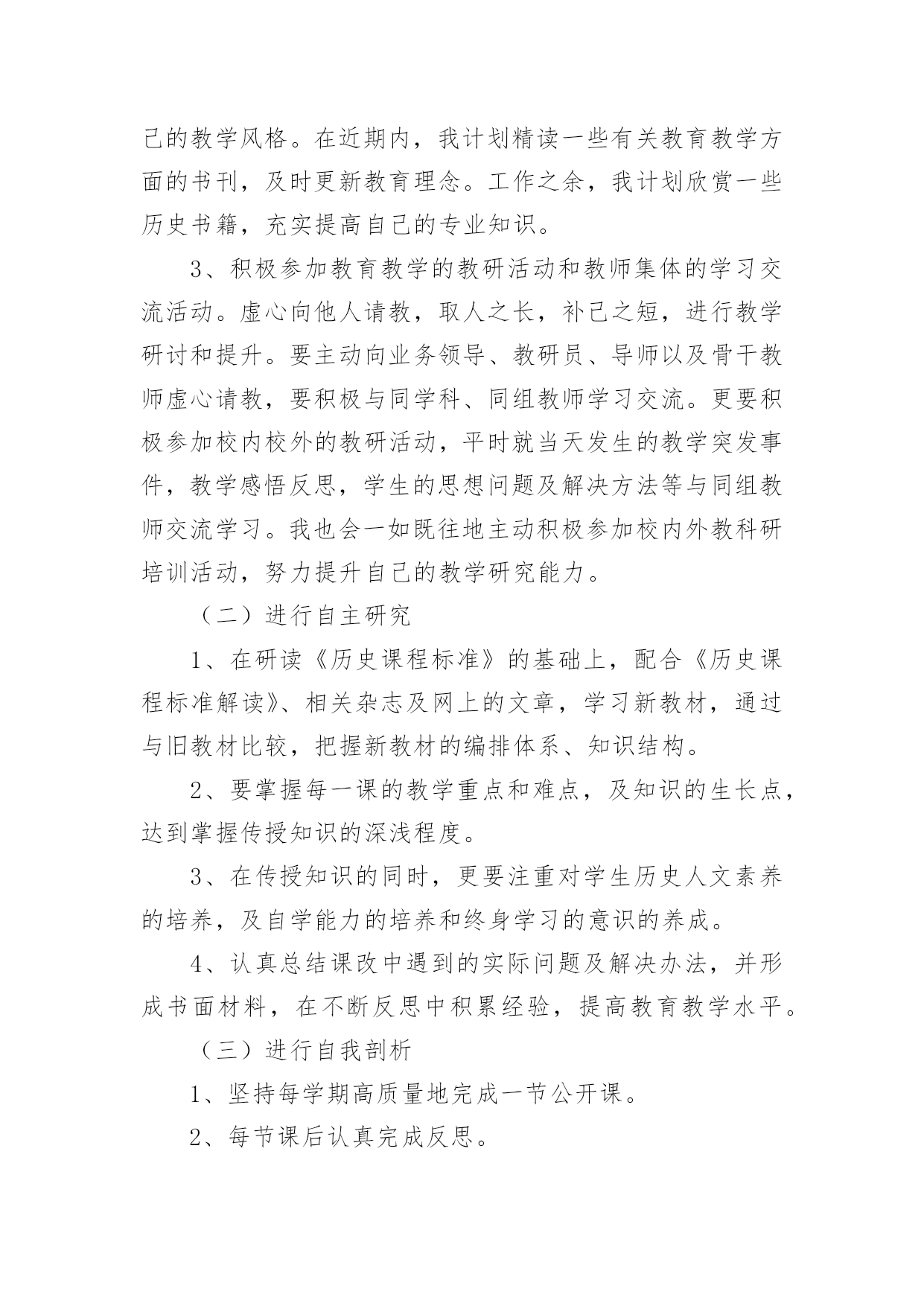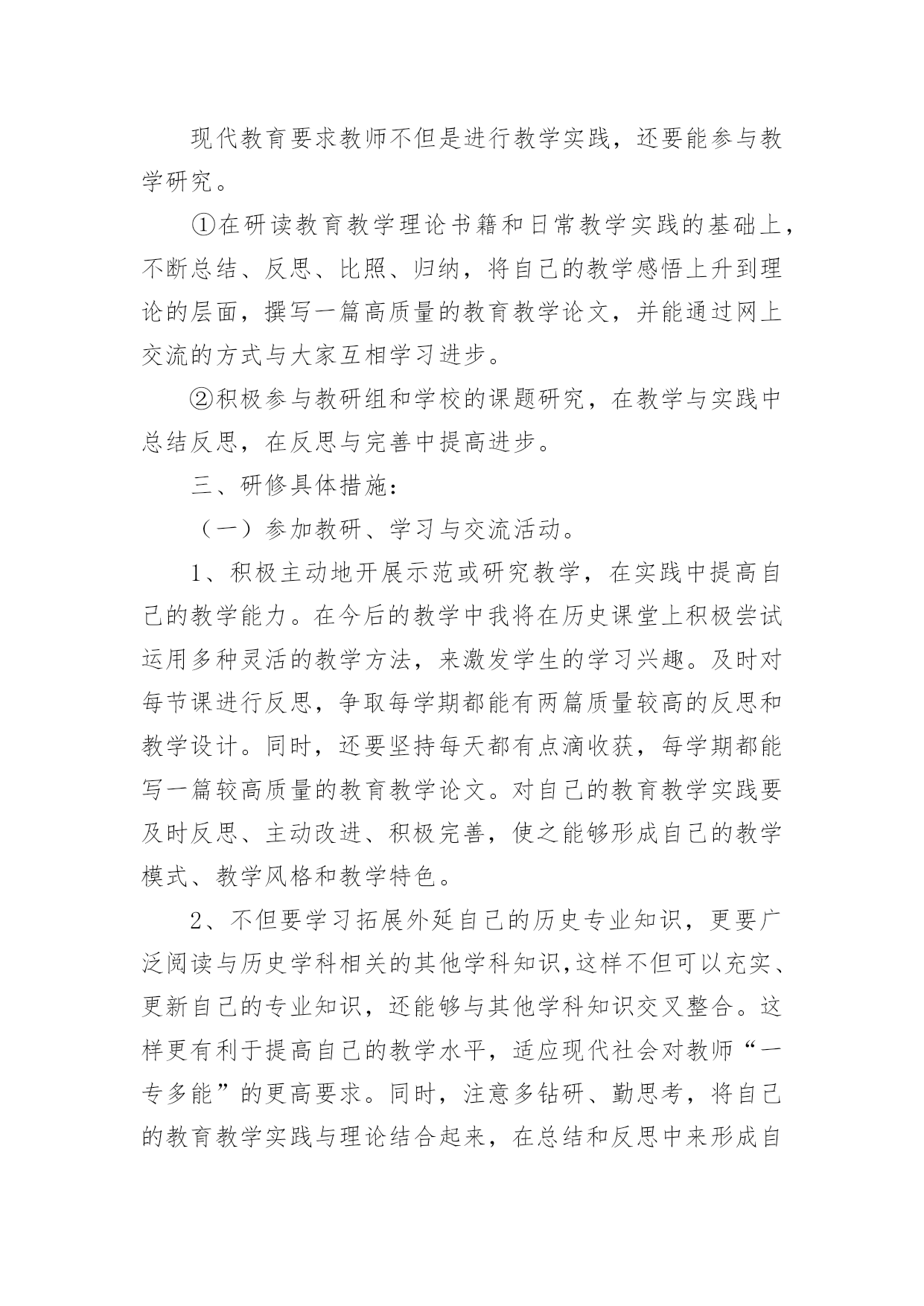 历史教师个人研修计划历史教师个人研修计划范文光阴迅速,一眨眼就过去了,我们的工作同时也在不断更新迭代中,该为自己下阶段的学习制定一个计划了。相信大家又在为写计划犯愁了吧?下面是小编为大家收集的历史教师个人研修计划范文,欢迎大家分享。历史教师个人研修计划1新一轮课改带来了教学理念、教学内容、教学方式的巨大变化。面对扑面而来的变革,我深深懂得:新时代呼唤新的教育理念,现代教师应当了解新的教育理念,只有用新理念指导实践,才会有新的教学方法,适应时代的要求。作为现代教师我们不仅要作为知识的传授者,同时要成为知识的学习者、更要变为知识的创造者。我认为最重要的一环就是教师对知识的学习,要时时学、处处学、更要终身学。这样才能与时俱进,跟上时代的步伐,适应时代的要求。因此教师更要变被动培训为主动研修,这样就为我们的知识学习指明了方向,也给我们搭建了一个认识自我,反思教育,自觉提高的平台。为此,我制定了自己的研修计划,以便更好地树立新课程理念,初步实现教育教学方式、学习方式和教研方式的转变,提高新课程的实践能力和创新能力。一、研修目标:1、通过集体培训、个人研修,使自己进一步树立正确的世界观、人生观和价值观,爱岗敬业,铸就良好的师德师风。2、更新教育观念,不断掌握现代教育思想,提升实施新课程的能力,不断提高教育质量;更新专业知识,提高学历层次,进一步优化知识和能力结构;进一步掌握教育科研理论和方法,掌握新的教育技术和手段,提高自身教育教学水平。二、研修内容:(一)主要内容:1、进一步研读《历史课程标准》,深入理解、掌握新课程的基本理念、三维目标,更要掌握6大学习板块、44个学习主题的具体内容标准。还要明晰实施建议的具体要求。2、学习新教材,走进新教材,把握教材的特点。更要熟悉教材的编排体系、知识结构和具体内容。同时也要在教材知识的基础上进行外延、拓展和深究。3、结合学情,探索历史教学的有效途径,提高历史课堂效率,向45分钟要质量。培养学生学习历史的兴趣、方法和能力。改变“为教而教,先教后学”的教学模式,尝试“先学后教”的教学实践。4、探索适合学生运用的教学方法,使学生更加愿学、乐学、活学、善学和会学。5、更好地运用多媒体教学,以突出重点,突破难点。(二)具体内容1、参加校本培训,提升教育理念。现代教育发展可谓是日新月异,为此教师必须不断学习,不断思考,只有成为一名“学习型”的教师才能适应发展。①积极参加校本培训,并能不断反思总结,致力于自身的业务水平发展和教育理论水平的提高。②积极主动向业务领导、教研员、导师、骨干教师请教,聆听专家的专题讲座,也要利用好自己参加的初中教师专业适岗培训平台,在网上与众多教师交流、研讨。这样可以学习他们的先进教育教学思想、理念、经验和方法,并能不断内化,为自己的发展提供“养料”。另外对区域教研活动也要积极参与,以便促进自己的学习与进步。2、立足课堂教学,形成个人特色。课堂是教师工作的主阵地,教育教学工作实施的基本途径就是课堂,因此作为教师深入研究课堂教学,努力提高自身的课堂教学水平是十分必要和重要的。①日常教学中要备好每节课,进行深入的课堂教学研究。积极参与教研组和校内外的教研活动,虚心学习,博采众长,并能在教学工作中发挥骨干教师的作用。②主动地进行研讨课教学,研修期间开设一、二节校级以上的公开展示课,并能形成一份高质量的教学反思与总结。通过教学实践来提高自己的教学能力,在与组员们共同研讨的过程中反思、感悟,形成自己的教学风格。③能充分利用世界大学城、堂堂网的网络资源平台,在网络平台上发表自己的学习成果,及时与其他教师进行交流。3、注重教育科研,促进专业发展。现代教育要求教师不但是进行教学实践,还要能参与教学研究。①在研读教育教学理论书籍和日常教学实践的基础上,不断总结、反思、比照、归纳,将自己的教学感悟上升到理论的层面,撰写一篇高质量的教育教学论文,并能通过网上交流的方式与大家互相学习进步。②积极参与教研组和学校的课题研究,在教学与实践中总结反思,在反思与完善中提高进步。三、研修具体措施:(一)参加教研、学习与交流活动。1、积极主动地开展示范或研究教学,在实践中提高自己的教学能力。在今后的教学中我将在历史课堂上积极尝试运用多种灵活的教学方法,来激发学生的学习兴趣。及时对每节课进行反思,争取每学期都能有两篇质量较高的反思和教学设计。同时,还要坚持每天都有点滴收获,每学期都能写一篇较高质量的教育教学论文。对自己的教育教学实践要及时反思、主动改进、积极完善,使之能够形成自己的教学模式、教学风格和教学特色。2、不但要学习拓展外延自己的历史专业知识,更要广泛阅读与历史学科相关的其他学科知识,这样不但可以充实、更新自己的专业知识,还能够与其他学科知识交叉整合。这样更有利于提高自己的教学水平,适应现代社会对教师“一专多能”