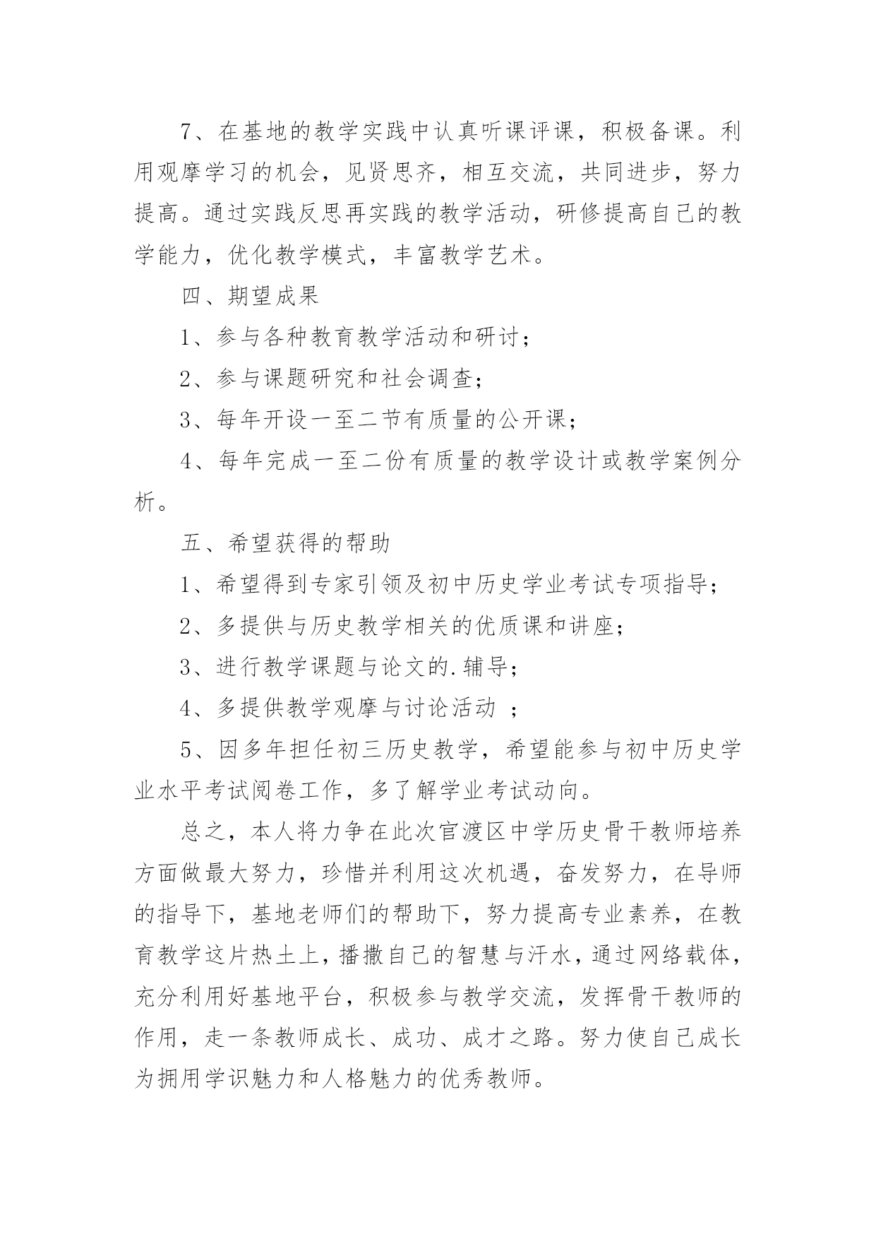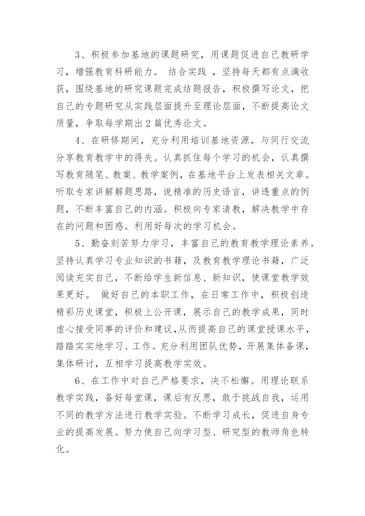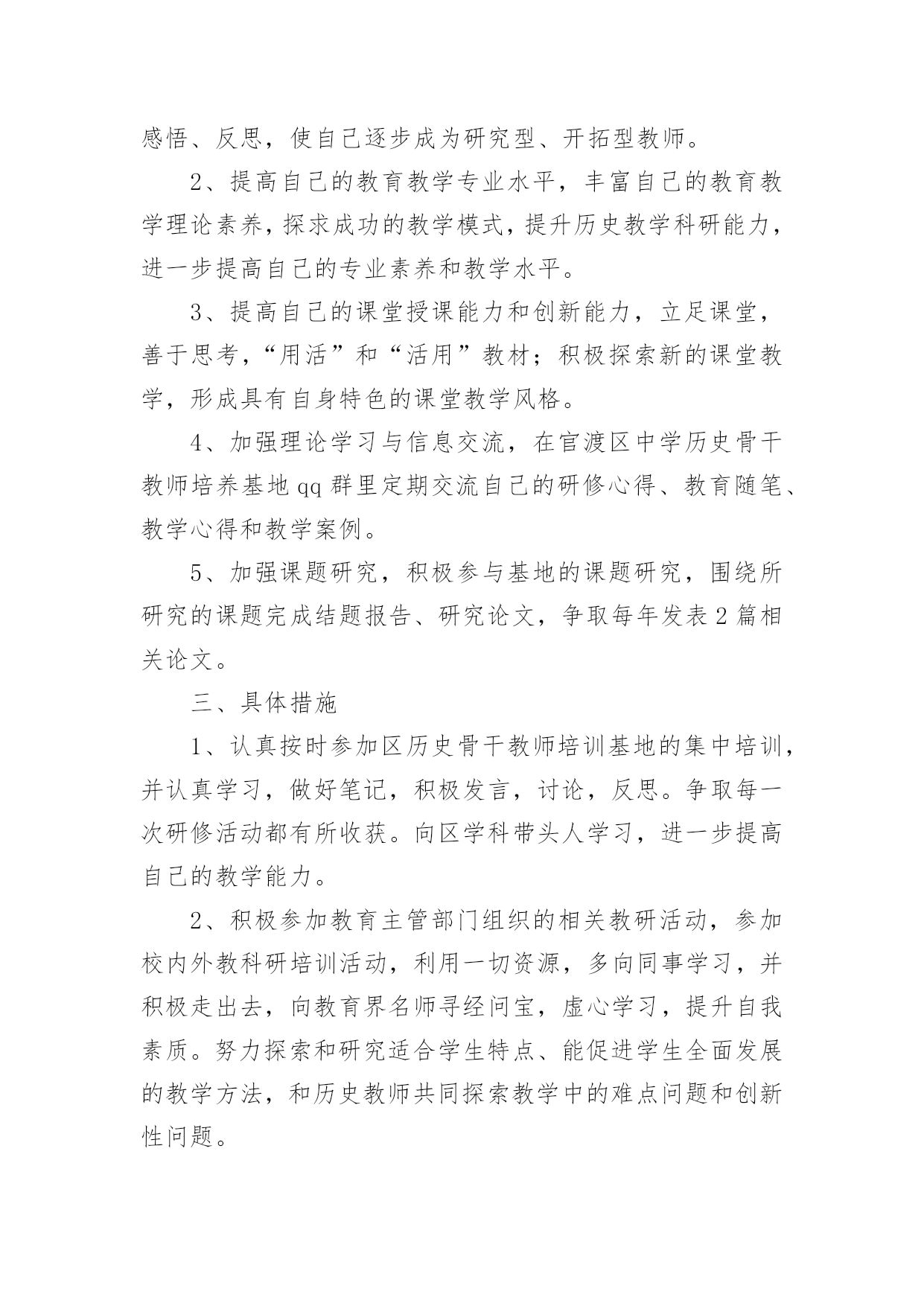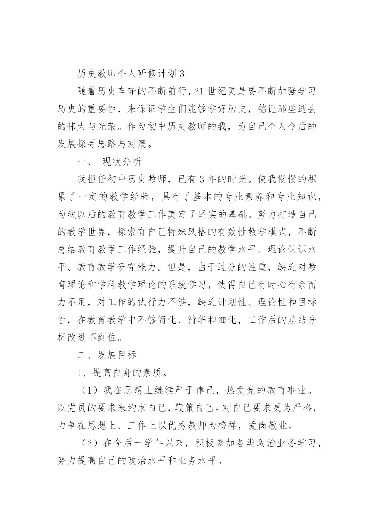 历史教师个人研修计划历史教师个人研修计划范文光阴迅速,一眨眼就过去了,我们的工作同时也在不断更新迭代中,该为自己下阶段的学习制定一个计划了。相信大家又在为写计划犯愁了吧?下面是小编为大家收集的历史教师个人研修计划范文,欢迎大家分享。历史教师个人研修计划1新一轮课改带来了教学理念、教学内容、教学方式的巨大变化。面对扑面而来的变革,我深深懂得:新时代呼唤新的教育理念,现代教师应当了解新的教育理念,只有用新理念指导实践,才会有新的教学方法,适应时代的要求。作为现代教师我们不仅要作为知识的传授者,同时要成为知识的学习者、更要变为知识的创造者。我认为最重要的一环就是教师对知识的学习,要时时学、处处学、更要终身学。这样才能与时俱进,跟上时代的步伐,适应时代的要求。因此教师更要变被动培训为主动研修,这样就为我们的知识学习指明了方向,也给我们搭建了一个认识自我,反思教育,自觉提高的平台。为此,我制定了自己的研修计划,以便更好地树立新课程理念,初步实现教育教学方式、学习方式和教研方式的转变,提高新课程的实践能力和创新能力。一、研修目标:1、通过集体培训、个人研修,使自己进一步树立正确的世界观、人生观和价值观,爱岗敬业,铸就良好的师德师风。2、更新教育观念,不断掌握现代教育思想,提升实施新课程的能力,不断提高教育质量;更新专业知识,提高学历层次,进一步优化知识和能力结构;进一步掌握教育科研理论和方法,掌握新的教育技术和手段,提高自身教育教学水平。二、研修内容:(一)主要内容:1、进一步研读《历史课程标准》,深入理解、掌握新课程的基本理念、三维目标,更要掌握6大学习板块、44个学习主题的具体内容标准。还要明晰实施建议的具体要求。2、学习新教材,走进新教材,把握教材的特点。更要熟悉教材的编排体系、知识结构和具体内容。同时也要在教材知识的基础上进行外延、拓展和深究。3、结合学情,探索历史教学的有效途径,提高历史课堂效率,向45分钟要质量。培养学生学习历史的兴趣、方法和能力。改变“为教而教,先教后学”的教学模式,尝试“先学后教”的教学实践。4、探索适合学生运用的教学方法,使学生更加愿学、乐学、活学、善学和会学。5、更好地运用多媒体教学,以突出重点,突破难点。(二)具体内容1、参加校本培训,提升教育理念。现代教育发展可谓是日新月异,为此教师必须不断学习,不断思考,只有成为一名“学习型”的教师才能适应发展。①积极参加校本培训,并能不断反思总结,致力于自身的业务水平发展和教育理论水平的提高。②积极主动向业务领导、教研员、导师、骨干教师请教,聆听专家的专题讲座,也要利用好自己参加的初中教师专业适岗培训平台,在网上与众多教师交流、研讨。这样可以学习他们的先进教育教学思想、理念、经验和方法,并能不断内化,为自己的发展提供“养料”。另外对区域教研活动也要积极参与,以便促进自己的学习与进步。2、立足课堂教学,形成个人特色。课堂是教师工作的主阵地,教育教学工作实施的基本途径就是课堂,因此作为教师深入研究课堂教学,努力提高自身的课堂教学水平是十分必要和重要的。①日常教学中要备好每节课,进行深入的课堂教学研究。积极参与教研组和校内外的教研活动,虚心学习,博采众长,并能在教学工作中发挥骨干教师的作用。②主动地进行研讨课教学,研修期间开设一、二节校级以上的公开展示课,并能形成一份高质量的教学反思与总结。通过教学实践来提高自己的教学能力,在与组员们共同研讨的过程中反思、感悟,形成自己的教学风格。③能充分利用世界大学城、堂堂网的网络资源平台,在网络平台上发表自己的学习成果,及时与其他教师进行交流。3、注重教育科研,促进专业发展。现代教育要求教师不但是进行教学实践,还要能参与教学研究。①在研读教育教学理论书籍和日常教学实践的基础上,不断总结、反思、比照、归纳,将自己的教学感悟上升到理论的层面,撰写一篇高质量的教育教学论文,并能通过网上交流的方式与大家互相学习进步。②积极参与教研组和学校的课题研究,在教学与实践中总结反思,在反思与完善中提高进步。三、研修具体措施:(一)参加教研、学习与交流活动。1、积极主动地开展示范或研究教学,在实践中提高自己的教学能力。在今后的教学中我将在历史课堂上积极尝试运用多种灵活的教学方法,来激发学生的学习兴趣。及时对每节课进行反思,争取每学期都能有两篇质量较高的反思和教学设计。同时,还要坚持每天都有点滴收获,每学期都能写一篇较高质量的教育教学论文。对自己的教育教学实践要及时反思、主动改进、积极完善,使之能够形成自己的教学模式、教学风格和教学特色。2、不但要学习拓展外延自己的历史专业知识,更要广泛阅读与历史学科相关的其他学科知识,这样不但可以充实、更新自己的专业知识,还能够与其他学科知识交叉整合。这样更有利于提高自己的教学水平,适应现代社会对教师“一专多能”