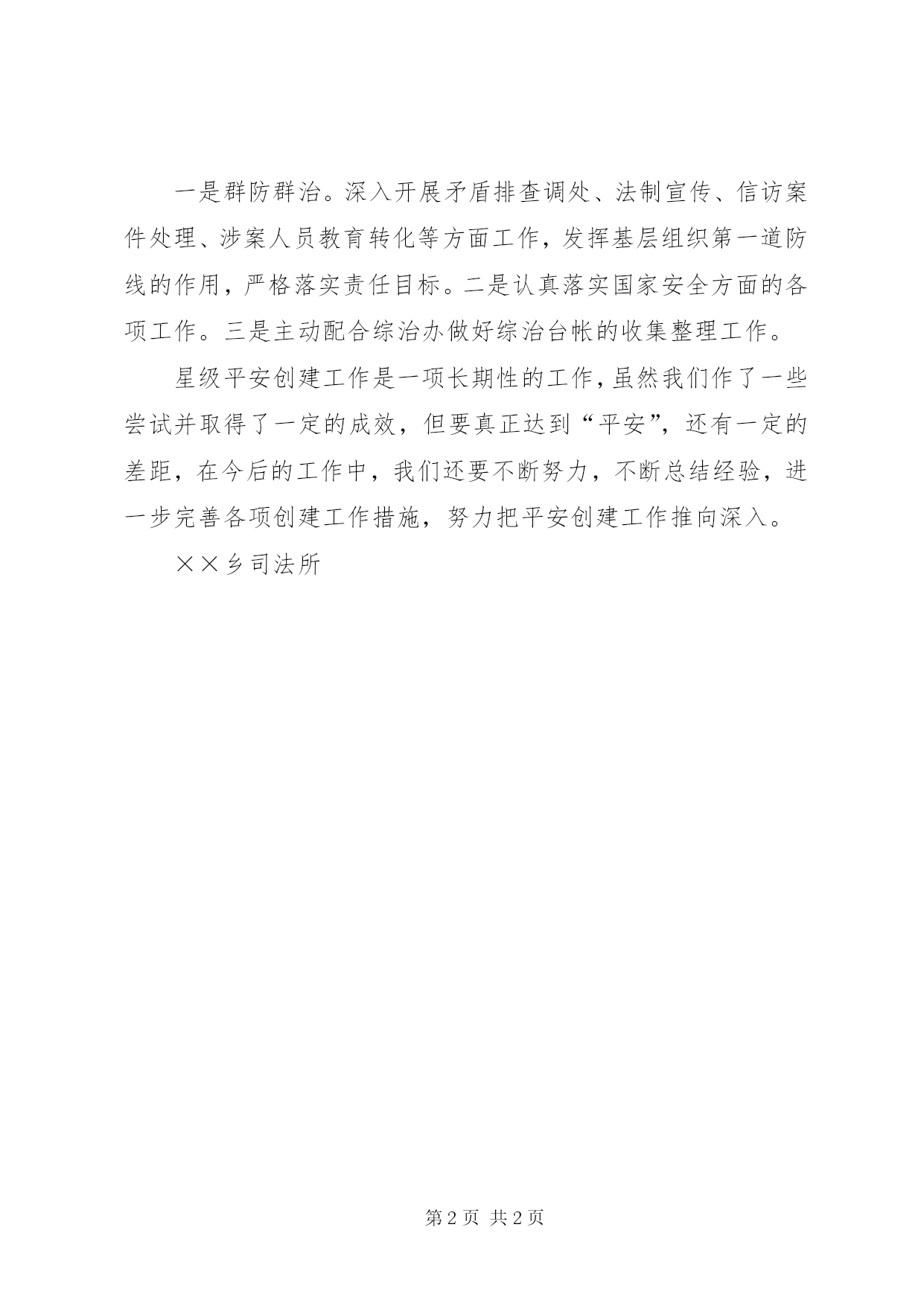 第PAGE\*Arabic\*MERGEFORMAT2页共NUMPAGES\*MERGEFORMAT2页乡镇司法所“星级平安”申报材料一、认真处理每一起矛盾纠纷今年以来,我所以高度的责任感认真进行矛盾纠纷大排查,层层排查。我所每周就深入乡村进行一次\摸排,街道遇到矛盾纠纷及时上报进展,对于简单的纠纷当场进行调解处理,复杂的纠纷汇报给上级领导后,与相关部门联合进行调处,有力的维护了辖区社会稳定。二、做好刑释解教人员的安置帮教工作自“星级平安”创建工作开展以来,为了营造一个稳定和谐环境,我所对去年刑释解教人员进行了后续排查,与派出所、治保会、居民组和对象户家中详细了解,并建立了档案,充实了帮教组织,掌握了他们的去向、从事的职业和思想状况。现我街道刑释解教人员,均在当地就业,我们还为多名符合低保条件的刑释人员落实了低保政策,帮助多名刑满释放人员解决了就业。三、不断加强法制宣传教育工作一是我所认真制定“五五普法规划”和2009年的法制宣传教育计划。二是举办了综治、法制、信访培训班,对街道社区200名普法骨干进行了培训。三是将《信访条例》、《治安管理处罚法》、《物权法》、《未成年人保护法》等有关法律知识,发到辖区单位金额社区。四是结合中心工作开展法制宣传。四、积极参与社会治安综合治理工作一是群防群治。深入开展矛盾排查调处、法制宣传、信访案件处理、涉案人员教育转化等方面工作,发挥基层组织第一道防线的作用,严格落实责任目标。二是认真落实国家安全方面的各项工作。三是主动配合综治办做好综治台帐的收集整理工作。星级平安创建工作是一项长期性的工作,虽然我们作了一些尝试并取得了一定的成效,但要真正达到“平安”,还有一定的差距,在今后的工作中,我们还要不断努力,不断总结经验,进一步完善各项创建工作措施,努力把平安创建工作推向深入。××乡司法所