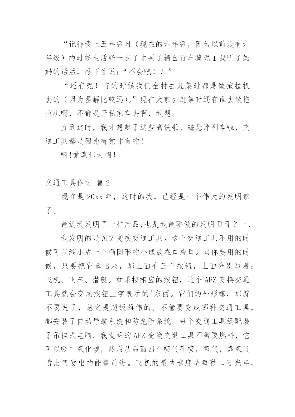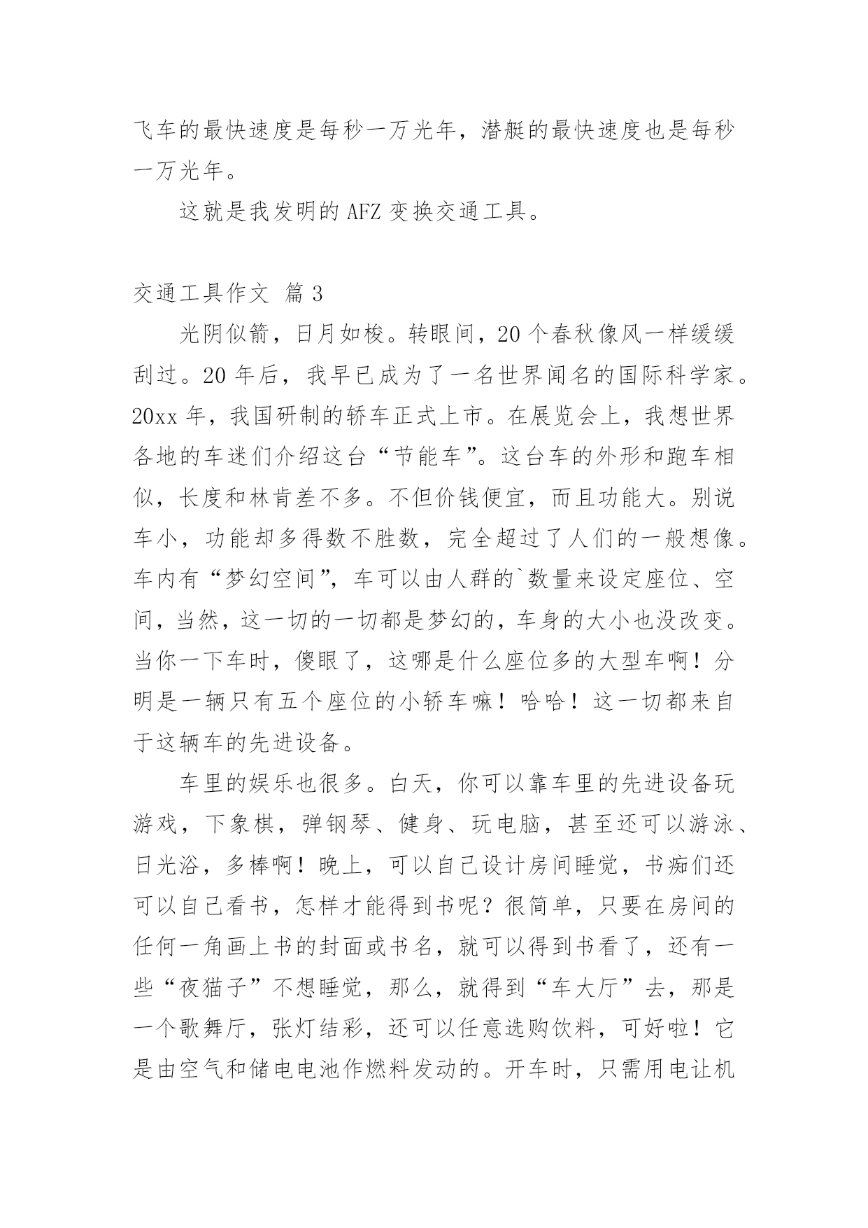 交通工具作文在学习、工作或生活中,大家或多或少都会接触过作文吧,借助作文可以提高我们的语言组织能力。写起作文来就毫无头绪?下面是小编帮大家整理的交通工具作文3篇,欢迎大家分享。交通工具作文篇1在星期六的那天,阳光明媚,天气很好。妈妈向爸爸建议道:“不如我们回一趟老家吧,我们在家反正也蛮无聊的,去老家看看他们(外公外婆),多陪陪他们吧1我从小就是外公外婆养大的,所以,跟们的感情并不亚于跟爸爸妈妈的'感情,而且,我们已经很长时间没回去看望他们了,这一会一听是要回去探望他们,我高兴得不得了,还没等爸爸回答,我就抢先答道:“好哇!我们赶快出发吧1妈妈听了笑眯眯的说:“你啊!记得的外公外婆,一听到看他们魂都没了!”“行了,我们赶快走吧,有什么话车上再说”我说完就冲下楼。上了车,爸爸认为走高加快,便选择了这条路。可我们上了高架就发现,走高架并不快——高价竟然堵车了,我坐在抱怨道:“真实的,竟然堵车了,真耽误时间1妈妈听了说:“你这个小兔崽子真不知足,我们那小时候可比这苦多了!以前有辆自行车就能让全村人都羡慕得不得了,现在我们家有辆汽车你都抱怨,如果你在我们那个年代你还不天天抱怨啊!“记得我上五年级时(现在的六年级,因为以前没有六年级)的时候生活好一点了才买了辆自行车骑呢1我听了妈妈的话后,忍不住说:“不会吧!?”“还有呢!有的时候我们全村去赶集时都是做拖拉机去的(因为理解比较远)。”现在大家去赶集时还有谁去做拖拉机啊,不都是开私家车去啊,我想。直到这时,我才想起了这些高铁啦、磁悬浮列车啦,交通工具都是因为有党才有的!啊!党真伟大啊!交通工具作文篇2现在是20xx年,这时的我,已经是一个伟大的发明家了。最近我发明了一样产品,也是我最骄傲的发明项目之一。我发明的是AFZ变换交通工具。这个交通工具不用的时候可以缩小成一个椭圆形的小球放在口袋里。当你要用的时候,只要把它拿出来,那上面有三个按钮,上面分别写着:飞机、飞车、潜艇。如果按相应的按钮,这个AFZ变换交通工具就会变成按钮上字表示的'东西。它们的外形嘛,那就不要说了,总之是超级雄伟的。不管要变成哪种交通工具,都安装了自动导航系统和防危险系统。每个交通工具还配装了吊挂式电脑。我发明的AFZ变换交通工具不需要燃料,它可以吸二氧化碳,然后从后面四个喷气孔喷出氧气,靠氧气喷出气发出的能量前进。飞机的最快速度是每秒二万光年,飞车的最快速度是每秒一万光年,潜艇的最快速度也是每秒一万光年。这就是我发明的AFZ变换交通工具。交通工具作文篇3光阴似箭,日月如梭。转眼间,20个春秋像风一样缓缓刮过。20年后,我早已成为了一名世界闻名的国际科学家。20xx年,我国研制的轿车正式上市。在展览会上,我想世界各地的车迷们介绍这台“节能车”。这台车的外形和跑车相似,长度和林肯差不多。不但价钱便宜,而且功能大。别说车小,功能却多得数不胜数,完全超过了人们的一般想像。车内有“梦幻空间”,车可以由人群的`数量来设定座位、空间,当然,这一切的一切都是梦幻的,车身的大小也没改变。当你一下车时,傻眼了,这哪是什么座位多的大型车啊!分明是一辆只有五个座位的小轿车嘛!哈哈!这一切都来自于这辆车的先进设备。车里的娱乐也很多。白天,你可以靠车里的先进设备玩游戏,下象棋,弹钢琴、健身、玩电脑,甚至还可以游泳、日光浴,多棒啊!晚上,可以自己设计房间睡觉,书痴们还可以自己看书,怎样才能得到书呢?很简单,只要在房间的任何一角画上书的封面或书名,就可以得到书看了,还有一些“夜猫子”不想睡觉,那么,就得到“车大厅”去,那是一个歌舞厅,张灯结彩,还可以任意选购饮料,可好啦!它是由空气和储电电池作燃料发动的。开车时,只需用电让机器转动,利用空气的力量开动。所以你不用担心路上没了燃料。他还可以适用海陆空。在地上,只要按一个按钮把轮子弄出来。在天上,只需要把轮子收起来。在海里,只要紧闭门窗,利用水和空气,就可以当船和潜水艇一样用。我相信,不久后,世界各地都会使用我发明的“节能车”。