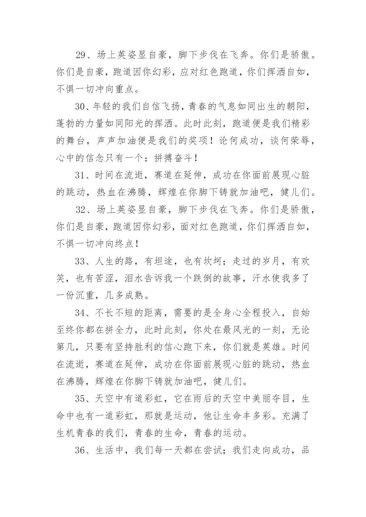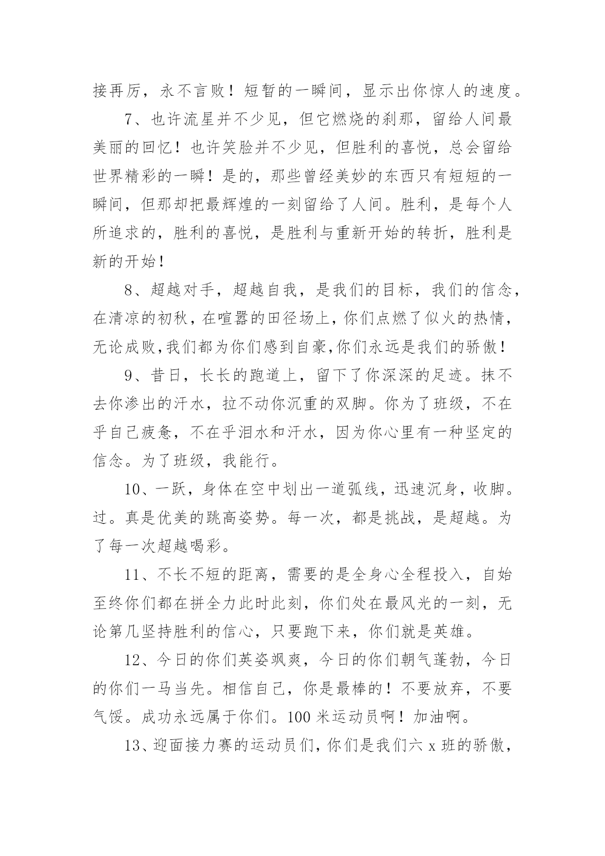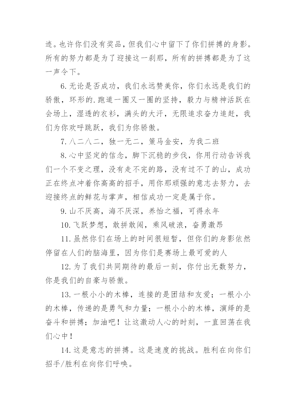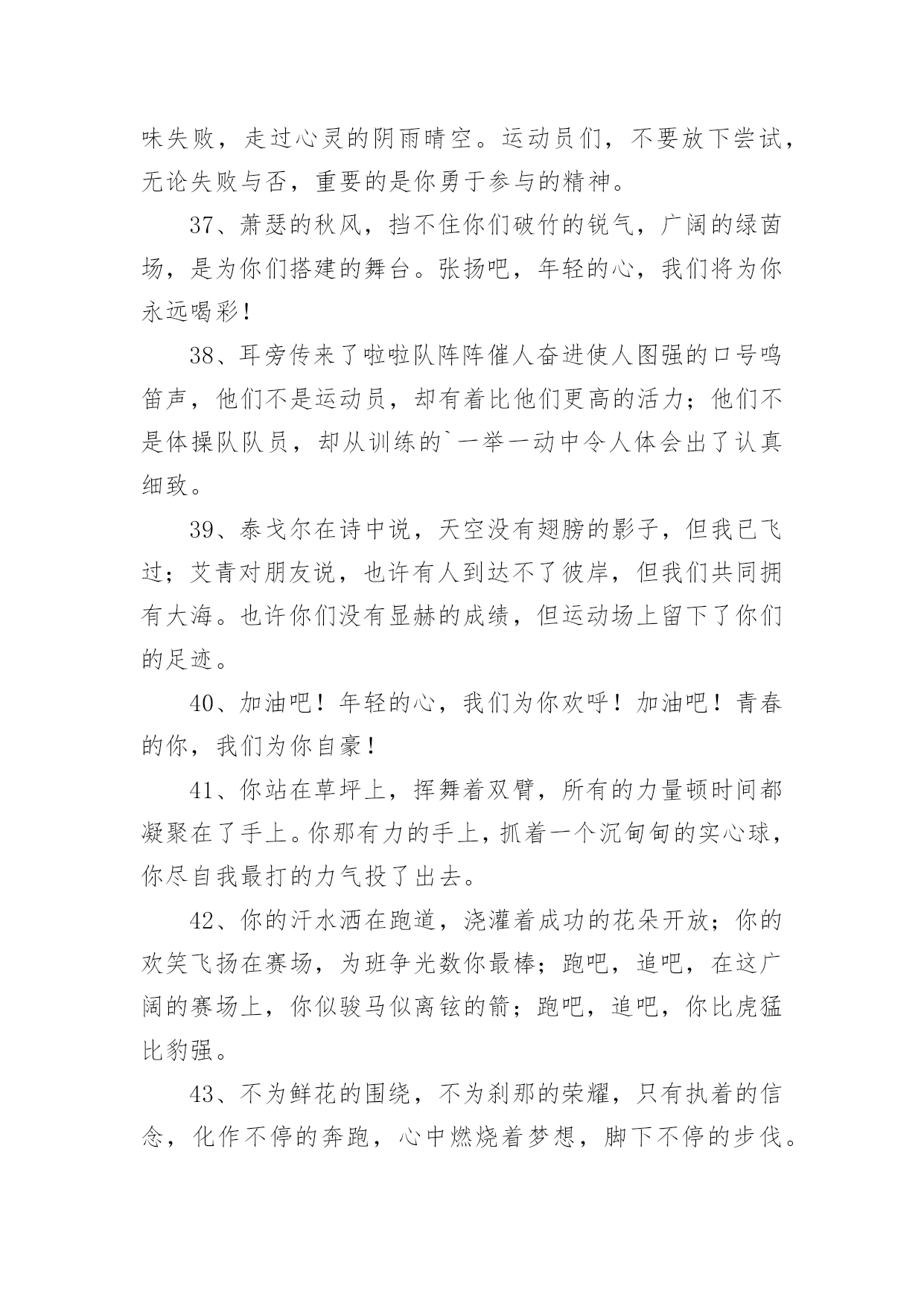 运动会加油稿运动会加油稿在社会一步步向前发展的今天,我们需要用到加油稿的情形越来越多,加油稿可以促进对方完成目标的进程。相信写加油稿是一个让许多人都头痛的问题,以下是小编精心整理的运动会加油稿,仅供参考,希望能够帮助到大家。运动会加油稿1400米是一段怎样赛程?一次又一次越过同样圆弧,同样呐喊,究竟何处才是真正尽头?一次又一次质问自己,怀疑自己,究竟是该咬紧牙关,还是忍痛放弃?凤凰涅磐,浴火重生;青铜宝剑,千锤百炼。400米,是人生缩影,或许充满迷茫与忧伤,或许充满艰难与磨难,但我相信,跨越了困苦,才能得到蜕变,坚持到底,才会迎来灿烂朝霞。这不仅是一场比赛,这是心理素质的考验,你们是天空中翱翔的雄鹰,你们是大地上奔驰的猎豹,你们是操场上的未来青春。枪响——你们没有忘记,昂首向前,胜利的'身影穿梭在洒满阳光的赛道上,你们风一样的驰骋,风一样的纵横,永不轻易放弃,一滴滴汗水,飘洒在跑道。运动会加油稿2无论结局是好是坏,无怨无悔是我们的选择,每当运动员奔驰在800米跑道上时。我们为你祝愿为你喝彩。不到最终一刻绝不轻言放弃。成了你们的信仰,也成了我们的'信仰。运动员们,飞吧!翅膀属于你!运动会加油稿31、呐喊阵阵,我们为你喝彩。欢呼阵阵,我们为你祝福。加油吧!运动健儿们到达终点的那一刻,你们的成功与我们喜悦。凝结成永恒!2、坚持,我要坚持,证明我拼搏过;我要坚持,证明我努力过;我要坚持,证明我可以;我要坚持,证明我不曾输。上天赐予的,我没有埋怨;可以弥补的,不轻言放弃。3、灰暗的天空下有你们的身影,那矫健的身姿在长空下奔驰,向着目标前进。那值得你们洒下汗水的地方,就在你们眼前闪耀,坚持住,你们是最棒的。加油,二班的运动员们!4、看完了九年级女子米比赛,她们苍白的面孔,发干的嘴唇,让人看了不免有些心痛。琼瑶曾生婷婷你们飒爽的英姿在跑道上展现,全班同学都会为你们加油的。为你们骄傲。5、或许,有意无意之间,你已陷入一场惊心动魄的争夺之中,即使天崩地裂,日月无光,你毫无怨言,永往直前。既然心中已锁定目标,就抛却一切,以智慧体魄为羽翼。6、健儿们,奋力拼搏吧!人生难得几回搏。搏它个乖风破浪,搏它个海阔天空!赛场风光变幻莫测,坚持心态再接再厉,永不言败!短暂的一瞬间,显示出你惊人的速度。7、也许流星并不少见,但它燃烧的刹那,留给人间最美丽的回忆!也许笑脸并不少见,但胜利的喜悦,总会留给世界精彩的一瞬!是的,那些曾经美妙的东西只有短短的一瞬间,但那却把最辉煌的一刻留给了人间。胜利,是每个人所追求的,胜利的喜悦,是胜利与重新开始的转折,胜利是新的开始!8、超越对手,超越自我,是我们的目标,我们的信念,在清凉的初秋,在喧嚣的田径场上,你们点燃了似火的热情,无论成败,我们都为你们感到自豪,你们永远是我们的骄傲!9、昔日,长长的跑道上,留下了你深深的足迹。抹不去你渗出的汗水,拉不动你沉重的双脚。你为了班级,不在乎自己疲惫,不在乎泪水和汗水,因为你心里有一种坚定的信念。为了班级,我能行。10、一跃,身体在空中划出一道弧线,迅速沉身,收脚。过。真是优美的跳高姿势。每一次,都是挑战,是超越。为了每一次超越喝彩。11、不长不短的距离,需要的是全身心全程投入,自始至终你们都在拼全力此时此刻,你们处在最风光的一刻,无论第几坚持胜利的信心,只要跑下来,你们就是英雄。12、今日的你们英姿飒爽,今日的你们朝气蓬勃,今日的你们一马当先。相信自己,你是最棒的!不要放弃,不要气馁。成功永远属于你们。100米运动员啊!加油啊。13、迎面接力赛的运动员们,你们是我们六x班的骄傲,使我们六x班的榜样。洒出的汗水,犹如晶莹的雨珠,加油吧!赛出友谊,赛出风格,赛出精彩!14、汗水,泪水;笑声,歌声;我们尽情挥洒。开幕式上,运动场上,我们尽情展现,多少艰辛,多少困苦,我们勇敢承担。因为年轻,因为张扬,因为我们知道:用今天的汗水换来明天的微笑。15、今日校园人心欢畅,运动场上彩旗飘扬。锣鼓喧天,运动员健儿分批传喜报。你追我赶百米线上争分夺秒。学子夺冠展雄风,搏尽全力奔目标。加油!加油!前程多美好。16、不祈求太阳的光芒,也不肯用作月亮的伴娘。脚下的路要自己闯,不怕在黑暗中迷失方向;即使生命那么短暂,也无悔无憾,夜空上那道亮线,便是向命运最有力的挑战!17、虽然你们在场上的时间很短暂,但你们的身影依然停留在人们的脑海里,因为你们是赛场上最可爱的人。18、年轻的我们自信飞扬,青春的气息如同出生的朝阳,蓬勃的力量如同阳光的挥洒。此时此刻,跑道便是我们精彩的舞台,声声加油便是我们的奖项!论何成功,谈何荣辱,心中的信念只有一个:拼搏!8萧瑟的秋风,挡不住你们破竹的锐气!19、环形的跑道一圈又一圈的坚持,毅力与精神活跃在会场上,湿透的衣衫,满头的大汗,无限追求、奋力追赶,我们为你欢呼跳跃,我们为你骄傲