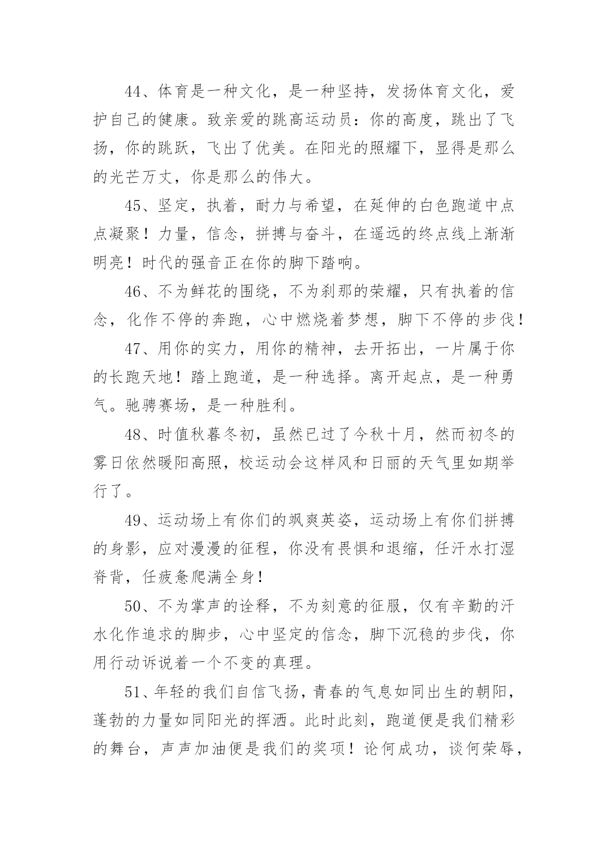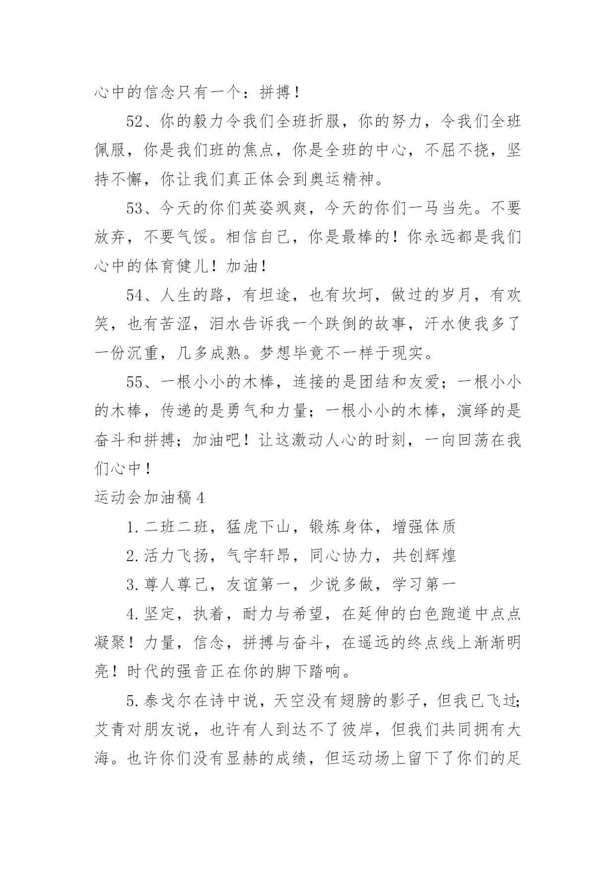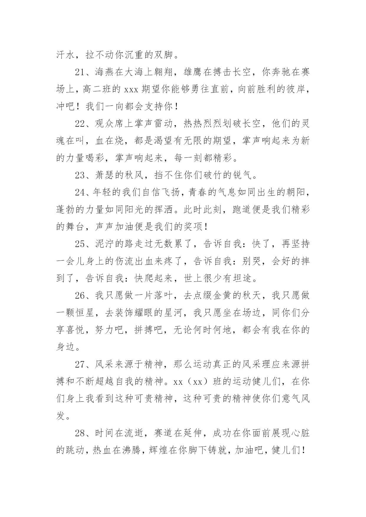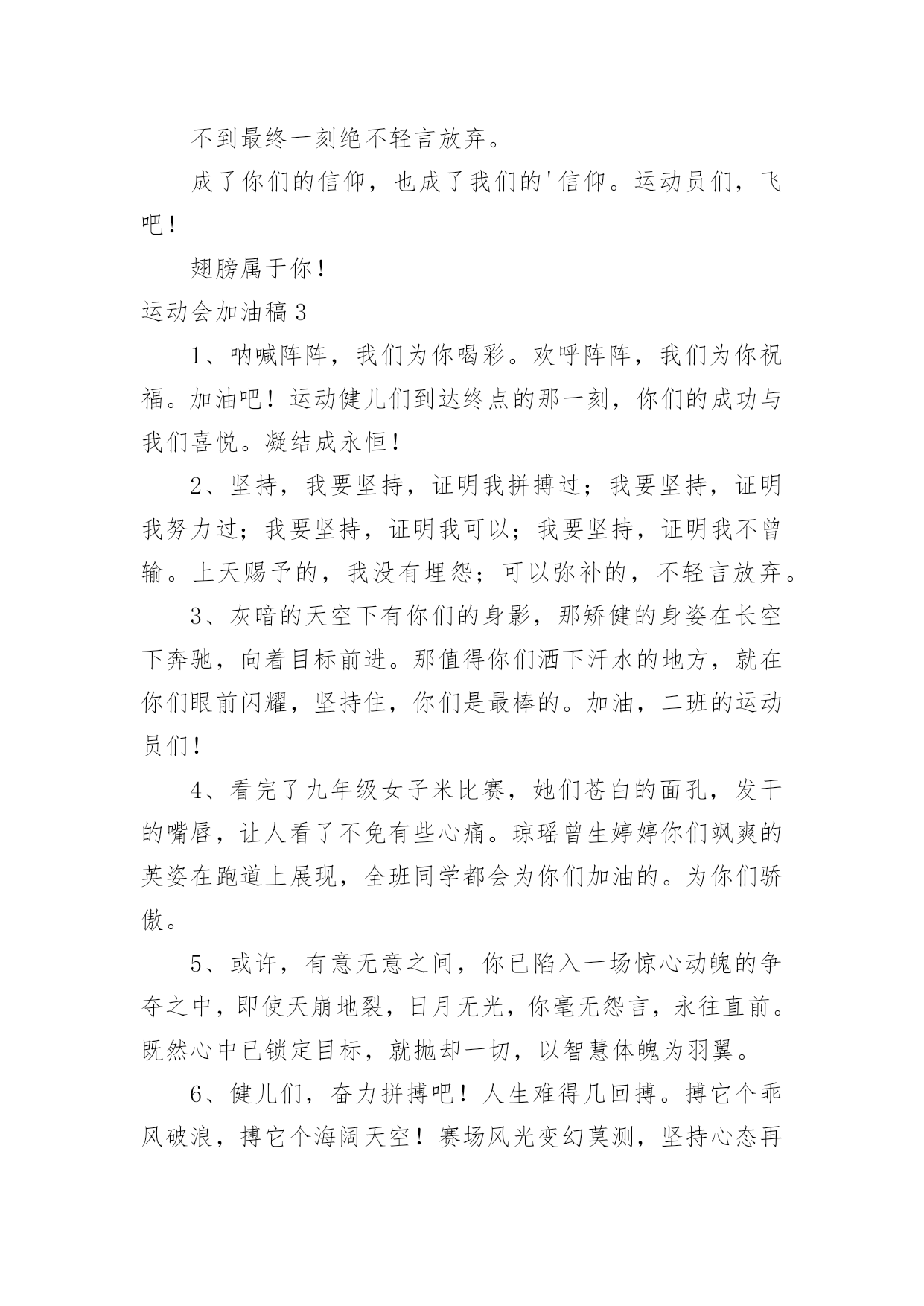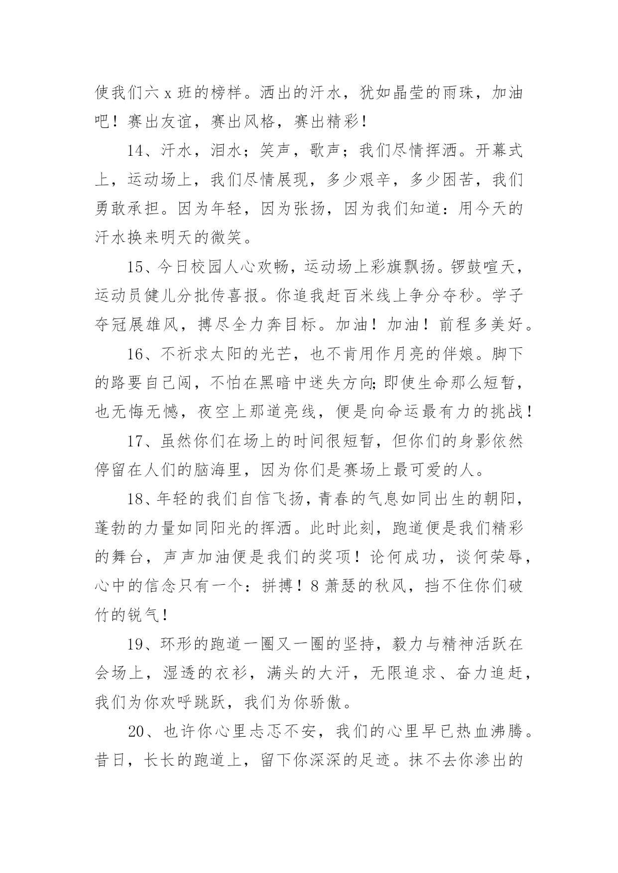 运动会加油稿运动会加油稿在社会一步步向前发展的今天,我们需要用到加油稿的情形越来越多,加油稿可以促进对方完成目标的进程。相信写加油稿是一个让许多人都头痛的问题,以下是小编精心整理的运动会加油稿,仅供参考,希望能够帮助到大家。运动会加油稿1400米是一段怎样赛程?一次又一次越过同样圆弧,同样呐喊,究竟何处才是真正尽头?一次又一次质问自己,怀疑自己,究竟是该咬紧牙关,还是忍痛放弃?凤凰涅磐,浴火重生;青铜宝剑,千锤百炼。400米,是人生缩影,或许充满迷茫与忧伤,或许充满艰难与磨难,但我相信,跨越了困苦,才能得到蜕变,坚持到底,才会迎来灿烂朝霞。这不仅是一场比赛,这是心理素质的考验,你们是天空中翱翔的雄鹰,你们是大地上奔驰的猎豹,你们是操场上的未来青春。枪响——你们没有忘记,昂首向前,胜利的'身影穿梭在洒满阳光的赛道上,你们风一样的驰骋,风一样的纵横,永不轻易放弃,一滴滴汗水,飘洒在跑道。运动会加油稿2无论结局是好是坏,无怨无悔是我们的选择,每当运动员奔驰在800米跑道上时。我们为你祝愿为你喝彩。不到最终一刻绝不轻言放弃。成了你们的信仰,也成了我们的'信仰。运动员们,飞吧!翅膀属于你!运动会加油稿31、呐喊阵阵,我们为你喝彩。欢呼阵阵,我们为你祝福。加油吧!运动健儿们到达终点的那一刻,你们的成功与我们喜悦。凝结成永恒!2、坚持,我要坚持,证明我拼搏过;我要坚持,证明我努力过;我要坚持,证明我可以;我要坚持,证明我不曾输。上天赐予的,我没有埋怨;可以弥补的,不轻言放弃。3、灰暗的天空下有你们的身影,那矫健的身姿在长空下奔驰,向着目标前进。那值得你们洒下汗水的地方,就在你们眼前闪耀,坚持住,你们是最棒的。加油,二班的运动员们!4、看完了九年级女子米比赛,她们苍白的面孔,发干的嘴唇,让人看了不免有些心痛。琼瑶曾生婷婷你们飒爽的英姿在跑道上展现,全班同学都会为你们加油的。为你们骄傲。5、或许,有意无意之间,你已陷入一场惊心动魄的争夺之中,即使天崩地裂,日月无光,你毫无怨言,永往直前。既然心中已锁定目标,就抛却一切,以智慧体魄为羽翼。6、健儿们,奋力拼搏吧!人生难得几回搏。搏它个乖风破浪,搏它个海阔天空!赛场风光变幻莫测,坚持心态再接再厉,永不言败!短暂的一瞬间,显示出你惊人的速度。7、也许流星并不少见,但它燃烧的刹那,留给人间最美丽的回忆!也许笑脸并不少见,但胜利的喜悦,总会留给世界精彩的一瞬!是的,那些曾经美妙的东西只有短短的一瞬间,但那却把最辉煌的一刻留给了人间。胜利,是每个人所追求的,胜利的喜悦,是胜利与重新开始的转折,胜利是新的开始!8、超越对手,超越自我,是我们的目标,我们的信念,在清凉的初秋,在喧嚣的田径场上,你们点燃了似火的热情,无论成败,我们都为你们感到自豪,你们永远是我们的骄傲!9、昔日,长长的跑道上,留下了你深深的足迹。抹不去你渗出的汗水,拉不动你沉重的双脚。你为了班级,不在乎自己疲惫,不在乎泪水和汗水,因为你心里有一种坚定的信念。为了班级,我能行。10、一跃,身体在空中划出一道弧线,迅速沉身,收脚。过。真是优美的跳高姿势。每一次,都是挑战,是超越。为了每一次超越喝彩。11、不长不短的距离,需要的是全身心全程投入,自始至终你们都在拼全力此时此刻,你们处在最风光的一刻,无论第几坚持胜利的信心,只要跑下来,你们就是英雄。12、今日的你们英姿飒爽,今日的你们朝气蓬勃,今日的你们一马当先。相信自己,你是最棒的!不要放弃,不要气馁。成功永远属于你们。100米运动员啊!加油啊。13、迎面接力赛的运动员们,你们是我们六x班的骄傲,使我们六x班的榜样。洒出的汗水,犹如晶莹的雨珠,加油吧!赛出友谊,赛出风格,赛出精彩!14、汗水,泪水;笑声,歌声;我们尽情挥洒。开幕式上,运动场上,我们尽情展现,多少艰辛,多少困苦,我们勇敢承担。因为年轻,因为张扬,因为我们知道:用今天的汗水换来明天的微笑。15、今日校园人心欢畅,运动场上彩旗飘扬。锣鼓喧天,运动员健儿分批传喜报。你追我赶百米线上争分夺秒。学子夺冠展雄风,搏尽全力奔目标。加油!加油!前程多美好。16、不祈求太阳的光芒,也不肯用作月亮的伴娘。脚下的路要自己闯,不怕在黑暗中迷失方向;即使生命那么短暂,也无悔无憾,夜空上那道亮线,便是向命运最有力的挑战!17、虽然你们在场上的时间很短暂,但你们的身影依然停留在人们的脑海里,因为你们是赛场上最可爱的人。18、年轻的我们自信飞扬,青春的气息如同出生的朝阳,蓬勃的力量如同阳光的挥洒。此时此刻,跑道便是我们精彩的舞台,声声加油便是我们的奖项!论何成功,谈何荣辱,心中的信念只有一个:拼搏!8萧瑟的秋风,挡不住你们破竹的锐气!19、环形的跑道一圈又一圈的坚持,毅力与精神活跃在会场上,湿透的衣衫,满头的大汗,无限追求、奋力追赶,我们为你欢呼跳跃,我们为你骄傲