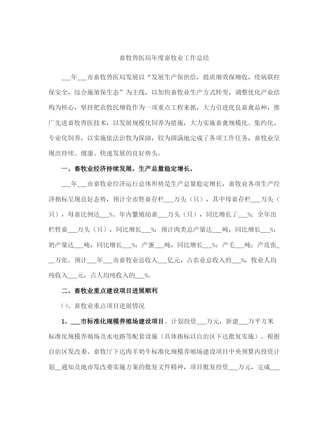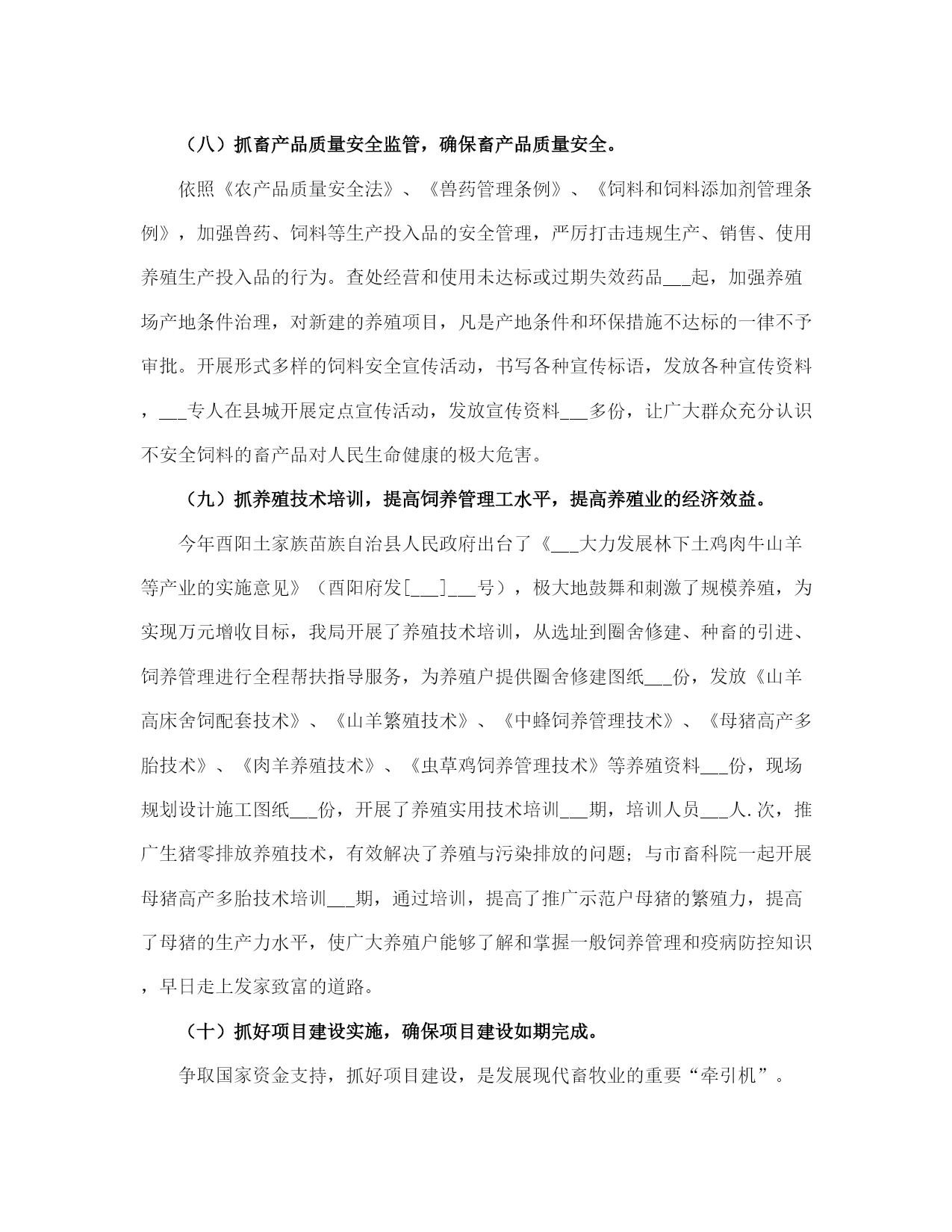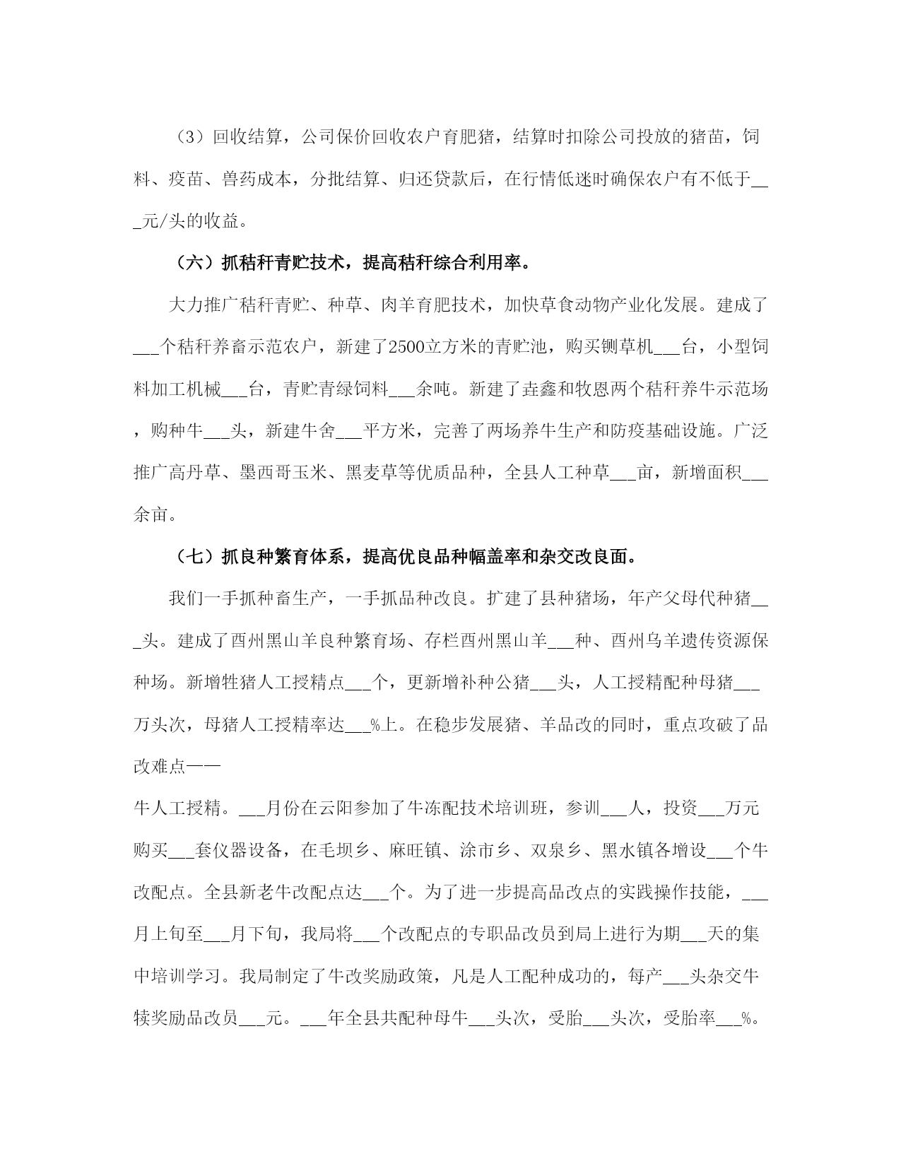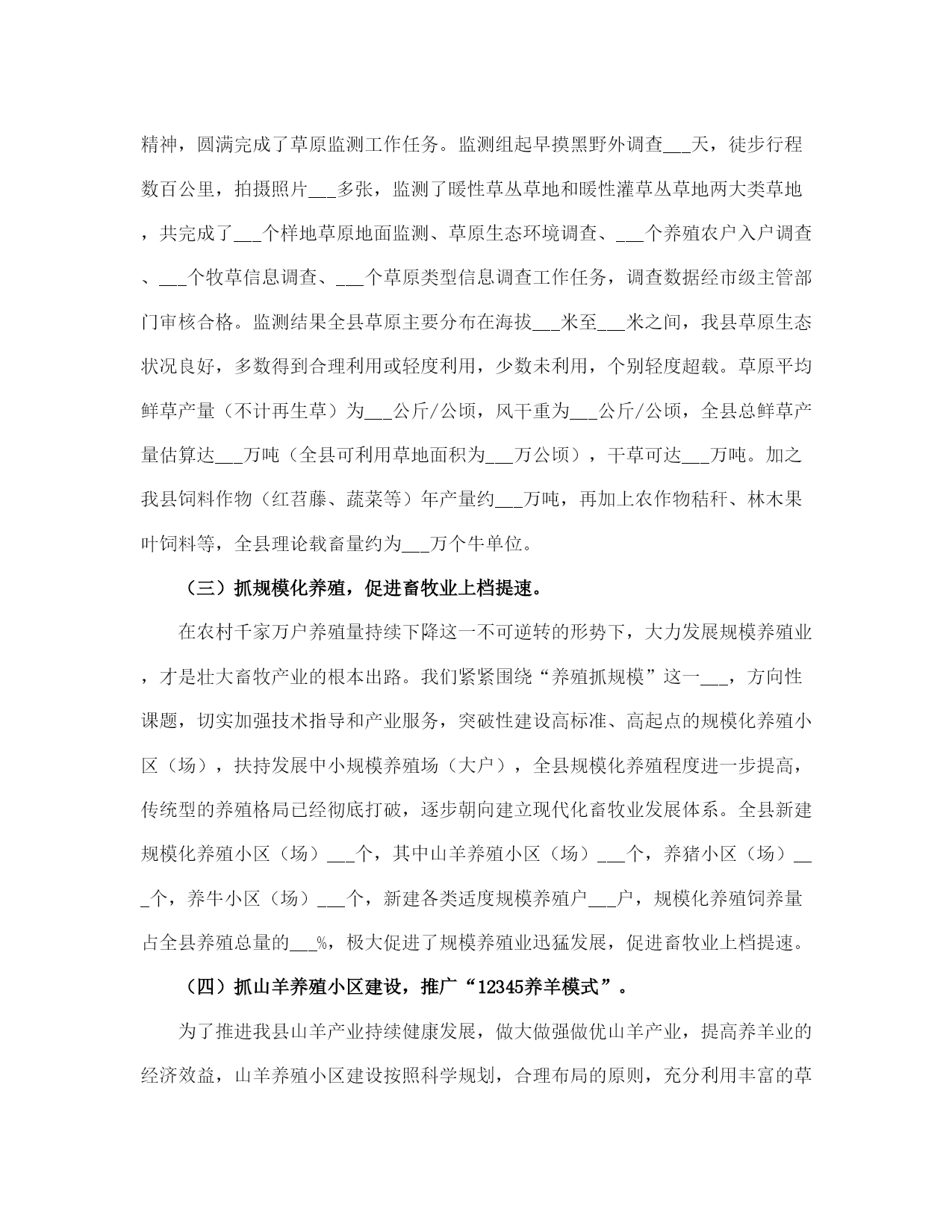 畜牧技术推广站年度工作总结(完整版)文档资料可直接使用,可编辑,欢迎下载畜牧技术推广站___年度工作总结___年为了全面落实市委、市__关于“两翼”区县农户万元增收计划,促进农民收入较快增长,确保全县农户三年内实现万元增收目标,以两翼农户万元增收工程为契机,以发展规模养殖业为重点,抢抓草食牲畜产品价格高、政策支持力度大的良好机遇,坚持生产发展与疫病防治并重的工作方针,积极构建现代畜牧业发展体系,全县畜牧业取得了前所未有的好成绩,进入了生产不断发展、质量不断提高、实力不断增强的新阶段。总体上讲___年我县畜牧工作机遇很好,政策较硬,亮点很多,成效很大。一、畜牧业生产各项指标全面超额完成任务今年,草食牲畜产品市场价格之高前所未有,各级政府对畜牧业的投入之大前所未有。在市场拉动和政策驱动的双重作用下,我县农民养殖积极性之高也是前所未有,养殖致富热直线“升温”,全县畜牧业发展又好又快,呈现出“三增一减”的可喜成效。(一)畜禽饲养总量增长全县全年山羊饲养量实现___万只,其中存栏___万只,出栏___万只,比上年增长___%;牛饲养量达___万头,其中存栏___万头,出栏___万头,比上年增长___%;生猪饲养量达___万头,其中存栏___万头(能繁母猪___万头,比去年减少___万头),出栏___万头,比上年增长___%;小家禽饲养量达___万只,出栏___万只(其中鸡___万只,鸭及其它___万只),分别增长___%和___%;饲养量、出栏量及增幅均可位居全市前列,畜禽生产主要指标年增长幅度均超过___%。(二)畜产品产量增长全年肉类总产量___万吨,比上年增长___%,其中猪肉产量___万吨,比上年增长___%。禽蛋产量___万吨,比上年增长___%,羊肉产量___万吨,比上年增长___%,牛肉产量___万吨,比上年增长___%。(三)畜牧业收入增长全县畜牧业总产值___亿元,比上年增长___%,农民人均牧业现金收入突破千元大关,达___元以上。(四)畜禽发病死亡率下降全县全年畜禽发病死亡率为。猪___%,牛___%,羊___%,家禽___%,控制在国家审定标准以下。全县因为禽发病死亡率下降养殖业减少损失___万元以上,农民人平减少损失___元。二、业务工作及主要做法(一)抓遗传资源库建立,加大遗传资源的保护与开发力度。___年我县与畜科院合作,对酉州乌羊和麻旺鸭进行保护与开发利用,建立了酉州乌羊和麻旺鸭遗传资源库,进行了活体与___、胚胎保种,建立了酉州乌羊和麻旺鸭遗遗传资源保种场,建立了保种户,划定了保种区,开展了酉州乌羊胚胎移植工作,胚胎移___只,目前已产羔___只,利用扶贫资金对酉州乌羊保种区内的贫困户进行保种式开发利用,同时加大了对酉州乌羊保护力度,县政府出台了[___]9__文件,文件规定:对保种区内的纯繁户年存栏酉州乌羊___只以上,每只保种补贴___元。(二)抓草原监测工作,为发展草食畜牧业提供理论依据。___年___月___日市草原监测工作会在我县召开以来,根据市畜牧技术推广总站的安排部署,我站草原监测工作组精心___,优化方案,发扬五加二、白加黑的精神,圆满完成了草原监测工作任务。监测组起早摸黑野外调查___天,徒步行程数百公里,拍摄照片___多张,监测了暖性草丛草地和暖性灌草丛草地两大类草地,共完成了___个样地草原地面监测、草原生态环境调查、___个养殖农户入户调查、___个牧草信息调查、___个草原类型信息调查工作任务,调查数据经市级主管部门审核合格。监测结果全县草原主要分布在海拔___米至___米之间,我县草原生态状况良好,多数得到合理利用或轻度利用,少数未利用,个别轻度超载。草原平均鲜草产量(不计再生草)为___公斤/公顷,风干重为___公斤/公顷,全县总鲜草产量估算达___万吨(全县可利用草地面积为___万公顷),干草可达___万吨。加之我县饲料作物(红苕藤、蔬菜等)年产量约___万吨,再加上农作物秸秆、林木果叶饲料等,全县理论载畜量约为___万个牛单位。(三)抓规模化养殖,促进畜牧业上档提速。在农村千家万户养殖量持续下降这一不可逆转的形势下,大力发展规模养殖业,才是壮大畜牧产业的根本出路。我们紧紧围绕“养殖抓规模”这一___,方向性课题,切实加强技术指导和产业服务,突破性建设高标准、高起点的规模化养殖小区(场),扶持发展中小规模养殖场(大户),全县规模化养殖程度进一步提高,传统型的养殖格局已经彻底打破,逐步朝向建立现代化畜牧业发展体系。全县新建规模化养殖小区(场)___个,其中山羊养殖小区(场)___个,养猪小区(场)___个,养牛小区(场)___个,新建各类适度规模养殖户___户,规模化养殖饲养量占全县养殖总量的___%,极大促进了规模养殖业迅猛发展,促