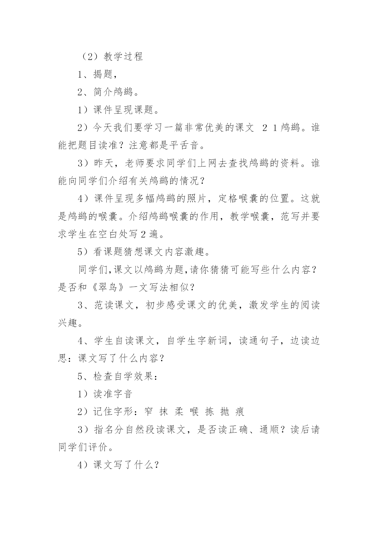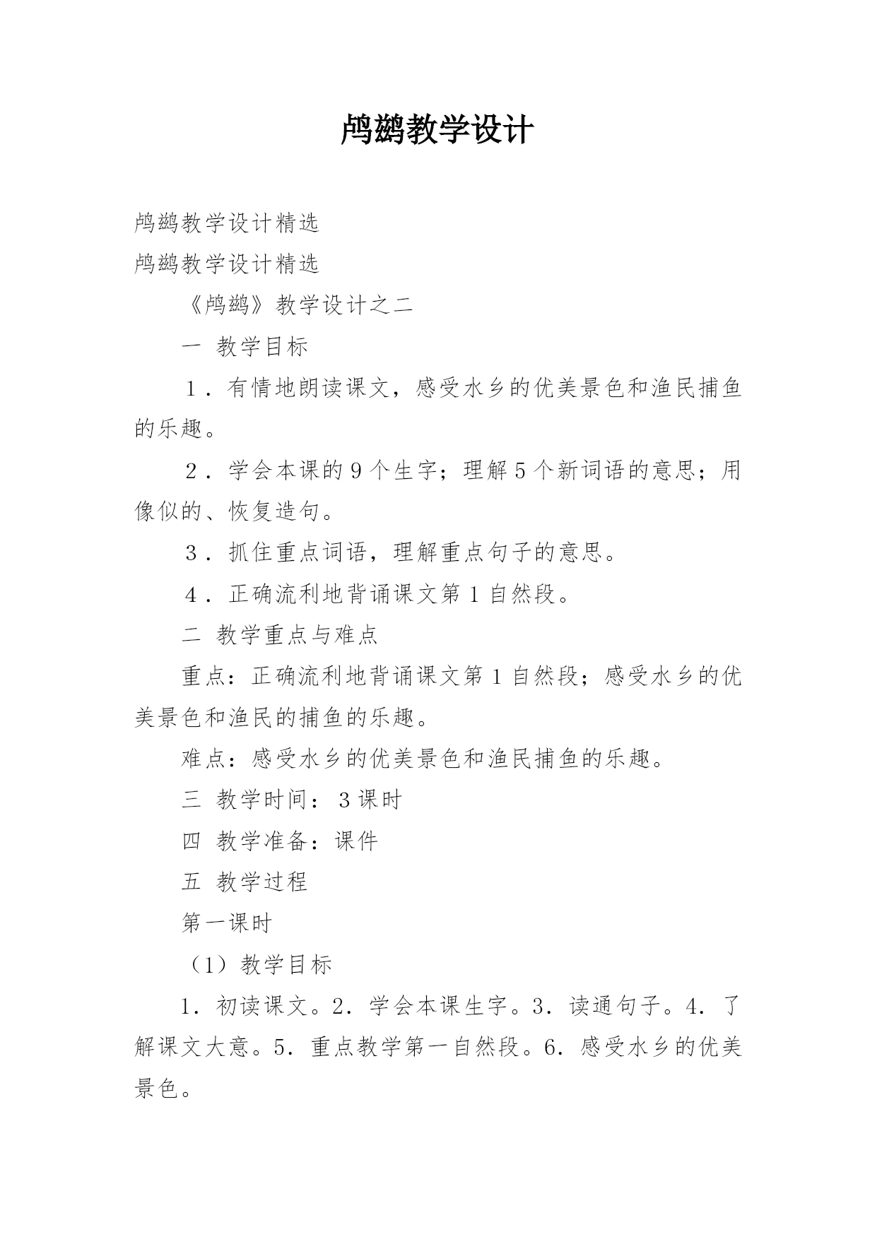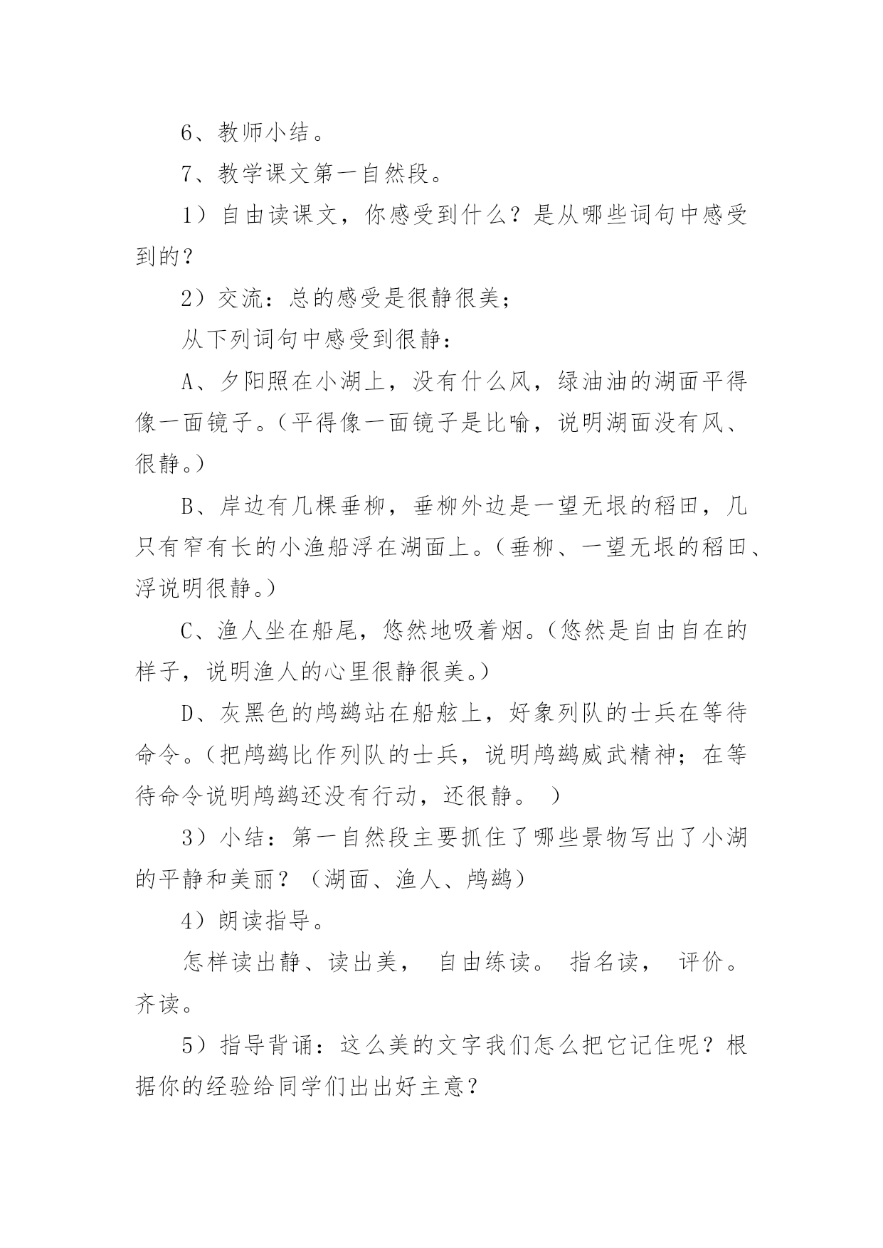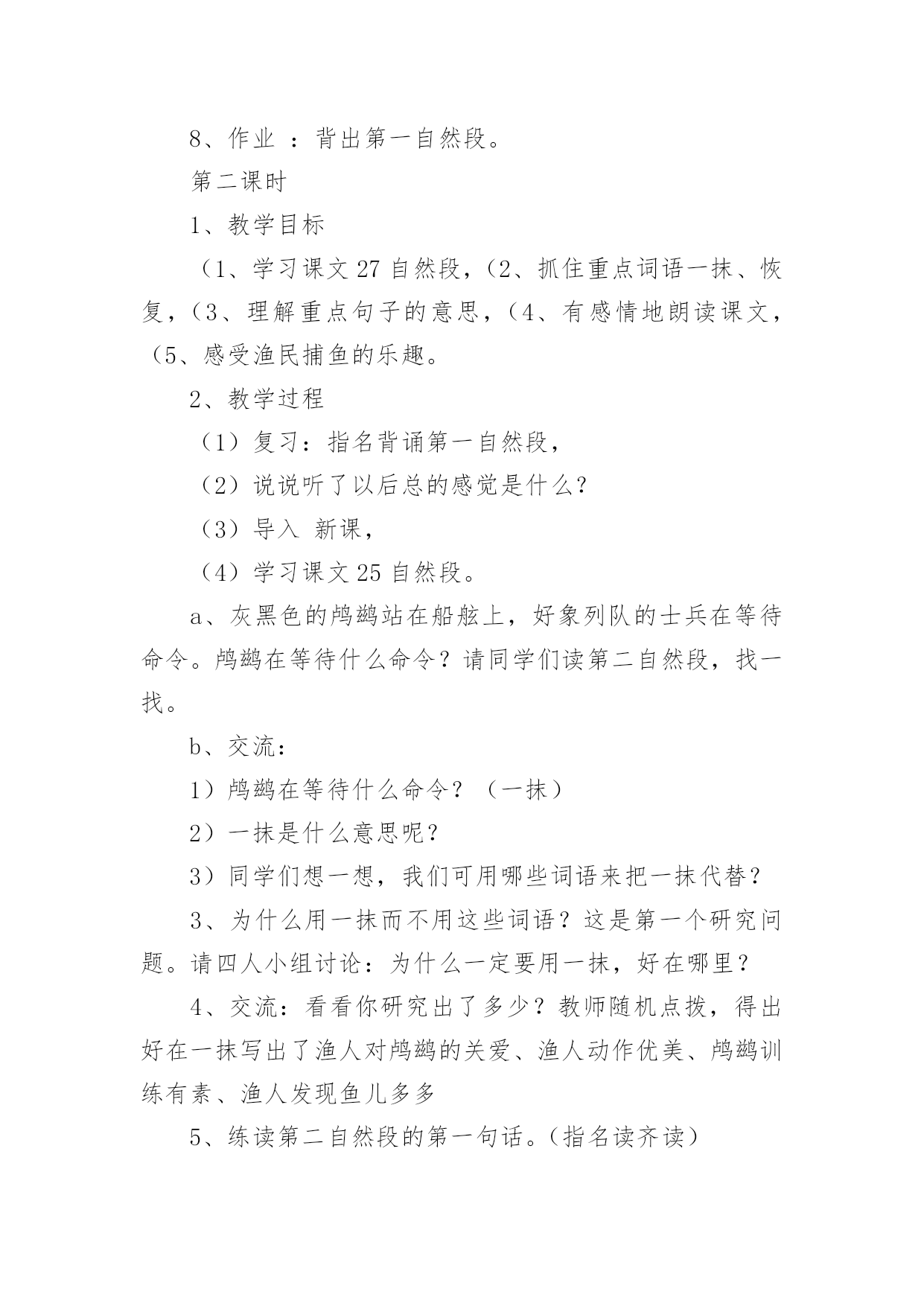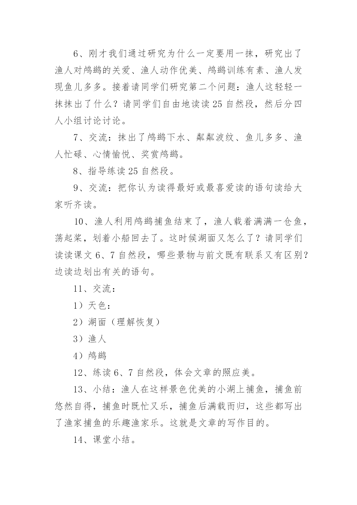 鸬鹚教学设计鸬鹚教学设计精选鸬鹚教学设计精选《鸬鹚》教学设计之二一教学目标1.有情地朗读课文,感受水乡的优美景色和渔民捕鱼的乐趣。2.学会本课的9个生字;理解5个新词语的意思;用像似的、恢复造句。3.抓住重点词语,理解重点句子的意思。4.正确流利地背诵课文第1自然段。二教学重点与难点重点:正确流利地背诵课文第1自然段;感受水乡的优美景色和渔民的捕鱼的乐趣。难点:感受水乡的优美景色和渔民捕鱼的乐趣。三教学时间:3课时四教学准备:课件五教学过程第一课时(1)教学目标1.初读课文。2.学会本课生字。3.读通句子。4.了解课文大意。5.重点教学第一自然段。6.感受水乡的优美景色。(2)教学过程1、揭题,2、简介鸬鹚。1)课件呈现课题。2)今天我们要学习一篇非常优美的课文21鸬鹚。谁能把题目读准?注意都是平舌音。3)昨天,老师要求同学们上网去查找鸬鹚的资料。谁能向同学们介绍有关鸬鹚的情况?4)课件呈现多幅鸬鹚的照片,定格喉囊的位置。这就是鸬鹚的喉囊。介绍鸬鹚喉囊的作用,教学喉囊,范写并要求学生在空白处写2遍。5)看课题猜想课文内容激趣。同学们,课文以鸬鹚为题,请你猜猜可能写些什么内容?是否和《翠鸟》一文写法相似?3、范读课文,初步感受课文的优美,激发学生的阅读兴趣。4、学生自读课文,自学生字新词,读通句子,边读边思:课文写了什么内容?5、检查自学效果:1)读准字音2)记住字形:窄抹柔喉拣抛痕3)指名分自然段读课文,是否读正确、通顺?读后请同学们评价。4)课文写了什么?6、教师小结。7、教学课文第一自然段。1)自由读课文,你感受到什么?是从哪些词句中感受到的?2)交流:总的感受是很静很美;从下列词句中感受到很静:A、夕阳照在小湖上,没有什么风,绿油油的湖面平得像一面镜子。(平得像一面镜子是比喻,说明湖面没有风、很静。)B、岸边有几棵垂柳,垂柳外边是一望无垠的稻田,几只有窄有长的小渔船浮在湖面上。(垂柳、一望无垠的稻田、浮说明很静。)C、渔人坐在船尾,悠然地吸着烟。(悠然是自由自在的样子,说明渔人的心里很静很美。)D、灰黑色的鸬鹚站在船舷上,好象列队的士兵在等待命令。(把鸬鹚比作列队的士兵,说明鸬鹚威武精神;在等待命令说明鸬鹚还没有行动,还很静。)3)小结:第一自然段主要抓住了哪些景物写出了小湖的平静和美丽?(湖面、渔人、鸬鹚)4)朗读指导。怎样读出静、读出美,自由练读。指名读,评价。齐读。5)指导背诵:这么美的文字我们怎么把它记住呢?根据你的经验给同学们出出好主意?8、作业:背出第一自然段。第二课时1、教学目标(1、学习课文27自然段,(2、抓住重点词语一抹、恢复,(3、理解重点句子的意思,(4、有感情地朗读课文,(5、感受渔民捕鱼的乐趣。2、教学过程(1)复习:指名背诵第一自然段,(2)说说听了以后总的感觉是什么?(3)导入新课,(4)学习课文25自然段。a、灰黑色的鸬鹚站在船舷上,好象列队的士兵在等待命令。鸬鹚在等待什么命令?请同学们读第二自然段,找一找。b、交流:1)鸬鹚在等待什么命令?(一抹)2)一抹是什么意思呢?3)同学们想一想,我们可用哪些词语来把一抹代替?3、为什么用一抹而不用这些词语?这是第一个研究问题。请四人小组讨论:为什么一定要用一抹,好在哪里?4、交流:看看你研究出了多少?教师随机点拨,得出好在一抹写出了渔人对鸬鹚的关爱、渔人动作优美、鸬鹚训练有素、渔人发现鱼儿多多5、练读第二自然段的第一句话。(指名读齐读)6、刚才我们通过研究为什么一定要用一抹,研究出了渔人对鸬鹚的关爱、渔人动作优美、鸬鹚训练有素、渔人发现鱼儿多多。接着请同学们研究第二个问题:渔人这轻轻一抹抹出了什么?请同学们自由地读读25自然段,然后分四人小组讨论讨论。7、交流:抹出了鸬鹚下水、粼粼波纹、鱼儿多多、渔人忙碌、心情愉悦、奖赏鸬鹚。8、指导练读25自然段。9、交流:把你认为读得最好或最喜爱读的语句读给大家听齐读。10、渔人利用鸬鹚捕鱼结束了,渔人载着满满一仓鱼,荡起桨,划着小船回去了。这时候湖面又怎么了?请同学们读读课文6、7自然段,哪些景物与前文既有联系又有区别?边读边划出有关的语句。11、交流:1)天色:2)湖面(理解恢复)3)渔人4)鸬鹚12、练读6、7自然段,体会文章的照应美。13、小结:渔人在这样景色优美的小湖上捕鱼,捕鱼前悠然自得,捕鱼时既忙又乐,捕鱼后满载而归,这些都写出了渔家捕鱼的乐趣渔家乐。这就是文章的写作目的。14、课堂小结。第三课时教学目标1、背诵第一自然段。2、熟读全文。3、完成书面作业。教学过程1、齐读全文。2、总结全文。3、背诵第一自然段。4、默写第一自然段。5、指导用恢复造句。6、完成其他作业。