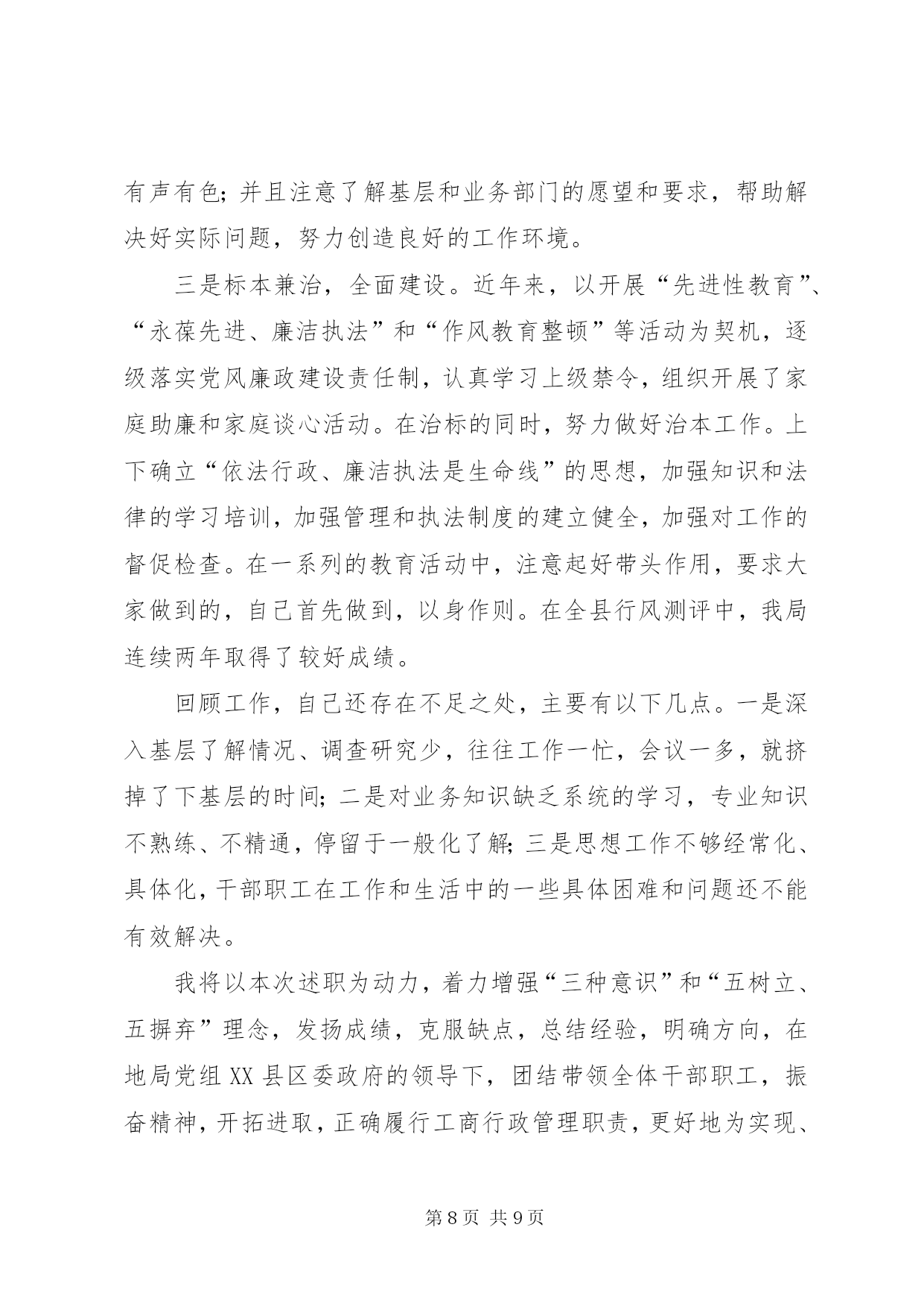 第PAGE\*Arabic\*MERGEFORMAT9页共NUMPAGES\*MERGEFORMAT9页工商局书记兼局长述职报告文章标题:20xx年工商局书记兼局长述职报告尊敬的各位领导、同志们:20xx年以来,我相继担任***县工商局党组成员、副局长、党组书记、局长,我在地局党组XX县区委政府的正确领导下,团结带领局领导班子和全体干部职工,认真实践“三个代表”重要思想、全面贯彻落实科学发展观,围绕“扎实工作、勇于创新、科学管理、全面进步”的发展思路,狠抓队伍规范化建设,积极开展市场监管和行政执法,主动服务县域经济健康发展,认真履行了工作职责。现根据地局党组的安排,我就任职以来的主要工作、生活、学习情况,向上级和全体干部作如下述职报告,请予批评指正。一、加强学习,不断提高组织领导和科学决策能力。几年来,我作为局班子成员和第一负责人,充分意识到自己的历史责任。要适应新环境,迎接新考验,完成新任务,必须认真学习,不断提高领导水平和工作能力。人非生而知之,不知就要学习,学而后知足。修养由学而成,道德由学而进,才能由学而得。只要勤奋学习,才能跟上时代发展的步伐,承担历史赋予我们的重任,更好地为实现、维护、发展党和人发的利益而不懈努力,不辜负上级组织和全局同志们的期望。一是加强学习,提高素质。作为领导干部,学习既是一种修养,更是一种责任。在学习中,首先是学好“三个代表”的重要思想、“两个务必”和八个方面的良好风气,以及党的十六大、十六届四中五中六中全会的主要精神,牢固树立科学发展观,通过集体学习和业余自学,正确地理解党的指导思想和方针政策,紧紧抓住立党为公、执政为民这个本质,学会运用马克思主义的立场、观点、方法指导工作,提高辩证思维的能力,全面认识和把握领导工作中的矛盾和问题,科学地制定工作计划和措施,防止产生教条主义、本本主义和经验主义。在搞好政治学习的同时,本着“学以致用、搞好工作”的目的,坚持学习业务知识和相关经济理论知识,加强了经济、法律、管理、文化、技能等方面知识的学习,进一步开阔自己的知识面,适应现代市场经济管理工作的需要。二是解放思想,科学决策。学习的目的在于应用。我努力把学习和思考结合起来,做到学思并重,力求真学、深思、活用,达到学以致用、用有所成的目的。在学习实践中,坚持党的解放思想、实事求是、与时俱进的思想路线,不仅从书本上学,更注重从实践中学,想问题,做工作,作决策不拘泥于老办法,老经验,注重理论联系实际,结合新形势、新任务、新特点,集中大家的智慧和力量,因地制宜、创造性地落实上级指示,完成工作任务,从而把握住了工作的方向和龙头,赋予了工作新的内涵,工作落实到了实处,收到了事半功倍的效果。按照“扎实工作、勇于创新、科学管理、全面进步”的工作思路,结合“学文件、明重点、重管理、促发展、强素质、创特色”的六方面具体工作,通过全局上下的艰苦努力,多次获得县委政府和地区工商局的表彰,并于05、06年获全区工商行政管理全面工作第一名,本人获地委行署20xx—20xx年社会治安工作先进个人,各项工作上了一个新的台阶。三是民主集中,团结协调。增强领导班子的凝聚力和战斗力,是做好一级组织工作的重要前提和保证。作为第一责任人,我摆正个人和集体的位置,增强民主意识,当“班长”不当“家长”,有“主见”但不“主观”,带头贯彻民主集中制的组织原则,把民主决策贯穿于党组决策的全过程,坚持做到民主集中、集体领导,不搞个人说了算“一言堂”,努力在加强班子团结,发挥班子成员作用上,做好工作。在重大问题的决策上,做到集体领导,民主集中,个别酝酿,会议决定,严格按照议事规则和程序办事,我与其他领导成员之间做到互相信任,互相支持,互相补充,互相谅解。遇到意见分歧,大家能够坦诚相见,及时沟通。明确分工后,充分尊重和依靠分管领导,让大家能各司其职,有职有权地处理好工作。近几年来,领导班子工作融洽,相互团结、互相信任,各自发挥了积极作用,我的工作也得到了大家的积极支持和配合。二、努力工作,正确履行监管执法和服务地方经济发展职责工商行政管理部门是国家履行经济管理职能的重要部门之一,承担着市场监管和行政执法的重要职责。作为基层工商局,必须正确履行职责,保证所辖区域公共经济秩序的健康发展,把好市场主体的准入关,当好市场运行的裁判员,做好市场经济的坚强卫士。我努力做到以下几点:一是明晰工作思路和要求。当前基层工作中事实上出现了许多新情况、新问题,需要我们各级干部作出回应:1、在注册登记方面,既要改革探索、服务经济,又要坚持原则,严格把关;2、在监督管理方面,既要管主体经营、商广合同,又要管客体质量,安全稳定;3、在行政执法方面,既要打击有力、处罚到位,又要阳光操作、宽严适度;4、在队伍建设方面,既要令行禁止、作风优良;又要专业过硬、素质全面;