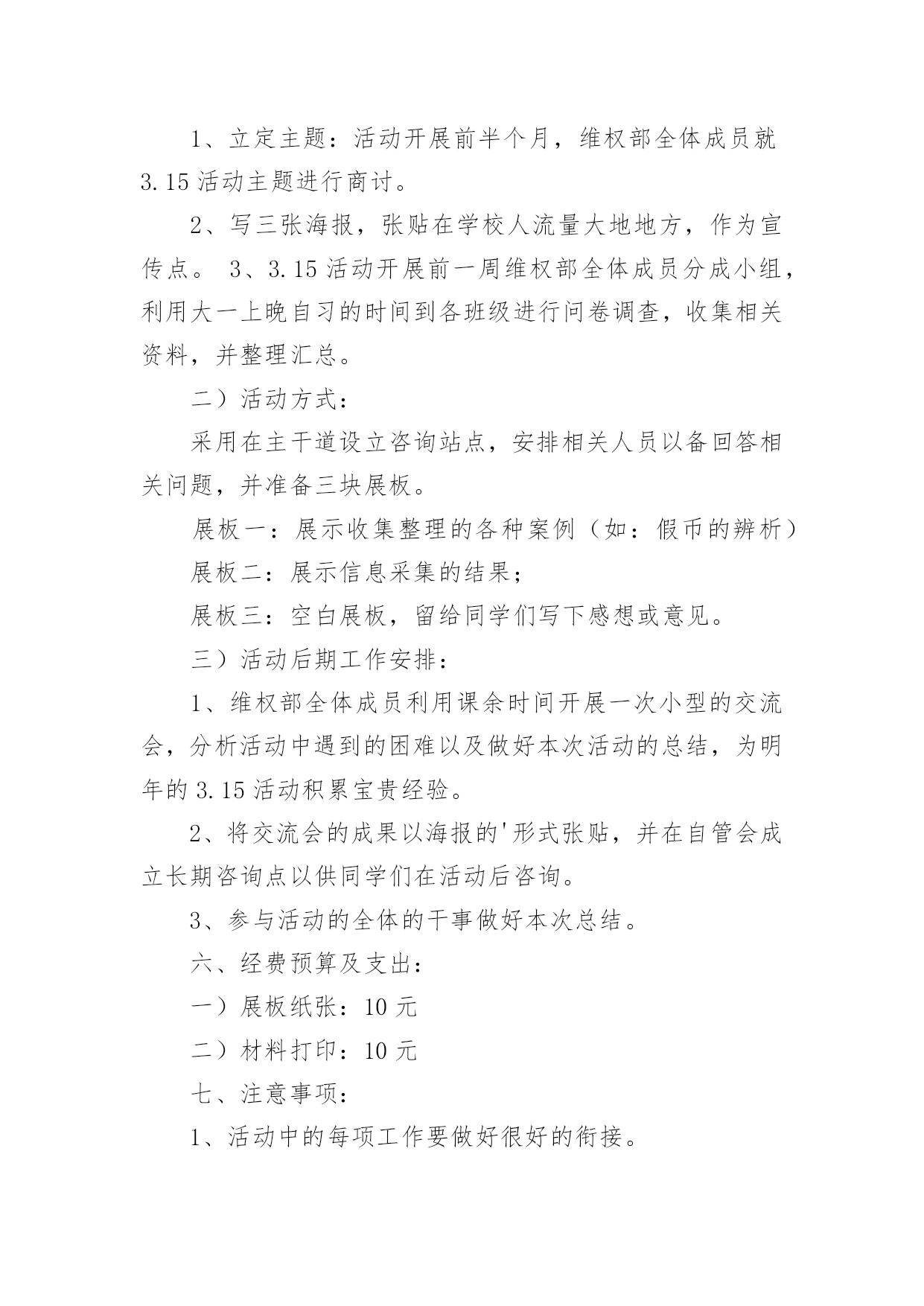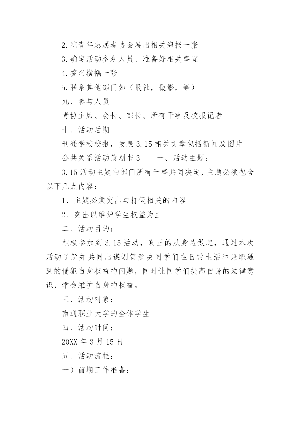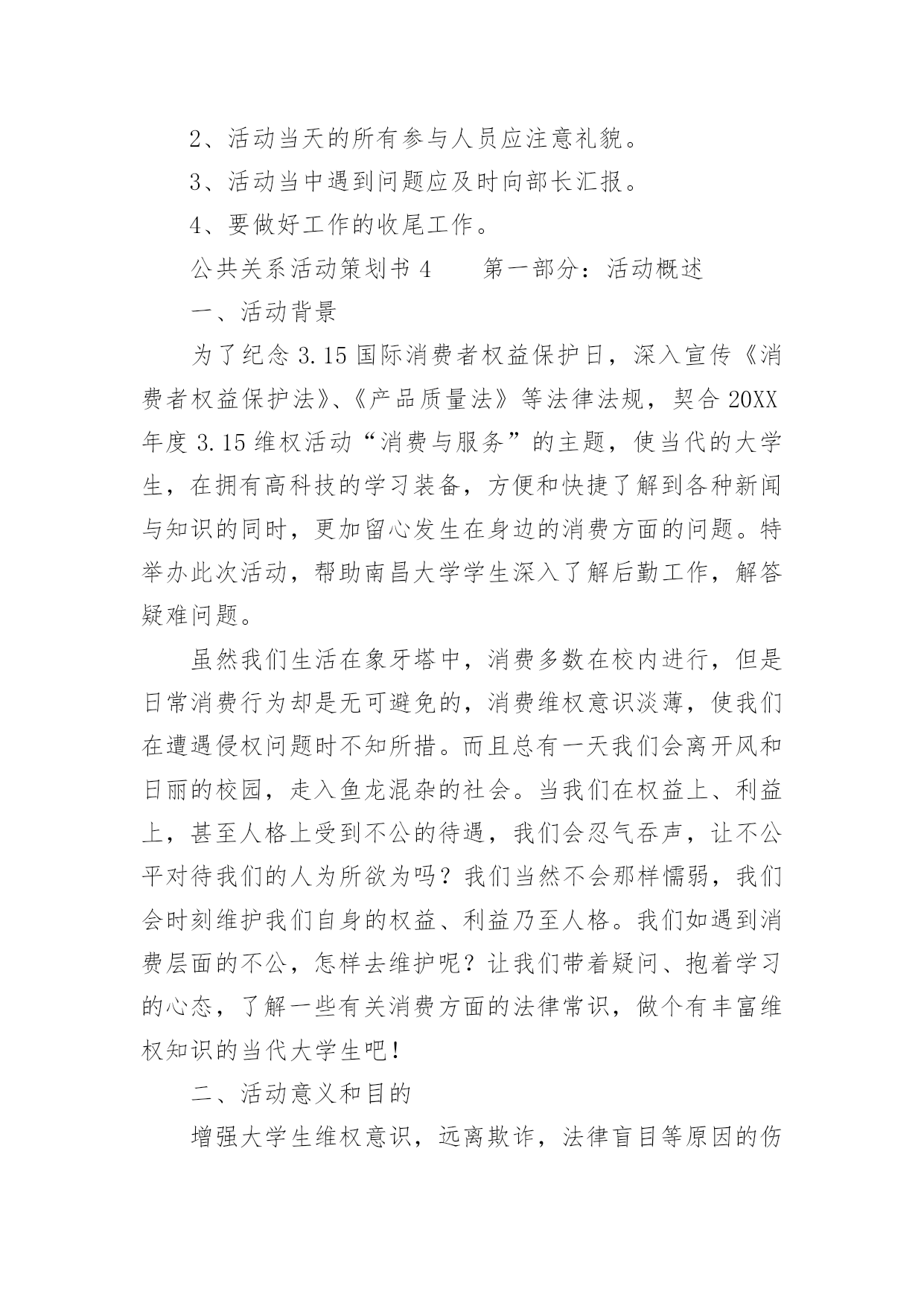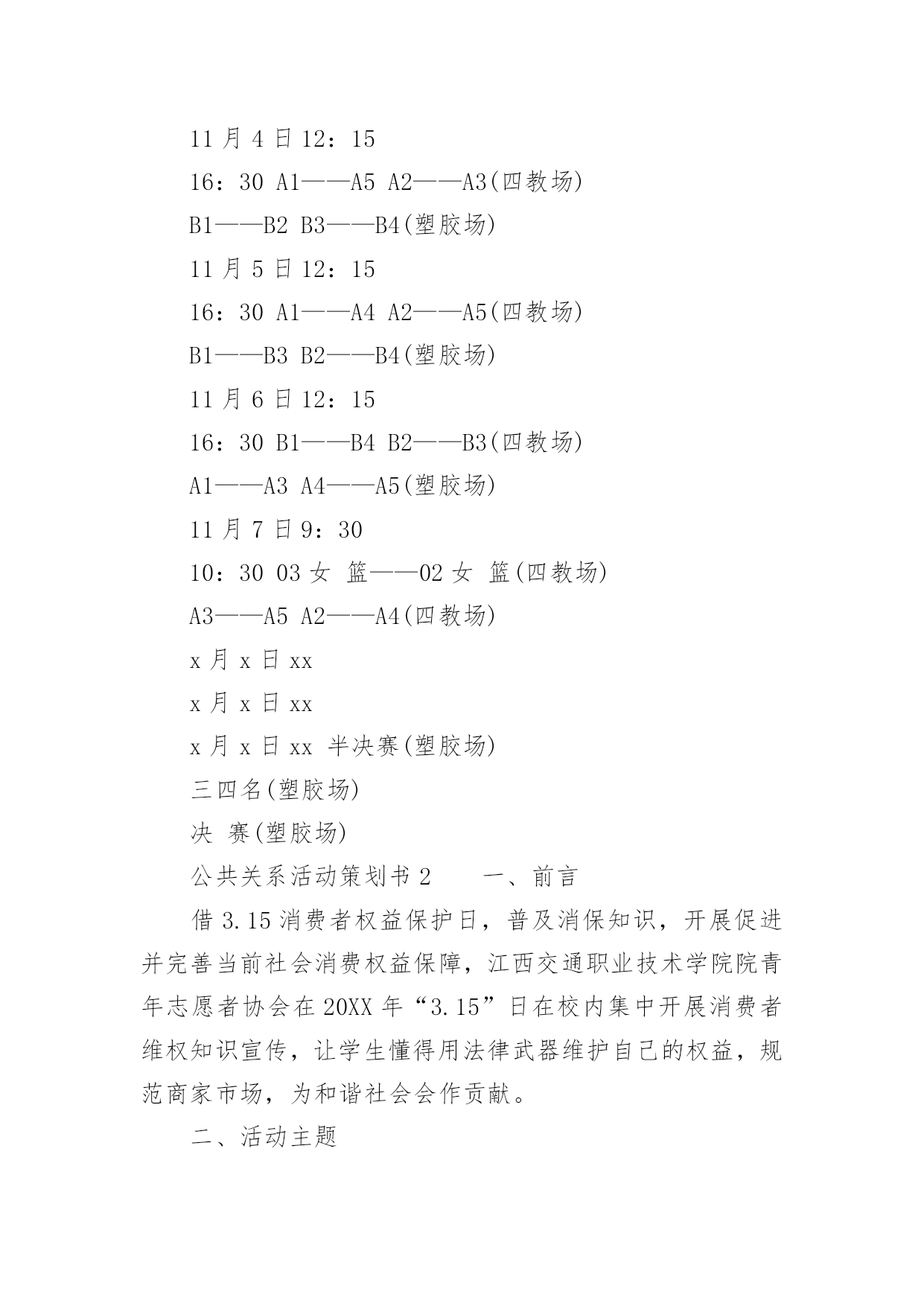 公共关系活动策划书公共关系活动策划书(精选9篇)时光在不经意中流逝,一段时间的工作已经结束了,我们又将续写新的诗篇,迎接我们的是新的工作内容和工作目标,需要认真地为此写一份策划书。快来参考策划书是怎么写的吧,下面是小编整理的公共关系活动策划书(精选9篇),欢迎阅读,希望大家能够喜欢。公共关系活动策划书1一、活动宗旨:丰富同学们的课外娱乐生活,提高我们的综合素质,培养积极向上的进取精神,致力于打造成一个真正属于法学院所有热爱篮球,钟情篮球的'球迷的节日,致力于打造一个互相交流,互相学习的平台。同时为校篮球赛选拔人才,作好充分的准备。二、主办部门:法学院体育部三、比赛地点及地点:四教篮球场,塑胶篮球场;x月x日——x月x日四、比赛规则:以各班为单位,每班报x支球队报名费每班x元。每队限报队员x人,领队x人。比赛上下半场,各x分钟,中场休息x分钟。每半场各队只可叫x次暂停,x次暂停的总用时为x分钟。队员犯规满x次罚下。每队队员人员固定,不得请外援来参赛。参赛队或队员迟到x分钟以上者,以弃权论.五、竞赛办法:先进行小组循环赛,小组前两名出线,再进行复赛阶段的淘汰赛。(具体比赛赛程见后附表)六、奖励办法:第一名:奖金xx元第二名:奖金xx元第三名:奖金xx元七、活动经费情况:总收入:各班报名费xx元支出:前三名奖金支出xx元塑胶场场地费xx元裁判用水,哨子,记分板,打印复印记分表,赛程表及其他零星支出共xx元。法苑杯篮球赛赛程表A组A1:02法(1)A2:01法(1)A3:02法(3)A4:02法(2)B组B1:01法(3)B2:01法(2)B3:03法(3)B4:03法(2)11月3日16:30A1——A2(塑胶场)A3——A4(塑胶场)11月4日12:1516:30A1——A5A2——A3(四教场)B1——B2B3——B4(塑胶场)11月5日12:1516:30A1——A4A2——A5(四教场)B1——B3B2——B4(塑胶场)11月6日12:1516:30B1——B4B2——B3(四教场)A1——A3A4——A5(塑胶场)11月7日9:3010:3003女篮——02女篮(四教场)A3——A5A2——A4(四教场)x月x日xxx月x日xxx月x日xx半决赛(塑胶场)三四名(塑胶场)决赛(塑胶场)公共关系活动策划书2一、前言借3.15消费者权益保护日,普及消保知识,开展促进并完善当前社会消费权益保障,江西交通职业技术学院院青年志愿者协会在20XX年“3.15”日在校内集中开展消费者维权知识宣传,让学生懂得用法律武器维护自己的权益,规范商家市场,为和谐社会会作贡献。二、活动主题“情暖3·15携法同行”提高消费者维权意识,构建和谐社会三、活动目的.1.让学生懂得用法律武器维护自己的权益2.发扬志愿者精神,服务社会四、活动时间20XX年3月15日五、活动地点江西交通职业技术学院校内外六、活动对象江西交通职业技术学院在校学生与老师七、主办单位江西交通职业技术学院院青年志愿者协会八、活动流程活动大概海报、展板展示消费维权案例我们将在活动现场摆放展板,通过海报给大家展示近几年的消费者维权经典案例,增强大家对消费者维权的意识。海报内容将配合图画、文字来宣传消费者维权案例。签名活动我们将在活动现场举行签名活动,邀请大家在横幅上签名并可以写上自己在消费维权方面的美好愿望或建议,增强大家对我国消费现状及消费者权益保护方面的信心。20XX年3.15的主题为“新消法、新权益、新责任”,因此,我们横幅内容确定为“情系3.15,关注消费与安全”。1.设置一个展示位,其周围设有几块较醒目的展板,2.院青年志愿者协会展出相关海报一张3.确定活动参观人员、准备好相关事宜4.签名横幅一张5.联系其他部门如(报社,摄影,等)九、参与人员青协主席、会长、部长、所有干事及校报记者十、活动后期刊登学校校报,发表3.15相关文章包括新闻及图片公共关系活动策划书3一、活动主题:3.15活动主题由部门所有干事共同决定,主题必须包含以下几点内容:1、主题必须突出与打假相关的内容2、突出以维护学生权益为主二、活动目的:积极参加到3.15活动,真正的从身边做起,通过本次活动了解并共同出谋划策解决同学们在日常生活和兼职遇到的侵犯自身权益的问题,同时让同学们提高自身的法律意识,学会维护自身的权益。三、活动对象:南通职业大学的全体学生四、活动时间:20XX年3月15日五、活动流程:一)前期工作准备:1、立定主题:活动开展前半个月,维权部全体成员就3.15活动主题进行商讨。2、写三张海报,张贴在学校人流量大地地方,作为宣传点。3、3.15活动开展前一周维权部全体成员分成小组,利用大一上晚自习的时间到各班级进行问卷调查,收集相关资料,并整理汇总。二)活动方式:采用在主干道设立咨询站点,安排相关人