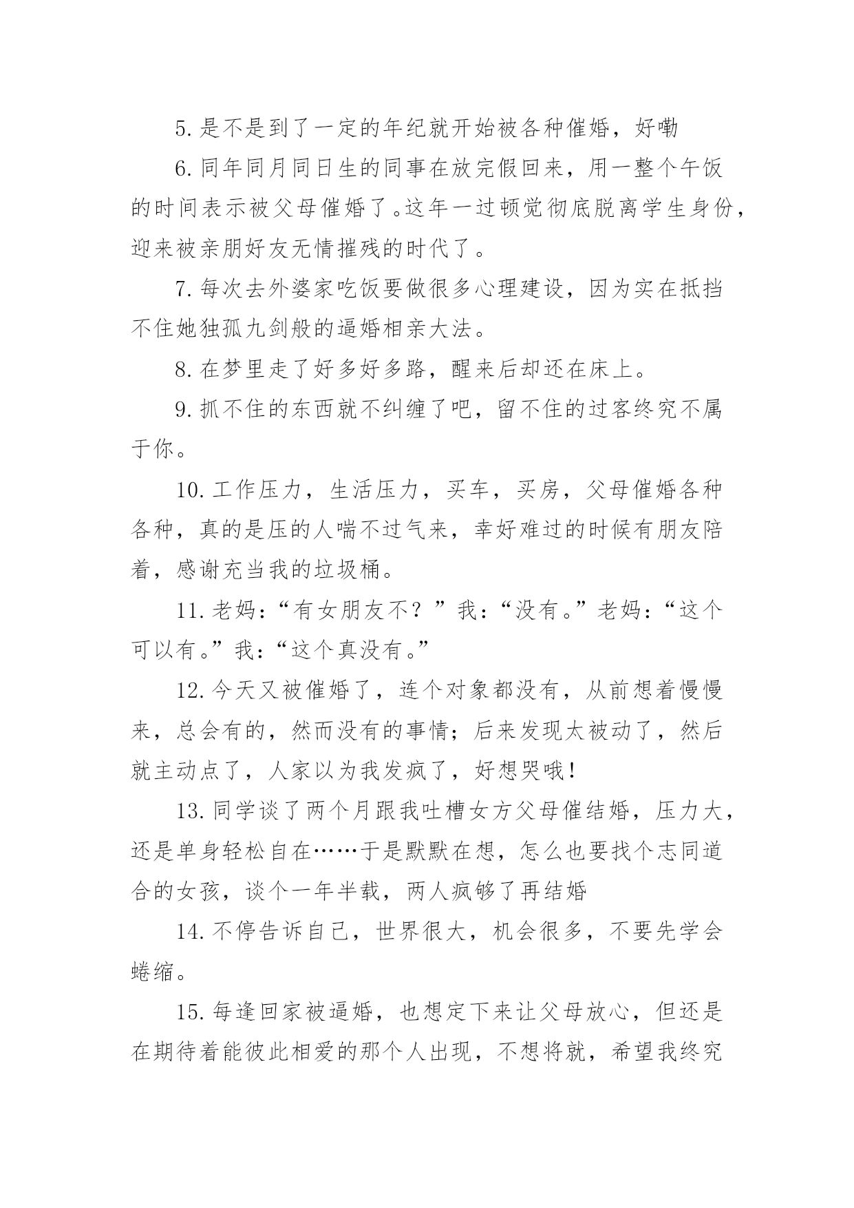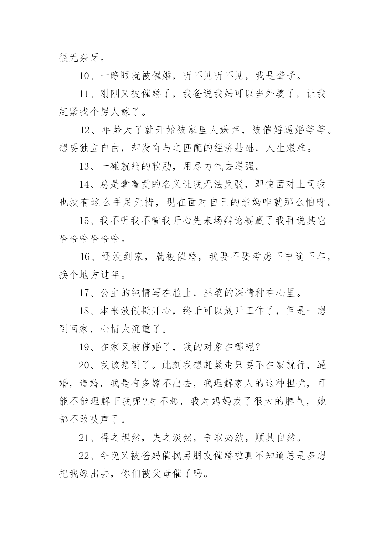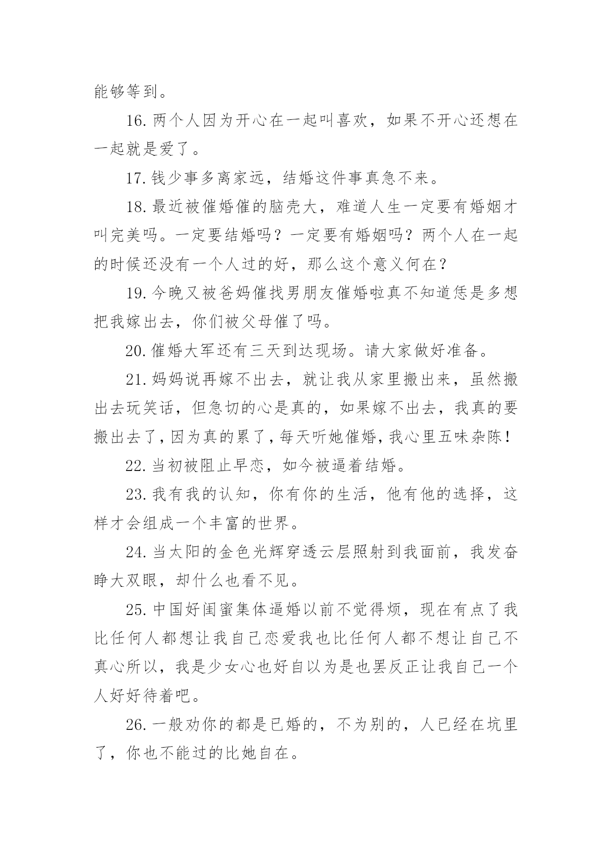 被催婚的经典文案被催婚的经典文案(12篇)在日常学习、工作和生活中,越来越多人喜欢在朋友圈上发布文案,文案用以宣泄自己的情绪,调节心情。还在苦苦寻找优秀经典的文案吗?下面是小编收集整理的被催婚的经典文案,欢迎阅读,希望大家能够喜欢。被催婚的经典文案11.我妈说没有男朋友,今年不要回家过年,所以我今年不回家过年了。2.人类最可宝贵的财富是希望,希望减轻了我们的苦恼,为我们在享受当前的乐趣中描绘出来乐趣的远景。如果人类不幸到目光只限于考虑当前,那么人就会不再去播种,不再去种植,人对什么也不准备了;从而在这尘世的享受中,人就会缺少一切。3.你被父母催工作了吗?你被父母催结婚了吗?你被父母催生小孩了吗?当父爱母爱与催挂钩,爱的意味似乎有点变味了。爱,就不应该各种催,而应该理解与支持,给予儿女一定的自由。他们诚然稚嫩,但他们自然也有他们的梦想,他们的人生。4.压力真的是无处不在,工作日整日操心自己的工作,在这样快速发展的社会不断的学习更新自己免除淘汰的危险,回家还要面对哪些嘴碎的亲友,心累啊。5.是不是到了一定的年纪就开始被各种催婚,好嘞6.同年同月同日生的同事在放完假回来,用一整个午饭的时间表示被父母催婚了。这年一过顿觉彻底脱离学生身份,迎来被亲朋好友无情摧残的时代了。7.每次去外婆家吃饭要做很多心理建设,因为实在抵挡不住她独孤九剑般的逼婚相亲大法。8.在梦里走了好多好多路,醒来后却还在床上。9.抓不住的东西就不纠缠了吧,留不住的过客终究不属于你。10.工作压力,生活压力,买车,买房,父母催婚各种各种,真的是压的人喘不过气来,幸好难过的时候有朋友陪着,感谢充当我的垃圾桶。11.老妈:“有女朋友不?”我:“没有。”老妈:“这个可以有。”我:“这个真没有。”12.今天又被催婚了,连个对象都没有,从前想着慢慢来,总会有的,然而没有的事情;后来发现太被动了,然后就主动点了,人家以为我发疯了,好想哭哦!13.同学谈了两个月跟我吐槽女方父母催结婚,压力大,还是单身轻松自在……于是默默在想,怎么也要找个志同道合的女孩,谈个一年半载,两人疯够了再结婚14.不停告诉自己,世界很大,机会很多,不要先学会蜷缩。15.每逢回家被逼婚,也想定下来让父母放心,但还是在期待着能彼此相爱的那个人出现,不想将就,希望我终究能够等到。16.两个人因为开心在一起叫喜欢,如果不开心还想在一起就是爱了。17.钱少事多离家远,结婚这件事真急不来。18.最近被催婚催的脑壳大,难道人生一定要有婚姻才叫完美吗。一定要结婚吗?一定要有婚姻吗?两个人在一起的时候还没有一个人过的好,那么这个意义何在?19.今晚又被爸妈催找男朋友催婚啦真不知道恁是多想把我嫁出去,你们被父母催了吗。20.催婚大军还有三天到达现场。请大家做好准备。21.妈妈说再嫁不出去,就让我从家里搬出来,虽然搬出去玩笑话,但急切的心是真的,如果嫁不出去,我真的要搬出去了,因为真的累了,每天听她催婚,我心里五味杂陈!22.当初被阻止早恋,如今被逼着结婚。23.我有我的认知,你有你的生活,他有他的选择,这样才会组成一个丰富的世界。24.当太阳的金色光辉穿透云层照射到我面前,我发奋睁大双眼,却什么也看不见。25.中国好闺蜜集体逼婚以前不觉得烦,现在有点了我比任何人都想让我自己恋爱我也比任何人都不想让自己不真心所以,我是少女心也好自以为是也罢反正让我自己一个人好好待着吧。26.一般劝你的都是已婚的,不为别的,人已经在坑里了,你也不能过的比她自在。27.和我同龄的女生不都没对象,比如杨紫迪丽热巴古力娜扎。28.已把我催到崩溃的边缘,我觉得如果最后一次温柔的反驳不奏效,百分之九十九的可能就是狂怼开骂。没办法,我素质真的不高。29.同事说你要是不结婚,别人就会看不起你爸妈的。30.被父母催婚的心情说说过年又被催婚的句子心情。31.即便大着几岁,多一些生活经历,教育程度高一些,也不意味着你有资格去批评教导别人,指点江山。32.真实感觉太委屈了,下午被我妈念叨得哭了,“干得好不如嫁得好”,都啥道理啊,第一次感到了被催婚的压力,呜呜呜我真的太难受了。33.孩提时不想父母离婚,长大后不想被父母催婚。我们是不是总以骨肉的名义干涉世上最奇妙的陌生关系----爱情。34.才刚毕业出来工作没多久,我近期根本没有结婚的打算,工作之余还得面对妈妈的催婚招数,真是让人受不了。35.家里那种催结婚的,我真的实力无语吧,我父母都没催,你那么急干嘛,那种不想上学只想生孩子的才会急着结婚,还有说毕业了就找个村卫生室呆着等嫁人,我真的服了。36.我们这批人将开始被父母催婚,甚至有的人已经能抱着孩子来参加同学聚会。37.最终还是被家里长辈催婚了可能是时候未到吧。瞬间有点恐婚。38.面对催婚,我无所适从,在这个尴尬的年纪我还是找不到结婚的理由。39.我不听我不管我开心先