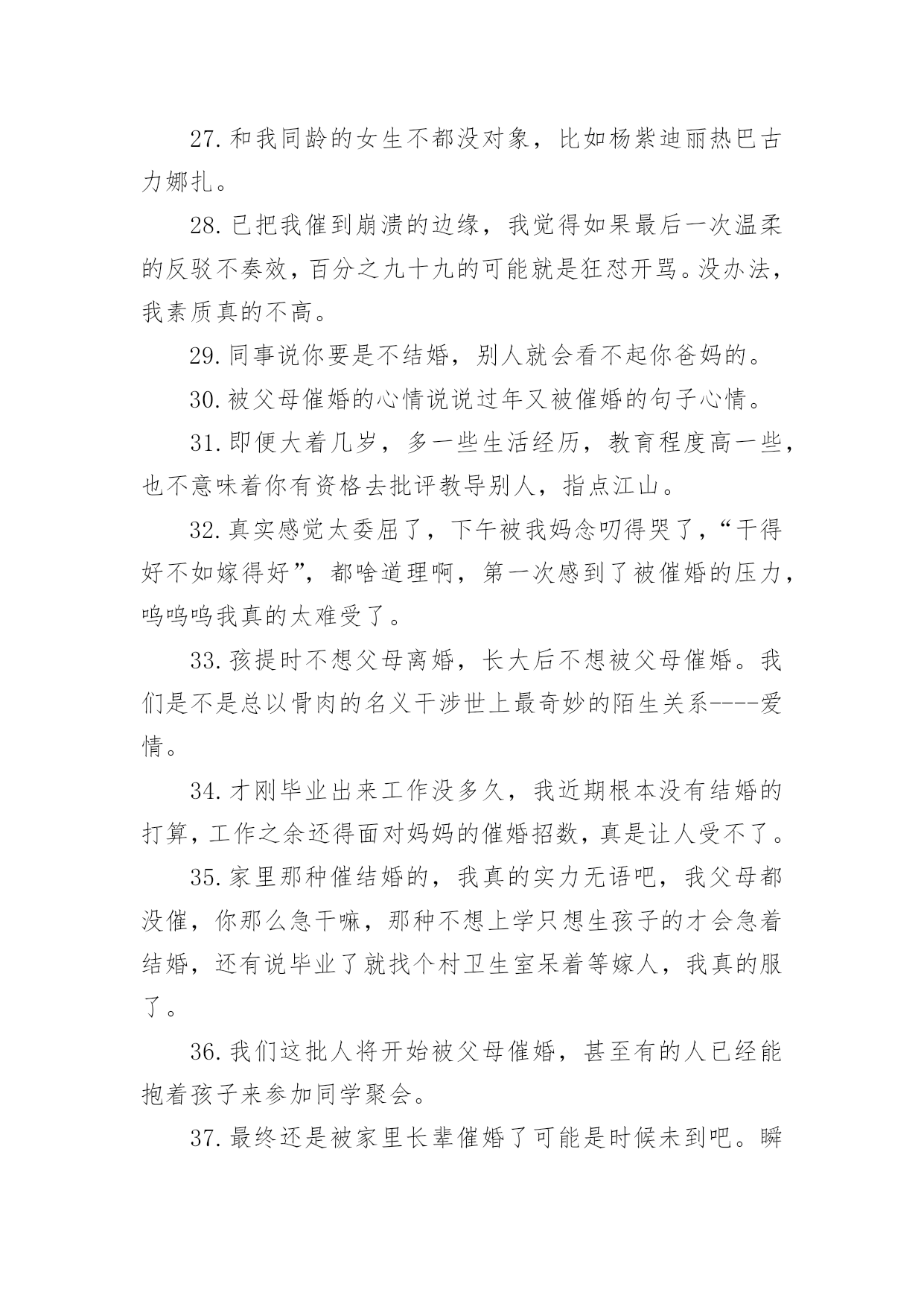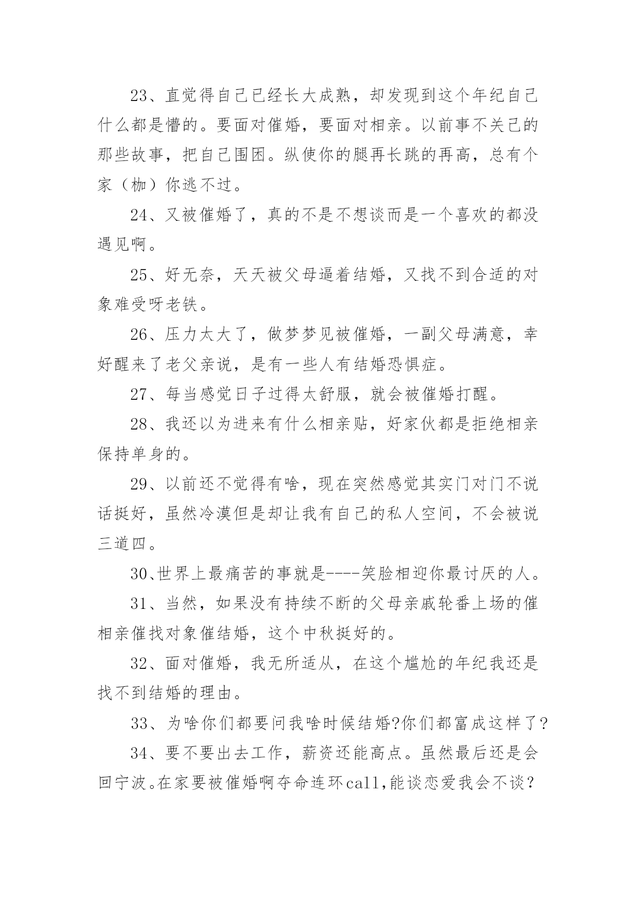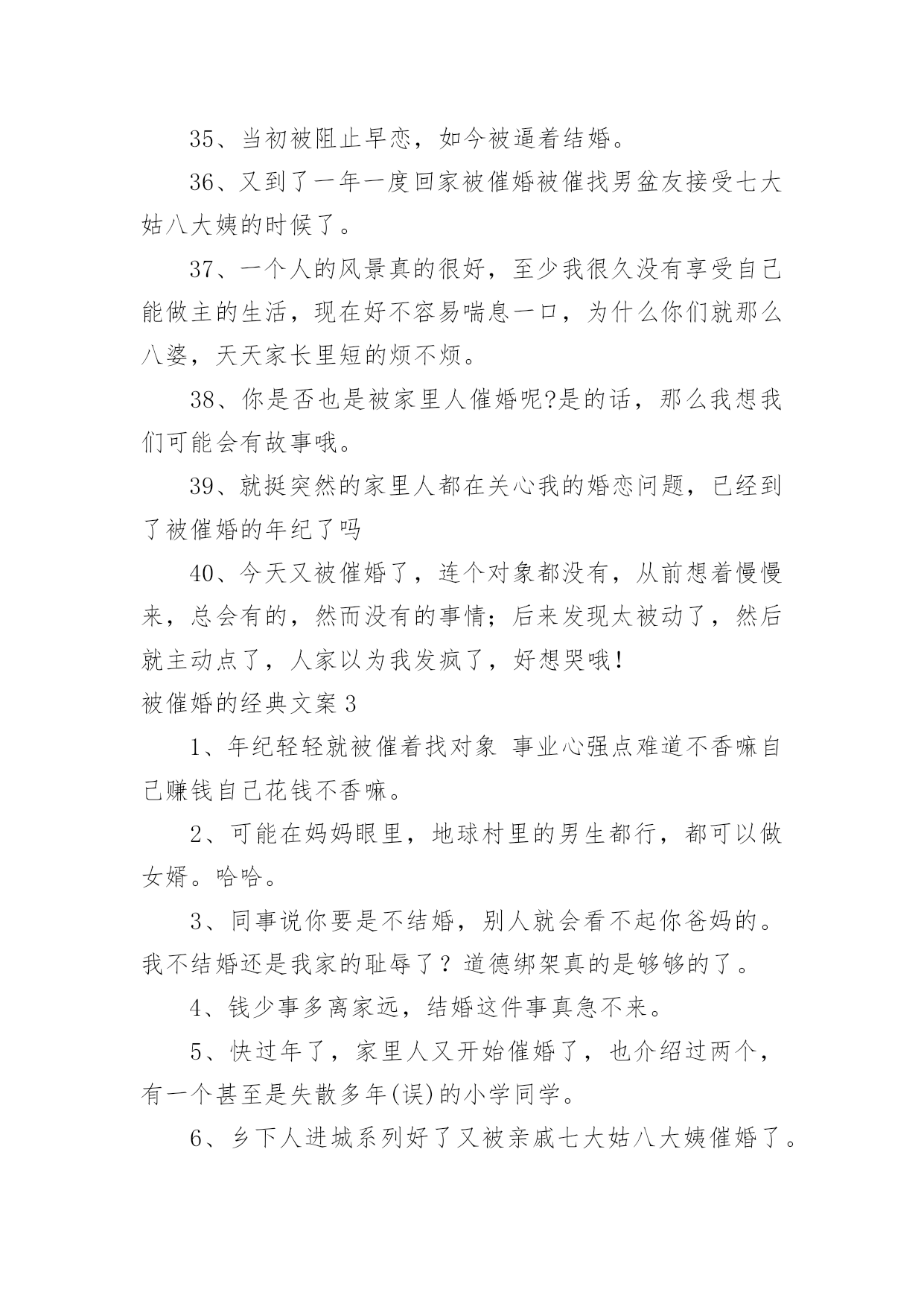 被催婚的经典文案被催婚的经典文案(12篇)在日常学习、工作和生活中,越来越多人喜欢在朋友圈上发布文案,文案用以宣泄自己的情绪,调节心情。还在苦苦寻找优秀经典的文案吗?下面是小编收集整理的被催婚的经典文案,欢迎阅读,希望大家能够喜欢。被催婚的经典文案11.我妈说没有男朋友,今年不要回家过年,所以我今年不回家过年了。2.人类最可宝贵的财富是希望,希望减轻了我们的苦恼,为我们在享受当前的乐趣中描绘出来乐趣的远景。如果人类不幸到目光只限于考虑当前,那么人就会不再去播种,不再去种植,人对什么也不准备了;从而在这尘世的享受中,人就会缺少一切。3.你被父母催工作了吗?你被父母催结婚了吗?你被父母催生小孩了吗?当父爱母爱与催挂钩,爱的意味似乎有点变味了。爱,就不应该各种催,而应该理解与支持,给予儿女一定的自由。他们诚然稚嫩,但他们自然也有他们的梦想,他们的人生。4.压力真的是无处不在,工作日整日操心自己的工作,在这样快速发展的社会不断的学习更新自己免除淘汰的危险,回家还要面对哪些嘴碎的亲友,心累啊。5.是不是到了一定的年纪就开始被各种催婚,好嘞6.同年同月同日生的同事在放完假回来,用一整个午饭的时间表示被父母催婚了。这年一过顿觉彻底脱离学生身份,迎来被亲朋好友无情摧残的时代了。7.每次去外婆家吃饭要做很多心理建设,因为实在抵挡不住她独孤九剑般的逼婚相亲大法。8.在梦里走了好多好多路,醒来后却还在床上。9.抓不住的东西就不纠缠了吧,留不住的过客终究不属于你。10.工作压力,生活压力,买车,买房,父母催婚各种各种,真的是压的人喘不过气来,幸好难过的时候有朋友陪着,感谢充当我的垃圾桶。11.老妈:“有女朋友不?”我:“没有。”老妈:“这个可以有。”我:“这个真没有。”12.今天又被催婚了,连个对象都没有,从前想着慢慢来,总会有的,然而没有的事情;后来发现太被动了,然后就主动点了,人家以为我发疯了,好想哭哦!13.同学谈了两个月跟我吐槽女方父母催结婚,压力大,还是单身轻松自在……于是默默在想,怎么也要找个志同道合的女孩,谈个一年半载,两人疯够了再结婚14.不停告诉自己,世界很大,机会很多,不要先学会蜷缩。15.每逢回家被逼婚,也想定下来让父母放心,但还是在期待着能彼此相爱的那个人出现,不想将就,希望我终究能够等到。16.两个人因为开心在一起叫喜欢,如果不开心还想在一起就是爱了。17.钱少事多离家远,结婚这件事真急不来。18.最近被催婚催的脑壳大,难道人生一定要有婚姻才叫完美吗。一定要结婚吗?一定要有婚姻吗?两个人在一起的时候还没有一个人过的好,那么这个意义何在?19.今晚又被爸妈催找男朋友催婚啦真不知道恁是多想把我嫁出去,你们被父母催了吗。20.催婚大军还有三天到达现场。请大家做好准备。21.妈妈说再嫁不出去,就让我从家里搬出来,虽然搬出去玩笑话,但急切的心是真的,如果嫁不出去,我真的要搬出去了,因为真的累了,每天听她催婚,我心里五味杂陈!22.当初被阻止早恋,如今被逼着结婚。23.我有我的认知,你有你的生活,他有他的选择,这样才会组成一个丰富的世界。24.当太阳的金色光辉穿透云层照射到我面前,我发奋睁大双眼,却什么也看不见。25.中国好闺蜜集体逼婚以前不觉得烦,现在有点了我比任何人都想让我自己恋爱我也比任何人都不想让自己不真心所以,我是少女心也好自以为是也罢反正让我自己一个人好好待着吧。26.一般劝你的都是已婚的,不为别的,人已经在坑里了,你也不能过的比她自在。27.和我同龄的女生不都没对象,比如杨紫迪丽热巴古力娜扎。28.已把我催到崩溃的边缘,我觉得如果最后一次温柔的反驳不奏效,百分之九十九的可能就是狂怼开骂。没办法,我素质真的不高。29.同事说你要是不结婚,别人就会看不起你爸妈的。30.被父母催婚的心情说说过年又被催婚的句子心情。31.即便大着几岁,多一些生活经历,教育程度高一些,也不意味着你有资格去批评教导别人,指点江山。32.真实感觉太委屈了,下午被我妈念叨得哭了,“干得好不如嫁得好”,都啥道理啊,第一次感到了被催婚的压力,呜呜呜我真的太难受了。33.孩提时不想父母离婚,长大后不想被父母催婚。我们是不是总以骨肉的名义干涉世上最奇妙的陌生关系----爱情。34.才刚毕业出来工作没多久,我近期根本没有结婚的打算,工作之余还得面对妈妈的催婚招数,真是让人受不了。35.家里那种催结婚的,我真的实力无语吧,我父母都没催,你那么急干嘛,那种不想上学只想生孩子的才会急着结婚,还有说毕业了就找个村卫生室呆着等嫁人,我真的服了。36.我们这批人将开始被父母催婚,甚至有的人已经能抱着孩子来参加同学聚会。37.最终还是被家里长辈催婚了可能是时候未到吧。瞬间有点恐婚。38.面对催婚,我无所适从,在这个尴尬的年纪我还是找不到结婚的理由。39.我不听我不管我开心先