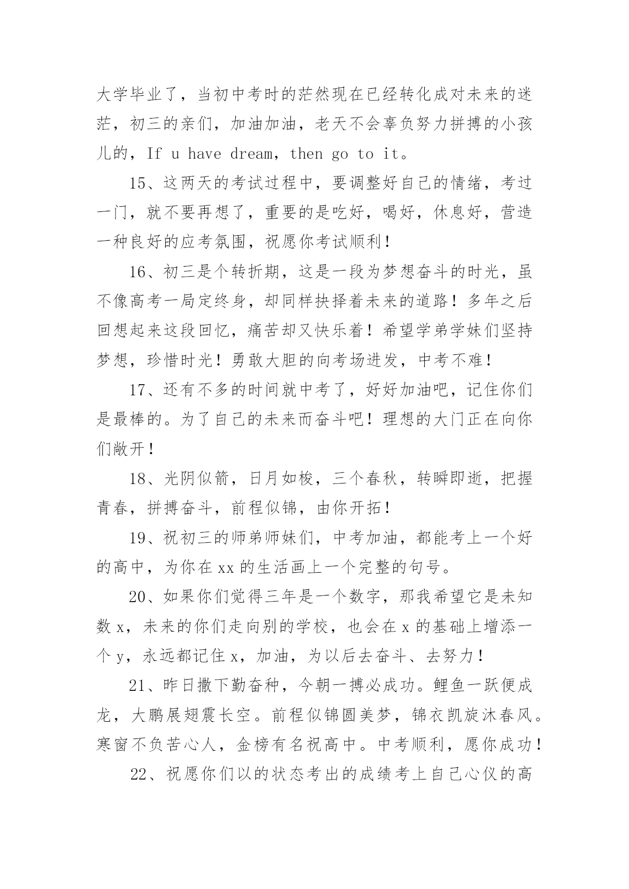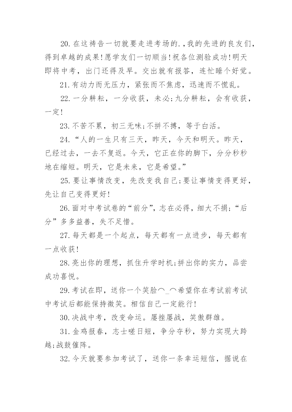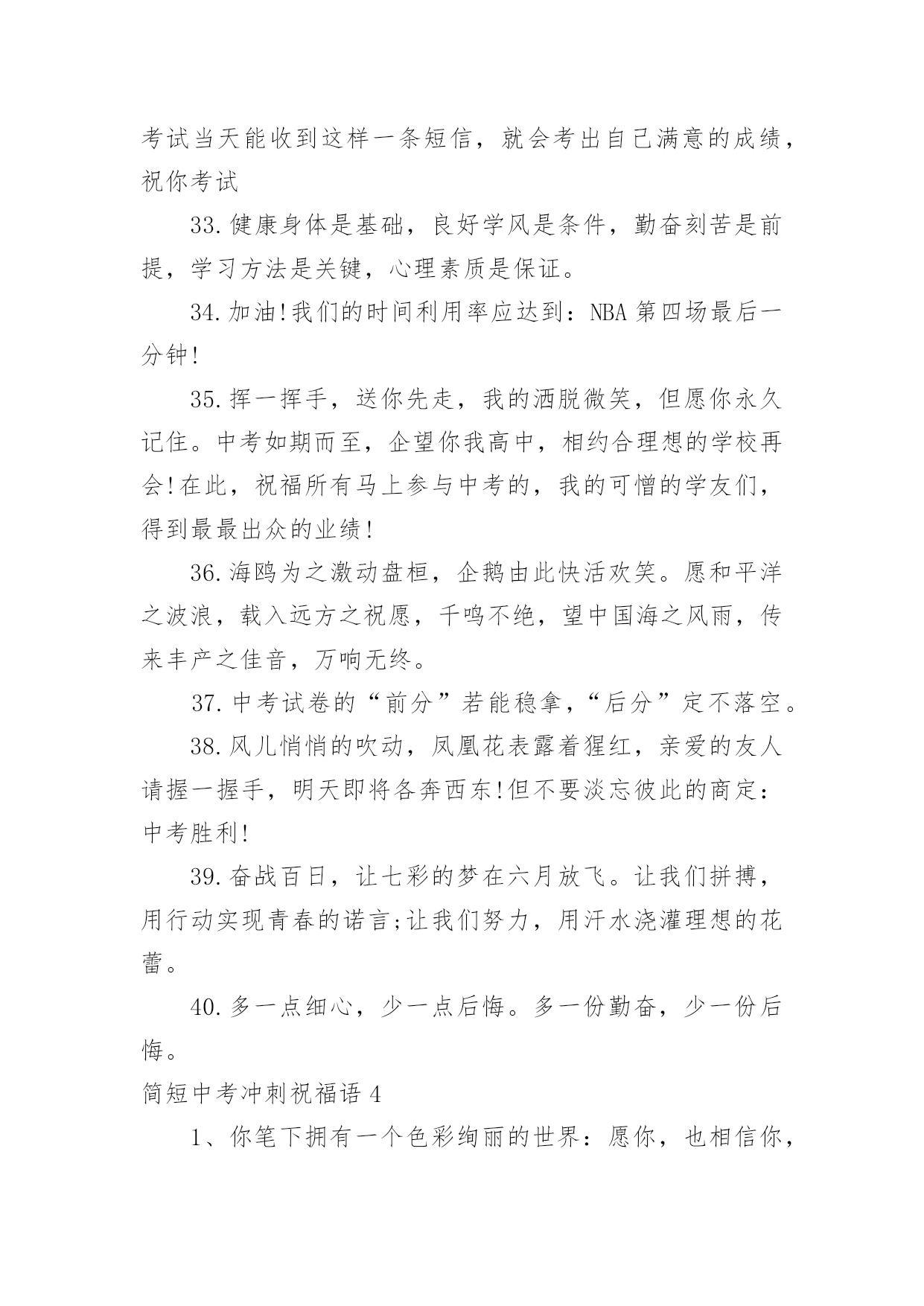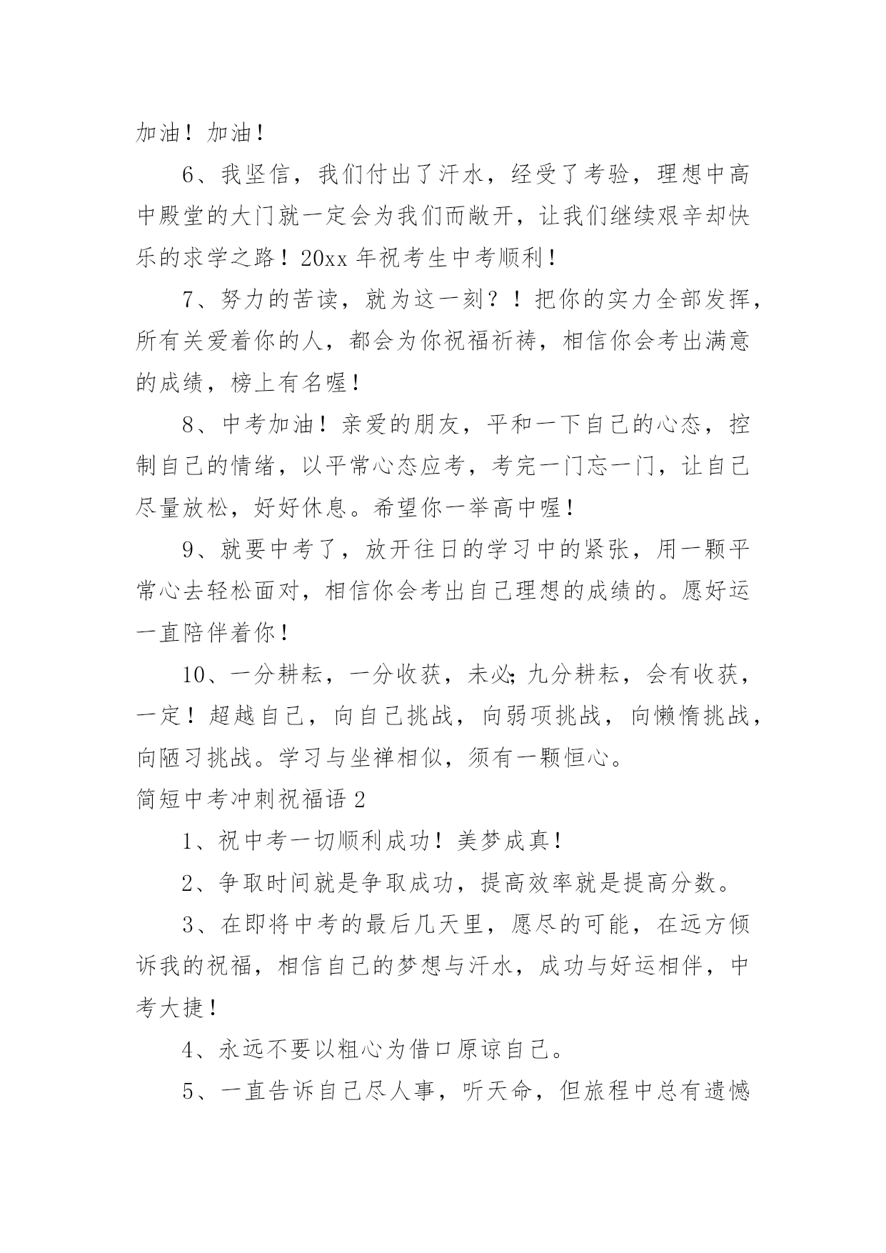 简短中考冲刺祝福语简短中考冲刺祝福语无论是身处学校还是步入社会,要用到祝福语的情况还是蛮多的,祝福语往往灵活机动,可以随机应变。相信许多人会觉得祝福语很难写吧,以下是小编整理的简短中考冲刺祝福语,欢迎大家分享。简短中考冲刺祝福语11、挥一挥手,送你先走,我的潇洒微笑,但愿你永远记住。中考如期而至,希望你我高中,相约在理想的学校里再见!2、人生处处是考场,今日各为中考忙。斗智斗勇齐亮相,得失成败走一场。考场潇洒不虚枉,多年以后话沧桑!3、成功的花由汗水浇灌,艰苦的掘流出甘甜的泉,辛劳的'付出必有丰厚回报,紫气东来鸿运通天,孜孜不倦今朝梦圆。祝你中考成功!4、中考到来勿急躁,稳着情绪静心考。思维敏捷别乱想,先易后难办法妙。早进考场莫迟到,熟悉环境清醒脑。早晨吃饱清澹好,答完细阅题不冒。祝你考个好成绩,金旁提名欢声喜。5、大家一起努力吧。等待我们的将是一个美好的明天!加油!加油!6、我坚信,我们付出了汗水,经受了考验,理想中高中殿堂的大门就一定会为我们而敞开,让我们继续艰辛却快乐的求学之路!20xx年祝考生中考顺利!7、努力的苦读,就为这一刻?!把你的实力全部发挥,所有关爱着你的人,都会为你祝福祈祷,相信你会考出满意的成绩,榜上有名喔!8、中考加油!亲爱的朋友,平和一下自己的心态,控制自己的情绪,以平常心态应考,考完一门忘一门,让自己尽量放松,好好休息。希望你一举高中喔!9、就要中考了,放开往日的学习中的紧张,用一颗平常心去轻松面对,相信你会考出自己理想的成绩的。愿好运一直陪伴着你!10、一分耕耘,一分收获,未必;九分耕耘,会有收获,一定!超越自己,向自己挑战,向弱项挑战,向懒惰挑战,向陋习挑战。学习与坐禅相似,须有一颗恒心。简短中考冲刺祝福语21、祝中考一切顺利成功!美梦成真!2、争取时间就是争取成功,提高效率就是提高分数。3、在即将中考的最后几天里,愿尽的可能,在远方倾诉我的祝福,相信自己的梦想与汗水,成功与好运相伴,中考大捷!4、永远不要以粗心为借口原谅自己。5、一直告诉自己尽人事,听天命,但旅程中总有遗憾的花朵,它弄伤我的手但弄不伤我的心,我的明天,我会坚强走下去,走下去。6、一分耕耘,一分收获,未必;九分耕耘,会有收获,一定!7、仰望天空时,什么都比你高,你会自卑;俯视大地时,什么都比你低,你会自负;只有放宽视野,把天空和大地尽收眼底,才能在苍穹泛土之间找到你真正的位置。无须自卑,不要自负,坚持自信。8、心若在,梦就在,天地之间还有真爱,谈成败,人生豪迈,只不过是重头再来……小妹,真心的付出终会换来真心的回报,我们共同努力吧!9、圣人与常人之间往往只相差一小步,而这一小步却往往需要非凡的毅力才能赶上。10、生命之中最快乐的是拼搏,而非成功,生命之中最痛苦的是懒散,而非失败。11、人生终有许多选择。每一步都要慎重。但是一次选择不能决定一切。不要犹豫,作出选择就不要后悔。只要我们能不屈不挠地奋斗,胜利就在前方。12、朋友,莫悲伤,因为一切可以再重来,但要注重备加珍惜。努力吧!朋友,我会为你加油!莫悲伤,你的前景更辉煌,最后送你一首诗以表我对你的一片心意。13、你有你的赤橙黄绿,我有我的青蓝靛紫,天空同属于我们,因为我们年轻。14、至今距离中考也已过了7年了,现在的我已经接近大学毕业了,当初中考时的茫然现在已经转化成对未来的迷茫,初三的亲们,加油加油,老天不会辜负努力拼搏的小孩儿的,Ifuhavedream,thengotoit。15、这两天的考试过程中,要调整好自己的情绪,考过一门,就不要再想了,重要的是吃好,喝好,休息好,营造一种良好的应考氛围,祝愿你考试顺利!16、初三是个转折期,这是一段为梦想奋斗的时光,虽不像高考一局定终身,却同样抉择着未来的道路!多年之后回想起来这段回忆,痛苦却又快乐着!希望学弟学妹们坚持梦想,珍惜时光!勇敢大胆的向考场进发,中考不难!17、还有不多的时间就中考了,好好加油吧,记住你们是最棒的。为了自己的未来而奋斗吧!理想的大门正在向你们敞开!18、光阴似箭,日月如梭,三个春秋,转瞬即逝,把握青春,拼搏奋斗,前程似锦,由你开拓!19、祝初三的师弟师妹们,中考加油,都能考上一个好的高中,为你在xx的生活画上一个完整的句号。20、如果你们觉得三年是一个数字,那我希望它是未知数x,未来的你们走向别的学校,也会在x的基础上增添一个y,永远都记住x,加油,为以后去奋斗、去努力!21、昨日撒下勤奋种,今朝一搏必成功。鲤鱼一跃便成龙,大鹏展翅震长空。前程似锦圆美梦,锦衣凯旋沐春风。寒窗不负苦心人,金榜有名祝高中。中考顺利,愿你成功!22、祝愿你们以的状态考出的成绩考上自己心仪的高中!23、无悔的青春需要汗水的冲刷,拥有自己生长的羽翅,才能更好的迎风翱翔!24、珍惜最后的日子!努力加油奋斗!不要让三年的努力付诸东