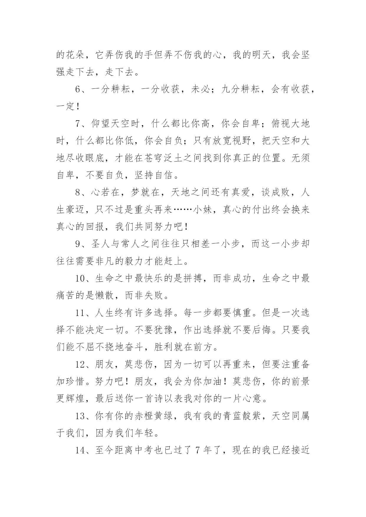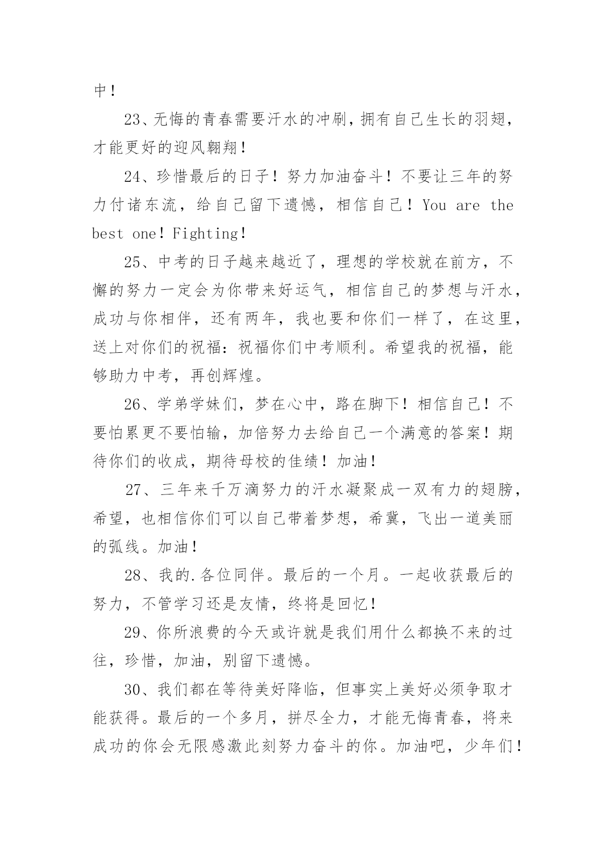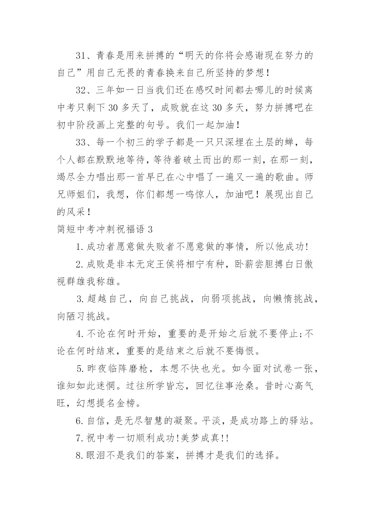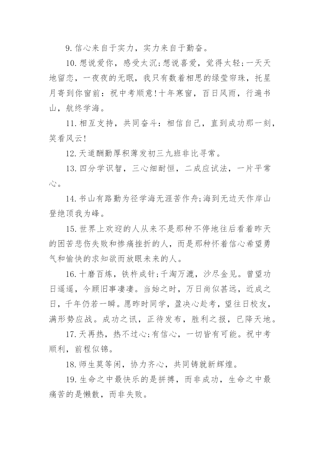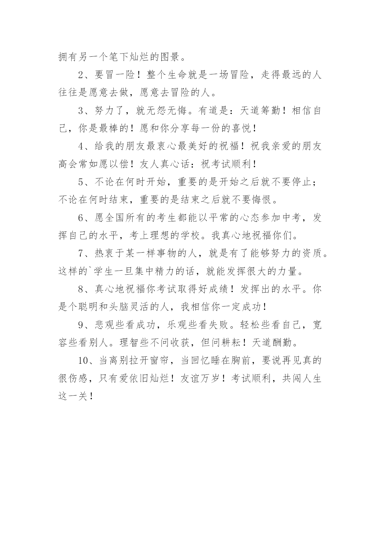 简短中考冲刺祝福语简短中考冲刺祝福语无论是身处学校还是步入社会,要用到祝福语的情况还是蛮多的,祝福语往往灵活机动,可以随机应变。相信许多人会觉得祝福语很难写吧,以下是小编整理的简短中考冲刺祝福语,欢迎大家分享。简短中考冲刺祝福语11、挥一挥手,送你先走,我的潇洒微笑,但愿你永远记住。中考如期而至,希望你我高中,相约在理想的学校里再见!2、人生处处是考场,今日各为中考忙。斗智斗勇齐亮相,得失成败走一场。考场潇洒不虚枉,多年以后话沧桑!3、成功的花由汗水浇灌,艰苦的掘流出甘甜的泉,辛劳的'付出必有丰厚回报,紫气东来鸿运通天,孜孜不倦今朝梦圆。祝你中考成功!4、中考到来勿急躁,稳着情绪静心考。思维敏捷别乱想,先易后难办法妙。早进考场莫迟到,熟悉环境清醒脑。早晨吃饱清澹好,答完细阅题不冒。祝你考个好成绩,金旁提名欢声喜。5、大家一起努力吧。等待我们的将是一个美好的明天!加油!加油!6、我坚信,我们付出了汗水,经受了考验,理想中高中殿堂的大门就一定会为我们而敞开,让我们继续艰辛却快乐的求学之路!20xx年祝考生中考顺利!7、努力的苦读,就为这一刻?!把你的实力全部发挥,所有关爱着你的人,都会为你祝福祈祷,相信你会考出满意的成绩,榜上有名喔!8、中考加油!亲爱的朋友,平和一下自己的心态,控制自己的情绪,以平常心态应考,考完一门忘一门,让自己尽量放松,好好休息。希望你一举高中喔!9、就要中考了,放开往日的学习中的紧张,用一颗平常心去轻松面对,相信你会考出自己理想的成绩的。愿好运一直陪伴着你!10、一分耕耘,一分收获,未必;九分耕耘,会有收获,一定!超越自己,向自己挑战,向弱项挑战,向懒惰挑战,向陋习挑战。学习与坐禅相似,须有一颗恒心。简短中考冲刺祝福语21、祝中考一切顺利成功!美梦成真!2、争取时间就是争取成功,提高效率就是提高分数。3、在即将中考的最后几天里,愿尽的可能,在远方倾诉我的祝福,相信自己的梦想与汗水,成功与好运相伴,中考大捷!4、永远不要以粗心为借口原谅自己。5、一直告诉自己尽人事,听天命,但旅程中总有遗憾的花朵,它弄伤我的手但弄不伤我的心,我的明天,我会坚强走下去,走下去。6、一分耕耘,一分收获,未必;九分耕耘,会有收获,一定!7、仰望天空时,什么都比你高,你会自卑;俯视大地时,什么都比你低,你会自负;只有放宽视野,把天空和大地尽收眼底,才能在苍穹泛土之间找到你真正的位置。无须自卑,不要自负,坚持自信。8、心若在,梦就在,天地之间还有真爱,谈成败,人生豪迈,只不过是重头再来……小妹,真心的付出终会换来真心的回报,我们共同努力吧!9、圣人与常人之间往往只相差一小步,而这一小步却往往需要非凡的毅力才能赶上。10、生命之中最快乐的是拼搏,而非成功,生命之中最痛苦的是懒散,而非失败。11、人生终有许多选择。每一步都要慎重。但是一次选择不能决定一切。不要犹豫,作出选择就不要后悔。只要我们能不屈不挠地奋斗,胜利就在前方。12、朋友,莫悲伤,因为一切可以再重来,但要注重备加珍惜。努力吧!朋友,我会为你加油!莫悲伤,你的前景更辉煌,最后送你一首诗以表我对你的一片心意。13、你有你的赤橙黄绿,我有我的青蓝靛紫,天空同属于我们,因为我们年轻。14、至今距离中考也已过了7年了,现在的我已经接近大学毕业了,当初中考时的茫然现在已经转化成对未来的迷茫,初三的亲们,加油加油,老天不会辜负努力拼搏的小孩儿的,Ifuhavedream,thengotoit。15、这两天的考试过程中,要调整好自己的情绪,考过一门,就不要再想了,重要的是吃好,喝好,休息好,营造一种良好的应考氛围,祝愿你考试顺利!16、初三是个转折期,这是一段为梦想奋斗的时光,虽不像高考一局定终身,却同样抉择着未来的道路!多年之后回想起来这段回忆,痛苦却又快乐着!希望学弟学妹们坚持梦想,珍惜时光!勇敢大胆的向考场进发,中考不难!17、还有不多的时间就中考了,好好加油吧,记住你们是最棒的。为了自己的未来而奋斗吧!理想的大门正在向你们敞开!18、光阴似箭,日月如梭,三个春秋,转瞬即逝,把握青春,拼搏奋斗,前程似锦,由你开拓!19、祝初三的师弟师妹们,中考加油,都能考上一个好的高中,为你在xx的生活画上一个完整的句号。20、如果你们觉得三年是一个数字,那我希望它是未知数x,未来的你们走向别的学校,也会在x的基础上增添一个y,永远都记住x,加油,为以后去奋斗、去努力!21、昨日撒下勤奋种,今朝一搏必成功。鲤鱼一跃便成龙,大鹏展翅震长空。前程似锦圆美梦,锦衣凯旋沐春风。寒窗不负苦心人,金榜有名祝高中。中考顺利,愿你成功!22、祝愿你们以的状态考出的成绩考上自己心仪的高中!23、无悔的青春需要汗水的冲刷,拥有自己生长的羽翅,才能更好的迎风翱翔!24、珍惜最后的日子!努力加油奋斗!不要让三年的努力付诸东