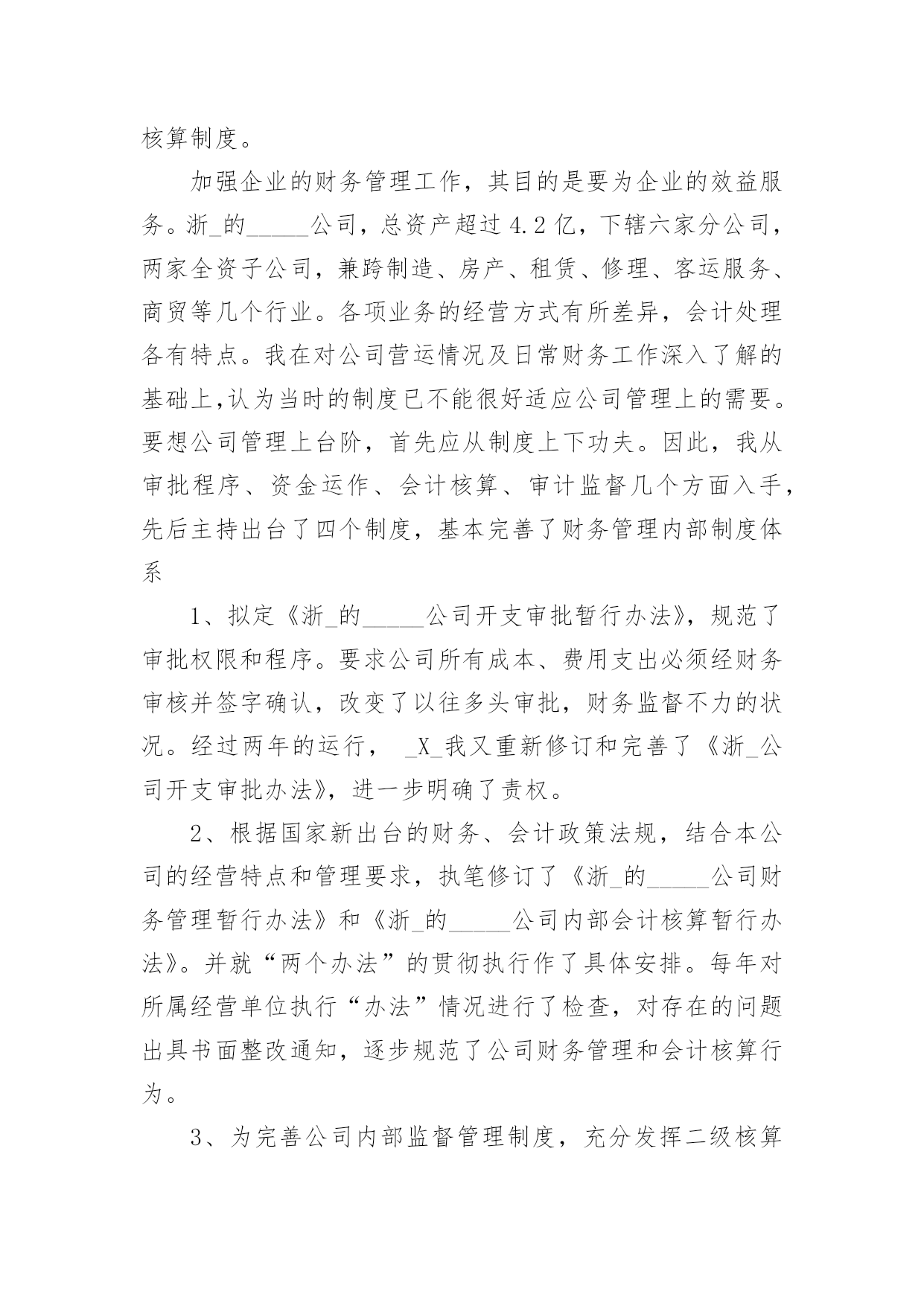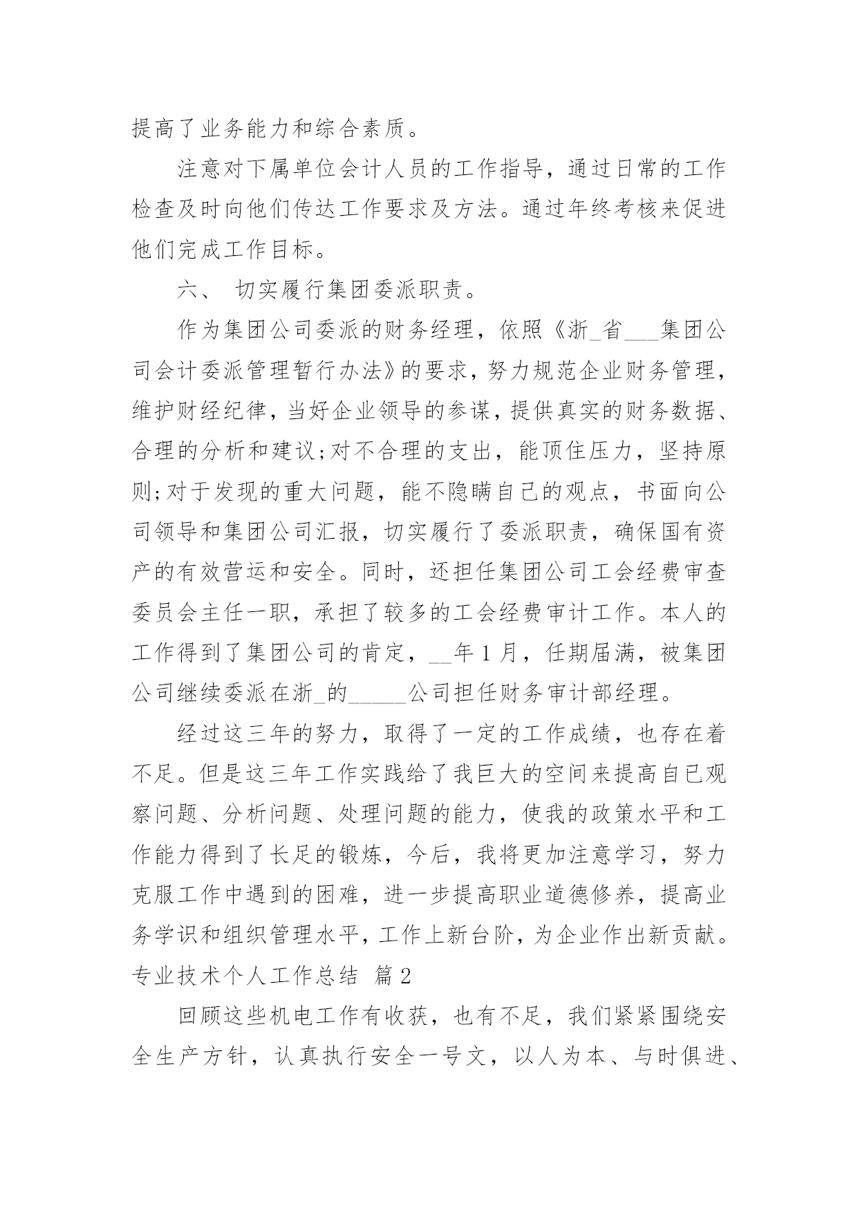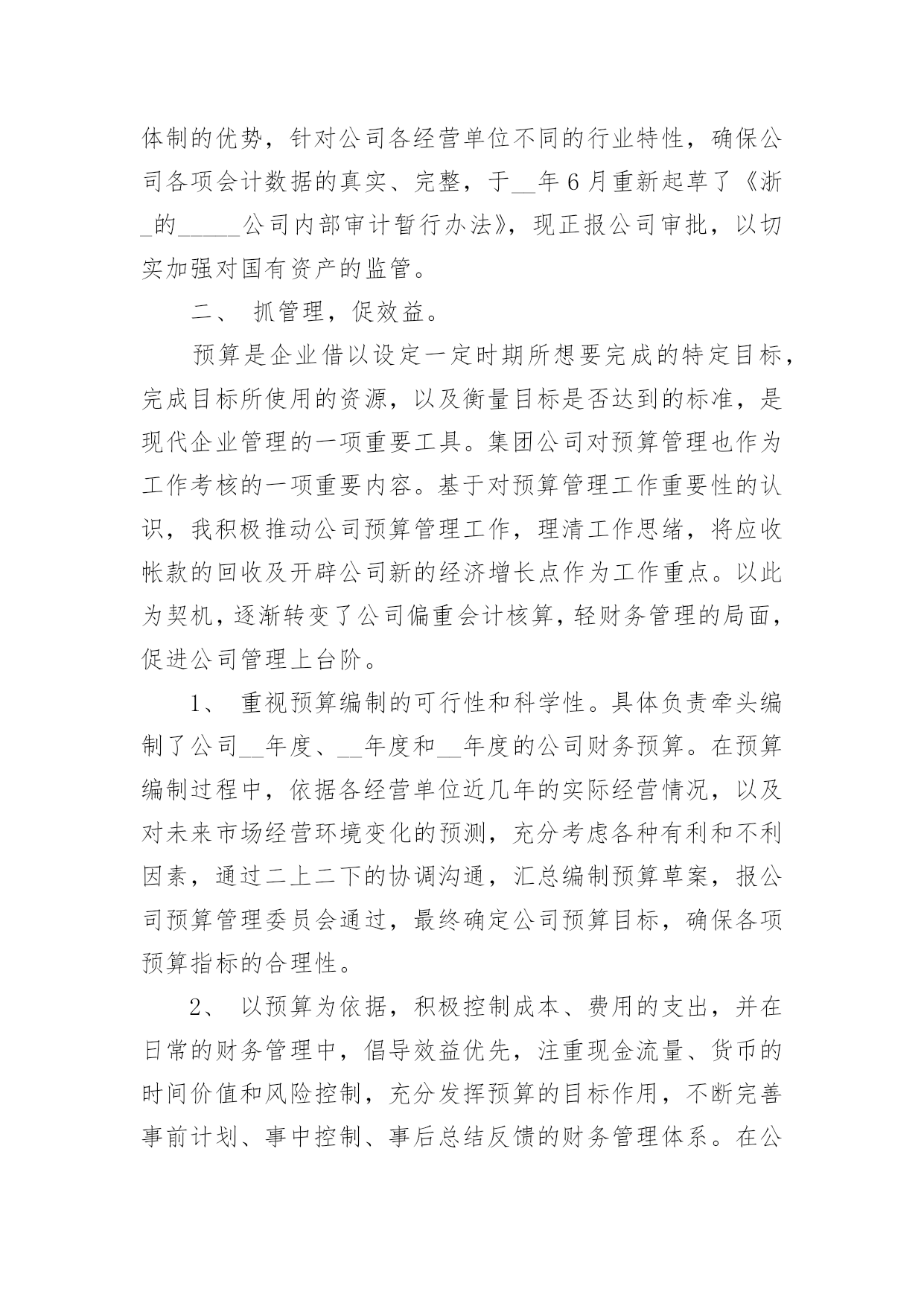 专业技术个人工作总结实用的专业技术个人工作总结八篇总结是对过去一定时期的工作、学习或思想情况进行回顾、分析,并做出客观评价的书面材料,它在我们的学习、工作中起到呈上启下的作用,让我们来为自己写一份总结吧。总结一般是怎么写的呢?下面是小编为大家整理的专业技术个人工作总结8篇,欢迎阅读,希望大家能够喜欢。专业技术个人工作总结篇1本人自____年5月,通过全国统考,取得会计师专业技术资格以来,单位和工作几经变动,96—97年8月,在中国_____公司财务处,具体负责所属__房产公司的财务管理和会计核算工作;97年9月,经省级机关公务员公开招考并被录用,进入浙_省__局财务审计处,从事所属企业的会计管理和审计工作;1999年取得注册会计师资格,期间被浙_的_会计师事务所聘用为特约审计人员;1999年9月初调入浙_省__集团有限责任公司财务部工作,__年8月始,本人受集团公司委派担任浙_的_____公司财务部经理。不同的工作经历,给了我很好的锻炼机会,丰富了我的阅历,开阔了我的眼界,并促使我不断努力学习,掌握最新的财务会计知识,以出色地完成所担负的工作。下面,我重点就最近三年担任浙_的_____公司财务审计部经理一职期间所形成工作思路及完成的工作,做业务总结。一、加强制度建设,拟定和完善公司财务管理和会计核算制度。加强企业的财务管理工作,其目的是要为企业的效益服务。浙_的_____公司,总资产超过4.2亿,下辖六家分公司,两家全资子公司,兼跨制造、房产、租赁、修理、客运服务、商贸等几个行业。各项业务的经营方式有所差异,会计处理各有特点。我在对公司营运情况及日常财务工作深入了解的基础上,认为当时的制度已不能很好适应公司管理上的需要。要想公司管理上台阶,首先应从制度上下功夫。因此,我从审批程序、资金运作、会计核算、审计监督几个方面入手,先后主持出台了四个制度,基本完善了财务管理内部制度体系1、拟定《浙_的_____公司开支审批暂行办法》,规范了审批权限和程序。要求公司所有成本、费用支出必须经财务审核并签字确认,改变了以往多头审批,财务监督不力的状况。经过两年的运行,_X_我又重新修订和完善了《浙_公司开支审批办法》,进一步明确了责权。2、根据国家新出台的财务、会计政策法规,结合本公司的经营特点和管理要求,执笔修订了《浙_的_____公司财务管理暂行办法》和《浙_的_____公司内部会计核算暂行办法》。并就“两个办法”的贯彻执行作了具体安排。每年对所属经营单位执行“办法”情况进行了检查,对存在的问题出具书面整改通知,逐步规范了公司财务管理和会计核算行为。3、为完善公司内部监督管理制度,充分发挥二级核算体制的优势,针对公司各经营单位不同的行业特性,确保公司各项会计数据的真实、完整,于__年6月重新起草了《浙_的_____公司内部审计暂行办法》,现正报公司审批,以切实加强对国有资产的监管。二、抓管理,促效益。预算是企业借以设定一定时期所想要完成的特定目标,完成目标所使用的资源,以及衡量目标是否达到的标准,是现代企业管理的一项重要工具。集团公司对预算管理也作为工作考核的一项重要内容。基于对预算管理工作重要性的认识,我积极推动公司预算管理工作,理清工作思绪,将应收帐款的回收及开辟公司新的经济增长点作为工作重点。以此为契机,逐渐转变了公司偏重会计核算,轻财务管理的局面,促进公司管理上台阶。1、重视预算编制的可行性和科学性。具体负责牵头编制了公司__年度、__年度和__年度的公司财务预算。在预算编制过程中,依据各经营单位近几年的实际经营情况,以及对未来市场经营环境变化的预测,充分考虑各种有利和不利因素,通过二上二下的协调沟通,汇总编制预算草案,报公司预算管理委员会通过,最终确定公司预算目标,确保各项预算指标的合理性。2、以预算为依据,积极控制成本、费用的支出,并在日常的财务管理中,倡导效益优先,注重现金流量、货币的时间价值和风险控制,充分发挥预算的目标作用,不断完善事前计划、事中控制、事后总结反馈的财务管理体系。在公司整体对外投资效益不佳的情况下,力主压缩银行贷款,__年3月和__年1月,压缩了公司长期银行贷款4000万元,有效地控制了财务费用的支出,提高了资金的使用效益。3、实抓应收帐款的管理,预防呆账,减少坏账,保全企业的经营成果。__年8月上任始,公司帐面应收账款2512.49万元,占公司流动资产的24.75%。针对现状,重新制定了公司的信用政策,对客户的信用程度作出评估,要求各经营单位按客户信用程度的高低,决定应收账款数额的高低,控制坏账风险。对信用程度较低的单位,如___,尽管是集团内的兄弟单位,管理政策一视同仁,加大现收比率,控制应收账款额;同时加大应收账款的催收力度,有难度的客户,亲自上门参预催讨,起到了一定效果,减少了坏账损失。__年