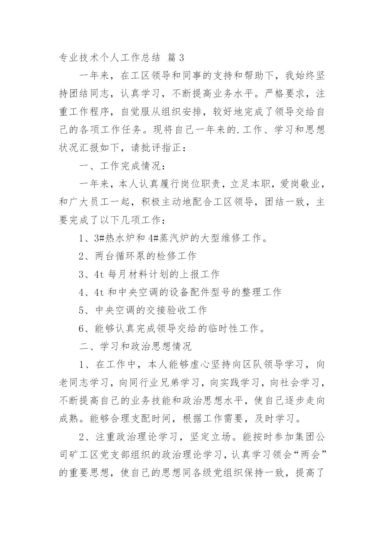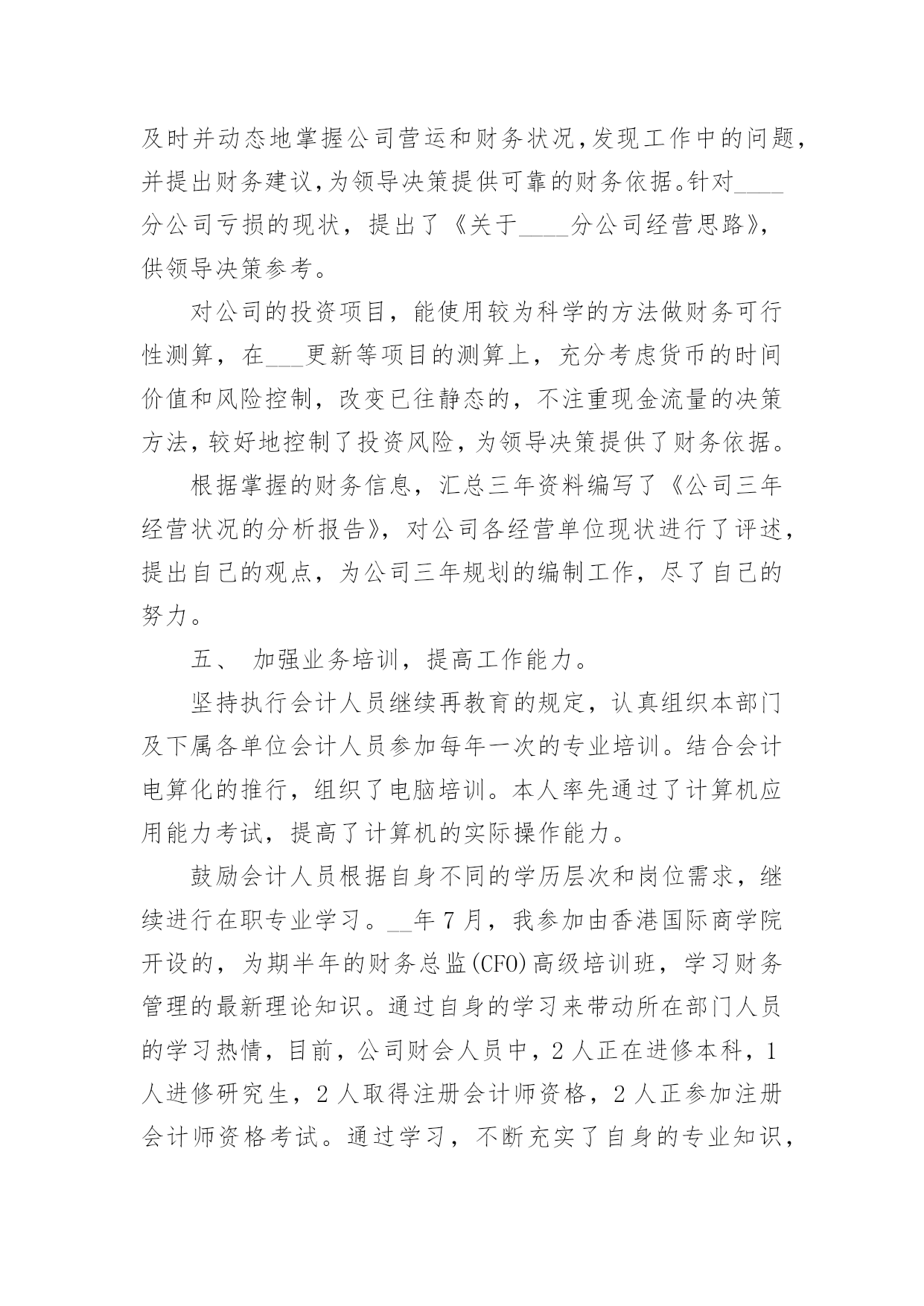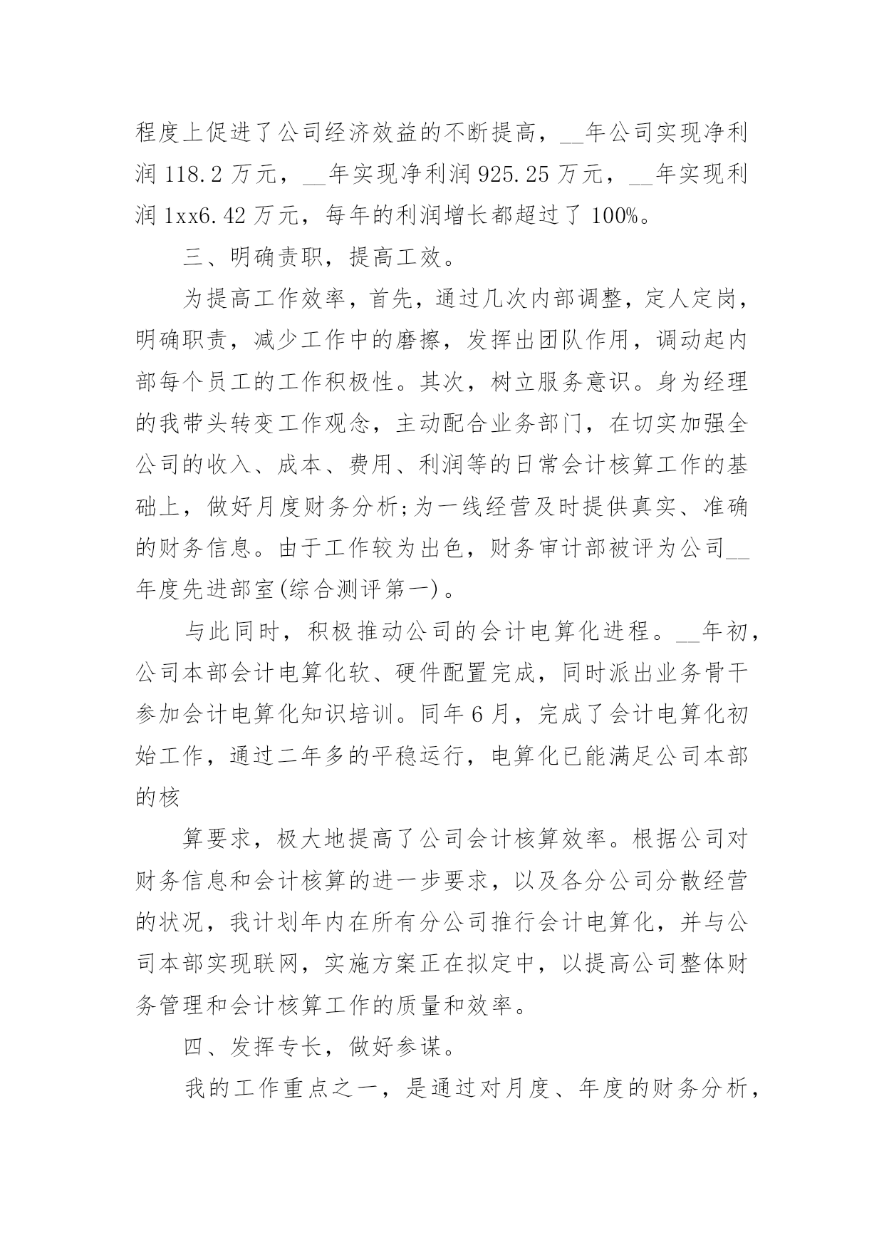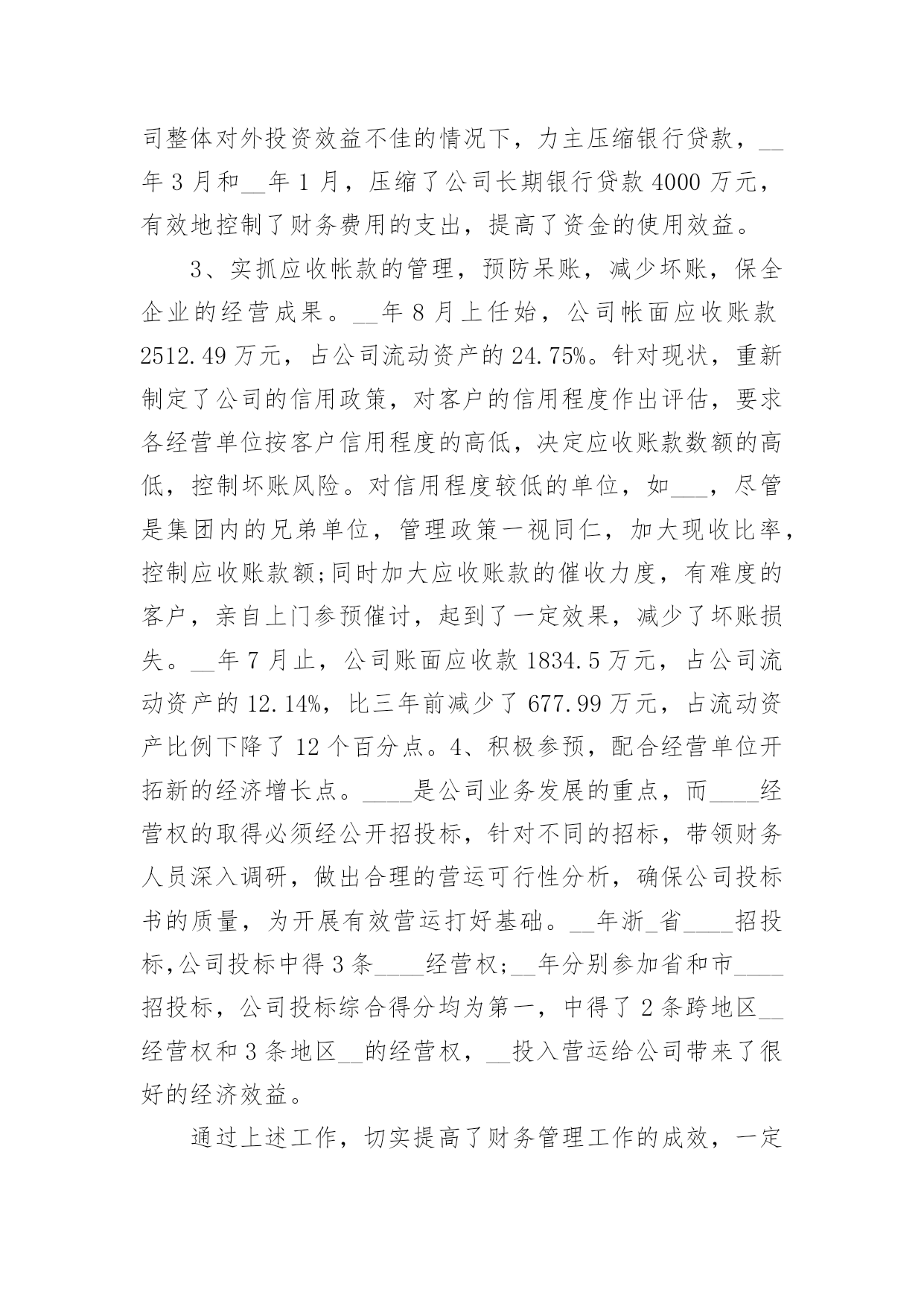 专业技术个人工作总结实用的专业技术个人工作总结八篇总结是对过去一定时期的工作、学习或思想情况进行回顾、分析,并做出客观评价的书面材料,它在我们的学习、工作中起到呈上启下的作用,让我们来为自己写一份总结吧。总结一般是怎么写的呢?下面是小编为大家整理的专业技术个人工作总结8篇,欢迎阅读,希望大家能够喜欢。专业技术个人工作总结篇1本人自____年5月,通过全国统考,取得会计师专业技术资格以来,单位和工作几经变动,96—97年8月,在中国_____公司财务处,具体负责所属__房产公司的财务管理和会计核算工作;97年9月,经省级机关公务员公开招考并被录用,进入浙_省__局财务审计处,从事所属企业的会计管理和审计工作;1999年取得注册会计师资格,期间被浙_的_会计师事务所聘用为特约审计人员;1999年9月初调入浙_省__集团有限责任公司财务部工作,__年8月始,本人受集团公司委派担任浙_的_____公司财务部经理。不同的工作经历,给了我很好的锻炼机会,丰富了我的阅历,开阔了我的眼界,并促使我不断努力学习,掌握最新的财务会计知识,以出色地完成所担负的工作。下面,我重点就最近三年担任浙_的_____公司财务审计部经理一职期间所形成工作思路及完成的工作,做业务总结。一、加强制度建设,拟定和完善公司财务管理和会计核算制度。加强企业的财务管理工作,其目的是要为企业的效益服务。浙_的_____公司,总资产超过4.2亿,下辖六家分公司,两家全资子公司,兼跨制造、房产、租赁、修理、客运服务、商贸等几个行业。各项业务的经营方式有所差异,会计处理各有特点。我在对公司营运情况及日常财务工作深入了解的基础上,认为当时的制度已不能很好适应公司管理上的需要。要想公司管理上台阶,首先应从制度上下功夫。因此,我从审批程序、资金运作、会计核算、审计监督几个方面入手,先后主持出台了四个制度,基本完善了财务管理内部制度体系1、拟定《浙_的_____公司开支审批暂行办法》,规范了审批权限和程序。要求公司所有成本、费用支出必须经财务审核并签字确认,改变了以往多头审批,财务监督不力的状况。经过两年的运行,_X_我又重新修订和完善了《浙_公司开支审批办法》,进一步明确了责权。2、根据国家新出台的财务、会计政策法规,结合本公司的经营特点和管理要求,执笔修订了《浙_的_____公司财务管理暂行办法》和《浙_的_____公司内部会计核算暂行办法》。并就“两个办法”的贯彻执行作了具体安排。每年对所属经营单位执行“办法”情况进行了检查,对存在的问题出具书面整改通知,逐步规范了公司财务管理和会计核算行为。3、为完善公司内部监督管理制度,充分发挥二级核算体制的优势,针对公司各经营单位不同的行业特性,确保公司各项会计数据的真实、完整,于__年6月重新起草了《浙_的_____公司内部审计暂行办法》,现正报公司审批,以切实加强对国有资产的监管。二、抓管理,促效益。预算是企业借以设定一定时期所想要完成的特定目标,完成目标所使用的资源,以及衡量目标是否达到的标准,是现代企业管理的一项重要工具。集团公司对预算管理也作为工作考核的一项重要内容。基于对预算管理工作重要性的认识,我积极推动公司预算管理工作,理清工作思绪,将应收帐款的回收及开辟公司新的经济增长点作为工作重点。以此为契机,逐渐转变了公司偏重会计核算,轻财务管理的局面,促进公司管理上台阶。1、重视预算编制的可行性和科学性。具体负责牵头编制了公司__年度、__年度和__年度的公司财务预算。在预算编制过程中,依据各经营单位近几年的实际经营情况,以及对未来市场经营环境变化的预测,充分考虑各种有利和不利因素,通过二上二下的协调沟通,汇总编制预算草案,报公司预算管理委员会通过,最终确定公司预算目标,确保各项预算指标的合理性。2、以预算为依据,积极控制成本、费用的支出,并在日常的财务管理中,倡导效益优先,注重现金流量、货币的时间价值和风险控制,充分发挥预算的目标作用,不断完善事前计划、事中控制、事后总结反馈的财务管理体系。在公司整体对外投资效益不佳的情况下,力主压缩银行贷款,__年3月和__年1月,压缩了公司长期银行贷款4000万元,有效地控制了财务费用的支出,提高了资金的使用效益。3、实抓应收帐款的管理,预防呆账,减少坏账,保全企业的经营成果。__年8月上任始,公司帐面应收账款2512.49万元,占公司流动资产的24.75%。针对现状,重新制定了公司的信用政策,对客户的信用程度作出评估,要求各经营单位按客户信用程度的高低,决定应收账款数额的高低,控制坏账风险。对信用程度较低的单位,如___,尽管是集团内的兄弟单位,管理政策一视同仁,加大现收比率,控制应收账款额;同时加大应收账款的催收力度,有难度的客户,亲自上门参预催讨,起到了一定效果,减少了坏账损失。__年