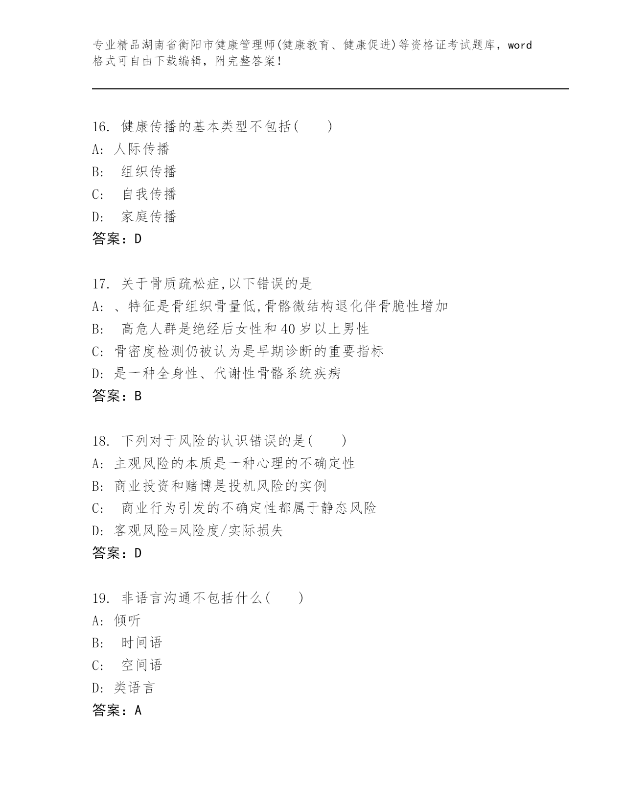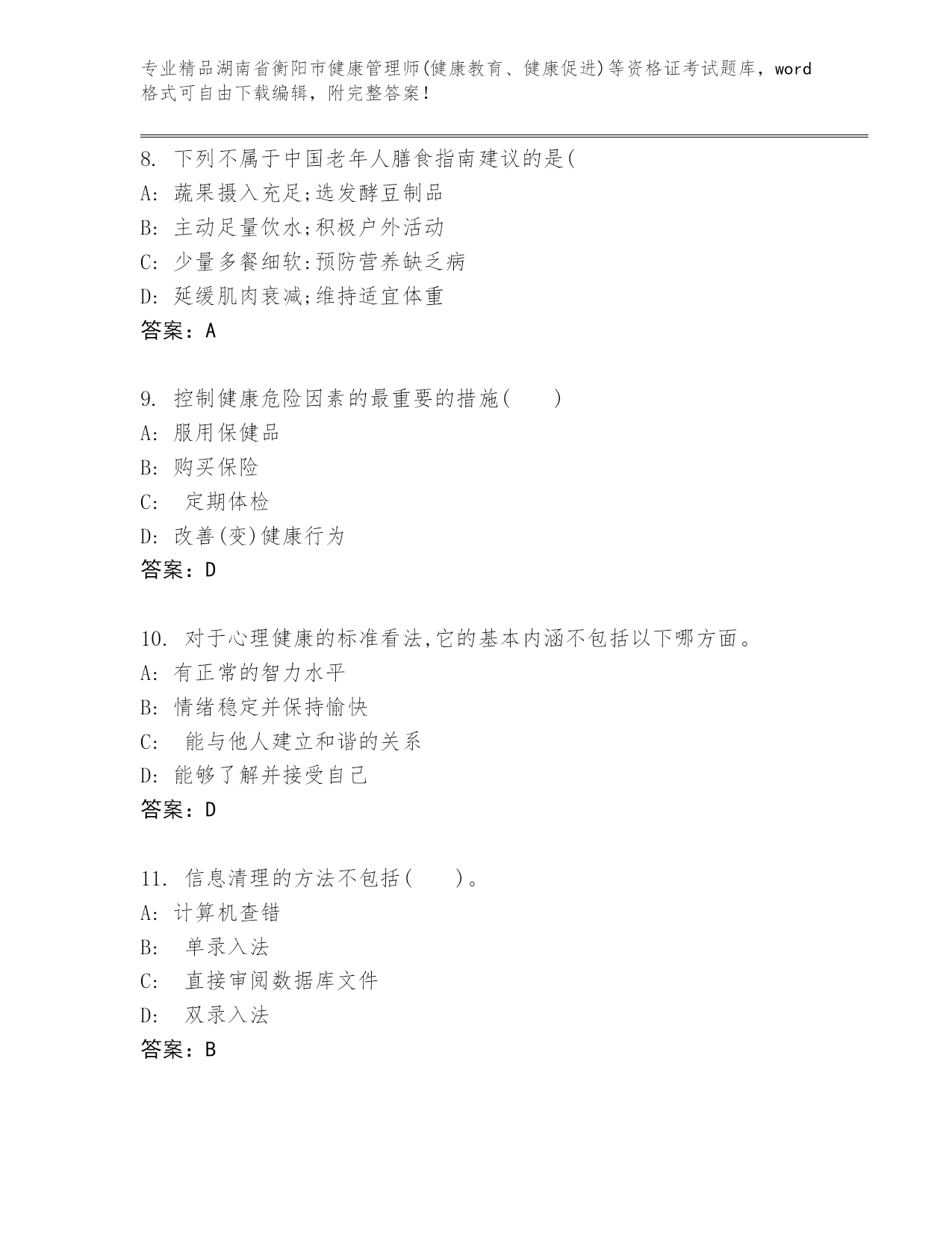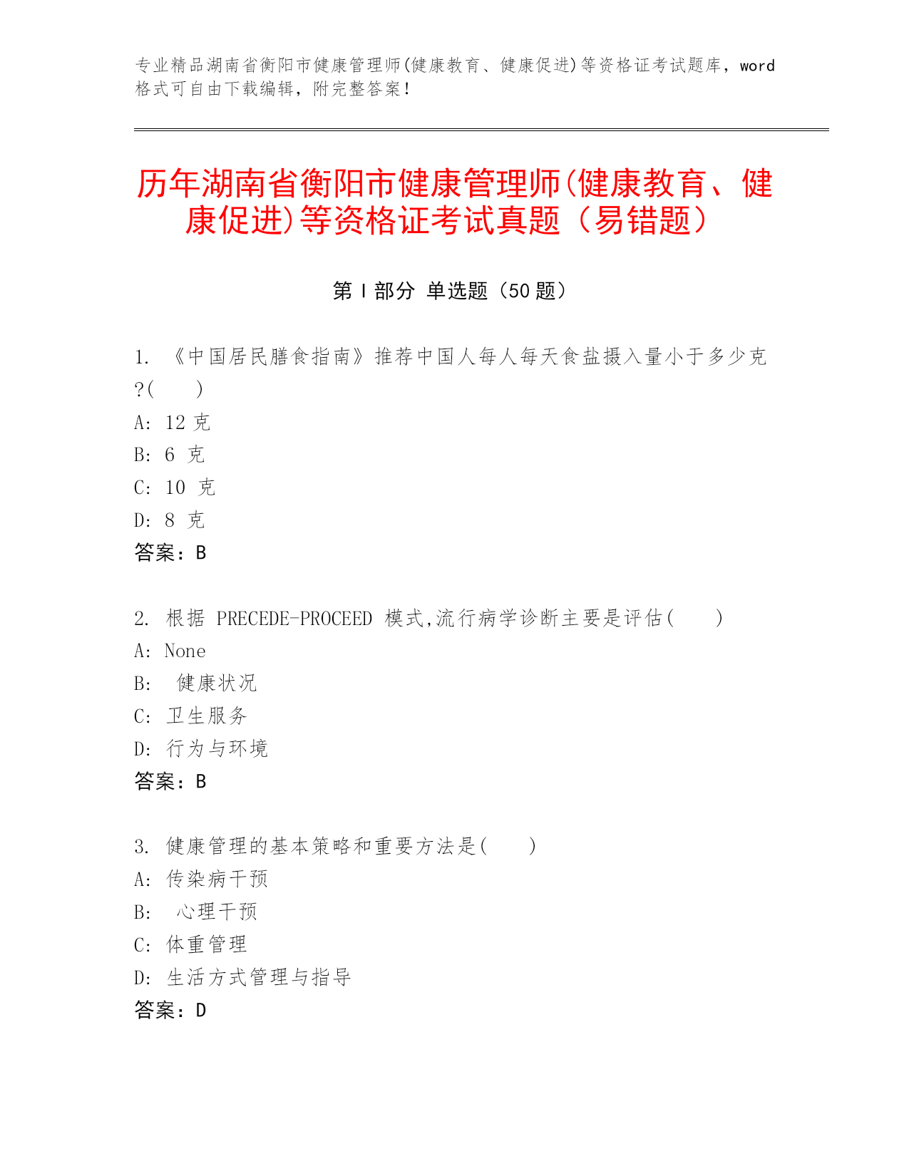 历年湖南省衡阳市健康管理师(健康教育、健康促进)等资格证考试真题(易错题).docx