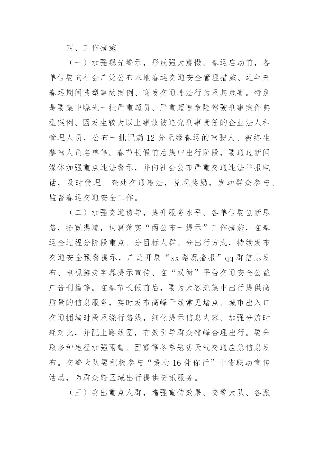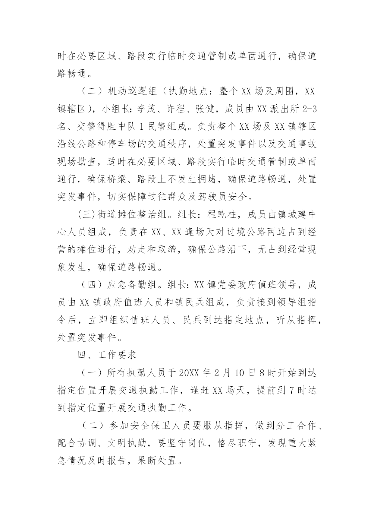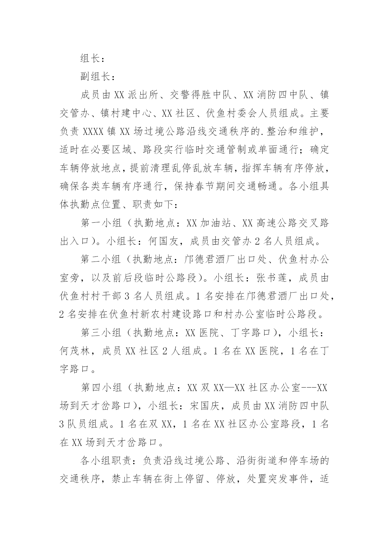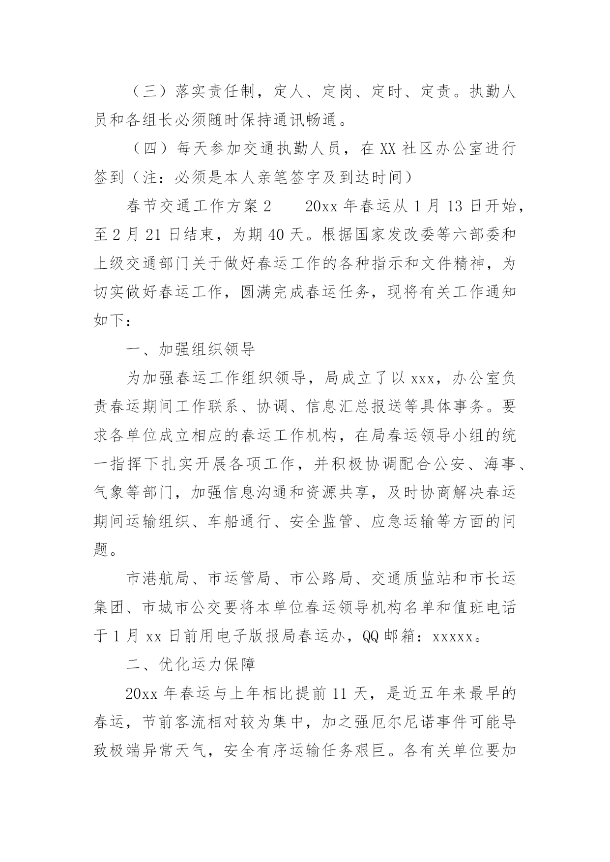 春节交通工作方案春节交通工作方案(精选6篇)有较强方向性是工作方案的特点之一。当计划开展某项工作时,我们需要先准备多份工作方案以供参考,你知道写工作方案需要注意哪些问题吗?下面是小编帮大家整理的春节交通工作方案(精选6篇),仅供参考,大家一起来看看吧。春节交通工作方案1XX年春节即将临近,随着社会市场经济的发展,现车辆的迅速增多,而XX镇XX过境场公路,历年来在过年过节期间都存在交通阻塞的情况,为确保春节期间交通畅通,保证群众及驾驶员人身安全,防止发生重特大交通事故,特制定本工作方案。一、组织领导XX镇党委政府成立周明海镇长为组长,副书记张焱、艾斌任副组长,XX派出所、交警得胜中队、XX消防四中队、镇交管办、镇村建中心、XX社区居委会、伏鱼村委会等相关部门主要负责人为成员的安全保卫领导组。办公室设在XX社区居委会办公室,由派出所李茂兼任办公室主任负责组织协调。二、执勤时间安排从20XX年2月X日至2月X日结束。三、执勤点人员安排及职责(一)交通秩序维护组组长:副组长:成员由XX派出所、交警得胜中队、XX消防四中队、镇交管办、镇村建中心、XX社区、伏鱼村委会人员组成。主要负责XXXX镇XX场过境公路沿线交通秩序的.整治和维护,适时在必要区域、路段实行临时交通管制或单面通行;确定车辆停放地点,提前清理乱停乱放车辆,指挥车辆有序停放,确保各类车辆有序通行,保持春节期间交通畅通。各小组具体执勤点位置、职责如下:第一小组(执勤地点:XX加油站、XX高速公路交叉路出入口)。小组长:何国友,成员由交管办2名人员组成。第二小组(执勤地点:邝德君酒厂出口处、伏鱼村办公室旁,以及前后段临时公路段)。小组长:张书莲,成员由伏鱼村村干部3名人员组成。1名安排在邝德君酒厂出口处,2名安排在伏鱼村新农村建设路口和村办公室临时公路段。第三小组(执勤地点:XX医院、丁字路口),小组长:何茂林,成员XX社区2人组成。1名在XX医院,1名在丁字路口。第四小组(执勤地点:XX双XX—XX社区办公室---XX场到天才岔路口),小组长:宋国庆,成员由XX消防四中队3队员组成。1名在双XX,1名在XX社区办公室路段,1名在XX场到天才岔路口。各小组职责:负责沿线过境公路、沿街街道和停车场的交通秩序,禁止车辆在街上停留、停放,处置突发事件,适时在必要区域、路段实行临时交通管制或单面通行,确保道路畅通。(二)机动巡逻组(执勤地点:整个XX场及周围,XX镇辖区),小组长:李茂、许程、张健,成员由XX派出所2-3名、交警得胜中队1民警组成。负责整个XX场及XX镇辖区沿线公路和停车场的交通秩序,处置突发事件以及交通事故现场勘查,适时在必要区域、路段实行临时交通管制或单面通行,确保桥梁、路段上不发生拥堵,确保道路畅通,处置突发事件,切实保障过往群众及驾驶员安全。(三)街道摊位整治组。组长:程乾柱,成员由镇城建中心人员组成,负责在XX、XX逢场天对过境公路两边占到经营的摊位进行,劝走和取缔,确保公路沿下,无占到经营现象发生,确保道路畅通。(四)应急备勤组。组长:XX镇党委政府值班领导,成员由XX镇政府值班人员和镇民兵组成,负责接到领导组指令后,立即组织值班人员、民兵到达指定地点,听从指挥,处置突发事件。四、工作要求(一)所有执勤人员于20XX年2月10日8时开始到达指定位置开展交通执勤工作,逢赶XX场天,提前到7时达到指定位置开展交通执勤工作。(二)参加安全保卫人员要服从指挥,做到分工合作、配合协调、文明执勤,要坚守岗位,恪尽职守,发现重大紧急情况及时报告,果断处置。(三)落实责任制,定人、定岗、定时、定责。执勤人员和各组长必须随时保持通讯畅通。(四)每天参加交通执勤人员,在XX社区办公室进行签到(注:必须是本人亲笔签字及到达时间)春节交通工作方案220xx年春运从1月13日开始,至2月21日结束,为期40天。根据国家发改委等六部委和上级交通部门关于做好春运工作的各种指示和文件精神,为切实做好春运工作,圆满完成春运任务,现将有关工作通知如下:一、加强组织领导为加强春运工作组织领导,局成立了以xxx,办公室负责春运期间工作联系、协调、信息汇总报送等具体事务。要求各单位成立相应的春运工作机构,在局春运领导小组的统一指挥下扎实开展各项工作,并积极协调配合公安、海事、气象等部门,加强信息沟通和资源共享,及时协商解决春运期间运输组织、车船通行、安全监管、应急运输等方面的问题。市港航局、市运管局、市公路局、交通质监站和市长运集团、市城市公交要将本单位春运领导机构名单和值班电话于1月xx日前用电子版报局春运办,QQ邮箱:xxxxx。二、优化运力保障20xx年春运与上年相比提前11天,是近五年来最早的春运,节前客流相对较为集中,加之强厄尔尼诺事件可能导致极端异常天气,安全有序运输任务艰巨。各有关