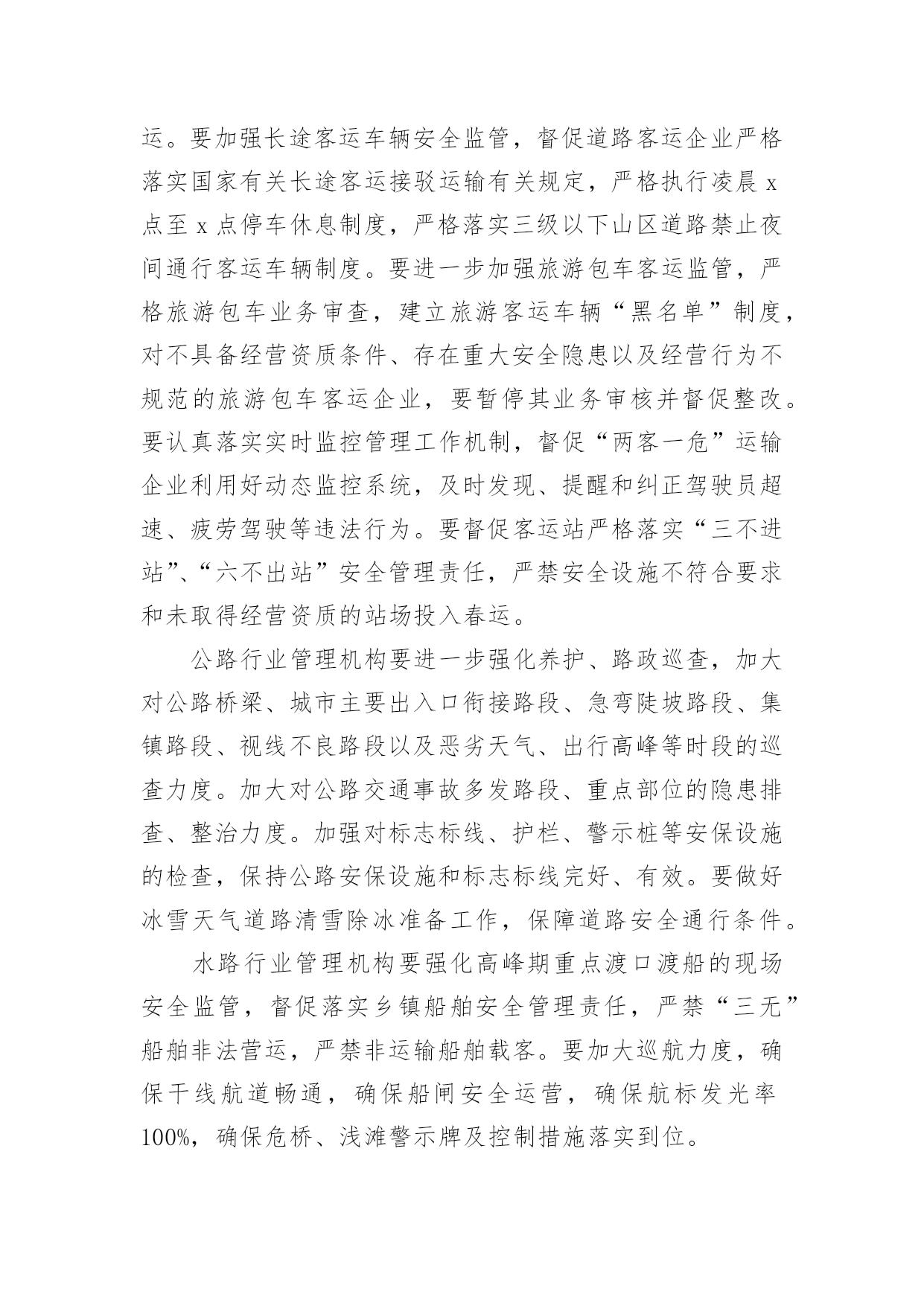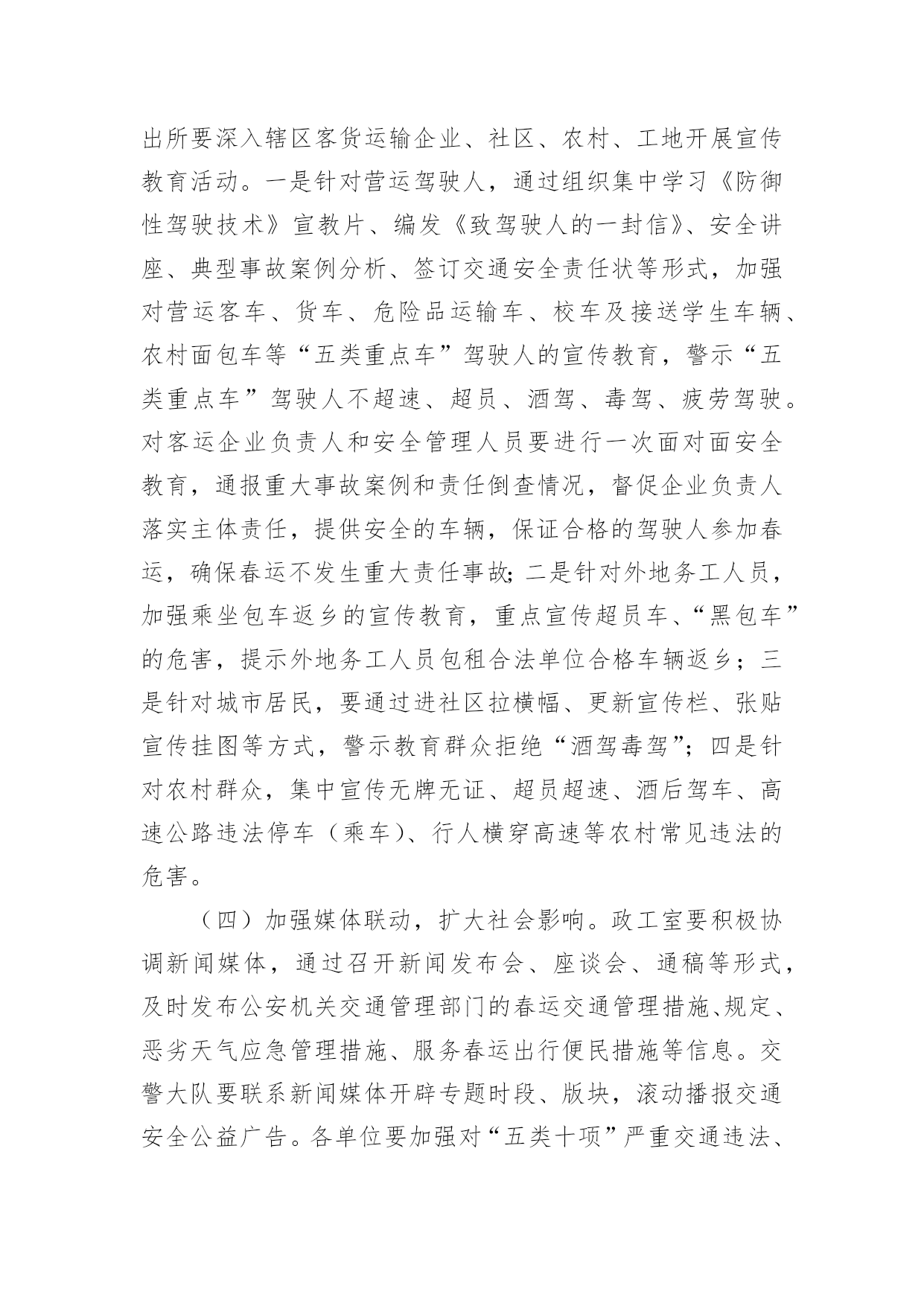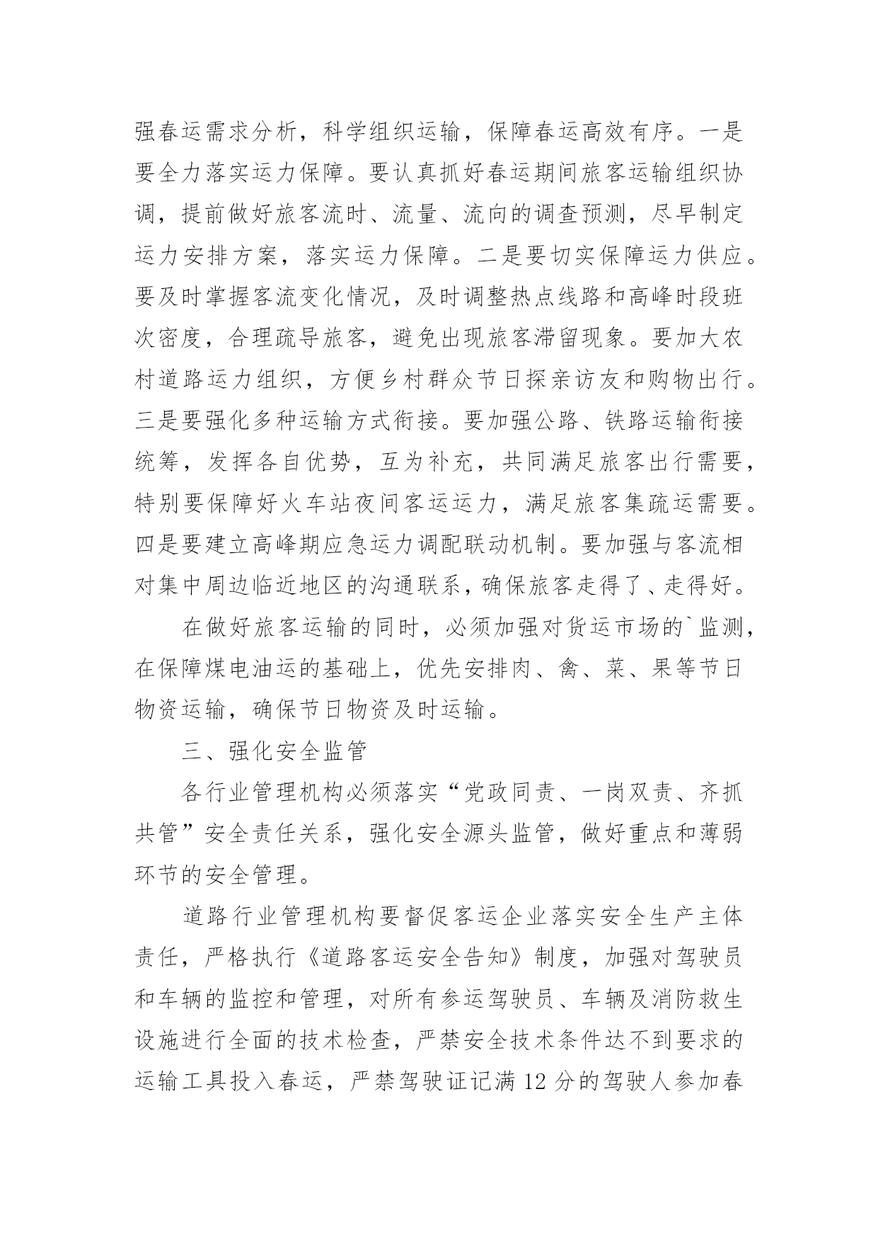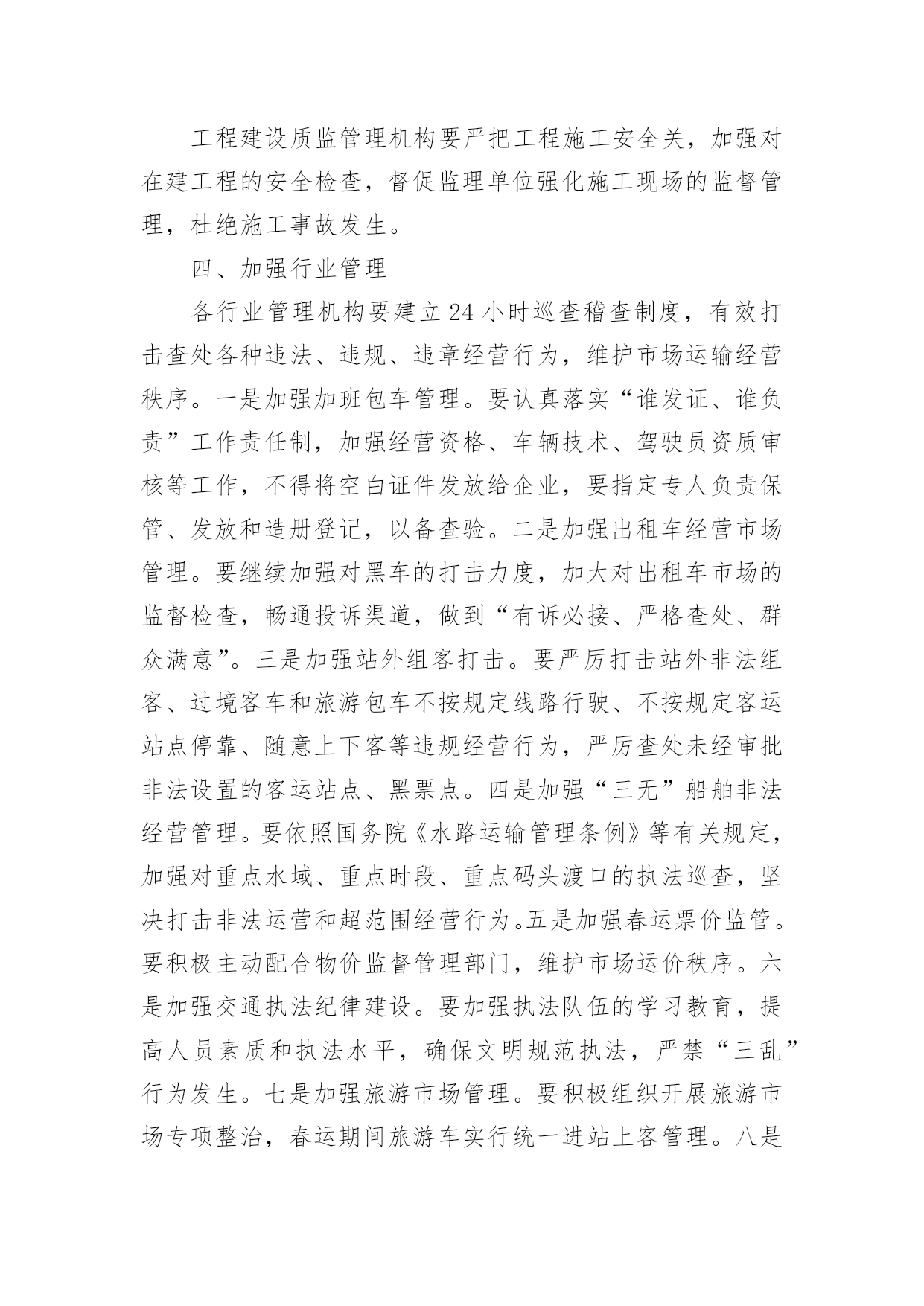 春节交通工作方案春节交通工作方案(精选6篇)有较强方向性是工作方案的特点之一。当计划开展某项工作时,我们需要先准备多份工作方案以供参考,你知道写工作方案需要注意哪些问题吗?下面是小编帮大家整理的春节交通工作方案(精选6篇),仅供参考,大家一起来看看吧。春节交通工作方案1XX年春节即将临近,随着社会市场经济的发展,现车辆的迅速增多,而XX镇XX过境场公路,历年来在过年过节期间都存在交通阻塞的情况,为确保春节期间交通畅通,保证群众及驾驶员人身安全,防止发生重特大交通事故,特制定本工作方案。一、组织领导XX镇党委政府成立周明海镇长为组长,副书记张焱、艾斌任副组长,XX派出所、交警得胜中队、XX消防四中队、镇交管办、镇村建中心、XX社区居委会、伏鱼村委会等相关部门主要负责人为成员的安全保卫领导组。办公室设在XX社区居委会办公室,由派出所李茂兼任办公室主任负责组织协调。二、执勤时间安排从20XX年2月X日至2月X日结束。三、执勤点人员安排及职责(一)交通秩序维护组组长:副组长:成员由XX派出所、交警得胜中队、XX消防四中队、镇交管办、镇村建中心、XX社区、伏鱼村委会人员组成。主要负责XXXX镇XX场过境公路沿线交通秩序的.整治和维护,适时在必要区域、路段实行临时交通管制或单面通行;确定车辆停放地点,提前清理乱停乱放车辆,指挥车辆有序停放,确保各类车辆有序通行,保持春节期间交通畅通。各小组具体执勤点位置、职责如下:第一小组(执勤地点:XX加油站、XX高速公路交叉路出入口)。小组长:何国友,成员由交管办2名人员组成。第二小组(执勤地点:邝德君酒厂出口处、伏鱼村办公室旁,以及前后段临时公路段)。小组长:张书莲,成员由伏鱼村村干部3名人员组成。1名安排在邝德君酒厂出口处,2名安排在伏鱼村新农村建设路口和村办公室临时公路段。第三小组(执勤地点:XX医院、丁字路口),小组长:何茂林,成员XX社区2人组成。1名在XX医院,1名在丁字路口。第四小组(执勤地点:XX双XX—XX社区办公室---XX场到天才岔路口),小组长:宋国庆,成员由XX消防四中队3队员组成。1名在双XX,1名在XX社区办公室路段,1名在XX场到天才岔路口。各小组职责:负责沿线过境公路、沿街街道和停车场的交通秩序,禁止车辆在街上停留、停放,处置突发事件,适时在必要区域、路段实行临时交通管制或单面通行,确保道路畅通。(二)机动巡逻组(执勤地点:整个XX场及周围,XX镇辖区),小组长:李茂、许程、张健,成员由XX派出所2-3名、交警得胜中队1民警组成。负责整个XX场及XX镇辖区沿线公路和停车场的交通秩序,处置突发事件以及交通事故现场勘查,适时在必要区域、路段实行临时交通管制或单面通行,确保桥梁、路段上不发生拥堵,确保道路畅通,处置突发事件,切实保障过往群众及驾驶员安全。(三)街道摊位整治组。组长:程乾柱,成员由镇城建中心人员组成,负责在XX、XX逢场天对过境公路两边占到经营的摊位进行,劝走和取缔,确保公路沿下,无占到经营现象发生,确保道路畅通。(四)应急备勤组。组长:XX镇党委政府值班领导,成员由XX镇政府值班人员和镇民兵组成,负责接到领导组指令后,立即组织值班人员、民兵到达指定地点,听从指挥,处置突发事件。四、工作要求(一)所有执勤人员于20XX年2月10日8时开始到达指定位置开展交通执勤工作,逢赶XX场天,提前到7时达到指定位置开展交通执勤工作。(二)参加安全保卫人员要服从指挥,做到分工合作、配合协调、文明执勤,要坚守岗位,恪尽职守,发现重大紧急情况及时报告,果断处置。(三)落实责任制,定人、定岗、定时、定责。执勤人员和各组长必须随时保持通讯畅通。(四)每天参加交通执勤人员,在XX社区办公室进行签到(注:必须是本人亲笔签字及到达时间)春节交通工作方案220xx年春运从1月13日开始,至2月21日结束,为期40天。根据国家发改委等六部委和上级交通部门关于做好春运工作的各种指示和文件精神,为切实做好春运工作,圆满完成春运任务,现将有关工作通知如下:一、加强组织领导为加强春运工作组织领导,局成立了以xxx,办公室负责春运期间工作联系、协调、信息汇总报送等具体事务。要求各单位成立相应的春运工作机构,在局春运领导小组的统一指挥下扎实开展各项工作,并积极协调配合公安、海事、气象等部门,加强信息沟通和资源共享,及时协商解决春运期间运输组织、车船通行、安全监管、应急运输等方面的问题。市港航局、市运管局、市公路局、交通质监站和市长运集团、市城市公交要将本单位春运领导机构名单和值班电话于1月xx日前用电子版报局春运办,QQ邮箱:xxxxx。二、优化运力保障20xx年春运与上年相比提前11天,是近五年来最早的春运,节前客流相对较为集中,加之强厄尔尼诺事件可能导致极端异常天气,安全有序运输任务艰巨。各有关
