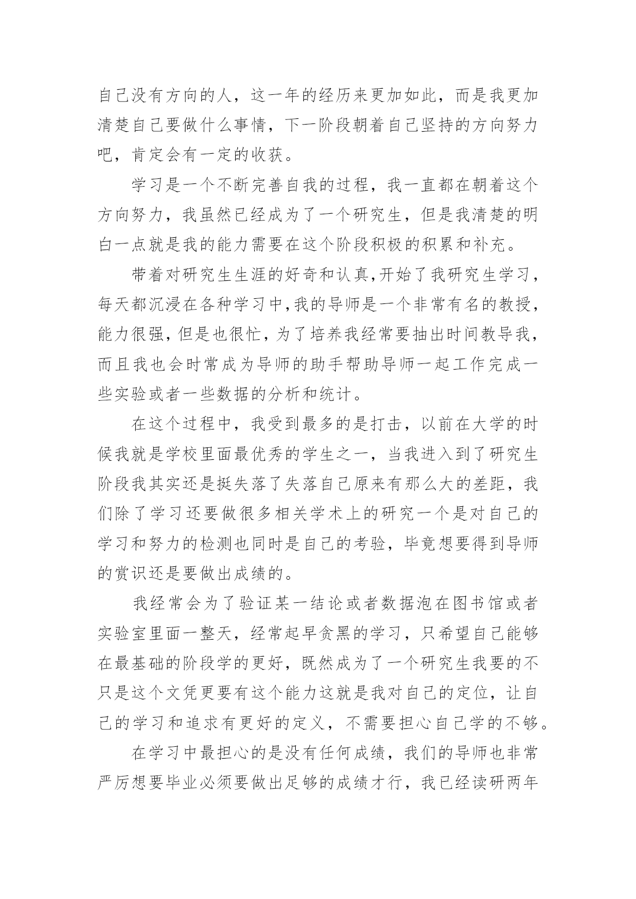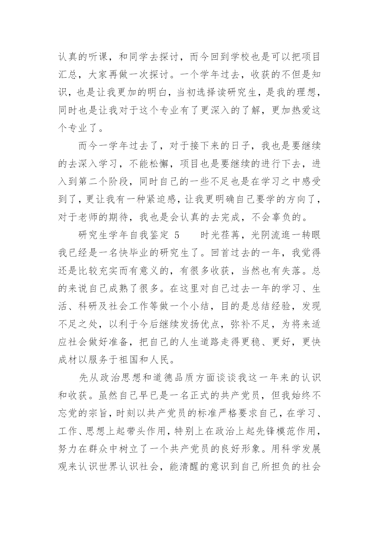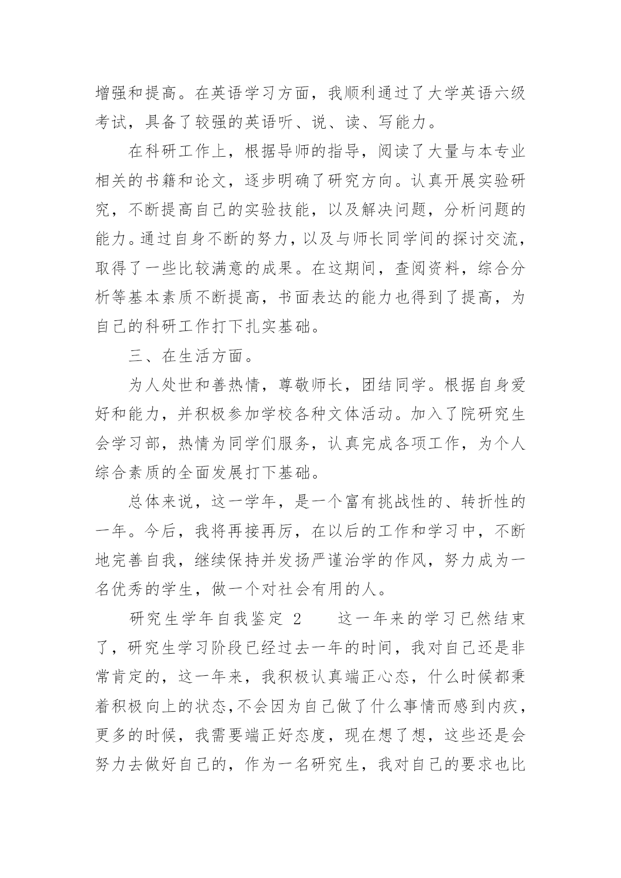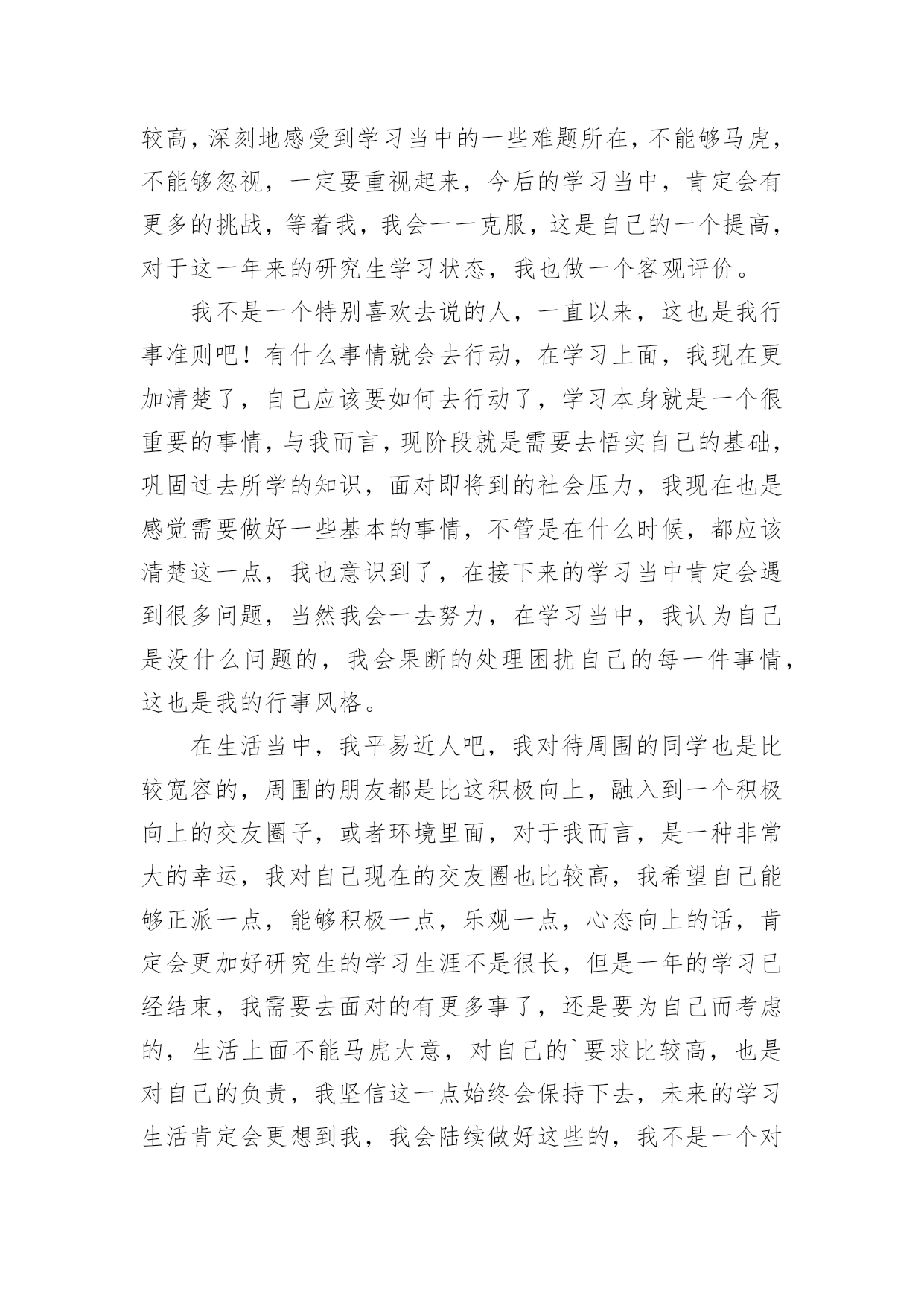 研究生学年自我鉴定研究生学年自我鉴定(精选20篇)自我鉴定是对自己的政治思想、工作业务、学习生活等方面情况进行评价与描述,自我鉴定可以让我们对自己有个正确的认知,因此我们是时候回头做好总结。你所见过的自我鉴定应该是什么样的?下面是小编帮大家整理的研究生学年自我鉴定,供大家参考借鉴,希望可以帮助到有需要的朋友。研究生学年自我鉴定1在过去的这一年里,我认真学习专业理论知识,积极参加各项活动,严格要求自己,在思想、学习、科研等方面都得到了充分的培养和锻炼。一、思想方面。努力学习政治理论知识,不断提高自己的思想政治觉悟,具有良好的道德品质和思想修养。积极拥护党和国家的各项路线、方针、政策,自觉遵守法律、法规和学校的各项规章制度。二、在学习方面。认真学习并完成各项专业课程。学习目的'明确,态度端正、学风良好,勤奋学习,刻苦钻研。根据自身研究方向的要求,有针对性的认真研读了有关核心课程,认真阅读教材、查阅学术资料和参考书籍,在课堂上吸收各个知识点。积极参加学校组织的学术讲座。课外之余,参与了导师相关课题的研究,使自己的理论知识与实践水平得到了进一步的增强和提高。在英语学习方面,我顺利通过了大学英语六级考试,具备了较强的英语听、说、读、写能力。在科研工作上,根据导师的指导,阅读了大量与本专业相关的书籍和论文,逐步明确了研究方向。认真开展实验研究,不断提高自己的实验技能,以及解决问题,分析问题的能力。通过自身不断的努力,以及与师长同学间的探讨交流,取得了一些比较满意的成果。在这期间,查阅资料,综合分析等基本素质不断提高,书面表达的能力也得到了提高,为自己的科研工作打下扎实基础。三、在生活方面。为人处世和善热情,尊敬师长,团结同学。根据自身爱好和能力,并积极参加学校各种文体活动。加入了院研究生会学习部,热情为同学们服务,认真完成各项工作,为个人综合素质的全面发展打下基础。总体来说,这一学年,是一个富有挑战性的、转折性的一年。今后,我将再接再厉,在以后的工作和学习中,不断地完善自我,继续保持并发扬严谨治学的作风,努力成为一名优秀的学生,做一个对社会有用的人。研究生学年自我鉴定2这一年来的学习已然结束了,研究生学习阶段已经过去一年的时间,我对自己还是非常肯定的,这一年来,我积极认真端正心态,什么时候都秉着积极向上的状态,不会因为自己做了什么事情而感到内疚,更多的时候,我需要端正好态度,现在想了想,这些还是会努力去做好自己的,作为一名研究生,我对自己的要求也比较高,深刻地感受到学习当中的一些难题所在,不能够马虎,不能够忽视,一定要重视起来,今后的学习当中,肯定会有更多的挑战,等着我,我会一一克服,这是自己的一个提高,对于这一年来的研究生学习状态,我也做一个客观评价。我不是一个特别喜欢去说的人,一直以来,这也是我行事准则吧!有什么事情就会去行动,在学习上面,我现在更加清楚了,自己应该要如何去行动了,学习本身就是一个很重要的事情,与我而言,现阶段就是需要去悟实自己的基础,巩固过去所学的知识,面对即将到的社会压力,我现在也是感觉需要做好一些基本的事情,不管是在什么时候,都应该清楚这一点,我也意识到了,在接下来的学习当中肯定会遇到很多问题,当然我会一去努力,在学习当中,我认为自己是没什么问题的,我会果断的处理困扰自己的每一件事情,这也是我的行事风格。在生活当中,我平易近人吧,我对待周围的同学也是比较宽容的,周围的朋友都是比这积极向上,融入到一个积极向上的交友圈子,或者环境里面,对于我而言,是一种非常大的幸运,我对自己现在的交友圈也比较高,我希望自己能够正派一点,能够积极一点,乐观一点,心态向上的话,肯定会更加好研究生的学习生涯不是很长,但是一年的学习已经结束,我需要去面对的有更多事了,还是要为自己而考虑的,生活上面不能马虎大意,对自己的`要求比较高,也是对自己的负责,我坚信这一点始终会保持下去,未来的学习生活肯定会更想到我,我会陆续做好这些的,我不是一个对自己没有方向的人,这一年的经历来更加如此,而是我更加清楚自己要做什么事情,下一阶段朝着自己坚持的方向努力吧,肯定会有一定的收获。学习是一个不断完善自我的过程,我一直都在朝着这个方向努力,我虽然已经成为了一个研究生,但是我清楚的明白一点就是我的能力需要在这个阶段积极的积累和补充。带着对研究生生涯的好奇和认真,开始了我研究生学习,每天都沉浸在各种学习中,我的导师是一个非常有名的教授,能力很强,但是也很忙,为了培养我经常要抽出时间教导我,而且我也会时常成为导师的助手帮助导师一起工作完成一些实验或者一些数据的分析和统计。在这个过程中,我受到最多的是打击,以前在大学的时候我就是学校里面最优秀的学生之一,当我进入到了研究生阶段我其实还是挺失落了失落自己原来有那么大的差距,我们除了学习还要做很多相关学术上的研究一个是