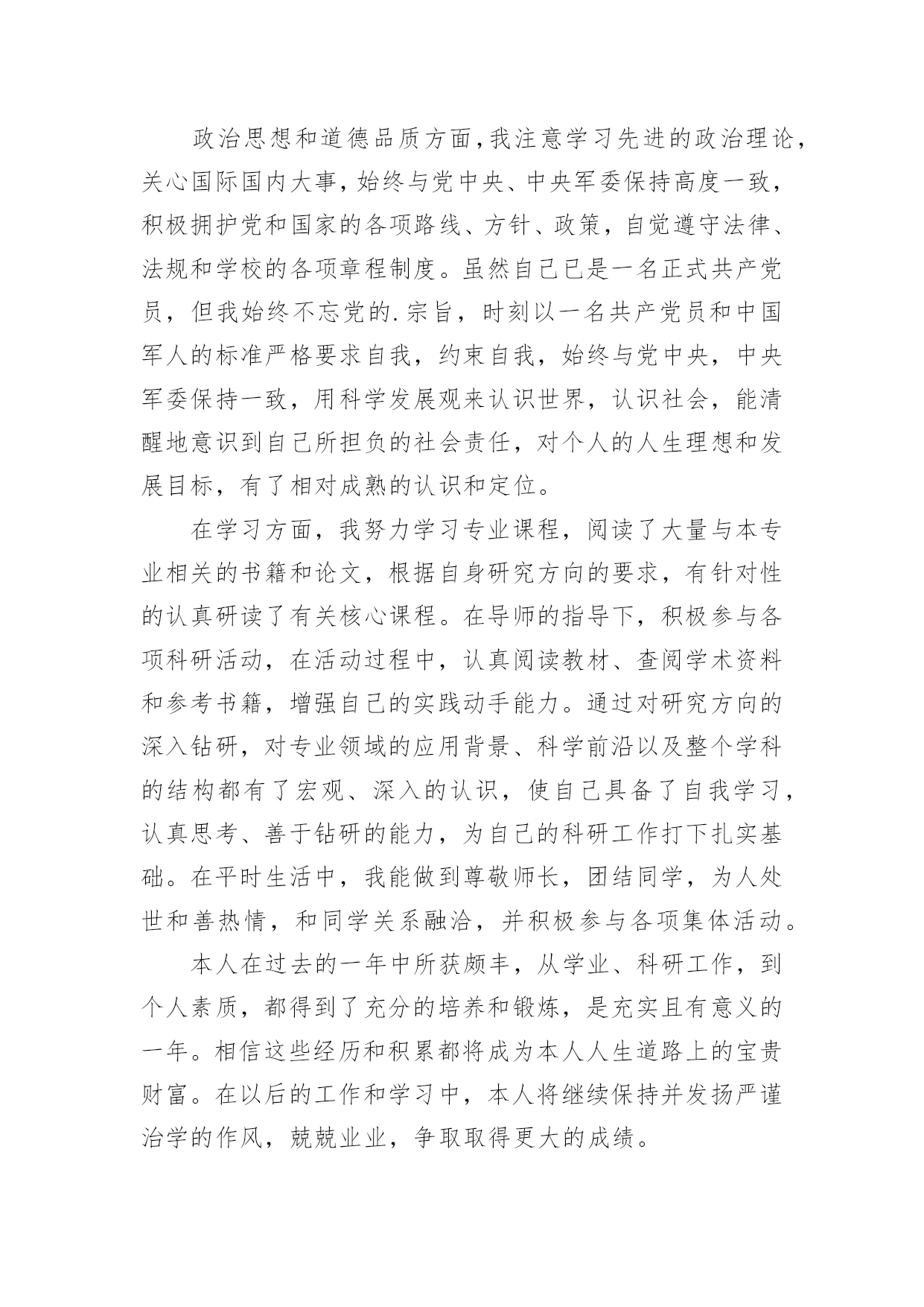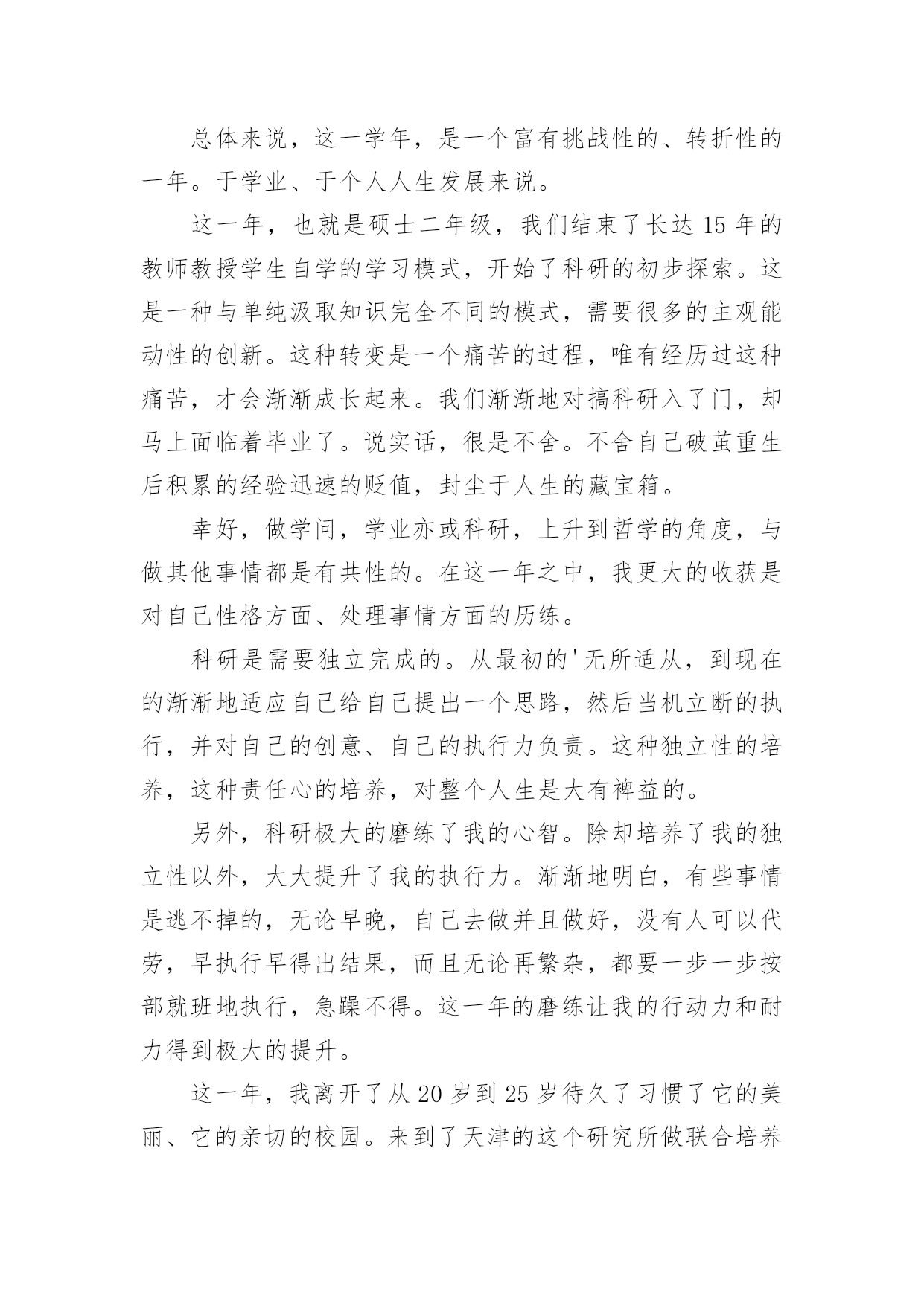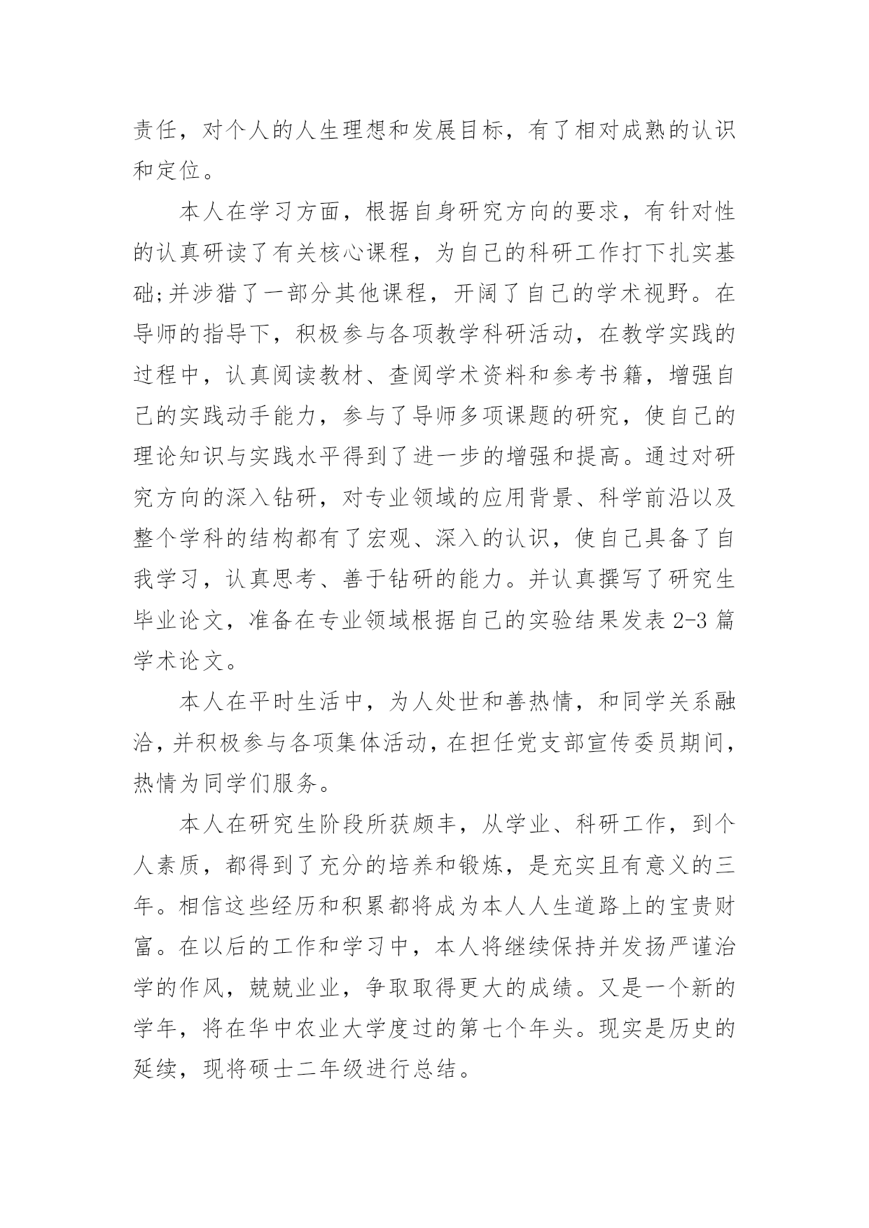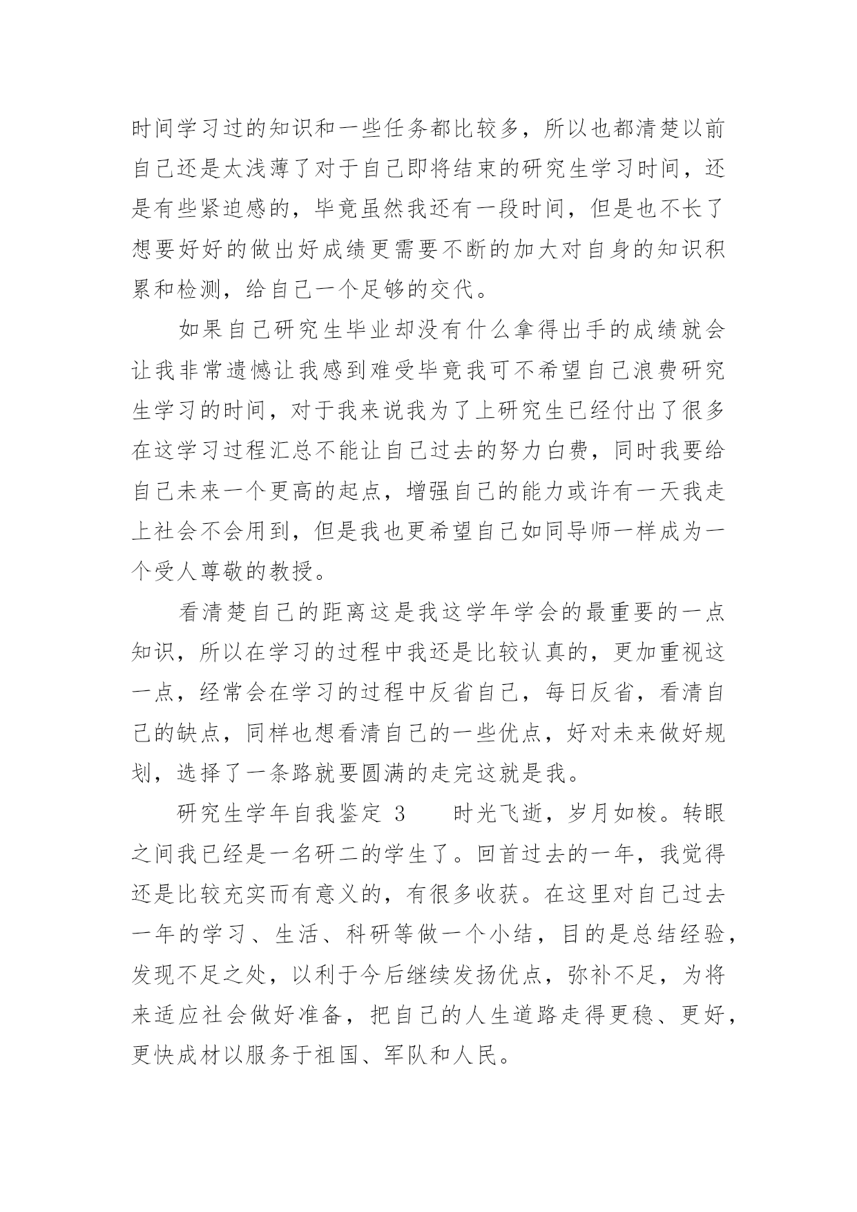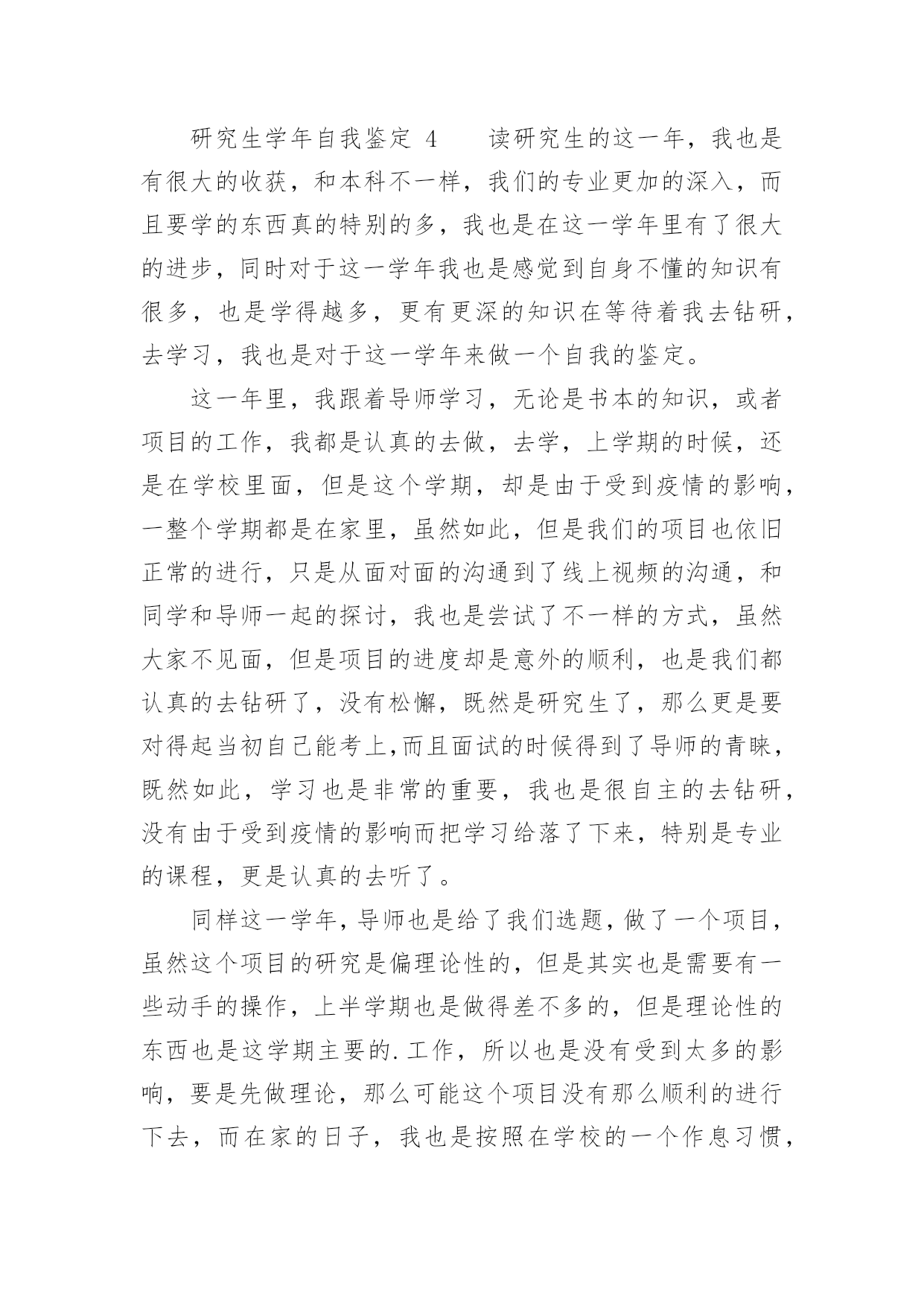 研究生学年自我鉴定研究生学年自我鉴定(精选20篇)自我鉴定是对自己的政治思想、工作业务、学习生活等方面情况进行评价与描述,自我鉴定可以让我们对自己有个正确的认知,因此我们是时候回头做好总结。你所见过的自我鉴定应该是什么样的?下面是小编帮大家整理的研究生学年自我鉴定,供大家参考借鉴,希望可以帮助到有需要的朋友。研究生学年自我鉴定1在过去的这一年里,我认真学习专业理论知识,积极参加各项活动,严格要求自己,在思想、学习、科研等方面都得到了充分的培养和锻炼。一、思想方面。努力学习政治理论知识,不断提高自己的思想政治觉悟,具有良好的道德品质和思想修养。积极拥护党和国家的各项路线、方针、政策,自觉遵守法律、法规和学校的各项规章制度。二、在学习方面。认真学习并完成各项专业课程。学习目的'明确,态度端正、学风良好,勤奋学习,刻苦钻研。根据自身研究方向的要求,有针对性的认真研读了有关核心课程,认真阅读教材、查阅学术资料和参考书籍,在课堂上吸收各个知识点。积极参加学校组织的学术讲座。课外之余,参与了导师相关课题的研究,使自己的理论知识与实践水平得到了进一步的增强和提高。在英语学习方面,我顺利通过了大学英语六级考试,具备了较强的英语听、说、读、写能力。在科研工作上,根据导师的指导,阅读了大量与本专业相关的书籍和论文,逐步明确了研究方向。认真开展实验研究,不断提高自己的实验技能,以及解决问题,分析问题的能力。通过自身不断的努力,以及与师长同学间的探讨交流,取得了一些比较满意的成果。在这期间,查阅资料,综合分析等基本素质不断提高,书面表达的能力也得到了提高,为自己的科研工作打下扎实基础。三、在生活方面。为人处世和善热情,尊敬师长,团结同学。根据自身爱好和能力,并积极参加学校各种文体活动。加入了院研究生会学习部,热情为同学们服务,认真完成各项工作,为个人综合素质的全面发展打下基础。总体来说,这一学年,是一个富有挑战性的、转折性的一年。今后,我将再接再厉,在以后的工作和学习中,不断地完善自我,继续保持并发扬严谨治学的作风,努力成为一名优秀的学生,做一个对社会有用的人。研究生学年自我鉴定2这一年来的学习已然结束了,研究生学习阶段已经过去一年的时间,我对自己还是非常肯定的,这一年来,我积极认真端正心态,什么时候都秉着积极向上的状态,不会因为自己做了什么事情而感到内疚,更多的时候,我需要端正好态度,现在想了想,这些还是会努力去做好自己的,作为一名研究生,我对自己的要求也比较高,深刻地感受到学习当中的一些难题所在,不能够马虎,不能够忽视,一定要重视起来,今后的学习当中,肯定会有更多的挑战,等着我,我会一一克服,这是自己的一个提高,对于这一年来的研究生学习状态,我也做一个客观评价。我不是一个特别喜欢去说的人,一直以来,这也是我行事准则吧!有什么事情就会去行动,在学习上面,我现在更加清楚了,自己应该要如何去行动了,学习本身就是一个很重要的事情,与我而言,现阶段就是需要去悟实自己的基础,巩固过去所学的知识,面对即将到的社会压力,我现在也是感觉需要做好一些基本的事情,不管是在什么时候,都应该清楚这一点,我也意识到了,在接下来的学习当中肯定会遇到很多问题,当然我会一去努力,在学习当中,我认为自己是没什么问题的,我会果断的处理困扰自己的每一件事情,这也是我的行事风格。在生活当中,我平易近人吧,我对待周围的同学也是比较宽容的,周围的朋友都是比这积极向上,融入到一个积极向上的交友圈子,或者环境里面,对于我而言,是一种非常大的幸运,我对自己现在的交友圈也比较高,我希望自己能够正派一点,能够积极一点,乐观一点,心态向上的话,肯定会更加好研究生的学习生涯不是很长,但是一年的学习已经结束,我需要去面对的有更多事了,还是要为自己而考虑的,生活上面不能马虎大意,对自己的`要求比较高,也是对自己的负责,我坚信这一点始终会保持下去,未来的学习生活肯定会更想到我,我会陆续做好这些的,我不是一个对自己没有方向的人,这一年的经历来更加如此,而是我更加清楚自己要做什么事情,下一阶段朝着自己坚持的方向努力吧,肯定会有一定的收获。学习是一个不断完善自我的过程,我一直都在朝着这个方向努力,我虽然已经成为了一个研究生,但是我清楚的明白一点就是我的能力需要在这个阶段积极的积累和补充。带着对研究生生涯的好奇和认真,开始了我研究生学习,每天都沉浸在各种学习中,我的导师是一个非常有名的教授,能力很强,但是也很忙,为了培养我经常要抽出时间教导我,而且我也会时常成为导师的助手帮助导师一起工作完成一些实验或者一些数据的分析和统计。在这个过程中,我受到最多的是打击,以前在大学的时候我就是学校里面最优秀的学生之一,当我进入到了研究生阶段我其实还是挺失落了失落自己原来有那么大的差距,我们除了学习还要做很多相关学术上的研究一个是