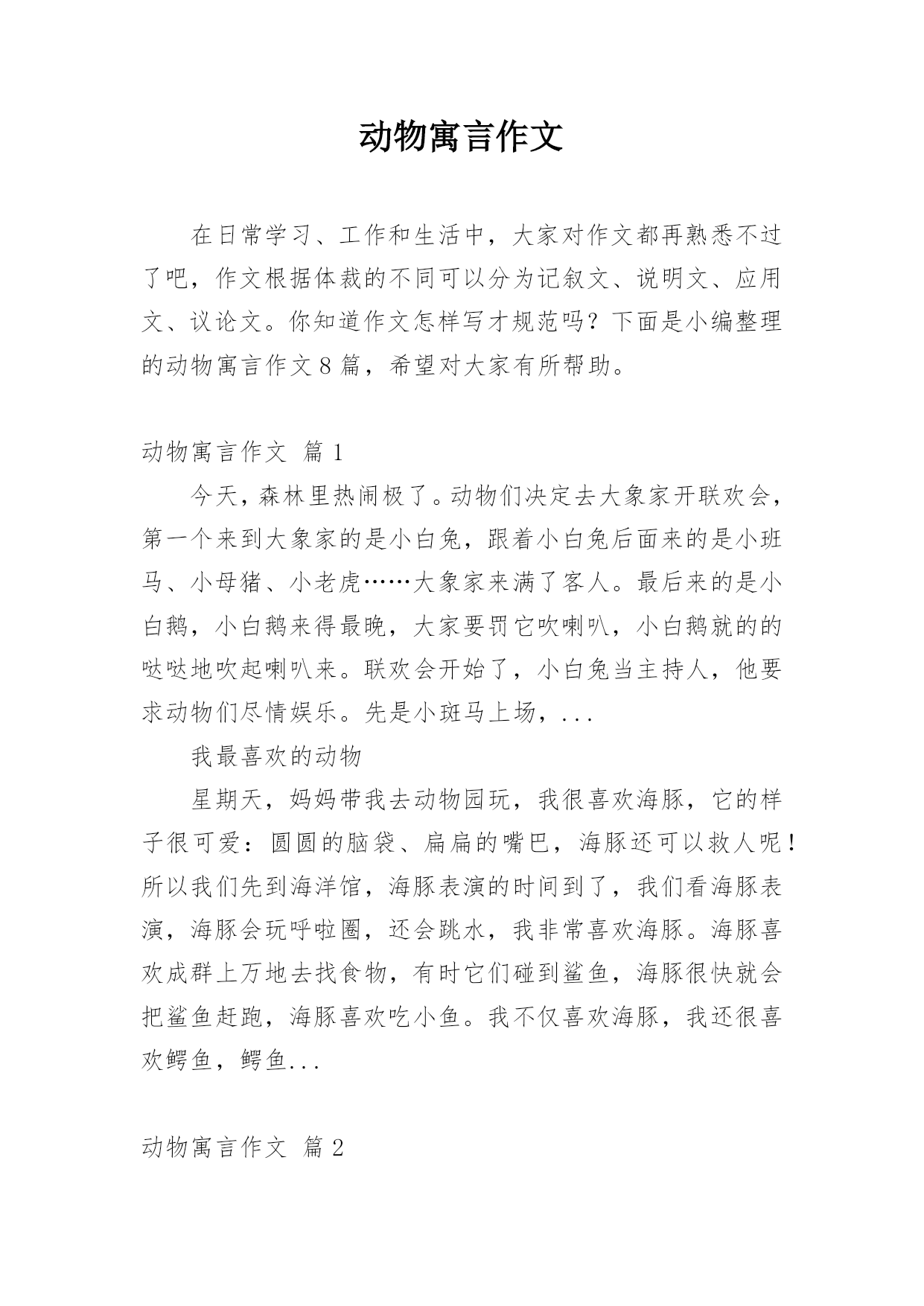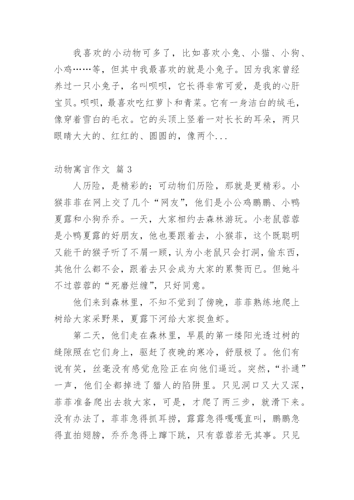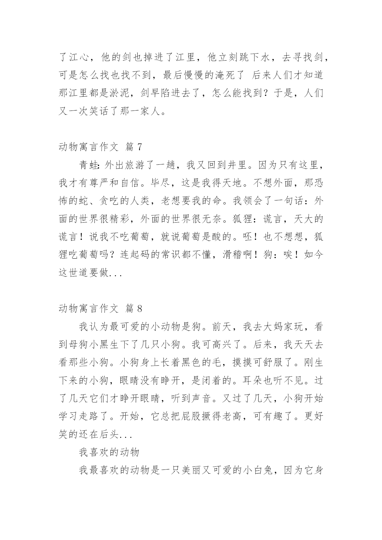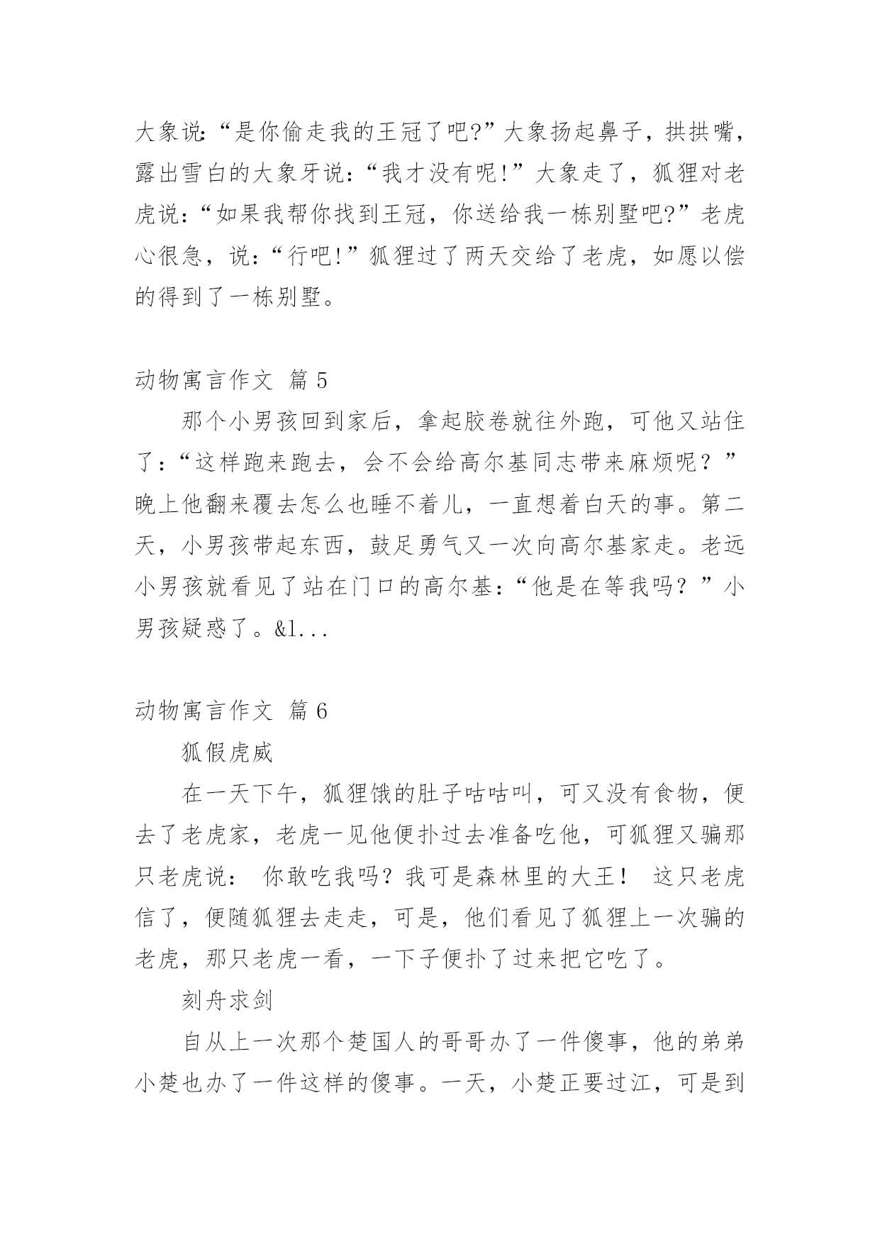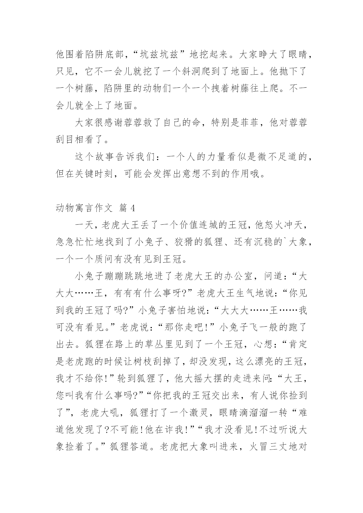 动物寓言作文在日常学习、工作和生活中,大家对作文都再熟悉不过了吧,作文根据体裁的不同可以分为记叙文、说明文、应用文、议论文。你知道作文怎样写才规范吗?下面是小编整理的动物寓言作文8篇,希望对大家有所帮助。动物寓言作文篇1今天,森林里热闹极了。动物们决定去大象家开联欢会,第一个来到大象家的是小白兔,跟着小白兔后面来的是小班马、小母猪、小老虎……大象家来满了客人。最后来的是小白鹅,小白鹅来得最晚,大家要罚它吹喇叭,小白鹅就的的哒哒地吹起喇叭来。联欢会开始了,小白兔当主持人,他要求动物们尽情娱乐。先是小斑马上场,...我最喜欢的动物星期天,妈妈带我去动物园玩,我很喜欢海豚,它的样子很可爱:圆圆的脑袋、扁扁的嘴巴,海豚还可以救人呢!所以我们先到海洋馆,海豚表演的时间到了,我们看海豚表演,海豚会玩呼啦圈,还会跳水,我非常喜欢海豚。海豚喜欢成群上万地去找食物,有时它们碰到鲨鱼,海豚很快就会把鲨鱼赶跑,海豚喜欢吃小鱼。我不仅喜欢海豚,我还很喜欢鳄鱼,鳄鱼...动物寓言作文篇2我喜欢的小动物可多了,比如喜欢小兔、小猫、小狗、小鸡……等,但其中我最喜欢的就是小兔子。因为我家曾经养过一只小兔子,名叫呗呗,它长得非常可爱,是我的心肝宝贝。呗呗,最喜欢吃红萝卜和青菜。它有一身洁白的绒毛,像穿着雪白的毛衣。它的头顶上竖着一对长长的耳朵,两只眼睛大大的、红红的、圆圆的,像两个...动物寓言作文篇3人历险,是精彩的;可动物们历险,那就是更精彩。小猴菲菲在网上交了几个“网友”,他们是小公鸡鹏鹏、小鸭夏露和小狗乔乔。一天,大家相约去森林游玩。小老鼠蓉蓉是小鸭夏露的好朋友,他也要跟着去,小猴菲,这个既聪明又能干的猴子听了不屑一顾,认为小老鼠只会打洞,偷东西,其他什么都不会,跟着去只会成为大家的累赘而已。但她斗不过蓉蓉的“死磨烂缠”,只好同意。他们来到森林里,不知不觉到了傍晚,菲菲熟练地爬上树给大家采野果,夏露下河给大家捉鱼虾。第二天,他们走在森林里,早晨的第一缕阳光透过树的缝隙照在它们身上,驱赶了夜晚的寒冷,舒服极了。他们有说有笑,丝毫没有感觉危险正在向他们逼近。突然,“扑通”一声,他们全都掉进了猎人的陷阱里。只见洞口又大又深,菲菲准备爬出去救大家,可是,才爬了两三步,就滑下来。没有办法了,菲菲急得抓耳捞,露露急得嘎嘎直叫,鹏鹏急得直拍翅膀,乔乔急得上蹿下跳,只有蓉蓉若无其事。只见他围着陷阱底部,“坑兹坑兹”地挖起来。大家睁大了眼睛,只见,它不一会儿就挖了一个斜洞爬到了地面上。他抛下了一个树藤,陷阱里的动物们一个一个拽着树藤往上爬。不一会儿就全上了地面。大家很感谢蓉蓉救了自己的命,特别是菲菲,他对蓉蓉刮目相看了。这个故事告诉我们:一个人的力量看似是微不足道的,但在关键时刻,可能会发挥出意想不到的作用哦。动物寓言作文篇4一天,老虎大王丢了一个价值连城的王冠,他怒火冲天,急急忙忙地找到了小兔子、狡猾的狐狸、还有沉稳的`大象,一个一个质问有没有见到王冠。小兔子蹦蹦跳跳地进了老虎大王的办公室,问道:“大大大……王,有有有什么事呀?”老虎大王生气地说:“你见到我的王冠了吗?”小兔子害怕地说:“大大大……王……我可没有看见。”老虎说:“那你走吧!”小兔子飞一般的跑了出去。狐狸在路上的草丛里见到了一个王冠,心想:“肯定是老虎跑的时候让树枝刮掉了,却没发现,这么漂亮的王冠,我才不给你!”轮到狐狸了,他大摇大摆的走进来问:“大王,您叫我有什么事吗?”“你把我的王冠交出来,有人说你捡到了”,老虎大吼,狐狸打了一个激灵,眼睛滴溜溜一转“难道他发现了?不可能!他在诈我!”“我才没看见!不过听说大象捡着了。”狐狸答道。老虎把大象叫进来,火冒三丈地对大象说:“是你偷走我的王冠了吧?”大象扬起鼻子,拱拱嘴,露出雪白的大象牙说:“我才没有呢!”大象走了,狐狸对老虎说:“如果我帮你找到王冠,你送给我一栋别墅吧?”老虎心很急,说:“行吧!”狐狸过了两天交给了老虎,如愿以偿的得到了一栋别墅。动物寓言作文篇5那个小男孩回到家后,拿起胶卷就往外跑,可他又站住了:“这样跑来跑去,会不会给高尔基同志带来麻烦呢?”晚上他翻来覆去怎么也睡不着儿,一直想着白天的事。第二天,小男孩带起东西,鼓足勇气又一次向高尔基家走。老远小男孩就看见了站在门口的高尔基:“他是在等我吗?”小男孩疑惑了。&l...动物寓言作文篇6狐假虎威在一天下午,狐狸饿的肚子咕咕叫,可又没有食物,便去了老虎家,老虎一见他便扑过去准备吃他,可狐狸又骗那只老虎说:你敢吃我吗?我可是森林里的大王!这只老虎信了,便随狐狸去走走,可是,他们看见了狐狸上一次骗的老虎,那只老虎一看,一下子便扑了过来把它吃了。刻舟求剑自从上一次那个楚国人的哥哥办了一件傻事,他的弟弟小楚也办了一件这样的傻事。一天,小楚正要过江,可是到了江心,他的剑也掉进了江里,他立刻跳下水,去