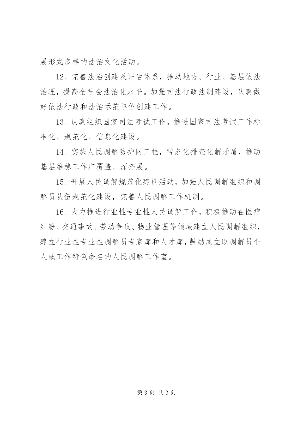 第PAGE\*Arabic\*MERGEFORMAT3页共NUMPAGES\*MERGEFORMAT3页市司法局工作计划范文模板**年,全市司法行政工作总体要求是,贯彻落实党的十八大和全省司法行政工作会议、全市政法工作会议精神,坚持以党委政府工作大局为重,以最广大人民利益为念,落实维护社会和谐稳定硬任务,强化服务经济发展、服务和保障民生,加强平安建设、队伍建设、基层基础建设,推进法治化统领发展、信息化牵引发展、一体化集成发展、社会化创新发展,努力实现争先进位,为我市冲刺全省第一方阵,建设美好**创造安全稳定的社会环境、公平正义的法治环境和优质高效的服务环境。一、坚持以法治为统领,着力提升监狱工作水平1、贯彻法治统领、安全为先、规范管理、协调发展监狱工作理念,完善一个党委、两个法人新型监狱运行管理体制,推进监狱规范管理常态化,确保监狱安全稳定。2、牢固树立监管安全首位意识,进一步完善五项机制和四道防线,全面推行民警首问责任制。加强狱情分析研判和狱内侦查工作,深入开展安全隐患排查整治,加强现场管理,狠抓制度落实。3、建立完善以指挥中心为中枢、以信息化为手段、以应急防暴队伍为支撑的监狱警务模式,提高安全防范水平和应急处置能力。4、扎实开展教育质量年活动,完善511模式,建立质量评估、行为矫治、循证矫正和个别教育相融合的教育改造体系。5、加强出监教育和技能培训,组织进监帮教活动。探索罪犯保障政策与社会保障体系对接的有效途径,争取将服刑人员纳入社会医疗保障范围有实质性进展,打造科学化引领、专业化保障、信息化支撑、社会化协同、制度化推进教育改造特色。6、完善执法管理、执法责任、执法监督体系,规范执法流程和标准。建立刑罚执行协调机制,依法办理减刑、假释、保外就医,加大暂予监外执行力度。7、落实重点罪犯管控措施,依法保障罪犯的基本权力。扎实开展推标创建活动,深化标准化监区和会见室文明窗口建设,提升监狱形象。二、坚持创新社会管理,着力推进平安**建设8、认真落实xx普法规划和法治**建设纲要,开展深化lsquo;法律六进rsquo;、推进依法治市法制宣传教育主题活动,组织xx普法规划中期督查。9、丰富法制宣传教育形式和内容,突出菜单式、互动型普法,探索研究式、体验型学法用法新途径,推动法制宣传教育从普及知识向培育思维、从活动式向常态化转变。10、突出重点对象学法用法工作,提高领导干部运用法治思维和法治方式能力,推动全社会学法尊法守法用法。11、加强法治文化建设,创新活动载体,加强阵地建设,开展形式多样的法治文化活动。12、完善法治创建及评估体系,推动地方、行业、基层依法治理,提高全社会法治化水平。加强司法行政法制建设,认真做好依法行政和法治示范单位创建工作。13、认真组织国家司法考试工作,推进国家司法考试工作标准化、规范化、信息化建设。14、实施人民调解防护网工程,常态化排查化解矛盾,推动基层维稳工作广覆盖、深拓展。15、开展人民调解规范化建设活动,加强人民调解组织和调解员队伍规范化建设,完善人民调解工作机制。16、大力推进行业性专业性人民调解工作,积极推动在医疗纠纷、交通事故、劳动争议、物业管理等领域建立人民调解组织,建立行业性专业性调解员专家库和人才库,鼓励成立以调解员个人或工作特色命名的人民调解工作室。