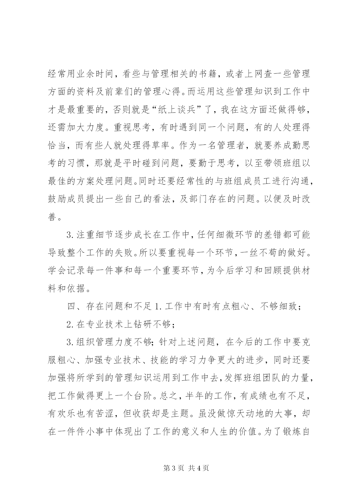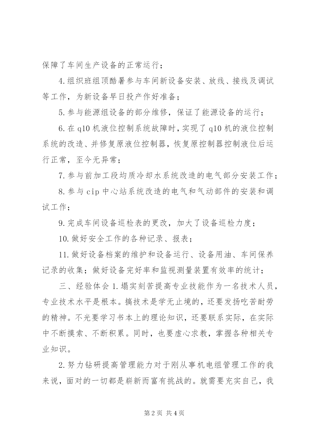 第PAGE\*Arabic\*MERGEFORMAT4页共NUMPAGES\*MERGEFORMAT4页机电设备负责人述职报告时光飞逝,转眼间从配电室调出来工作已近半年。在这半年里,我在厂部和科室的正确领导和关心支持下,本着积极的工作态度和热情的服务精神,一边尽己所能的工作,一边虚心的学习新知识。为机电组和科室做了一些实实在在的事情,取得了一定的成绩。但还存在一些不足,有待提高和改进。一、工作内容我的工作内容大致分为机电组工作和设备科科室工作。机电组工作:1.组织班组成员做好车间设备的巡检、维护和维修工作;2.参与巡检和重点维护、维修工作;3.负责机电组和变配电室的现场规范和管理;科室工作:1.安全工作:填写安全检查记录、安全整改记录、安全月报表、安全季报表;2.质量工作:整理维护设备档案资料;收集整理冰机、锅炉、变配电运行记录、设备用油记录和车间设备保养记录;统计设备完好率和监视测量装置有效率;3.完成领导安排的其他工作;二、主要成绩1.在机电组规范了个人用品的摆放,如:茶杯、工作鞋等;2.公用工具、备品备件和资料等实行专人分管整理;3.组织机电组成员及时完成车间设备的巡检、维护和维修,保障了车间生产设备的正常运行;4.组织班组顶酷暑参与车间新设备安装、放线、接线及调试等工作,为新设备早日投产作好准备;5.参与能源组设备的部分维修,保证了能源设备的运行;6.在q10机液位控制系统故障时,实现了q10机的液位控制系统的改造、并修复原液位控制器,恢复原控制器控制液位后运行正常,至今无异常;7.参与前加工段均质冷却水系统改造的电气部分安装工作;8.参与cip中心站系统改造的电气和气动部件的安装和调试工作;9.完成车间设备巡检表的更改,加大了设备巡检力度;10.做好安全工作的各种记录、报表;11.做好设备档案的维护和设备运行、设备用油、车间保养记录的收集;做好设备完好率和监视测量装置有效率的统计;三、经验体会1.塌实刻苦提高专业技能作为一名技术人员,专业技术水平是根本。搞技术是学无止境的,还要发扬吃苦耐劳的精神。不光要学习书本上的理论知识,还要联系实际,在实际中不断摸索、不断积累。同时,也要虚心求教,掌握各种相关专业知识。2.努力钻研提高管理能力对于刚从事机电组管理工作的我来说,面对的一切都是崭新而富有挑战的。就需要充实自己,我经常用业余时间,看些与管理相关的书籍,或者上网查一些管理方面的资料及前辈们的管理心得。而运用这些管理知识到工作中才是最重要的,否则就是“纸上谈兵”了,我在这方面还做得够,还需加大力度。重视思考,有时遇到同一个问题,有的人处理得恰当,而有些人就处理得草率。作为一名管理者,就要养成勤思考的习惯,那就是平时碰到问题,要勤于思考,以至带领班组以最佳的方案处理问题。同时还要经常性的与班组成员工进行沟通,鼓励成员提出一些自己的看法,及部门存在的问题。以便及时改善。3.注重细节逐步成长在工作中,任何细微环节的差错都可能导致整个工作的失败。所以要重视每一个环节,一丝不苟的做好。学会记录每一件事和每一个重要环节,为今后学习和回顾提供材料和依据。四、存在问题和不足1.工作中有时有点粗心、不够细致;2.在专业技术上钻研不够;3.组织管理力度不够;针对上述问题,在今后的工作中要克服粗心、加强专业技术、技能的学习力争更大的进步,同时还要加强将所学到的管理知识运用到工作中去,发挥班组团队的力量,把工作做得更上一个台阶。总之,半年的工作,有成绩也有不足,有欢乐也有苦涩,但收获却是主题。虽没做惊天动地的大事,却在一件件小事中体现出了工作的意义和人生的价值。为了锻炼自我、成长成材。在今后的工作中,我会更加勤奋工作,不断完善自己,提高自己。