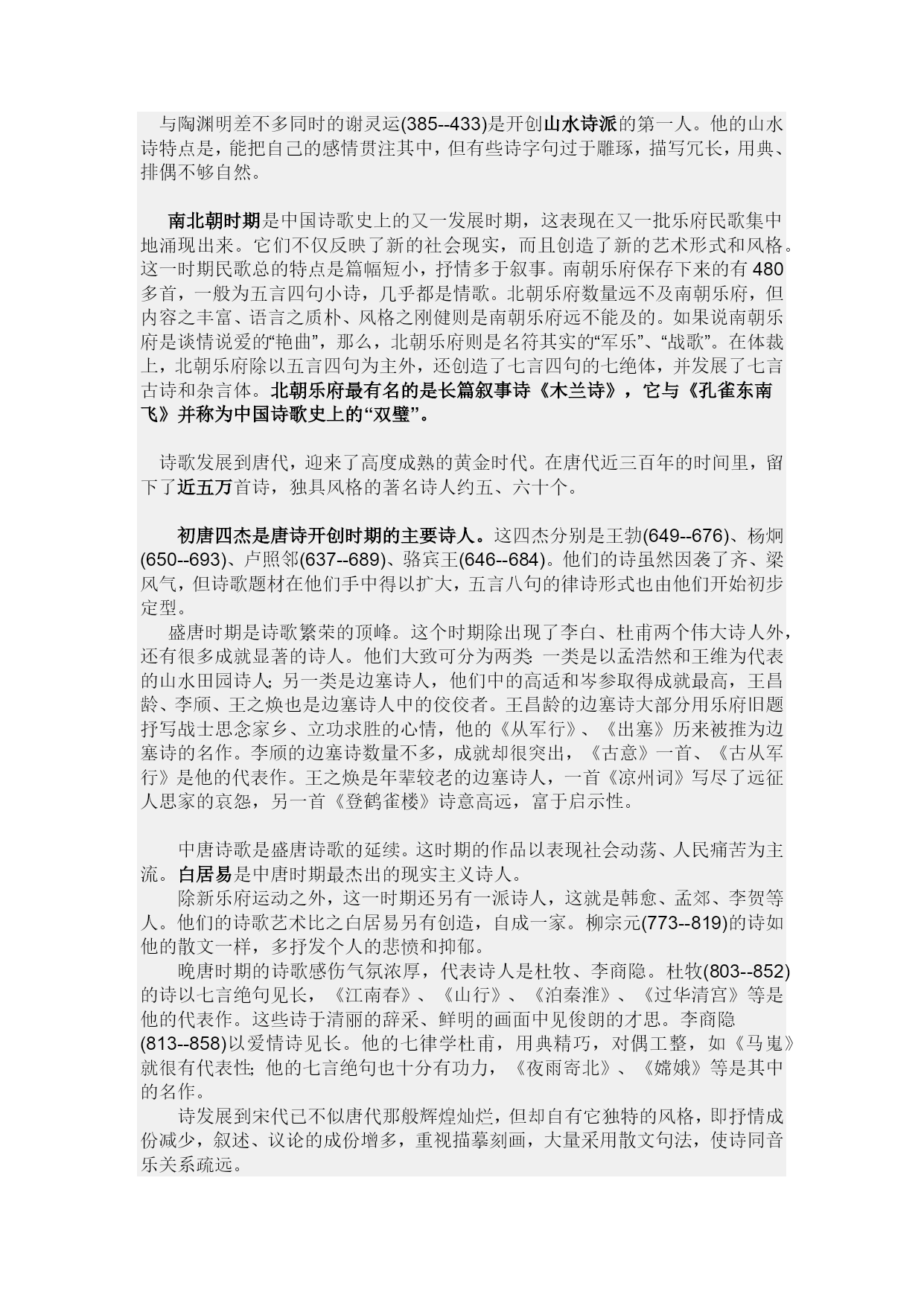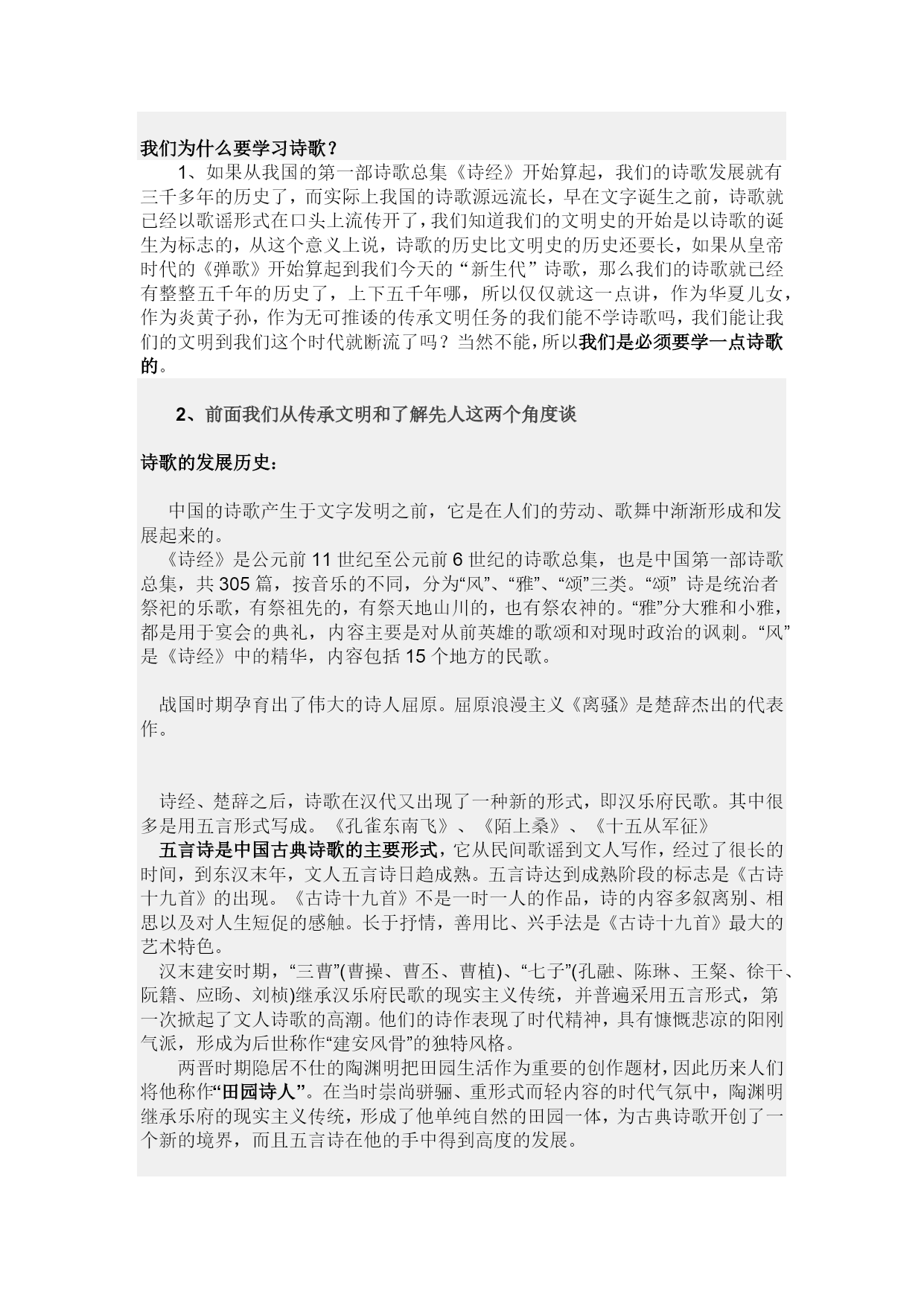 我们为什么要学习诗歌?1、如果从我国的第一部诗歌总集《诗经》开始算起,我们的诗歌发展就有三千多年的历史了,而实际上我国的诗歌源远流长,早在文字诞生之前,诗歌就已经以歌谣形式在口头上流传开了,我们知道我们的文明史的开始是以诗歌的诞生为标志的,从这个意义上说,诗歌的历史比文明史的历史还要长,如果从皇帝时代的《弹歌》开始算起到我们今天的“新生代”诗歌,那么我们的诗歌就已经有整整五千年的历史了,上下五千年哪,所以仅仅就这一点讲,作为华夏儿女,作为炎黄子孙,作为无可推诿的传承文明任务的我们能不学诗歌吗,我们能让我们的文明到我们这个时代就断流了吗?当然不能,所以我们是必须要学一点诗歌的。2、前面我们从传承文明和了解先人这两个角度谈诗歌的发展历史:中国的诗歌产生于文字发明之前,它是在人们的劳动、歌舞中渐渐形成和发展起来的。《诗经》是公元前11世纪至公元前6世纪的诗歌总集,也是中国第一部诗歌总集,共305篇,按音乐的不同,分为“风”、“雅”、“颂”三类。“颂”诗是统治者祭祀的乐歌,有祭祖先的,有祭天地山川的,也有祭农神的。“雅”分大雅和小雅,都是用于宴会的典礼,内容主要是对从前英雄的歌颂和对现时政治的讽刺。“风”是《诗经》中的精华,内容包括15个地方的民歌。战国时期孕育出了伟大的诗人屈原。屈原浪漫主义《离骚》是楚辞杰出的代表作。诗经、楚辞之后,诗歌在汉代又出现了一种新的形式,即汉乐府民歌。其中很多是用五言形式写成。《孔雀东南飞》、《陌上桑》、《十五从军征》五言诗是中国古典诗歌的主要形式,它从民间歌谣到文人写作,经过了很长的时间,到东汉末年,文人五言诗日趋成熟。五言诗达到成熟阶段的标志是《古诗十九首》的出现。《古诗十九首》不是一时一人的作品,诗的内容多叙离别、相思以及对人生短促的感触。长于抒情,善用比、兴手法是《古诗十九首》最大的艺术特色。汉末建安时期,“三曹”(曹操、曹丕、曹植)、“七子”(孔融、陈琳、王粲、徐干、阮籍、应旸、刘桢)继承汉乐府民歌的现实主义传统,并普遍采用五言形式,第一次掀起了文人诗歌的高潮。他们的诗作表现了时代精神,具有慷慨悲凉的阳刚气派,形成为后世称作“建安风骨”的独特风格。两晋时期隐居不仕的陶渊明把田园生活作为重要的创作题材,因此历来人们将他称作“田园诗人”。在当时崇尚骈骊、重形式而轻内容的时代气氛中,陶渊明继承乐府的现实主义传统,形成了他单纯自然的田园一体,为古典诗歌开创了一个新的境界,而且五言诗在他的手中得到高度的发展。与陶渊明差不多同时的谢灵运(385--433)是开创山水诗派的第一人。他的山水诗特点是,能把自己的感情贯注其中,但有些诗字句过于雕琢,描写冗长,用典、排偶不够自然。南北朝时期是中国诗歌史上的又一发展时期,这表现在又一批乐府民歌集中地涌现出来。它们不仅反映了新的社会现实,而且创造了新的艺术形式和风格。这一时期民歌总的特点是篇幅短小,抒情多于叙事。南朝乐府保存下来的有480多首,一般为五言四句小诗,几乎都是情歌。北朝乐府数量远不及南朝乐府,但内容之丰富、语言之质朴、风格之刚健则是南朝乐府远不能及的。如果说南朝乐府是谈情说爱的“艳曲”,那么,北朝乐府则是名符其实的“军乐”、“战歌”。在体裁上,北朝乐府除以五言四句为主外,还创造了七言四句的七绝体,并发展了七言古诗和杂言体。北朝乐府最有名的是长篇叙事诗《木兰诗》,它与《孔雀东南飞》并称为中国诗歌史上的“双璧”。诗歌发展到唐代,迎来了高度成熟的黄金时代。在唐代近三百年的时间里,留下了近五万首诗,独具风格的著名诗人约五、六十个。初唐四杰是唐诗开创时期的主要诗人。这四杰分别是王勃(649--676)、杨炯(650--693)、卢照邻(637--689)、骆宾王(646--684)。他们的诗虽然因袭了齐、梁风气,但诗歌题材在他们手中得以扩大,五言八句的律诗形式也由他们开始初步定型。盛唐时期是诗歌繁荣的顶峰。这个时期除出现了李白、杜甫两个伟大诗人外,还有很多成就显著的诗人。他们大致可分为两类:一类是以孟浩然和王维为代表的山水田园诗人;另一类是边塞诗人,他们中的高适和岑参取得成就最高,王昌龄、李颀、王之焕也是边塞诗人中的佼佼者。王昌龄的边塞诗大部分用乐府旧题抒写战士思念家乡、立功求胜的心情,他的《从军行》、《出塞》历来被推为边塞诗的名作。李颀的边塞诗数量不多,成就却很突出,《古意》一首、《古从军行》是他的代表作。王之焕是年辈较老的边塞诗人,一首《凉州词》写尽了远征人思家的哀怨,另一首《登鹤雀楼》诗意高远,富于启示性。中唐诗歌是盛唐诗歌的延续。这时期的作品以表现社会动荡、人民痛苦为主流。白居易是中唐时期最杰出的现实主义诗人。除新乐府运动之外,这一时期还另有一派诗人,这就是韩愈、孟郊、李贺等人。他们的诗歌艺术比之白居