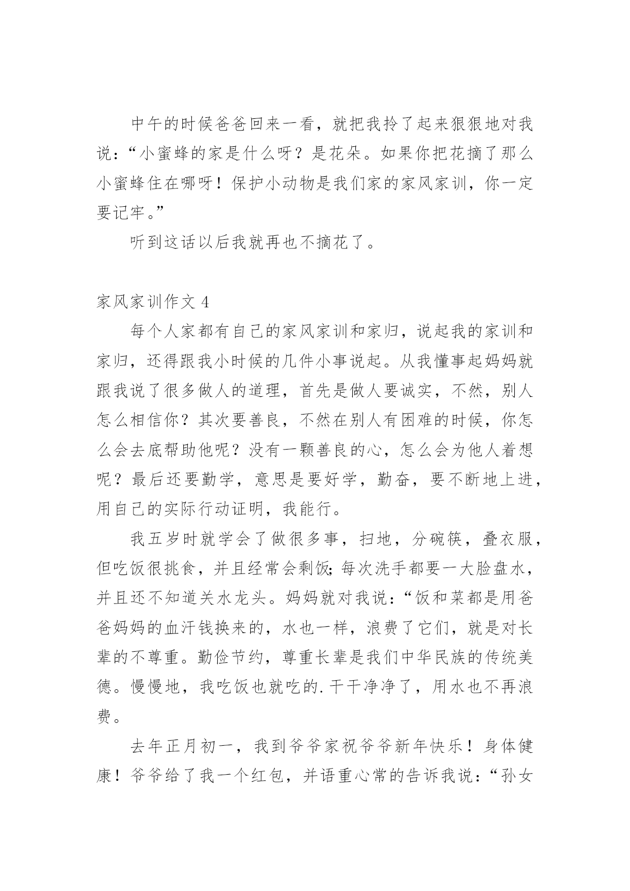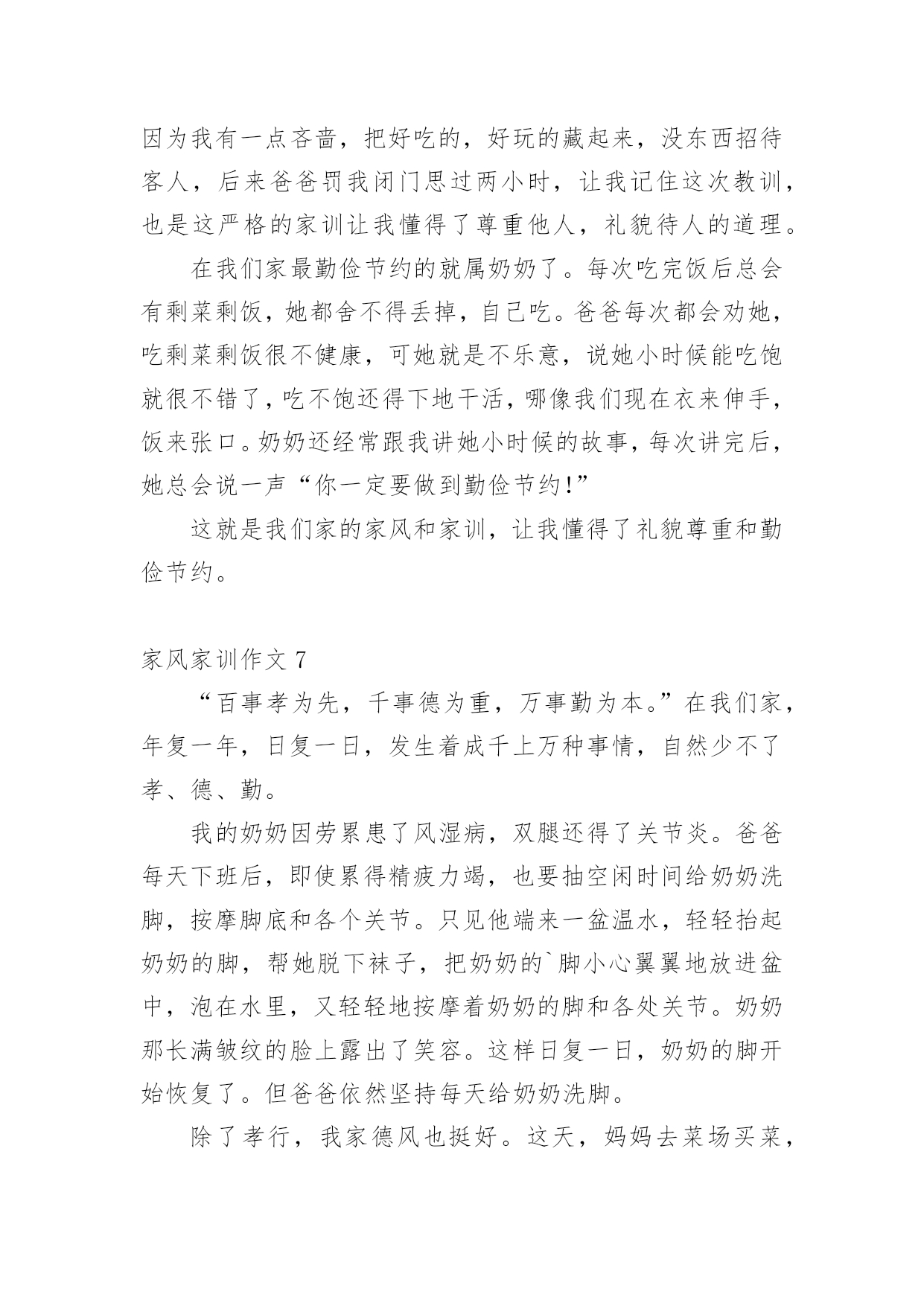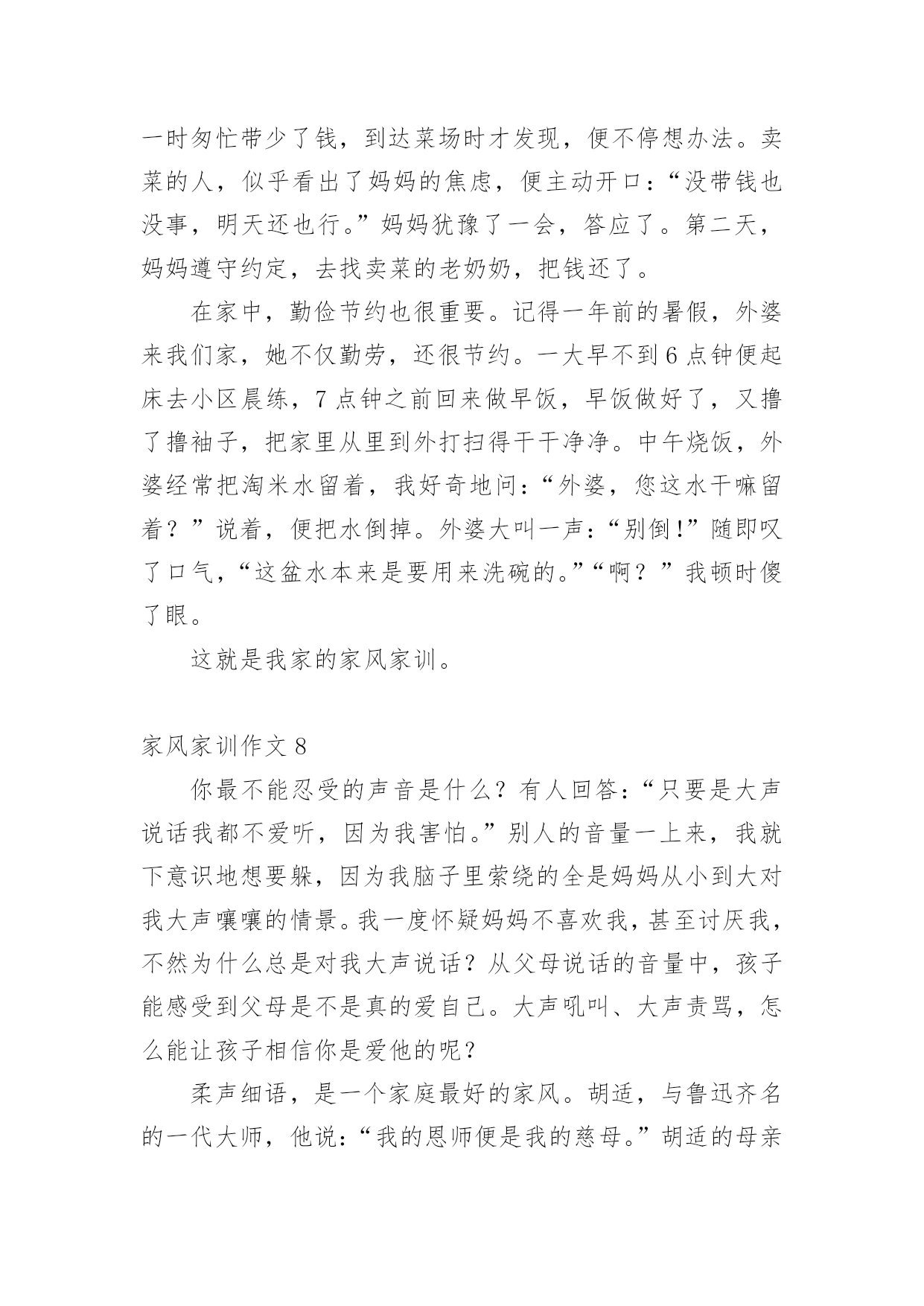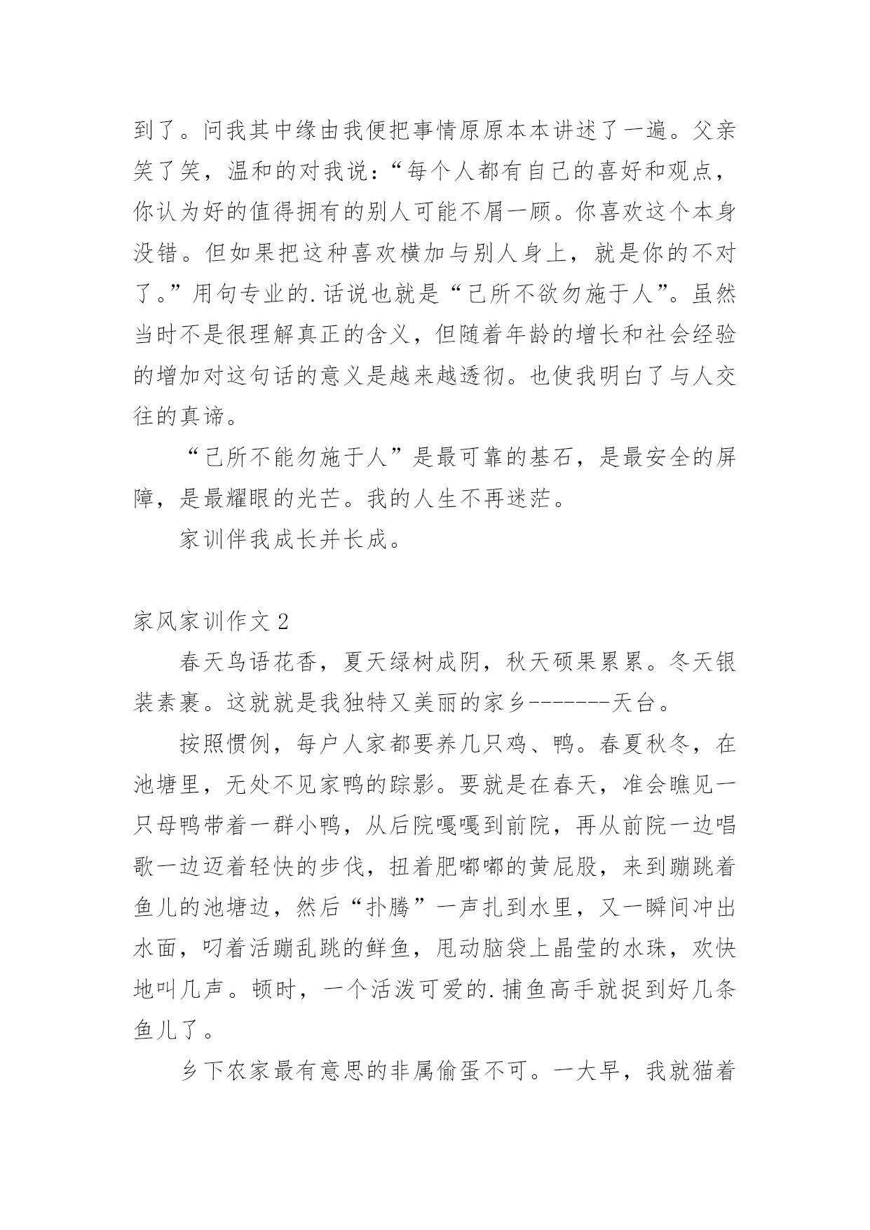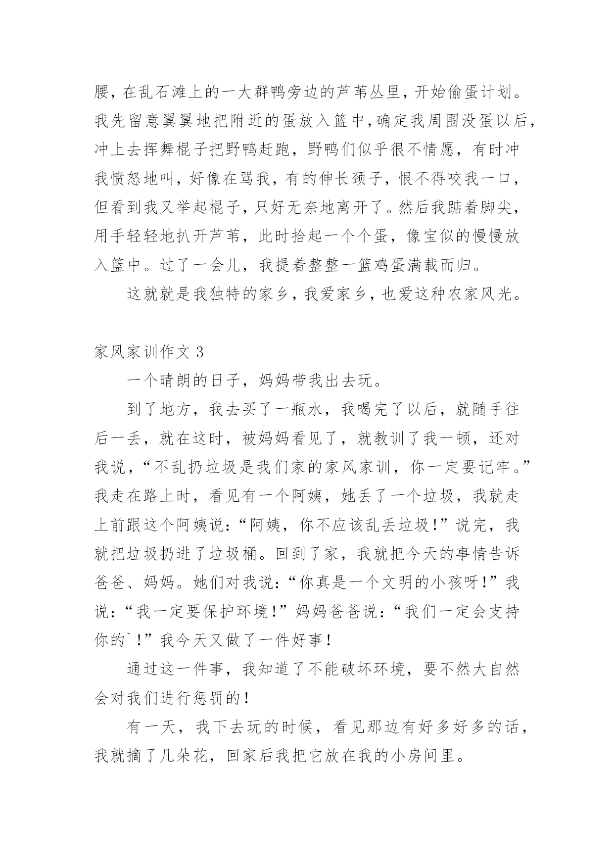 家风家训作文(合集)家风家训作文15篇在平平淡淡的日常中,大家都不可避免地要接触到作文吧,作文是由文字组成,经过人的思想考虑,通过语言组织来表达一个主题意义的文体。你写作文时总是无从下笔?以下是小编为大家收集的家风家训作文,希望对大家有所帮助。家风家训作文1家是成长的港湾,修复残破的帆船;家是海上的避风所,保护雏鸟躲避暴雨的拍打;家是天空中最亮的星,使迷失的我重新找到方向。而家风,则是港湾的基石,是避难所的屏障,是星月的光辉。父亲的“己所不欲勿施于人”一直铭记心头。那时我刚刚升入小学读一年级,懵懵懂懂的我步入全新的环境。面对那么多陌生的脸,我于是把自己武装的无懈可击。从不考虑别人的感受,即便自己是友善的也是好意的。记得有一次,当下特别流行玩摩尔庄园的小游戏,我自然也不例外,并且我对那个打工挣金币的环节特别感兴趣。所以整日里和同学谈的说的全是这些,可是好像大家都不太感兴趣,但是我不死心还是不厌其烦的给他们讲述其中的种种,终于招来了同学的反感。我感觉很委屈,这么好的东西他们都不感冒。放学回到家也是闷闷不乐的,被细心的父亲觉察到了。问我其中缘由我便把事情原原本本讲述了一遍。父亲笑了笑,温和的对我说:“每个人都有自己的喜好和观点,你认为好的值得拥有的别人可能不屑一顾。你喜欢这个本身没错。但如果把这种喜欢横加与别人身上,就是你的不对了。”用句专业的.话说也就是“己所不欲勿施于人”。虽然当时不是很理解真正的含义,但随着年龄的增长和社会经验的增加对这句话的意义是越来越透彻。也使我明白了与人交往的真谛。“己所不能勿施于人”是最可靠的基石,是最安全的屏障,是最耀眼的光芒。我的人生不再迷茫。家训伴我成长并长成。家风家训作文2春天鸟语花香,夏天绿树成阴,秋天硕果累累。冬天银装素裹。这就就是我独特又美丽的家乡-------天台。按照惯例,每户人家都要养几只鸡、鸭。春夏秋冬,在池塘里,无处不见家鸭的踪影。要就是在春天,准会瞧见一只母鸭带着一群小鸭,从后院嘎嘎到前院,再从前院一边唱歌一边迈着轻快的步伐,扭着肥嘟嘟的黄屁股,来到蹦跳着鱼儿的池塘边,然后“扑腾”一声扎到水里,又一瞬间冲出水面,叼着活蹦乱跳的鲜鱼,甩动脑袋上晶莹的水珠,欢快地叫几声。顿时,一个活泼可爱的.捕鱼高手就捉到好几条鱼儿了。乡下农家最有意思的非属偷蛋不可。一大早,我就猫着腰,在乱石滩上的一大群鸭旁边的芦苇丛里,开始偷蛋计划。我先留意翼翼地把附近的蛋放入篮中,确定我周围没蛋以后,冲上去挥舞棍子把野鸭赶跑,野鸭们似乎很不情愿,有时冲我愤怒地叫,好像在骂我,有的伸长颈子,恨不得咬我一口,但看到我又举起棍子,只好无奈地离开了。然后我踮着脚尖,用手轻轻地扒开芦苇,此时拾起一个个蛋,像宝似的慢慢放入篮中。过了一会儿,我提着整整一篮鸡蛋满载而归。这就就是我独特的家乡,我爱家乡,也爱这种农家风光。家风家训作文3一个晴朗的日子,妈妈带我出去玩。到了地方,我去买了一瓶水,我喝完了以后,就随手往后一丢,就在这时,被妈妈看见了,就教训了我一顿,还对我说,“不乱扔垃圾是我们家的家风家训,你一定要记牢。”我走在路上时,看见有一个阿姨,她丢了一个垃圾,我就走上前跟这个阿姨说:“阿姨,你不应该乱丢垃圾!”说完,我就把垃圾扔进了垃圾桶。回到了家,我就把今天的事情告诉爸爸、妈妈。她们对我说:“你真是一个文明的小孩呀!”我说:“我一定要保护环境!”妈妈爸爸说:“我们一定会支持你的`!”我今天又做了一件好事!通过这一件事,我知道了不能破坏环境,要不然大自然会对我们进行惩罚的!有一天,我下去玩的时候,看见那边有好多好多的话,我就摘了几朵花,回家后我把它放在我的小房间里。中午的时候爸爸回来一看,就把我拎了起来狠狠地对我说:“小蜜蜂的家是什么呀?是花朵。如果你把花摘了那么小蜜蜂住在哪呀!保护小动物是我们家的家风家训,你一定要记牢。”听到这话以后我就再也不摘花了。家风家训作文4每个人家都有自己的家风家训和家归,说起我的家训和家归,还得跟我小时候的几件小事说起。从我懂事起妈妈就跟我说了很多做人的道理,首先是做人要诚实,不然,别人怎么相信你?其次要善良,不然在别人有困难的时候,你怎么会去底帮助他呢?没有一颗善良的心,怎么会为他人着想呢?最后还要勤学,意思是要好学,勤奋,要不断地上进,用自己的实际行动证明,我能行。我五岁时就学会了做很多事,扫地,分碗筷,叠衣服,但吃饭很挑食,并且经常会剩饭;每次洗手都要一大脸盘水,并且还不知道关水龙头。妈妈就对我说:“饭和菜都是用爸爸妈妈的血汗钱换来的,水也一样,浪费了它们,就是对长辈的不尊重。勤俭节约,尊重长辈是我们中华民族的传统美德。慢慢地,我吃饭也就吃的.干干净净了,用水也不再浪费。去年正月初一,我到爷爷家祝爷爷新年快乐!身体健康!爷爷给了我一个红包,并语重心常的告诉我说:“孙女啊!你已经是一个