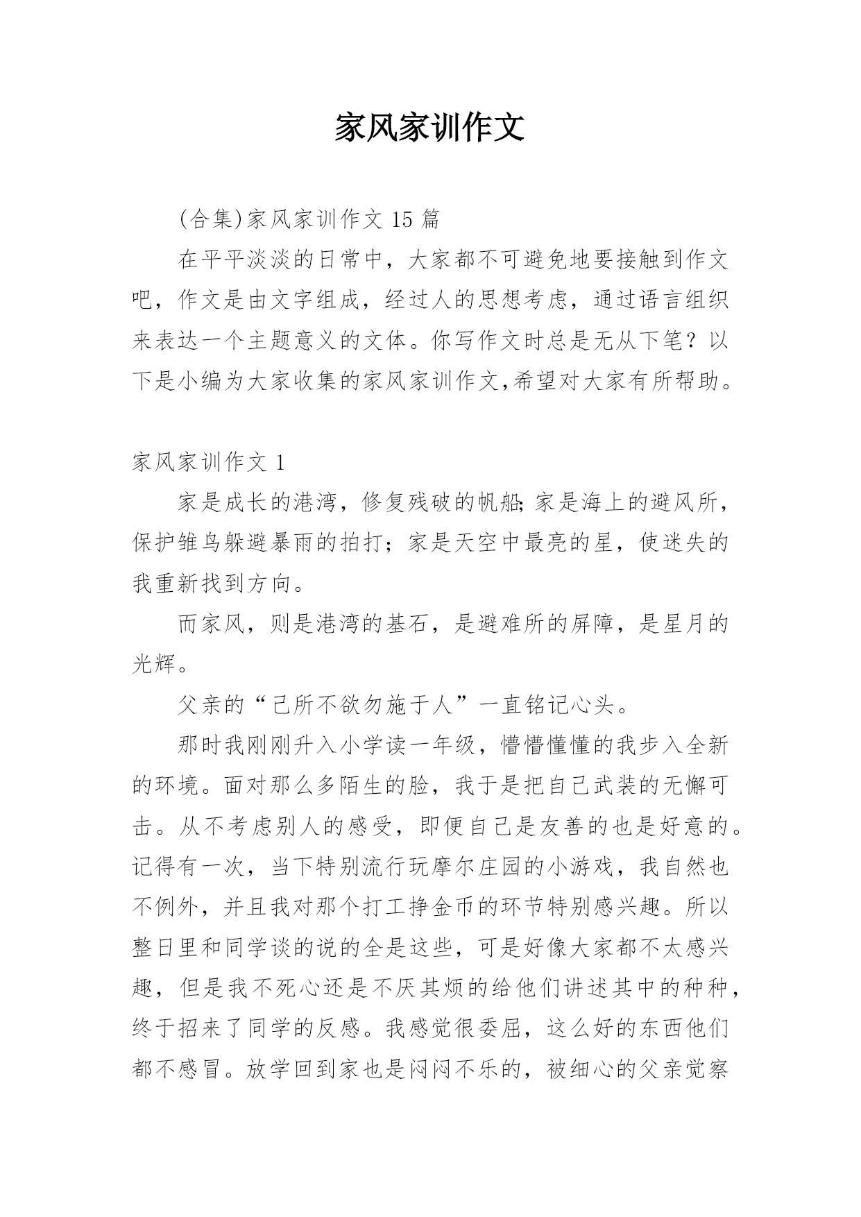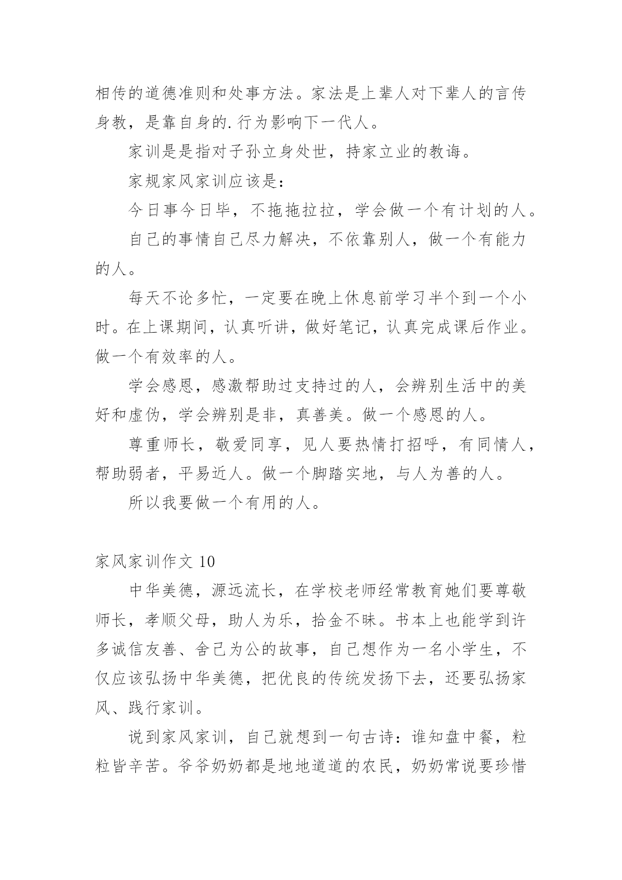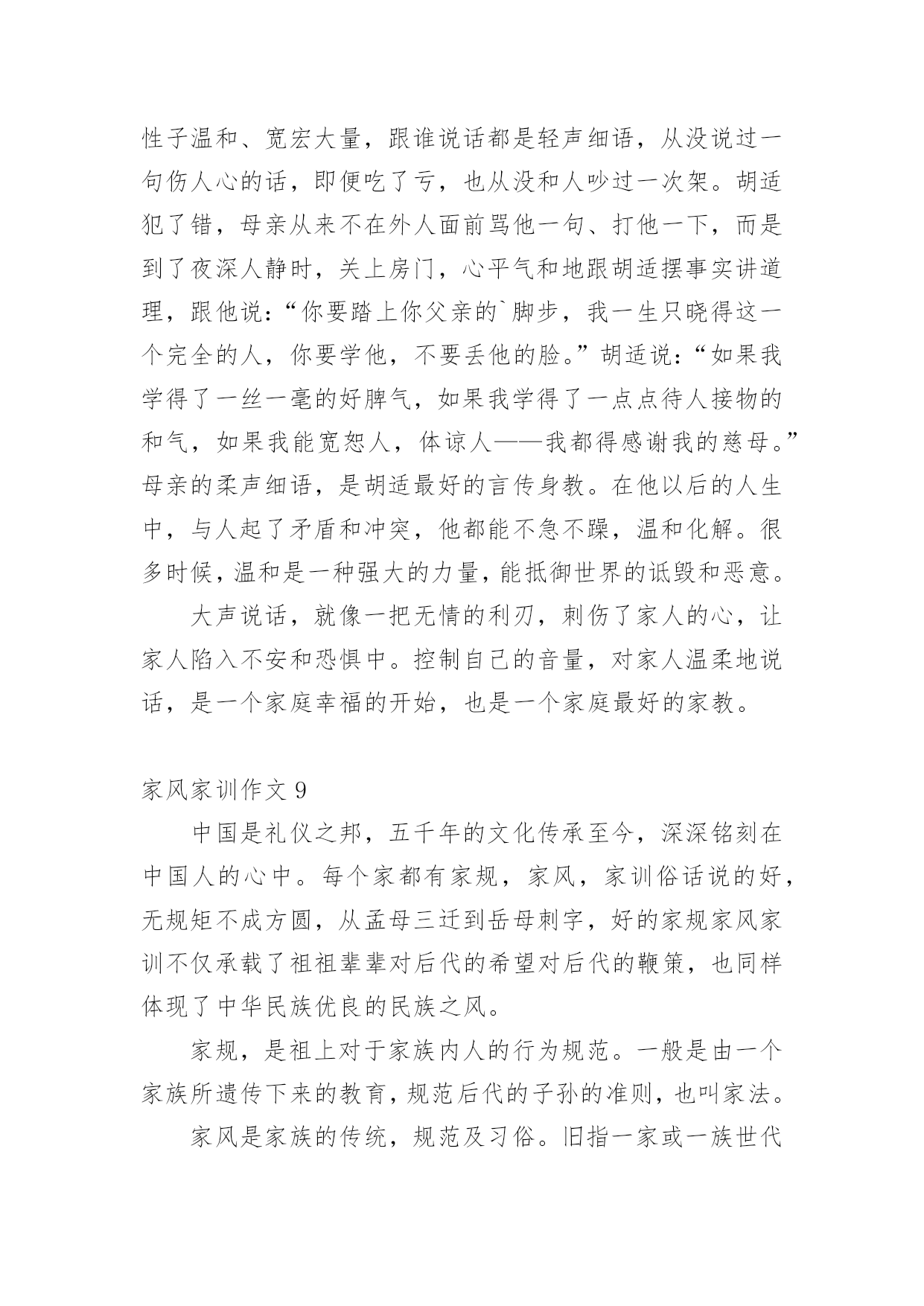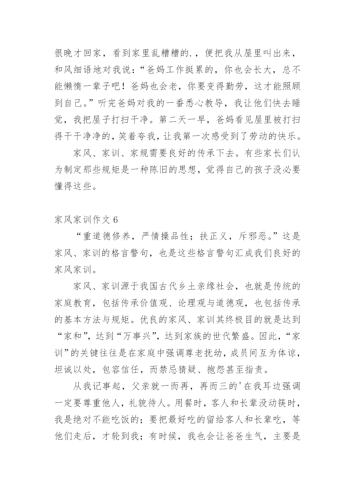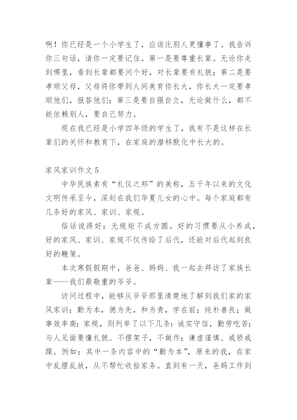 家风家训作文(合集)家风家训作文15篇在平平淡淡的日常中,大家都不可避免地要接触到作文吧,作文是由文字组成,经过人的思想考虑,通过语言组织来表达一个主题意义的文体。你写作文时总是无从下笔?以下是小编为大家收集的家风家训作文,希望对大家有所帮助。家风家训作文1家是成长的港湾,修复残破的帆船;家是海上的避风所,保护雏鸟躲避暴雨的拍打;家是天空中最亮的星,使迷失的我重新找到方向。而家风,则是港湾的基石,是避难所的屏障,是星月的光辉。父亲的“己所不欲勿施于人”一直铭记心头。那时我刚刚升入小学读一年级,懵懵懂懂的我步入全新的环境。面对那么多陌生的脸,我于是把自己武装的无懈可击。从不考虑别人的感受,即便自己是友善的也是好意的。记得有一次,当下特别流行玩摩尔庄园的小游戏,我自然也不例外,并且我对那个打工挣金币的环节特别感兴趣。所以整日里和同学谈的说的全是这些,可是好像大家都不太感兴趣,但是我不死心还是不厌其烦的给他们讲述其中的种种,终于招来了同学的反感。我感觉很委屈,这么好的东西他们都不感冒。放学回到家也是闷闷不乐的,被细心的父亲觉察到了。问我其中缘由我便把事情原原本本讲述了一遍。父亲笑了笑,温和的对我说:“每个人都有自己的喜好和观点,你认为好的值得拥有的别人可能不屑一顾。你喜欢这个本身没错。但如果把这种喜欢横加与别人身上,就是你的不对了。”用句专业的.话说也就是“己所不欲勿施于人”。虽然当时不是很理解真正的含义,但随着年龄的增长和社会经验的增加对这句话的意义是越来越透彻。也使我明白了与人交往的真谛。“己所不能勿施于人”是最可靠的基石,是最安全的屏障,是最耀眼的光芒。我的人生不再迷茫。家训伴我成长并长成。家风家训作文2春天鸟语花香,夏天绿树成阴,秋天硕果累累。冬天银装素裹。这就就是我独特又美丽的家乡-------天台。按照惯例,每户人家都要养几只鸡、鸭。春夏秋冬,在池塘里,无处不见家鸭的踪影。要就是在春天,准会瞧见一只母鸭带着一群小鸭,从后院嘎嘎到前院,再从前院一边唱歌一边迈着轻快的步伐,扭着肥嘟嘟的黄屁股,来到蹦跳着鱼儿的池塘边,然后“扑腾”一声扎到水里,又一瞬间冲出水面,叼着活蹦乱跳的鲜鱼,甩动脑袋上晶莹的水珠,欢快地叫几声。顿时,一个活泼可爱的.捕鱼高手就捉到好几条鱼儿了。乡下农家最有意思的非属偷蛋不可。一大早,我就猫着腰,在乱石滩上的一大群鸭旁边的芦苇丛里,开始偷蛋计划。我先留意翼翼地把附近的蛋放入篮中,确定我周围没蛋以后,冲上去挥舞棍子把野鸭赶跑,野鸭们似乎很不情愿,有时冲我愤怒地叫,好像在骂我,有的伸长颈子,恨不得咬我一口,但看到我又举起棍子,只好无奈地离开了。然后我踮着脚尖,用手轻轻地扒开芦苇,此时拾起一个个蛋,像宝似的慢慢放入篮中。过了一会儿,我提着整整一篮鸡蛋满载而归。这就就是我独特的家乡,我爱家乡,也爱这种农家风光。家风家训作文3一个晴朗的日子,妈妈带我出去玩。到了地方,我去买了一瓶水,我喝完了以后,就随手往后一丢,就在这时,被妈妈看见了,就教训了我一顿,还对我说,“不乱扔垃圾是我们家的家风家训,你一定要记牢。”我走在路上时,看见有一个阿姨,她丢了一个垃圾,我就走上前跟这个阿姨说:“阿姨,你不应该乱丢垃圾!”说完,我就把垃圾扔进了垃圾桶。回到了家,我就把今天的事情告诉爸爸、妈妈。她们对我说:“你真是一个文明的小孩呀!”我说:“我一定要保护环境!”妈妈爸爸说:“我们一定会支持你的`!”我今天又做了一件好事!通过这一件事,我知道了不能破坏环境,要不然大自然会对我们进行惩罚的!有一天,我下去玩的时候,看见那边有好多好多的话,我就摘了几朵花,回家后我把它放在我的小房间里。中午的时候爸爸回来一看,就把我拎了起来狠狠地对我说:“小蜜蜂的家是什么呀?是花朵。如果你把花摘了那么小蜜蜂住在哪呀!保护小动物是我们家的家风家训,你一定要记牢。”听到这话以后我就再也不摘花了。家风家训作文4每个人家都有自己的家风家训和家归,说起我的家训和家归,还得跟我小时候的几件小事说起。从我懂事起妈妈就跟我说了很多做人的道理,首先是做人要诚实,不然,别人怎么相信你?其次要善良,不然在别人有困难的时候,你怎么会去底帮助他呢?没有一颗善良的心,怎么会为他人着想呢?最后还要勤学,意思是要好学,勤奋,要不断地上进,用自己的实际行动证明,我能行。我五岁时就学会了做很多事,扫地,分碗筷,叠衣服,但吃饭很挑食,并且经常会剩饭;每次洗手都要一大脸盘水,并且还不知道关水龙头。妈妈就对我说:“饭和菜都是用爸爸妈妈的血汗钱换来的,水也一样,浪费了它们,就是对长辈的不尊重。勤俭节约,尊重长辈是我们中华民族的传统美德。慢慢地,我吃饭也就吃的.干干净净了,用水也不再浪费。去年正月初一,我到爷爷家祝爷爷新年快乐!身体健康!爷爷给了我一个红包,并语重心常的告诉我说:“孙女啊!你已经是一个