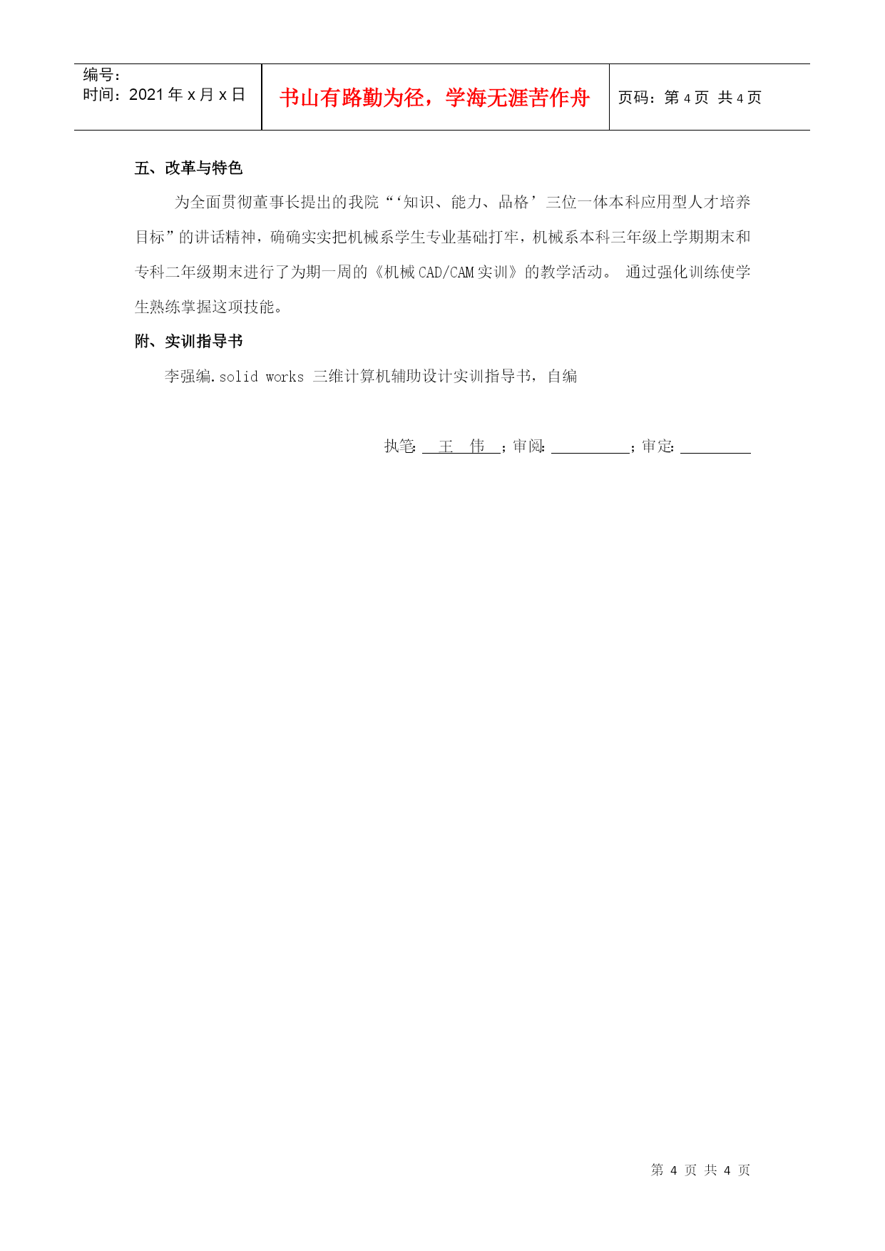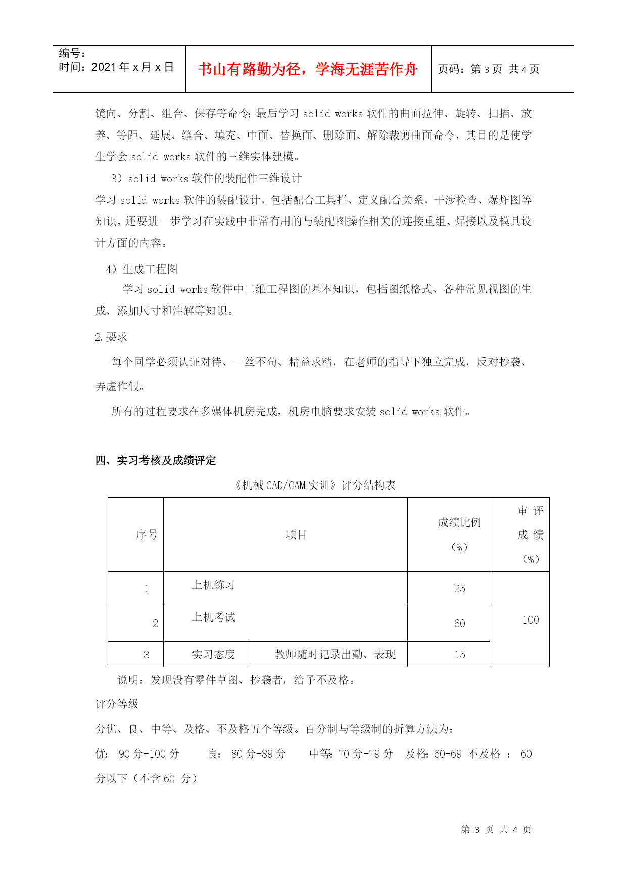 编号:时间:2021年x月x日书山有路勤为径,学海无涯苦作舟页码:第PAGE4页共NUMPAGES4页第PAGE\*MERGEFORMAT4页共NUMPAGES\*MERGEFORMAT4页机械CAD/CAM实训课程名称(中英文):机械CAD/CAM实训(Mechanic'sCAD/CAM)周数:一周时间安排:第二学年/第2学期适用专业:机械设计制造及其自动化、机电一体化开课系、教研室:机械系机械基础教研室一、实习的目的和任务1.实习目的《机械CAD实训》是机械CAD与solidworks三维计算机辅助设计课程的一个重要实训环节,其目的在于通过《机械CAD实训》,使学生通过本课程的学习,将机械专业学生的计算机、机械设计等知识联系起来,从系统的观点、集成的观点和发展的观点出发,学习CAD技术,使学生建立CAD技术的总体概念,充分的发挥学生的想象力,初步培养学生具有初步开发产品的能力。2.实习任务1)掌握直线、圆、圆弧、矩形、平行四边形、多边行、椭圆和椭圆弧、抛物线、样条曲线、圆角、倒角的绘制命令;并学会对草图进行转换实体引用、草图镜像、延伸、裁剪、等距实体、构造几何线、草图的圆周和线性阵列等编辑命令。2)掌握solidworks软件的三维实体建模的拉伸、切除、旋转、扫描、放样、倒角/圆角、筋、抽壳、拔摸、孔等命令.3)熟悉solidworks软件的三维实体编辑操作阵列、镜向、分割、组合、保存等命令。4)掌握solidworks软件的曲面拉伸、旋转、扫描、放养、等距、缝合曲面命令。5)学习solidworks软件的装配设计。6)学习机械零件各种视图的生成和注解标柱。7)巩固、扩展所学知识,培养综合运用知识解决实际问题的能力和独立工作的能力,提高学生使用solidworks软件进行三维实体建模的能力。8)培养严格遵守纪律、独立思考、善于分析、善于观察、一丝不苟的严谨工作作风。二、实习进度安排实训时间为2周,时间分配见下表:《机械CAD实训》进度安排表序号项目天数(天)备注练习指导1solidworks基本操作0.50.52草图绘制操作0.50.53尺寸标注、添加几何关系、草图绘制综合练习0.50.54拉伸操作上机练习0.50.55旋转设计0.50.56扫描设计0.50.57曲面设计0.50.58放样设计0.50.59工程图0.50.510装配设计0.50.5合计55三、实习内容及要求1.实习内容:完成部件的拆卸,测量,测绘部件装配图和主要零件工作图.1)solidworks软件的草图绘制学习在solidworks软件中建立一个新的草图,学习使用直线、圆、圆弧、矩形、平行四边形、多边行、椭圆和椭圆弧、抛物线、样条曲线、圆角、倒角的绘制命令;并学会对草图进行转换实体引用、草图镜像、延伸、裁剪、等距实体、构造几何线、草图的圆周和线性阵列等编辑命令,同时还要学会对草图的尺寸标柱和添加几何关系。2)solidworks软件三维零件设计首先学习solidworks软件的三维实体建模的拉伸、切除、旋转、扫描、放样、倒角/圆角、筋、抽壳、拔摸、孔等命令;其次学习solidworks软件的三维实体编辑操作阵列、镜向、分割、组合、保存等命令;最后学习solidworks软件的曲面拉伸、旋转、扫描、放养、等距、延展、缝合、填充、中面、替换面、删除面、解除裁剪曲面命令,其目的是使学生学会solidworks软件的三维实体建模。3)solidworks软件的装配件三维设计学习solidworks软件的装配设计,包括配合工具拦、定义配合关系,干涉检查、爆炸图等知识,还要进一步学习在实践中非常有用的与装配图操作相关的连接重组、焊接以及模具设计方面的内容。4)生成工程图学习solidworks软件中二维工程图的基本知识,包括图纸格式、各种常见视图的生成、添加尺寸和注解等知识。2.要求每个同学必须认证对待、一丝不苟、精益求精,在老师的指导下独立完成,反对抄袭、弄虚作假。所有的过程要求在多媒体机房完成,机房电脑要求安装solidworks软件。四、实习考核及成绩评定《机械CAD/CAM实训》评分结构表序号项目成绩比例(%)审评成绩(%)1上机练习251002上机考试603实习态度教师随时记录出勤、表现15说明:发现没有零件草图、抄袭者,给予不及格。评分等级分优、良、中等、及格、不及格五个等级。百分制与等级制的折算方法为:优:90分-100分良:80分-89分中等:70分-79分及格:60-69不及格:60分以下(不含60分)五、改革与特色为全面贯彻董事长提出的我院“‘知识、能力、品格’三位一体本科应用型人才培养目标”的讲话精神,确确实实把机