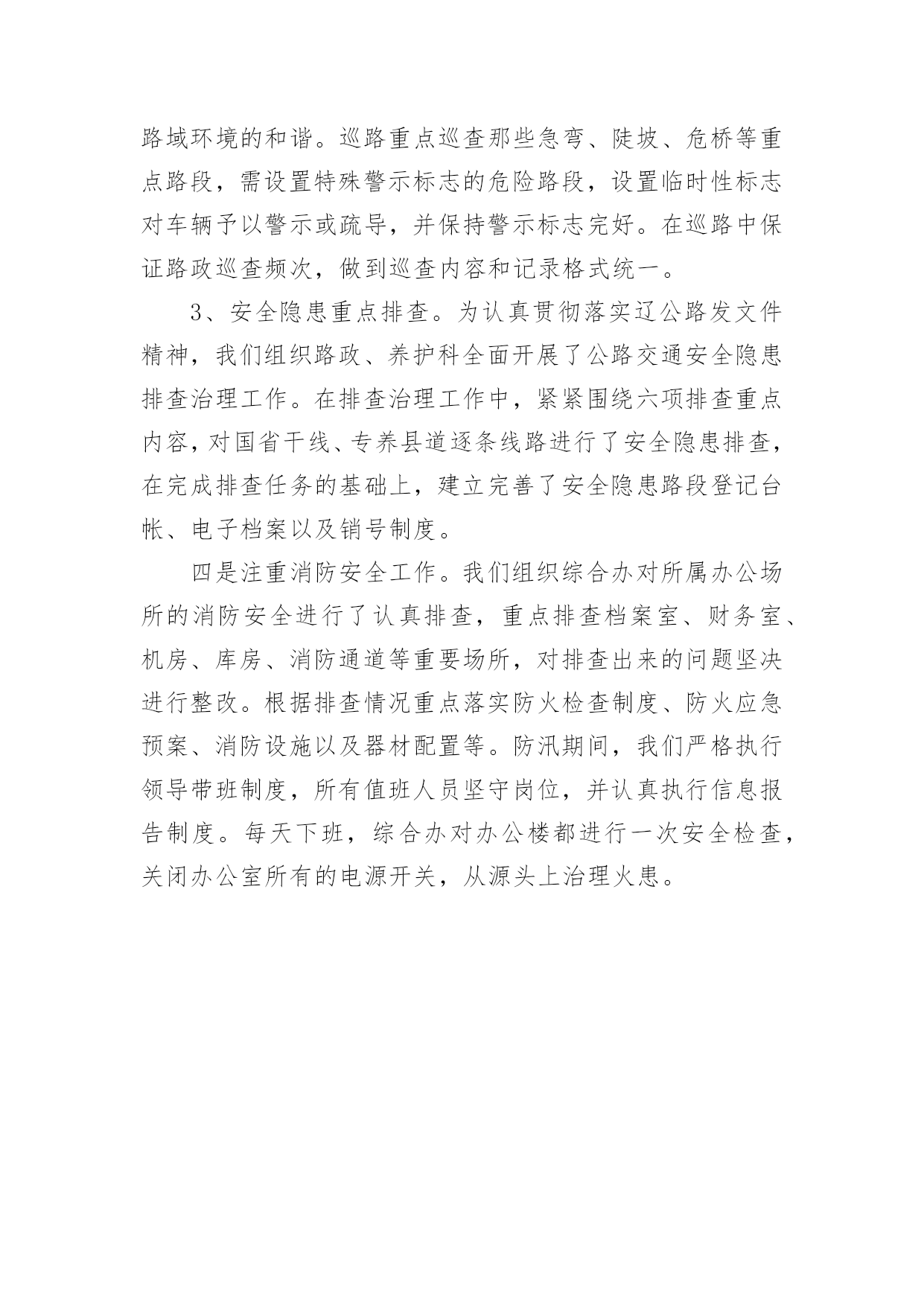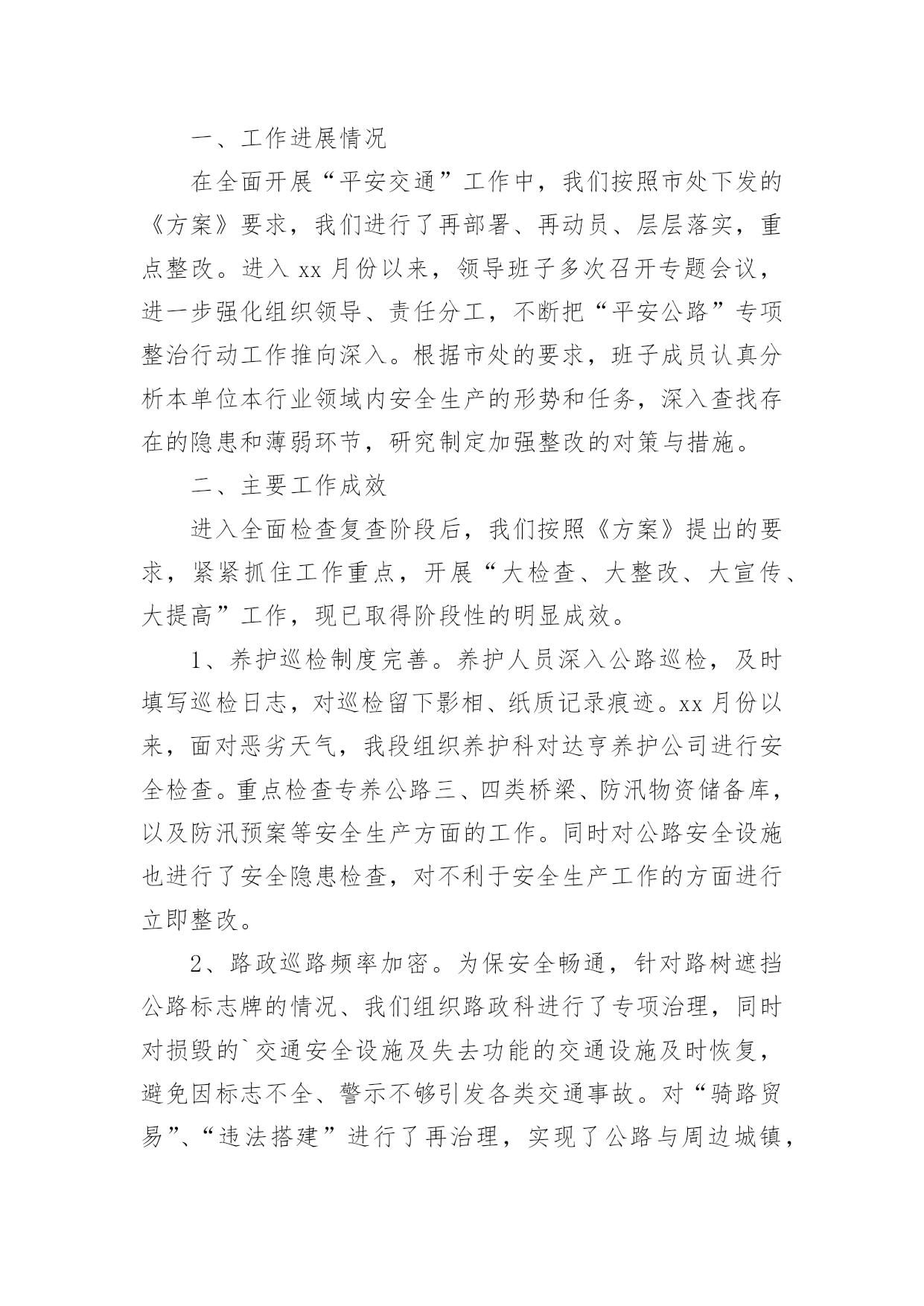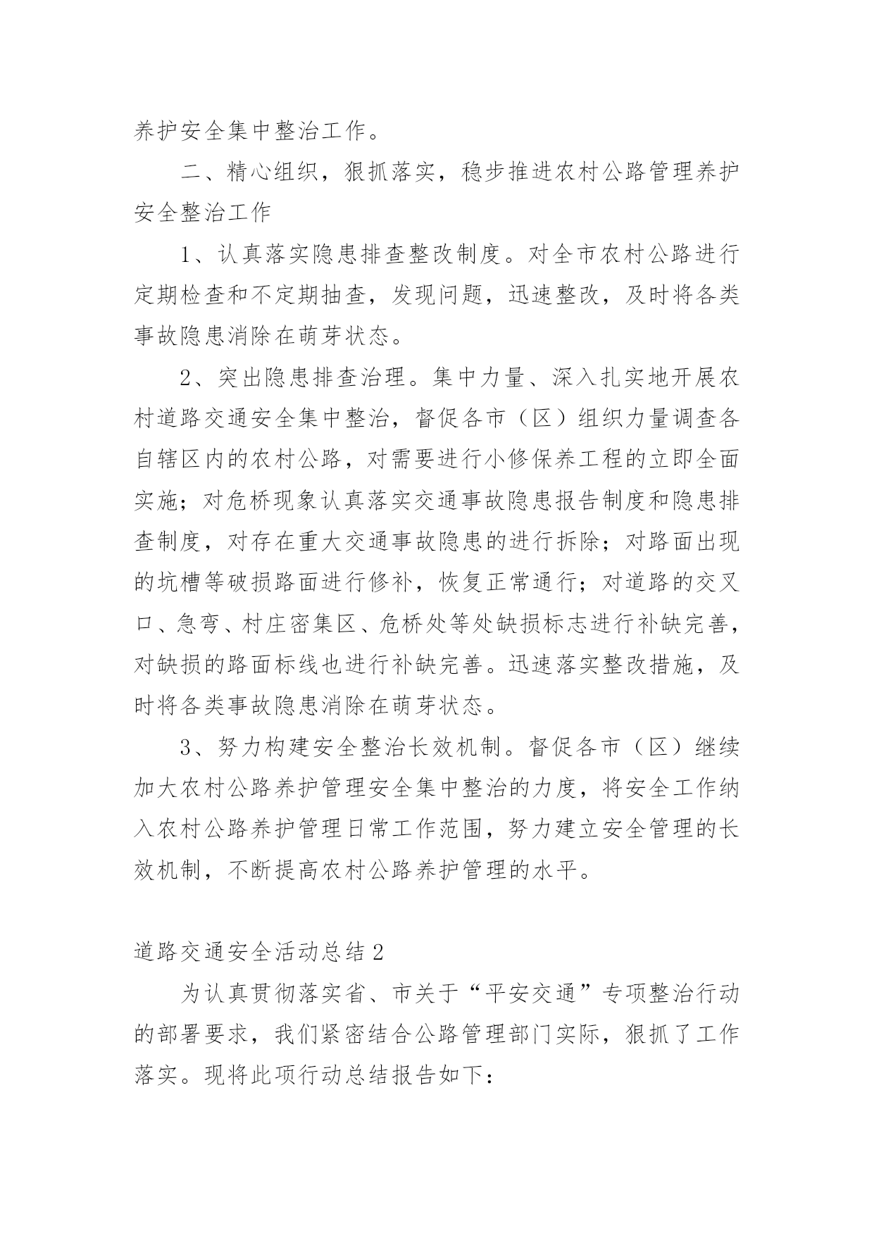 道路交通安全活动总结总结就是把一个时间段取得的成绩、存在的问题及得到的经验和教训进行一次全面系统的总结的书面材料,它可以明确下一步的工作方向,少走弯路,少犯错误,提高工作效益,因此我们要做好归纳,写好总结。那么总结要注意有什么内容呢?下面是小编为大家整理的道路交通安全活动总结,仅供参考,大家一起来看看吧。道路交通安全活动总结1为认真贯彻落实省市关于农村公路安全集中整治工作会议精神,在泰州市交通局统一部署下,泰州市公路处认真督促各市(区)农村公路管理养护办公室对辖区内农村公路养护管理工作进行了安全集中整治,从安全隐患的防范和整治工作抓起,全面提升农村公路养护管理安全工作水平,现将整治工作总结:一、高度重视,周密部署,全面开展农村公路管理养护安全整治工作xx年7月底,公路处将《江苏省农村道路交通安全集中整治工作方案》转发至各县区,对涉及到农村公路养护管理工作的整治重点、目标、工作措施、时间阶段和人员组织提出了要求。并要求各市(区)认真制定安全集中整治的'实施方案,以杜绝农村公路养护管理中存在的安全隐患、保障广大人民群众的出行安全为出发点,全面开展农村公路管理养护安全集中整治工作。二、精心组织,狠抓落实,稳步推进农村公路管理养护安全整治工作1、认真落实隐患排查整改制度。对全市农村公路进行定期检查和不定期抽查,发现问题,迅速整改,及时将各类事故隐患消除在萌芽状态。2、突出隐患排查治理。集中力量、深入扎实地开展农村道路交通安全集中整治,督促各市(区)组织力量调查各自辖区内的农村公路,对需要进行小修保养工程的立即全面实施;对危桥现象认真落实交通事故隐患报告制度和隐患排查制度,对存在重大交通事故隐患的进行拆除;对路面出现的坑槽等破损路面进行修补,恢复正常通行;对道路的交叉口、急弯、村庄密集区、危桥处等处缺损标志进行补缺完善,对缺损的路面标线也进行补缺完善。迅速落实整改措施,及时将各类事故隐患消除在萌芽状态。3、努力构建安全整治长效机制。督促各市(区)继续加大农村公路养护管理安全集中整治的力度,将安全工作纳入农村公路养护管理日常工作范围,努力建立安全管理的长效机制,不断提高农村公路养护管理的水平。道路交通安全活动总结2为认真贯彻落实省、市关于“平安交通”专项整治行动的部署要求,我们紧密结合公路管理部门实际,狠抓了工作落实。现将此项行动总结报告如下:一、工作进展情况在全面开展“平安交通”工作中,我们按照市处下发的《方案》要求,我们进行了再部署、再动员、层层落实,重点整改。进入xx月份以来,领导班子多次召开专题会议,进一步强化组织领导、责任分工,不断把“平安公路”专项整治行动工作推向深入。根据市处的要求,班子成员认真分析本单位本行业领域内安全生产的形势和任务,深入查找存在的隐患和薄弱环节,研究制定加强整改的对策与措施。二、主要工作成效进入全面检查复查阶段后,我们按照《方案》提出的要求,紧紧抓住工作重点,开展“大检查、大整改、大宣传、大提高”工作,现已取得阶段性的明显成效。1、养护巡检制度完善。养护人员深入公路巡检,及时填写巡检日志,对巡检留下影相、纸质记录痕迹。xx月份以来,面对恶劣天气,我段组织养护科对达亨养护公司进行安全检查。重点检查专养公路三、四类桥梁、防汛物资储备库,以及防汛预案等安全生产方面的工作。同时对公路安全设施也进行了安全隐患检查,对不利于安全生产工作的方面进行立即整改。2、路政巡路频率加密。为保安全畅通,针对路树遮挡公路标志牌的情况、我们组织路政科进行了专项治理,同时对损毁的`交通安全设施及失去功能的交通设施及时恢复,避免因标志不全、警示不够引发各类交通事故。对“骑路贸易”、“违法搭建”进行了再治理,实现了公路与周边城镇,路域环境的和谐。巡路重点巡查那些急弯、陡坡、危桥等重点路段,需设置特殊警示标志的危险路段,设置临时性标志对车辆予以警示或疏导,并保持警示标志完好。在巡路中保证路政巡查频次,做到巡查内容和记录格式统一。3、安全隐患重点排查。为认真贯彻落实辽公路发文件精神,我们组织路政、养护科全面开展了公路交通安全隐患排查治理工作。在排查治理工作中,紧紧围绕六项排查重点内容,对国省干线、专养县道逐条线路进行了安全隐患排查,在完成排查任务的基础上,建立完善了安全隐患路段登记台帐、电子档案以及销号制度。四是注重消防安全工作。我们组织综合办对所属办公场所的消防安全进行了认真排查,重点排查档案室、财务室、机房、库房、消防通道等重要场所,对排查出来的问题坚决进行整改。根据排查情况重点落实防火检查制度、防火应急预案、消防设施以及器材配置等。防汛期间,我们严格执行领导带班制度,所有值班人员坚守岗位,并认真执行信息报告制度。每天下班,综合办对办公楼都进行一次安全检查,关闭办公室所有的电源开关,从源头上治理火患。