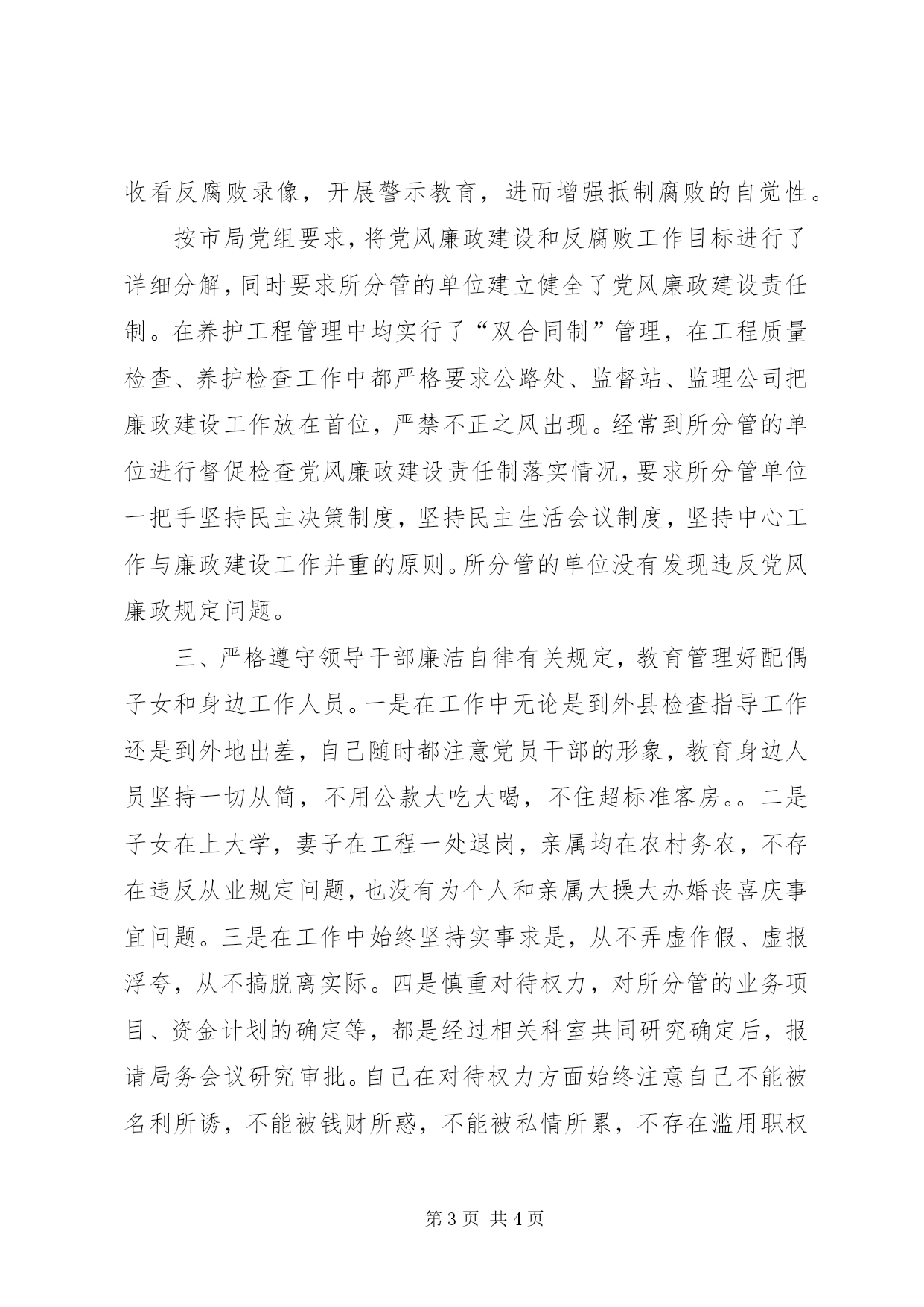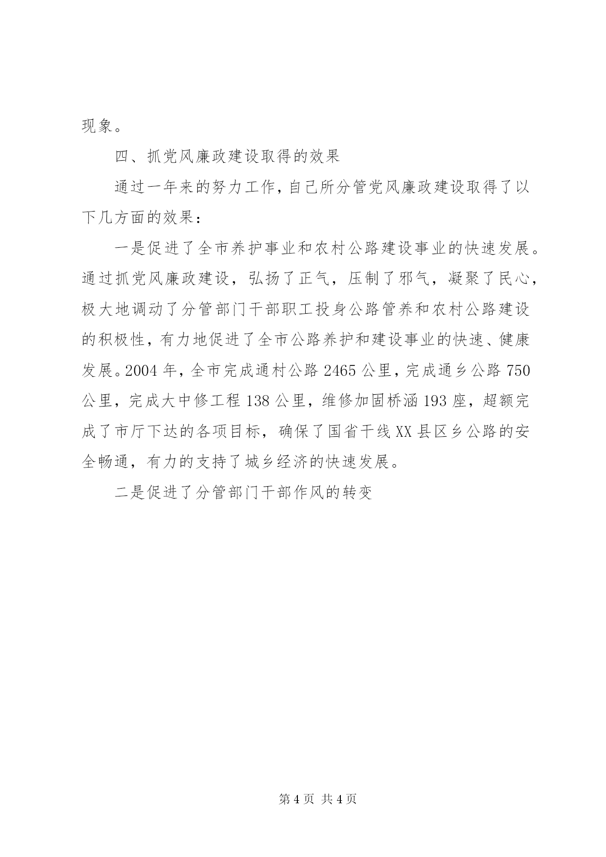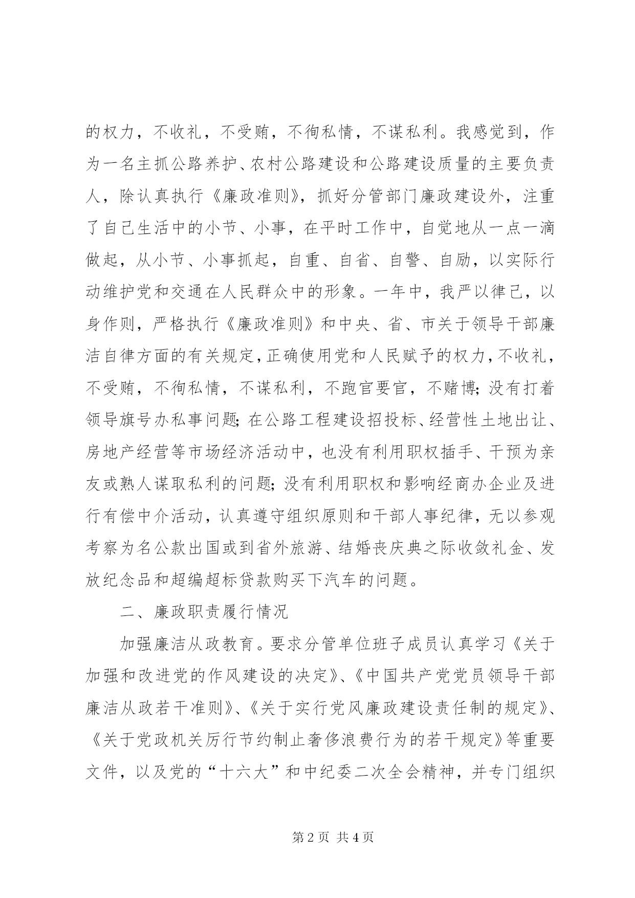 第PAGE\*Arabic\*MERGEFORMAT4页共NUMPAGES\*MERGEFORMAT4页交通局长述职报告按着党风廉政建设责任制分工,我主要负责所分管的公路养护、地方道路、监督监理方面的工作和所分管的公路处、地方道路管理处、京承公路管理处、交通直属分局、监督站、监理公司的单位廉政建设工作。一年来,本人在市局党组的领导下,在市局党组成员的协助下,通过所分管部门领导的共同努力,较好地完成了所分管部门的党风廉政建设工作任务。现就2004年所分管的廉政建设工作任务完成情况述职如下:一、本人廉洁自律情况党的十六大指出,“坚持反对和防止腐败,是全党的一项重大政治任务。不坚决惩治腐败,党同人民的血肉联系就会受到严重损害,党的执政地位就有丧失的危险,党就有可能走向自我毁灭。承德是一个经济欠发达地区,公路基础设施发展相对滞后,县乡公路建设任务还非常艰巨,人民经济水平还很低,在这样的条件下谋求发展,没有一支踏实苦干、为政清廉的干部队伍不行,没有一种清纯干净、积极向上的廉政风气不行。我作为一名党员领导干部,特别是作为一名主管农村公路建设的交通局副局长,自己的一举一动、一言一行都代表党和交通的形象。今年,我严以律己,以身作则,带头严格执行《廉政准则》和中央、省、市关于领导干部廉洁自律方面的有关规定,正确使用党和人民赋予的权力,不收礼,不受贿,不徇私情,不谋私利。我感觉到,作为一名主抓公路养护、农村公路建设和公路建设质量的主要负责人,除认真执行《廉政准则》,抓好分管部门廉政建设外,注重了自己生活中的小节、小事,在平时工作中,自觉地从一点一滴做起,从小节、小事抓起,自重、自省、自警、自励,以实际行动维护党和交通在人民群众中的形象。一年中,我严以律己,以身作则,严格执行《廉政准则》和中央、省、市关于领导干部廉洁自律方面的有关规定,正确使用党和人民赋予的权力,不收礼,不受贿,不徇私情,不谋私利,不跑官要官,不赌博;没有打着领导旗号办私事问题;在公路工程建设招投标、经营性土地出让、房地产经营等市场经济活动中,也没有利用职权插手、干预为亲友或熟人谋取私利的问题;没有利用职权和影响经商办企业及进行有偿中介活动,认真遵守组织原则和干部人事纪律,无以参观考察为名公款出国或到省外旅游、结婚丧庆典之际收敛礼金、发放纪念品和超编超标贷款购买下汽车的问题。二、廉政职责履行情况加强廉洁从政教育。要求分管单位班子成员认真学习《关于加强和改进党的作风建设的决定》、《中国共产党党员领导干部廉洁从政若干准则》、《关于实行党风廉政建设责任制的规定》、《关于党政机关厉行节约制止奢侈浪费行为的若干规定》等重要文件,以及党的“十六大”和中纪委二次全会精神,并专门组织收看反腐败录像,开展警示教育,进而增强抵制腐败的自觉性。按市局党组要求,将党风廉政建设和反腐败工作目标进行了详细分解,同时要求所分管的单位建立健全了党风廉政建设责任制。在养护工程管理中均实行了“双合同制”管理,在工程质量检查、养护检查工作中都严格要求公路处、监督站、监理公司把廉政建设工作放在首位,严禁不正之风出现。经常到所分管的单位进行督促检查党风廉政建设责任制落实情况,要求所分管单位一把手坚持民主决策制度,坚持民主生活会议制度,坚持中心工作与廉政建设工作并重的原则。所分管的单位没有发现违反党风廉政规定问题。三、严格遵守领导干部廉洁自律有关规定,教育管理好配偶子女和身边工作人员。一是在工作中无论是到外县检查指导工作还是到外地出差,自己随时都注意党员干部的形象,教育身边人员坚持一切从简,不用公款大吃大喝,不住超标准客房。。二是子女在上大学,妻子在工程一处退岗,亲属均在农村务农,不存在违反从业规定问题,也没有为个人和亲属大操大办婚丧喜庆事宜问题。三是在工作中始终坚持实事求是,从不弄虚作假、虚报浮夸,从不搞脱离实际。四是慎重对待权力,对所分管的业务项目、资金计划的确定等,都是经过相关科室共同研究确定后,报请局务会议研究审批。自己在对待权力方面始终注意自己不能被名利所诱,不能被钱财所惑,不能被私情所累,不存在滥用职权现象。四、抓党风廉政建设取得的效果通过一年来的努力工作,自己所分管党风廉政建设取得了以下几方面的效果:一是促进了全市养护事业和农村公路建设事业的快速发展。通过抓党风廉政建设,弘扬了正气,压制了邪气,凝聚了民心,极大地调动了分管部门干部职工投身公路管养和农村公路建设的积极性,有力地促进了全市公路养护和建设事业的快速、健康发展。2004年,全市完成通村公路2465公里,完成通乡公路750公里,完成大中修工程138公里,维修加固桥涵193座,超额完成了市厅下达的各项目标,确保了国省干线XX县区乡公路的安全畅通,有力的支持了城乡经济的快速发展。二是促进了分管部门干部作风的转变