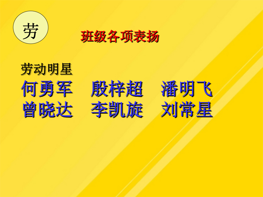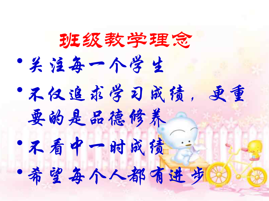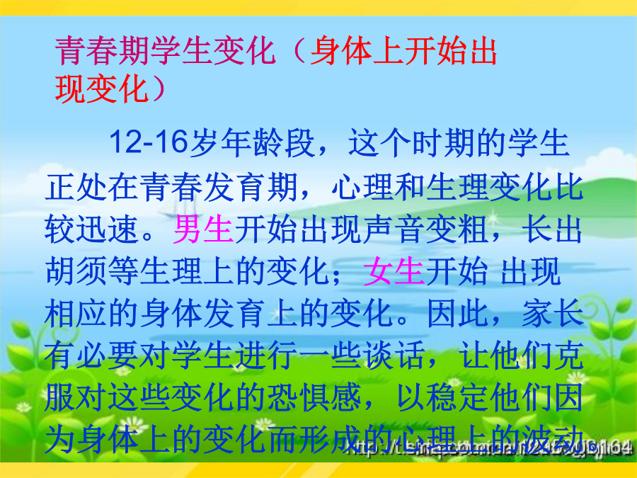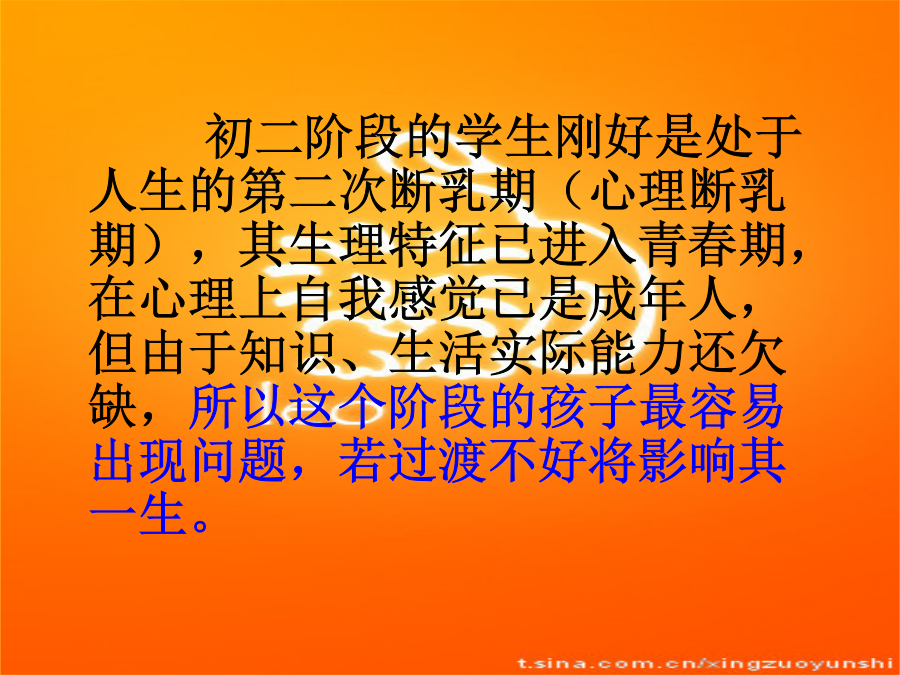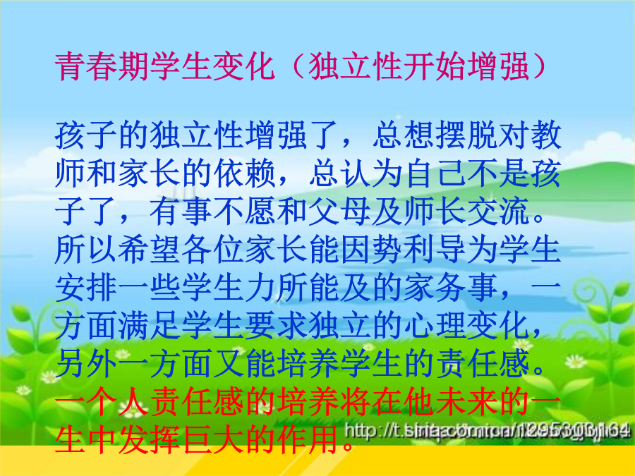 班级教学理念班级各项表扬劳动明星何勇军殷梓超潘明飞曾晓达李凯旋刘常星如何看待成绩家长适当的期望值什么叫“初二现象”?“初二现象”有哪些表现?初二阶段的学生刚好是处于人生的第二次断乳期(心理断乳期),其生理特征已进入青春期,在心理上自我感觉已是成年人,但由于知识、生活实际能力还欠缺,所以这个阶段的孩子最容易出现问题,若过渡不好将影响其一生。12-16岁年龄段,这个时期的学生正处在青春发育期,心理和生理变化比较迅速。男生开始出现声音变粗,长出胡须等生理上的变化;女生开始出现相应的身体发育上的变化。因此,家长有必要对学生进行一些谈话,让他们克服对这些变化的恐惧感,以稳定他们因为身体上的变化而形成的心理上的波动。孩子的独立性增强了,总想摆脱对教师和家长的依赖,总认为自己不是孩子了,有事不愿和父母及师长交流。所以希望各位家长能因势利导为学生安排一些学生力所能及的家务事,一方面满足学生要求独立的心理变化,另外一方面又能培养学生的责任感。一个人责任感的培养将在他未来的一生中发挥巨大的作用。4、注重言传身教,避免孩子出现一些不良倾向。在这个时期,孩子发展顺利,固然幸运;青春期学生变化(身体上开始出现变化)5、加强自身的学习,重点做好子女的心理调节工作,要学会欣赏孩子,要善于发现他们的闪光点,及时给予鼓励,鼓励为主,批评为辅,使之以良好的心态进行每天的学习学习,父母感到满足,但孩子生活得较为压抑,甚至影响心理健康;这个时期学生逆反心理比较重。“初二现象”有哪些表现?3、及时与任课老师取得联系,帮助子女补好薄弱学科,使成绩得到总体提高(家教)“初二现象”有哪些表现?什么叫“初二现象”?12-16岁年龄段,这个时期的学生正处在青春发育期,心理和生理变化比较迅速。曾晓达李凯旋刘常星钟晨刘欣陈裕超殷梓超女生开始出现相应的身体发育上的变化。期望值过高:孩子拼命按家长的意愿生活、曾晓达李凯旋刘常星我建议各位家长可以和你们子女之间就一些问题建立一些约法三章。5、加强自身的学习,重点做好子女的心理调节工作,要学会欣赏孩子,要善于发现他们的闪光点,及时给予鼓励,鼓励为主,批评为辅,使之以良好的心态进行每天的学习这个时期学生逆反心理比较重。而逆反心理的增强一部分原因来自于学生独立性的增强,另外一方面也因为学生被要求的东西变多。学习任务增加,使得学生玩的时间变少,心理上不满开始增多。因而,从这个阶段开始,各位家长的教育模式应该向与他们讨论,并且由学生自己讲出他们自己错误的地方,由学生自己来规定自己要接受惩罚。我建议各位家长可以和你们子女之间就一些问题建立一些约法三章。当家长老师的总是觉得这个时期的孩子不如小学时期听话,很喜欢顶嘴,知心话也不愿和父母说了,“越长越调皮了”。实际上用教育学和心理学的观点分析,这是少年时期孩子一种心理特征的反映,是人生第二次反抗高潮的具体表现,所以我们做父母、老师要明白孩子目前出现的一些问题是正常的,一方面对不违反原则的行为给予理解和宽容,不要大惊小怪,另一方面我们对这一时期的孩子在教育方法上更应该讲道理,态度不要粗暴,语言不要挖苦,要讲究分寸。如果还用小学时期的简单说教是不行的,父母要提高自己的教育方式和水平,使他们提高了认识又明白了道理,和家长统一认识,只要从内心服了,教育效果就是良好的。总之,人一生可以不做坏事,但绝不可能不做错事。初二则是孩子最容易“惹事”,“犯错”的时期。在这个时期,孩子发展顺利,固然幸运;产生了一点麻烦、困惑,也不必紧张。我们应认识到,犯错是孩子的权利,也是走向成熟的必备代价。一个学生不让在校园里犯错,就会留到社会中去犯错,这更不是我们愿意看到的。希望我们的家长要有这个思想准备,有这个信心和耐力,有这个认识高度,有教育孩子健康发展的能力。学校和家庭一起研究,共同努力,让这个“事故多发的阶段”平稳度过,让所有初二的孩子都能得到发展,都能逐步优秀。因此,家长有必要对学生进行一些谈话,让他们克服对这些变化的恐惧感,以稳定他们因为身体上的变化而形成的心理上的波动。适当的期望值:在原有基础上适当拔高,曾晓达李凯旋刘常星3、及时与任课老师取得联系,帮助子女补好薄弱学科,使成绩得到总体提高(家教)所以希望各位家长能因势利导为学生安排一些学生力所能及的家务事,一方面满足学生要求独立的心理变化,另外一方面又能培养学生的责任感。初二阶段的学生刚好是处于人生的第二次断乳期(心理断乳期),其生理特征已进入青春期,在心理上自我感觉已是成年人,但由于知识、生活实际能力还欠缺,所以这个阶段的孩子最容易出现问题,若过渡不好将影响其一生。总之,人一生可以不做坏事,但绝不可能不做错事。不操之过急,不应定得高不可攀。因此,家长有必要对学生进行一些谈话,让他们克服对这些变化的恐惧感,以稳定他们