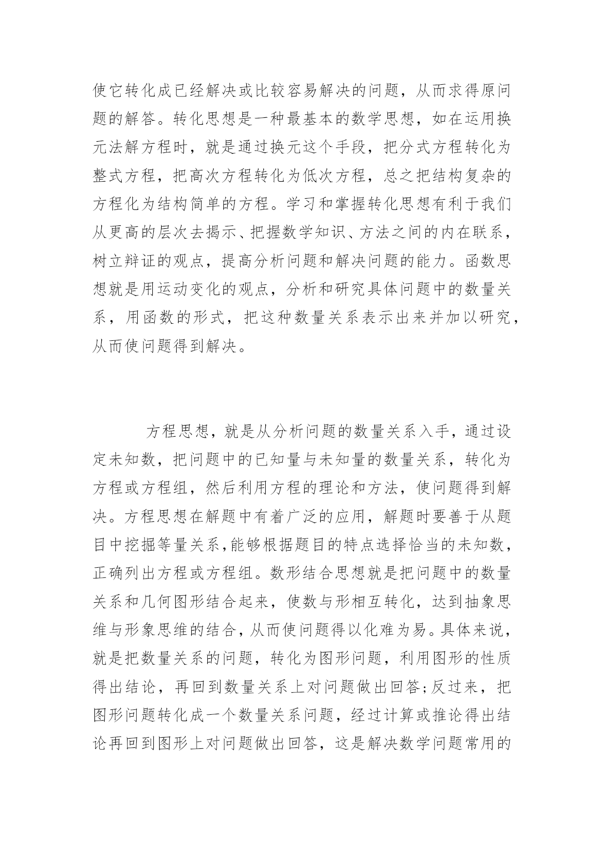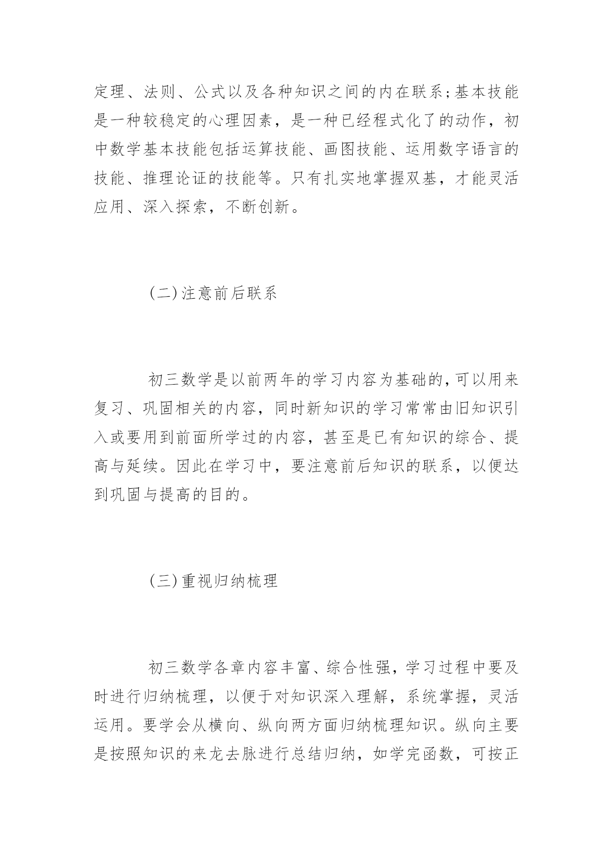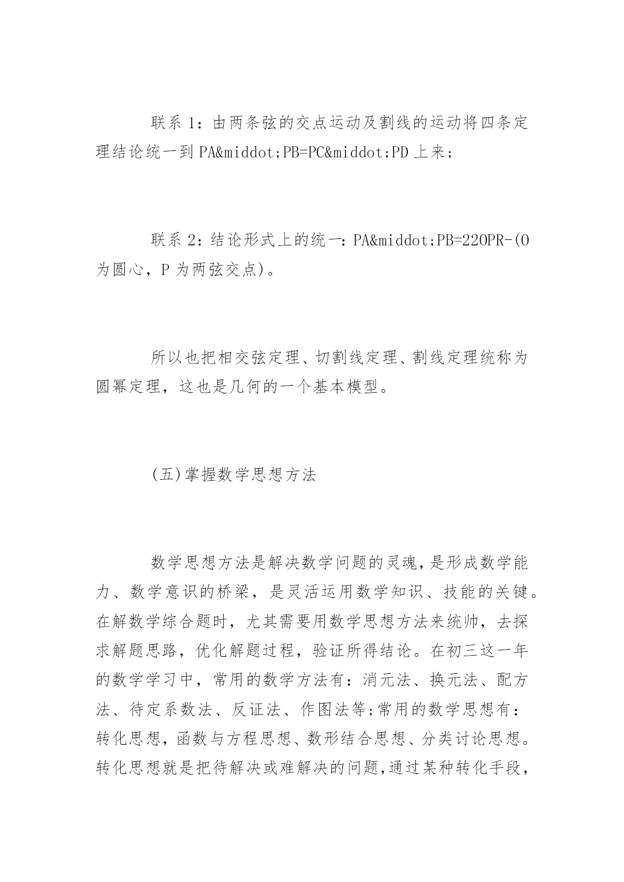 中考数学备考复习攻略2017年中考数学备考复习攻略俗话说:学好数理化,走遍天下都不怕。初中数学难吗?究竟学哪些内容?怎么才能学好?以下是YJBYS小编搜索整理的关于2017年中考数学备考复习攻略,供参考借鉴,希望对大家有所帮助!想了解更多相关信息请持续关注我们应届毕业生培训网!初三数学分为代数、几何两个部分。代数内容有一元二次方程、函数及其图象,统计初步三章;几何内容有解直角三角形和圆两章。初三数学的学习,是以前两年数学学习为基础的,是对已学知识的加深、拓宽、综合与延续,是初中数学学习的重点,也是中考考查的重点。为了学好初三数学,不妨从以下几个方面给予重视:(一)狠抓双基训练。双基即基础知识与基本技能。基础知识是指数学概念、定理、法则、公式以及各种知识之间的内在联系;基本技能是一种较稳定的心理因素,是一种已经程式化了的动作,初中数学基本技能包括运算技能、画图技能、运用数字语言的技能、推理论证的技能等。只有扎实地掌握双基,才能灵活应用、深入探索,不断创新。(二)注意前后联系初三数学是以前两年的学习内容为基础的,可以用来复习、巩固相关的内容,同时新知识的学习常常由旧知识引入或要用到前面所学过的内容,甚至是已有知识的综合、提高与延续。因此在学习中,要注意前后知识的联系,以便达到巩固与提高的目的。(三)重视归纳梳理初三数学各章内容丰富、综合性强,学习过程中要及时进行归纳梳理,以便于对知识深入理解,系统掌握,灵活运用。要学会从横向、纵向两方面归纳梳理知识。纵向主要是按照知识的来龙去脉进行总结归纳,如学完函数,可按正比例函数,一次函数、二次函数、反比例函数来归纳知识。横向是平行的、相关的知识的整合,通过对比指出其区别与联系,如学完二次函数之后,可把二次函数y=ax2+bx+c(a≠0)与一元二次方程ax2+bx+c=0(a≠0)之间的联系进行归纳,这样既可以巩固新、旧知识,更可以提高综合运用知识的能力,收到事半功倍的效果。(四)掌握基本模型,找出本质属性中学的数学模型常常是指反映数学知识规律的结论和基本几何图形。初中代数中,运算法则、性质、公式、方程、函数解析式等均是代数的模型;平面几何中,各类知识中的基本图形均是几何模型。通过对这些基本模型的研究,能够更好地掌握知识的本质属性,沟通知识间的联系。重要的公式、定理是知识系统的主干,我们不仅要知其内容,还应该搞清其来龙去脉,理解其本质。如一元二次方程的求根公式的推导,不仅体现方法,而且由此公式可得出两根与系数的关系,还可类似地推出二次函数的顶点坐标公式,所以一定要掌握推导过程。再如,相交弦定理、切割线定理、割线定理、切线长定理尽管形式上不尽相同,但是它们之间都有着某种内在联系。联系1:由两条弦的交点运动及割线的运动将四条定理结论统一到PA·PB=PC·PD上来;联系2:结论形式上的统一:PA·PB=22OPR-(O为圆心,P为两弦交点)。所以也把相交弦定理、切割线定理、割线定理统称为圆幂定理,这也是几何的一个基本模型。(五)掌握数学思想方法数学思想方法是解决数学问题的灵魂,是形成数学能力、数学意识的桥梁,是灵活运用数学知识、技能的关键。在解数学综合题时,尤其需要用数学思想方法来统帅,去探求解题思路,优化解题过程,验证所得结论。在初三这一年的数学学习中,常用的数学方法有:消元法、换元法、配方法、待定系数法、反证法、作图法等;常用的数学思想有:转化思想,函数与方程思想、数形结合思想、分类讨论思想。转化思想就是把待解决或难解决的问题,通过某种转化手段,使它转化成已经解决或比较容易解决的问题,从而求得原问题的解答。转化思想是一种最基本的数学思想,如在运用换元法解方程时,就是通过换元这个手段,把分式方程转化为整式方程,把高次方程转化为低次方程,总之把结构复杂的方程化为结构简单的方程。学习和掌握转化思想有利于我们从更高的层次去揭示、把握数学知识、方法之间的内在联系,树立辩证的观点,提高分析问题和解决问题的能力。函数思想就是用运动变化的观点,分析和研究具体问题中的数量关系,用函数的形式,把这种数量关系表示出来并加以研究,从而使问题得到解决。方程思想,就是从分析问题的数量关系入手,通过设定未知数,把问题中的已知量与未知量的数量关系,转化为方程或方程组,然后利用方程的理论和方法,使问题得到解决。方程思想在解题中有着广泛的应用,解题时要善于从题目中挖掘等量关系,能够根据题目的特点选择恰当的未知数,正确列出方程或方程组。数形结合思想就是把问题中的数量关系和几何图形结合起来,使数与形相互转化,达到抽象思维与形象思维的结合,从而使问题得以化难为易。具体来说,就是把数量关系的问题,转化为图形问题,利用图形的性质得出结论,再回到数量