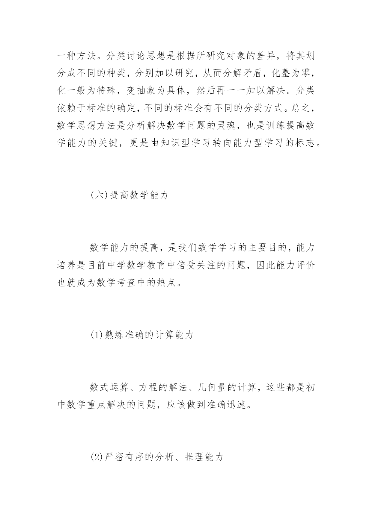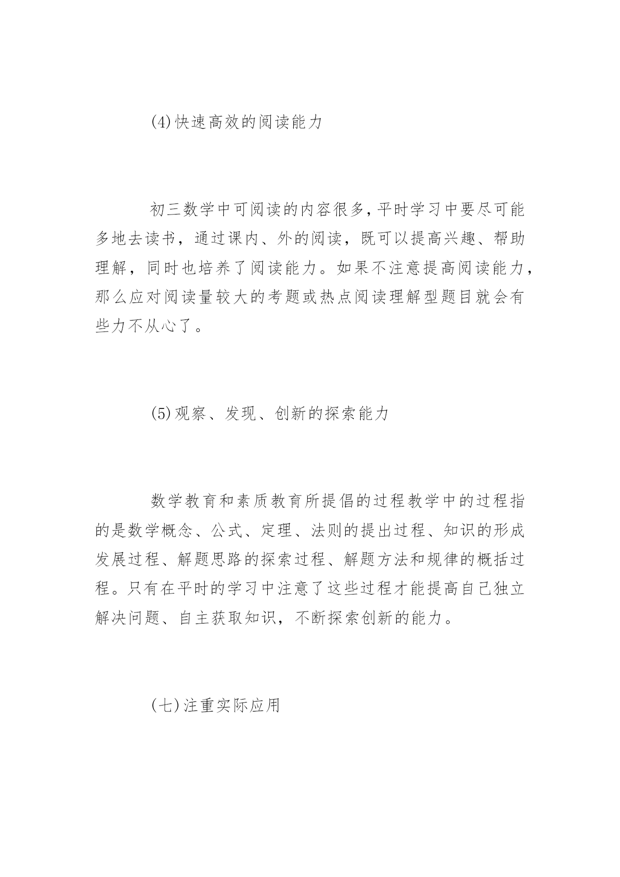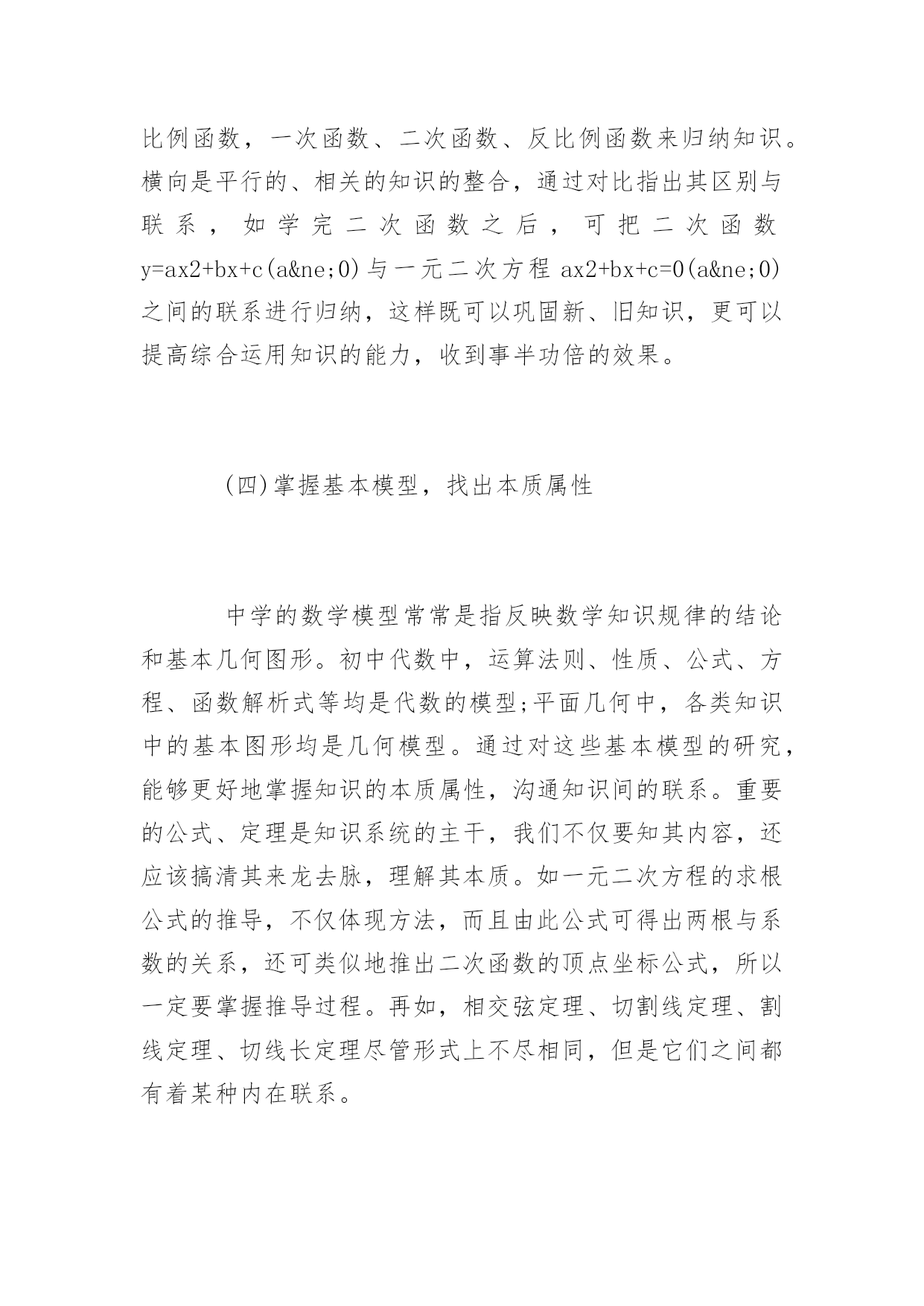 中考数学备考复习攻略2017年中考数学备考复习攻略俗话说:学好数理化,走遍天下都不怕。初中数学难吗?究竟学哪些内容?怎么才能学好?以下是YJBYS小编搜索整理的关于2017年中考数学备考复习攻略,供参考借鉴,希望对大家有所帮助!想了解更多相关信息请持续关注我们应届毕业生培训网!初三数学分为代数、几何两个部分。代数内容有一元二次方程、函数及其图象,统计初步三章;几何内容有解直角三角形和圆两章。初三数学的学习,是以前两年数学学习为基础的,是对已学知识的加深、拓宽、综合与延续,是初中数学学习的重点,也是中考考查的重点。为了学好初三数学,不妨从以下几个方面给予重视:(一)狠抓双基训练。双基即基础知识与基本技能。基础知识是指数学概念、定理、法则、公式以及各种知识之间的内在联系;基本技能是一种较稳定的心理因素,是一种已经程式化了的动作,初中数学基本技能包括运算技能、画图技能、运用数字语言的技能、推理论证的技能等。只有扎实地掌握双基,才能灵活应用、深入探索,不断创新。(二)注意前后联系初三数学是以前两年的学习内容为基础的,可以用来复习、巩固相关的内容,同时新知识的学习常常由旧知识引入或要用到前面所学过的内容,甚至是已有知识的综合、提高与延续。因此在学习中,要注意前后知识的联系,以便达到巩固与提高的目的。(三)重视归纳梳理初三数学各章内容丰富、综合性强,学习过程中要及时进行归纳梳理,以便于对知识深入理解,系统掌握,灵活运用。要学会从横向、纵向两方面归纳梳理知识。纵向主要是按照知识的来龙去脉进行总结归纳,如学完函数,可按正比例函数,一次函数、二次函数、反比例函数来归纳知识。横向是平行的、相关的知识的整合,通过对比指出其区别与联系,如学完二次函数之后,可把二次函数y=ax2+bx+c(a≠0)与一元二次方程ax2+bx+c=0(a≠0)之间的联系进行归纳,这样既可以巩固新、旧知识,更可以提高综合运用知识的能力,收到事半功倍的效果。(四)掌握基本模型,找出本质属性中学的数学模型常常是指反映数学知识规律的结论和基本几何图形。初中代数中,运算法则、性质、公式、方程、函数解析式等均是代数的模型;平面几何中,各类知识中的基本图形均是几何模型。通过对这些基本模型的研究,能够更好地掌握知识的本质属性,沟通知识间的联系。重要的公式、定理是知识系统的主干,我们不仅要知其内容,还应该搞清其来龙去脉,理解其本质。如一元二次方程的求根公式的推导,不仅体现方法,而且由此公式可得出两根与系数的关系,还可类似地推出二次函数的顶点坐标公式,所以一定要掌握推导过程。再如,相交弦定理、切割线定理、割线定理、切线长定理尽管形式上不尽相同,但是它们之间都有着某种内在联系。联系1:由两条弦的交点运动及割线的运动将四条定理结论统一到PA·PB=PC·PD上来;联系2:结论形式上的统一:PA·PB=22OPR-(O为圆心,P为两弦交点)。所以也把相交弦定理、切割线定理、割线定理统称为圆幂定理,这也是几何的一个基本模型。(五)掌握数学思想方法数学思想方法是解决数学问题的灵魂,是形成数学能力、数学意识的桥梁,是灵活运用数学知识、技能的关键。在解数学综合题时,尤其需要用数学思想方法来统帅,去探求解题思路,优化解题过程,验证所得结论。在初三这一年的数学学习中,常用的数学方法有:消元法、换元法、配方法、待定系数法、反证法、作图法等;常用的数学思想有:转化思想,函数与方程思想、数形结合思想、分类讨论思想。转化思想就是把待解决或难解决的问题,通过某种转化手段,使它转化成已经解决或比较容易解决的问题,从而求得原问题的解答。转化思想是一种最基本的数学思想,如在运用换元法解方程时,就是通过换元这个手段,把分式方程转化为整式方程,把高次方程转化为低次方程,总之把结构复杂的方程化为结构简单的方程。学习和掌握转化思想有利于我们从更高的层次去揭示、把握数学知识、方法之间的内在联系,树立辩证的观点,提高分析问题和解决问题的能力。函数思想就是用运动变化的观点,分析和研究具体问题中的数量关系,用函数的形式,把这种数量关系表示出来并加以研究,从而使问题得到解决。方程思想,就是从分析问题的数量关系入手,通过设定未知数,把问题中的已知量与未知量的数量关系,转化为方程或方程组,然后利用方程的理论和方法,使问题得到解决。方程思想在解题中有着广泛的应用,解题时要善于从题目中挖掘等量关系,能够根据题目的特点选择恰当的未知数,正确列出方程或方程组。数形结合思想就是把问题中的数量关系和几何图形结合起来,使数与形相互转化,达到抽象思维与形象思维的结合,从而使问题得以化难为易。具体来说,就是把数量关系的问题,转化为图形问题,利用图形的性质得出结论,再回到数量