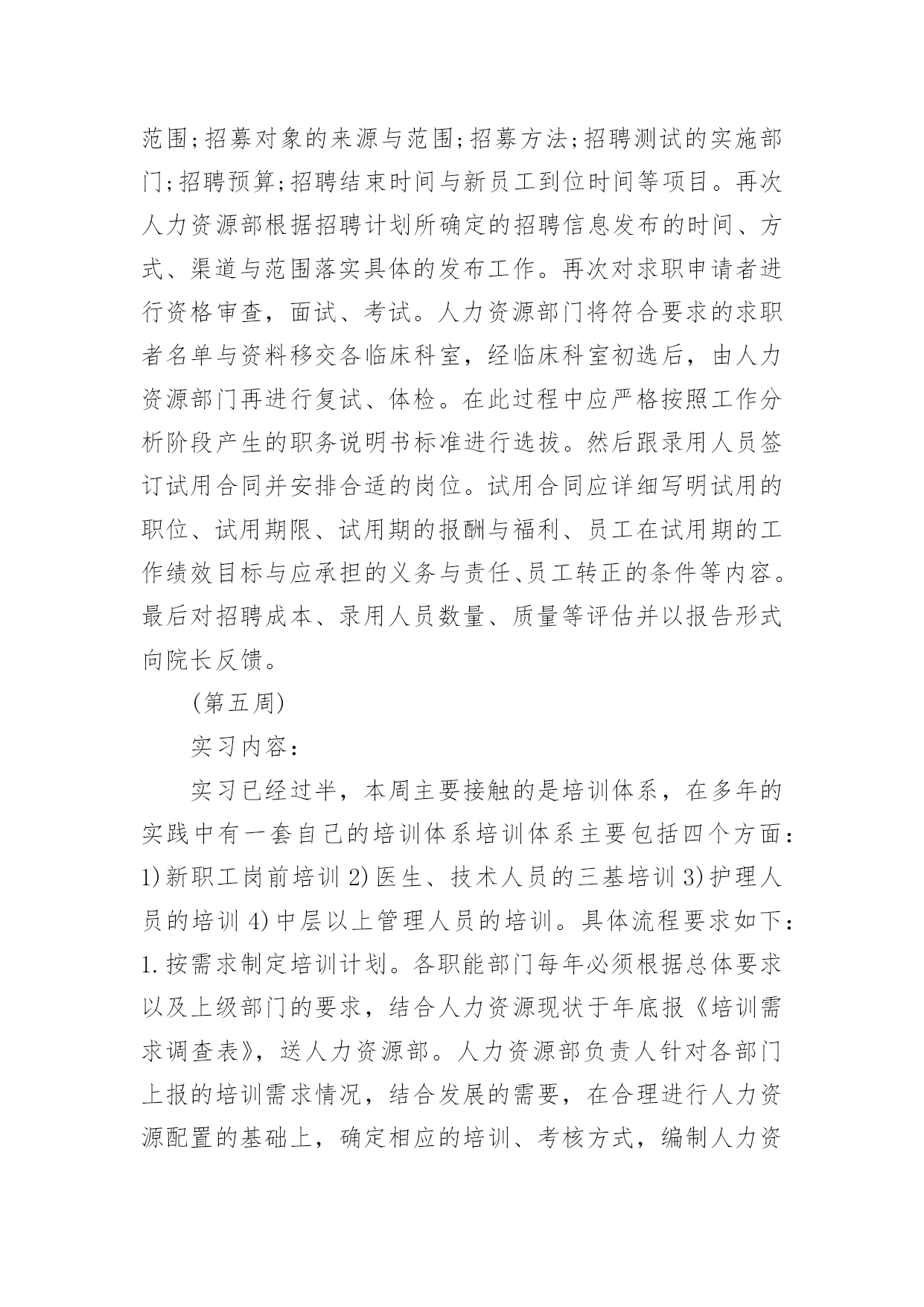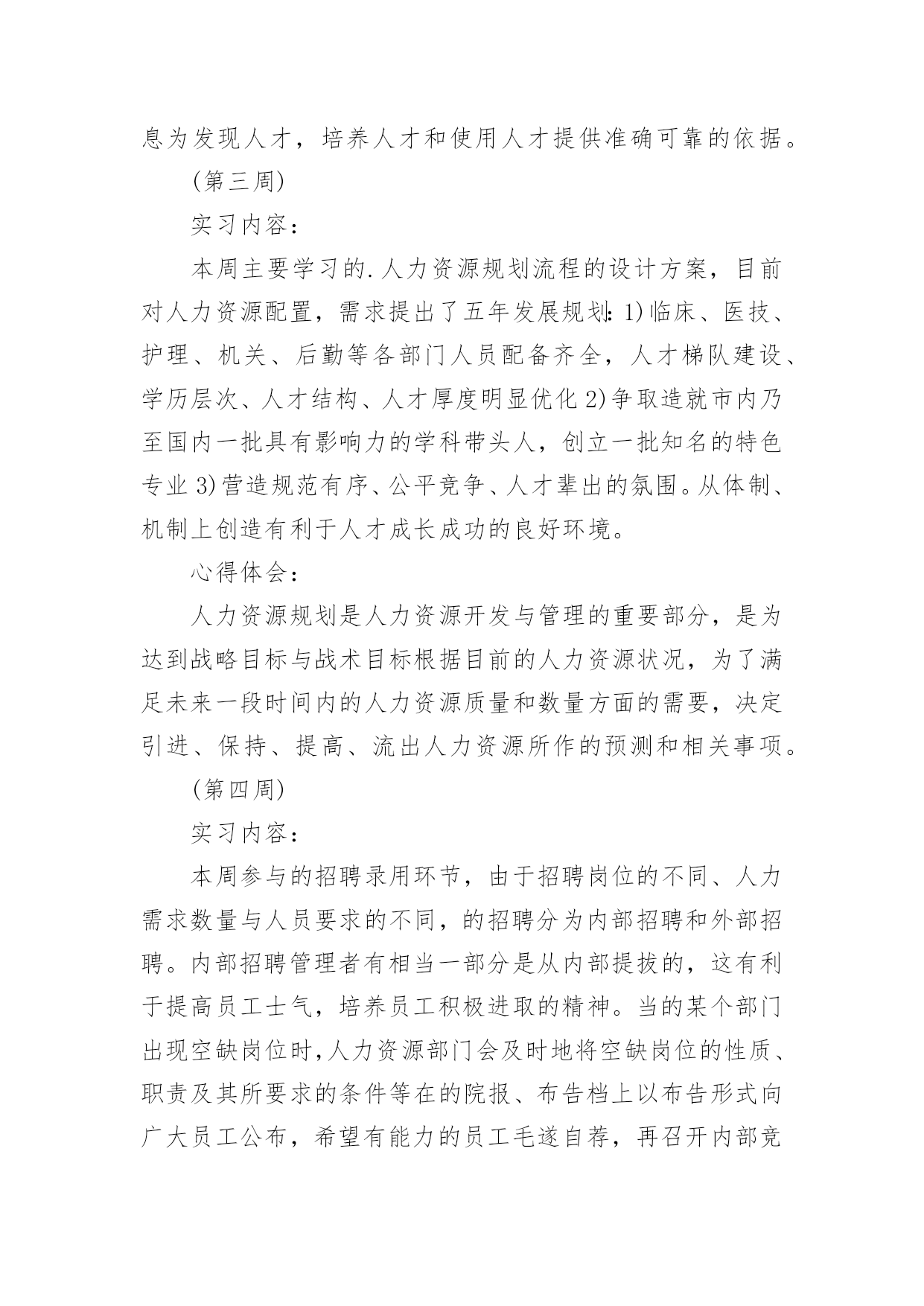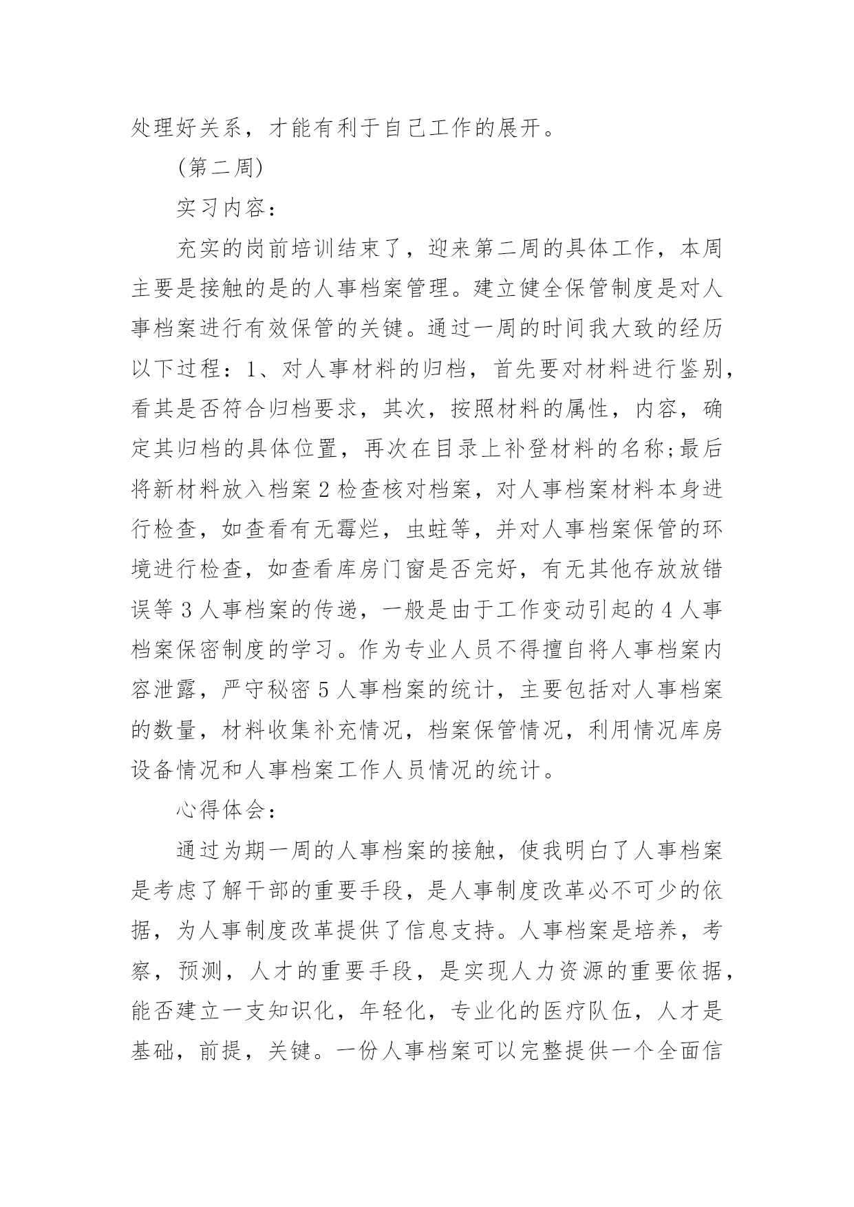 人力资源办理实习周记人力资源办理实习周记在人力资源处进行毕业实习,开始的一周主要是进行岗前培训,公司主管介绍了一下公司的规章制度,企业文化等内容,接下来进行为期一周的培训,进行安全教育,期间重点熟悉人力资源处的内部机构设置和人员编制方案,根据工作需要合理如何调配人力,如何开展职工的招聘,考核,奖惩,辞退工作,做好各类先进人物,各类奖励人选和人才基金资助对象的推荐工作,如何开展职工转正,定级,定职,和专业技术资格评审聘任的具体组织工作,熟悉日常职工管理工作,包括考勤管理,出入境审批,职工攻读在职研究生的选拔和管理;如何开展职工的工资,津贴,补贴和离退人员离退费的发放工作,审批加班费,节日酬金,探亲路费等人员费用;人事档案的管理过程等日常工作环节,力争通过一周的培训尽快胜任工作岗位。心得体会:今天是周六,挑一个晴朗的早晨记下我第一周来的实习心得。实习,虽然不是真正的工作,但却是我工作生涯的一个起点,也是从学生过渡到工作人士的一个不可或缺的必经阶段。刚进入公司的第一天,一切都很陌生,也很新鲜。一张张陌生的面孔,不认识但是都面带微笑很友善。一周的时间很快就过去了,在这一周里,我尽量让自己更快地去适应环境,更快地融入这个大集体中,因为只有和上司、同事都处理好关系,才能有利于自己工作的展开。(第二周)实习内容:充实的岗前培训结束了,迎来第二周的具体工作,本周主要是接触的是的人事档案管理。建立健全保管制度是对人事档案进行有效保管的关键。通过一周的时间我大致的经历以下过程:1、对人事材料的归档,首先要对材料进行鉴别,看其是否符合归档要求,其次,按照材料的属性,内容,确定其归档的具体位置,再次在目录上补登材料的名称;最后将新材料放入档案2检查核对档案,对人事档案材料本身进行检查,如查看有无霉烂,虫蛀等,并对人事档案保管的环境进行检查,如查看库房门窗是否完好,有无其他存放放错误等3人事档案的传递,一般是由于工作变动引起的4人事档案保密制度的学习。作为专业人员不得擅自将人事档案内容泄露,严守秘密5人事档案的统计,主要包括对人事档案的数量,材料收集补充情况,档案保管情况,利用情况库房设备情况和人事档案工作人员情况的统计。心得体会:通过为期一周的人事档案的接触,使我明白了人事档案是考虑了解干部的重要手段,是人事制度改革必不可少的依据,为人事制度改革提供了信息支持。人事档案是培养,考察,预测,人才的重要手段,是实现人力资源的重要依据,能否建立一支知识化,年轻化,专业化的医疗队伍,人才是基础,前提,关键。一份人事档案可以完整提供一个全面信息为发现人才,培养人才和使用人才提供准确可靠的依据。(第三周)实习内容:本周主要学习的.人力资源规划流程的设计方案,目前对人力资源配置,需求提出了五年发展规划:1)临床、医技、护理、机关、后勤等各部门人员配备齐全,人才梯队建设、学历层次、人才结构、人才厚度明显优化2)争取造就市内乃至国内一批具有影响力的学科带头人,创立一批知名的特色专业3)营造规范有序、公平竞争、人才辈出的氛围。从体制、机制上创造有利于人才成长成功的良好环境。心得体会:人力资源规划是人力资源开发与管理的重要部分,是为达到战略目标与战术目标根据目前的人力资源状况,为了满足未来一段时间内的人力资源质量和数量方面的需要,决定引进、保持、提高、流出人力资源所作的预测和相关事项。(第四周)实习内容:本周参与的招聘录用环节,由于招聘岗位的不同、人力需求数量与人员要求的不同,的招聘分为内部招聘和外部招聘。内部招聘管理者有相当一部分是从内部提拔的,这有利于提高员工士气,培养员工积极进取的精神。当的某个部门出现空缺岗位时,人力资源部门会及时地将空缺岗位的性质、职责及其所要求的条件等在的院报、布告档上以布告形式向广大员工公布,希望有能力的员工毛遂自荐,再召开内部竞聘会,竞争上岗,择优录用,或者由临床科室推荐其熟悉的人选,然后根据员工档案了解员工教育、培训、经验、技能等方面的信息,经过组织人事部门共同考核筛选,最终录用。内部招聘有利于节约招聘成本,同时由于内部员工互相熟识,往往认同度较高,有利于今后工作的开展。由于行业的特殊性,许多管理岗位必须是懂业务的,因此管理岗位内部招聘比较多。外部招募因为医务人员流动性较大,再加上自然减员,内部的人力资源无法随时满足的变化和发展,另外也需要补充一些学科带头人、技术骨干等高端人才来推动的发展,所以,的外部招聘主要是面向社会招收能担当重任的学科带头人,技术骨干或者是各大专院校的美文网。外部招聘的主要渠道有:通过人才招聘会,用报纸、网站等发布招聘信息;大中专毕业生自荐;在职员工介绍;参加一些学术会议等。心得体会:招聘工作是的重中之重,录用人员的好坏真接关系的发展,因此领导非常重视招聘工作,采取了一系列的措施,投入了大量的人力、物力和财力,但