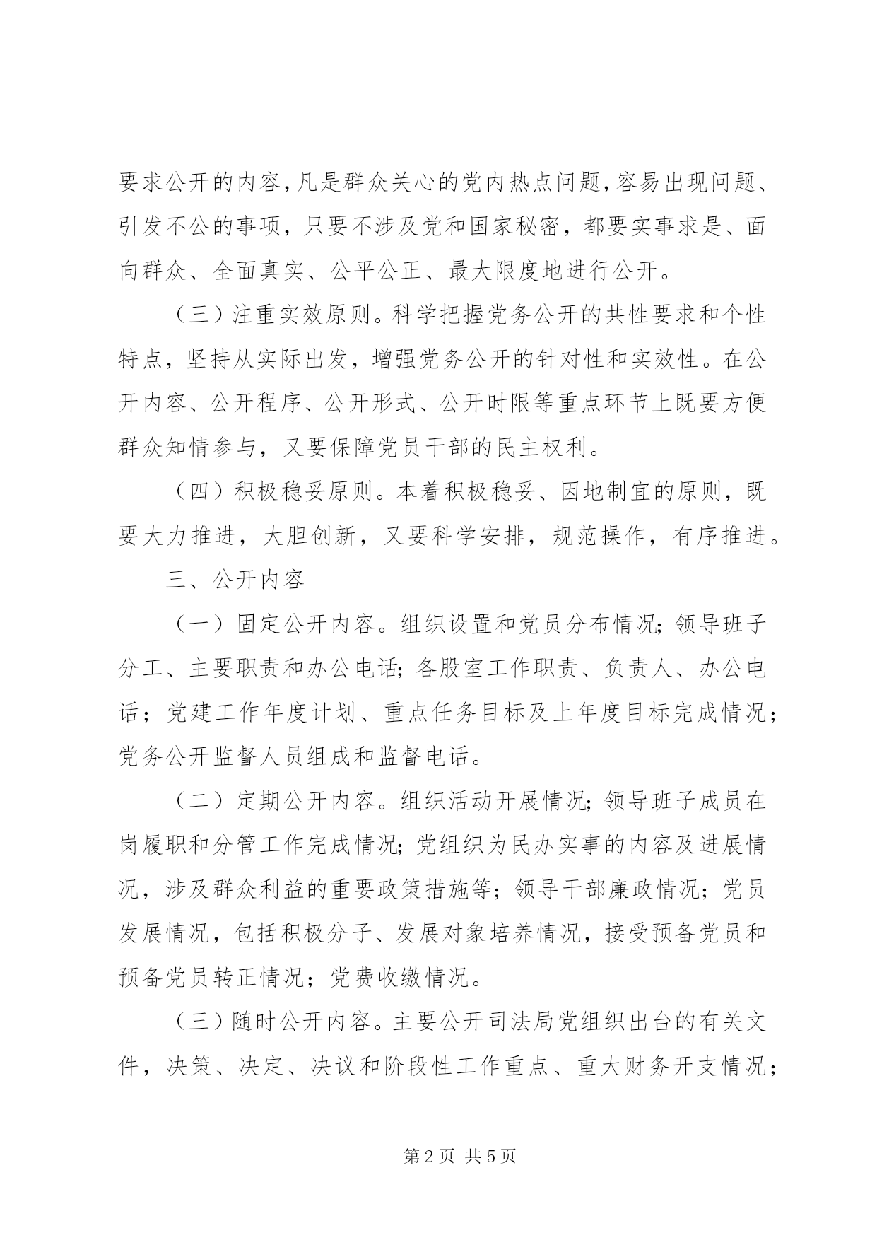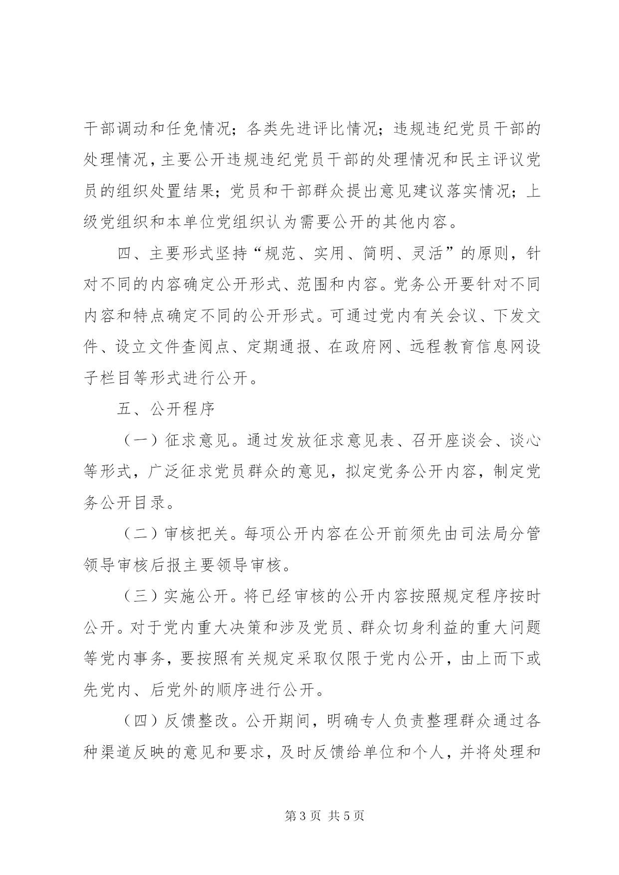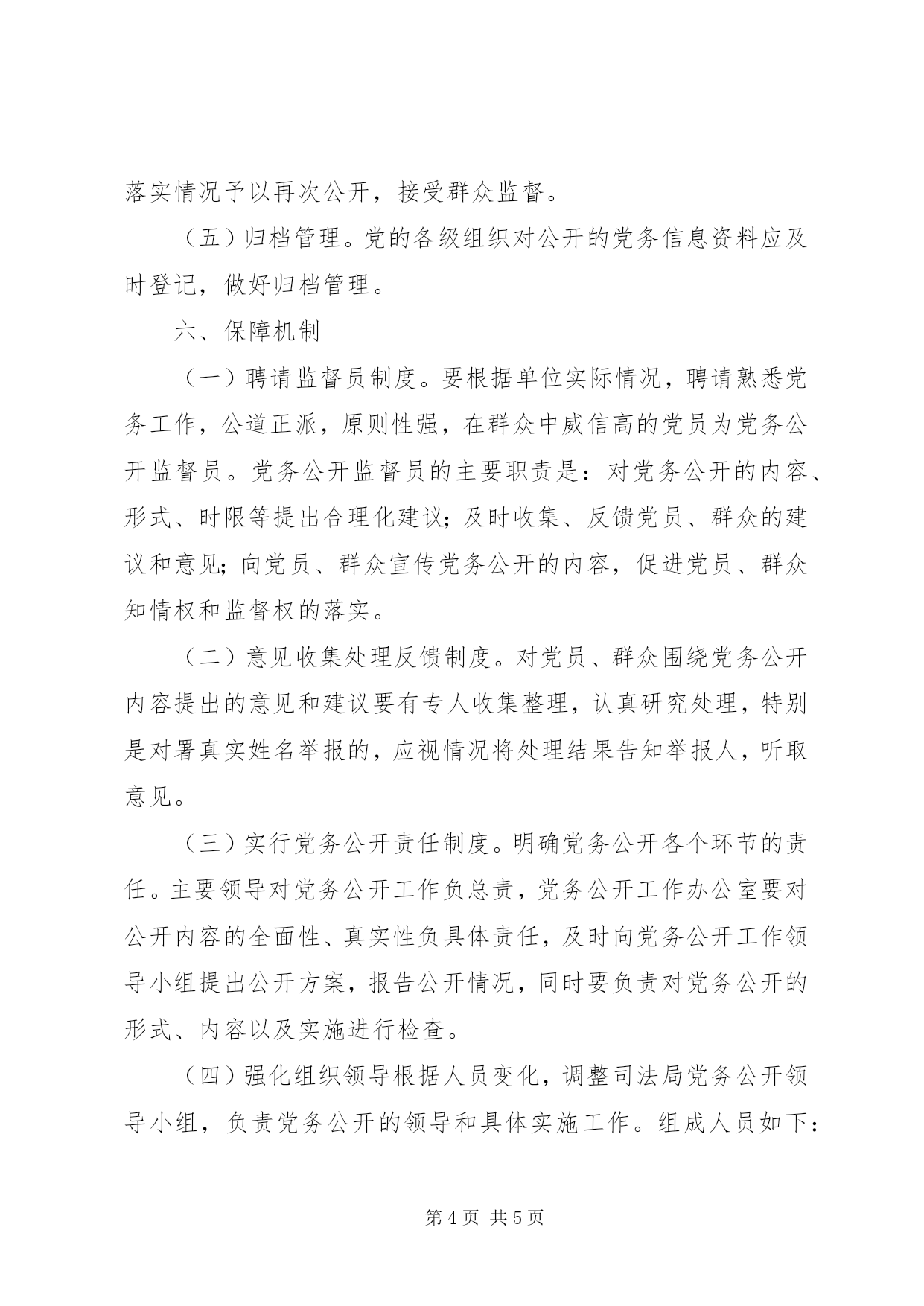 第PAGE\*Arabic\*MERGEFORMAT5页共NUMPAGES\*MERGEFORMAT5页司法局党务公开工作方案为了充分发挥司法局全体党员民主决策、民主管理、民主监督的积极性、主动性、创造性,进一步完善监督制约机制,切实加强和改进司法局党组织建设,探索党务日常管理的新机制,根据《xx区党的基层组织党务公开工作实施方案》的精神,结合司法局工作实际,特制定本工作方案。一、指导思想以邓小平理论和“三个代表”重要思想为指导,深入贯彻落实科学发展观,坚持党要管党、从严治党的方针,紧紧围绕提高党的执政能力和拒腐防变能力,发展党内民主,加强党内监督,最大限度地扩大党员群众对党内事务的知情权、参与权和监督权,增强党务工作的透明度,加强对领导班子和党员领导干部的监督制约,不断提高党员队伍和党组织的创造力、凝聚力和战斗力,为司法行政工作的开展提供坚强有力的政治保证和组织保证。二、基本原则(一)服务发展原则。以经济建设为中心,紧紧围绕全区发展大局,充分调动办公室党员干部创业奉献的积极性,努力营造科学、和谐、快速发展的良好环境,积极为领导把握、谋划全区经济社会发展提供参谋助手作用。(二)真实公正原则。尊重和保障党员群众的知情权、参与权和监督权,凡是《中国共产党党内监督条例(试行)》等规定,要求公开的内容,凡是群众关心的党内热点问题,容易出现问题、引发不公的事项,只要不涉及党和国家秘密,都要实事求是、面向群众、全面真实、公平公正、最大限度地进行公开。(三)注重实效原则。科学把握党务公开的共性要求和个性特点,坚持从实际出发,增强党务公开的针对性和实效性。在公开内容、公开程序、公开形式、公开时限等重点环节上既要方便群众知情参与,又要保障党员干部的民主权利。(四)积极稳妥原则。本着积极稳妥、因地制宜的原则,既要大力推进,大胆创新,又要科学安排,规范操作,有序推进。三、公开内容(一)固定公开内容。组织设置和党员分布情况;领导班子分工、主要职责和办公电话;各股室工作职责、负责人、办公电话;党建工作年度计划、重点任务目标及上年度目标完成情况;党务公开监督人员组成和监督电话。(二)定期公开内容。组织活动开展情况;领导班子成员在岗履职和分管工作完成情况;党组织为民办实事的内容及进展情况,涉及群众利益的重要政策措施等;领导干部廉政情况;党员发展情况,包括积极分子、发展对象培养情况,接受预备党员和预备党员转正情况;党费收缴情况。(三)随时公开内容。主要公开司法局党组织出台的有关文件,决策、决定、决议和阶段性工作重点、重大财务开支情况;干部调动和任免情况;各类先进评比情况;违规违纪党员干部的处理情况,主要公开违规违纪党员干部的处理情况和民主评议党员的组织处置结果;党员和干部群众提出意见建议落实情况;上级党组织和本单位党组织认为需要公开的其他内容。四、主要形式坚持“规范、实用、简明、灵活”的原则,针对不同的内容确定公开形式、范围和内容。党务公开要针对不同内容和特点确定不同的公开形式。可通过党内有关会议、下发文件、设立文件查阅点、定期通报、在政府网、远程教育信息网设子栏目等形式进行公开。五、公开程序(一)征求意见。通过发放征求意见表、召开座谈会、谈心等形式,广泛征求党员群众的意见,拟定党务公开内容,制定党务公开目录。(二)审核把关。每项公开内容在公开前须先由司法局分管领导审核后报主要领导审核。(三)实施公开。将已经审核的公开内容按照规定程序按时公开。对于党内重大决策和涉及党员、群众切身利益的重大问题等党内事务,要按照有关规定采取仅限于党内公开,由上而下或先党内、后党外的顺序进行公开。(四)反馈整改。公开期间,明确专人负责整理群众通过各种渠道反映的意见和要求,及时反馈给单位和个人,并将处理和落实情况予以再次公开,接受群众监督。(五)归档管理。党的各级组织对公开的党务信息资料应及时登记,做好归档管理。六、保障机制(一)聘请监督员制度。要根据单位实际情况,聘请熟悉党务工作,公道正派,原则性强,在群众中威信高的党员为党务公开监督员。党务公开监督员的主要职责是:对党务公开的内容、形式、时限等提出合理化建议;及时收集、反馈党员、群众的建议和意见;向党员、群众宣传党务公开的内容,促进党员、群众知情权和监督权的落实。(二)意见收集处理反馈制度。对党员、群众围绕党务公开内容提出的意见和建议要有专人收集整理,认真研究处理,特别是对署真实姓名举报的,应视情况将处理结果告知举报人,听取意见。(三)实行党务公开责任制度。明确党务公开各个环节的责任。主要领导对党务公开工作负总责,党务公开工作办公室要对公开内容的全面性、真实性负具体责任,及时向党务公开工作领导小组提出公开方案,报告公开情况,同时要负责对党务公开的形式、内容以及实施进行检查。(四)强化组织领导根据人员变