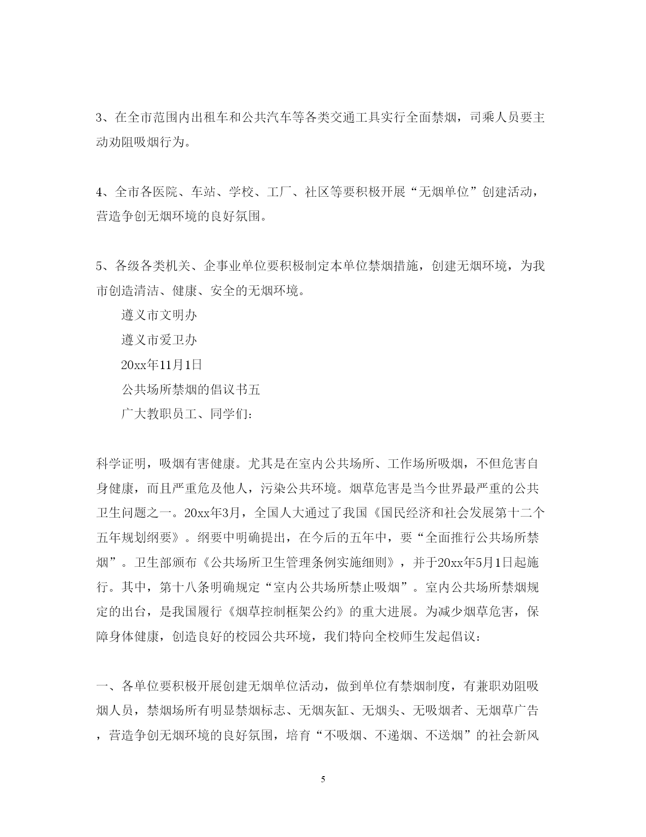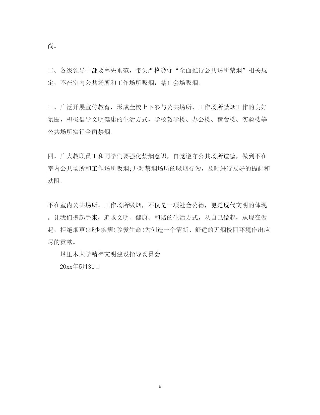 此资料由网络收集而来,如有侵权请告知上传者立即删除。资料共分享,我们负责传递知识。PAGEPAGE6公共场所禁烟的倡议书五篇公共场合是严肃的场合,在这么多人的条件下,如果吸烟的话会造成很大的损害。下面是小编给大家带来的公共场所禁烟的倡议书,欢迎大家阅读参考,我们一起来看看吧!公共场所禁烟的倡议书一全体机关干部职工及广大城乡居民朋友们:烟草危害是当今世界最严重的公共卫生问题之一。科学研究表明,吸烟及二手烟严重危害人类健康,可以导致肺癌、慢性呼吸系统疾病、冠心病、脑卒中等多种疾病肯死亡。为贯彻落实中央办公厅、国务院办公厅《关于领导干部带头在公共场所禁烟有关事项的通知》要求及《省卫生计生委关于开展第26表爱国卫生月暨健康湖北全民行动宣传月活动的通知》精神,引导人们培养和树立文明健康科学的生活方式,倡导机关干部带头遵守公共场所禁止吸烟的有关规定,县委宣传部、县文明办、县卫生计生局、县爱卫办联合向全县各机关事业单位及其工作人员发起倡议:一、充分认识烟草危害,模范遵守公共场所禁烟规定,树立、维护党政机关和领导干部良好形象。二、拒绝二手烟,及时劝阻制止他人违规在公共场所吸烟的行为。三、在办公、会议、接待有情公务活动中不吸烟、不敬烟、不劝烟、不送烟,禁止使用或变相使用公款支付烟草消费开支。四、积极创建无烟机关、无烟单位、无烟工作场所。制定相应禁烟措施,在室内公共场所和工作场所张贴禁止吸烟标示或摆放禁烟标牌,不摆放烟灰缸等烟具。五、积极做好禁烟控烟宣传教育和引导工作,主动学习和传播吸烟危害健康知识,提高防控烟草危害的意识和能力,帮助和鼓励吸烟者戒烟。六、拒绝烟草广告、促销和赞助行为。主动接受群众监督和舆论监督。健康是促进人的全面发展的必然要求,控烟是世界的潮流,是现代文明的体现。让我们共同行动起来,从自己做起,从现在做起,拒绝烟草烟雾危害,共创美好的健康生活。公共场所禁烟的倡议书二尊敬的各位市民朋友们:有关医学研究表明,吸烟可导致心脑血管疾病、癌症、慢性阻塞性肺病等多种疾病,已成为继高血压之后的第二号全球杀手。据统计,目前全球有13亿烟民,每年有5000万人死于与吸烟有关的疾病。吸烟有害健康早已成为不争的事实。特别是公共场所吸烟不仅是对公共场所环境、周围人群的一种危害,而且是一种不健康、不文明的生活习惯,也是一种不道德的行为。因此,公共场所禁烟意义重大。为此,我们倡议:一、广大市民和社会各界积极参与到控烟行动中来,从自身做起,不在公共场所吸烟,自觉维护公共场所的无烟环境,争做无烟环境保护的模范;二、各级领导干部率先垂范,带头不在公共场所吸烟,禁止会场吸烟;三、全市各级机关、企事业单位,特别是医院和学校要积极开展“无烟单位”创建活动,制定本单位无烟措施,动员本单位职工主动戒烟,劝阻吸烟,营造争创无烟环境的良好氛围;四、全市公共汽车等各类公共交通工具实行禁烟,车内要张贴禁烟标志,司乘人员要主动劝阻吸烟行为。公共场所禁烟的倡议书三全区各机关、企事业单位,广大市民朋友们:吸烟有害健康,特别是公共场所吸烟不仅伤害自己,更危害周围人群。目前,合川区正在创建全国文明城区,为保障人民身体健康,提高城市文明水平,如期实现创建目标,我们向社会各界发出如下倡议:1.广大市民和社会各界自觉遵守公共场所禁止吸烟的规定,带头不吸烟,并劝阻他人吸烟,倡导“不吸烟、不递烟、不送烟”的社会新风尚。2.各机关企事业单位、医院、学校、宾馆、酒店、车站、商场、影剧院、网吧、“五小店”等公共场所实行全面禁烟,做到“三有四无”——“三有”:公共场所建筑物入口处有“您已进入无烟单位,请不要吸烟”等告示牌;楼梯转角处、楼道内、厕所标牌处、电梯口、电梯轿厢内、办公室、会议室等处有明显的禁烟标识;有控烟劝阻员对吸烟现象进行劝阻。“四无”:室内无人吸烟,无烟具,无烟头、烟灰,无烟味。3.出租车、公共汽车等各类交通工具实行全面禁烟,车内张贴禁烟标志,司乘人员积极主动劝阻吸烟行为。让我们携起手来,追求文明、健康的生活方式,拒绝烟草!珍爱生命!为创造一个清新、舒适的无烟环境作出应有的贡献。重庆市合川区创建全国文明城区办公室重庆市合川区爱国卫生运动委员会办公室20xx年5月31公共场所禁烟的倡议书四尊敬的市民朋友们:吸烟有害健康、导致多种疾病,这是数亿吸烟者和各国专家证实的一个无可争议的事实。吸烟不但给人们带来疾病,而且还会引发火灾,直接危及人民群众的身体健康和生命安全。公共场所吸烟不仅是一种不健康、不文明的生活习惯,更是吸烟者对公共场所环境、周围人群的一种巨大危害。据研究资料表明,吸烟者吸烟时对旁人的危害比对自己还要大,一些与吸烟者共同生活的人,患肺癌的几率比常人多出6倍。因此,公共场所禁烟工作刻不容缓,意义重大。
