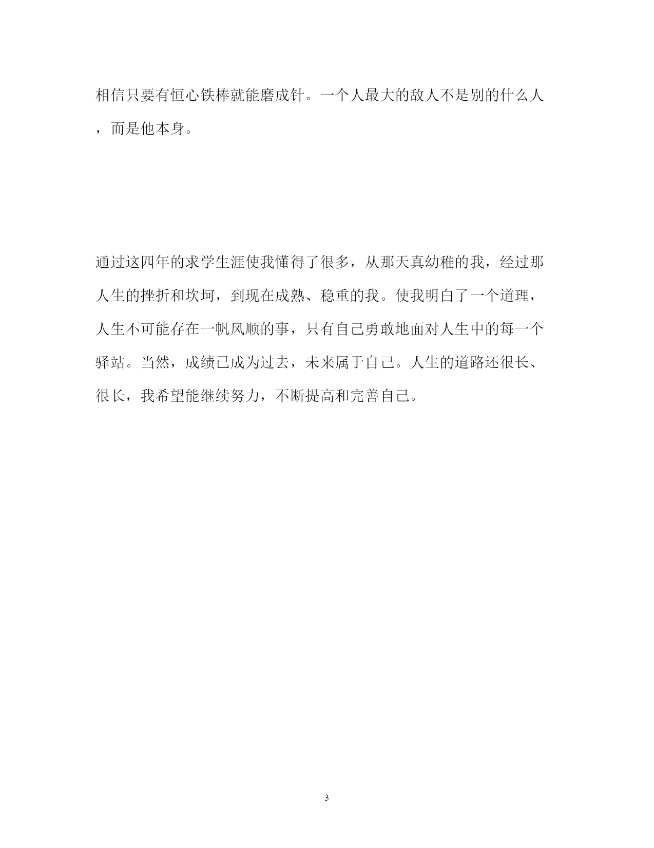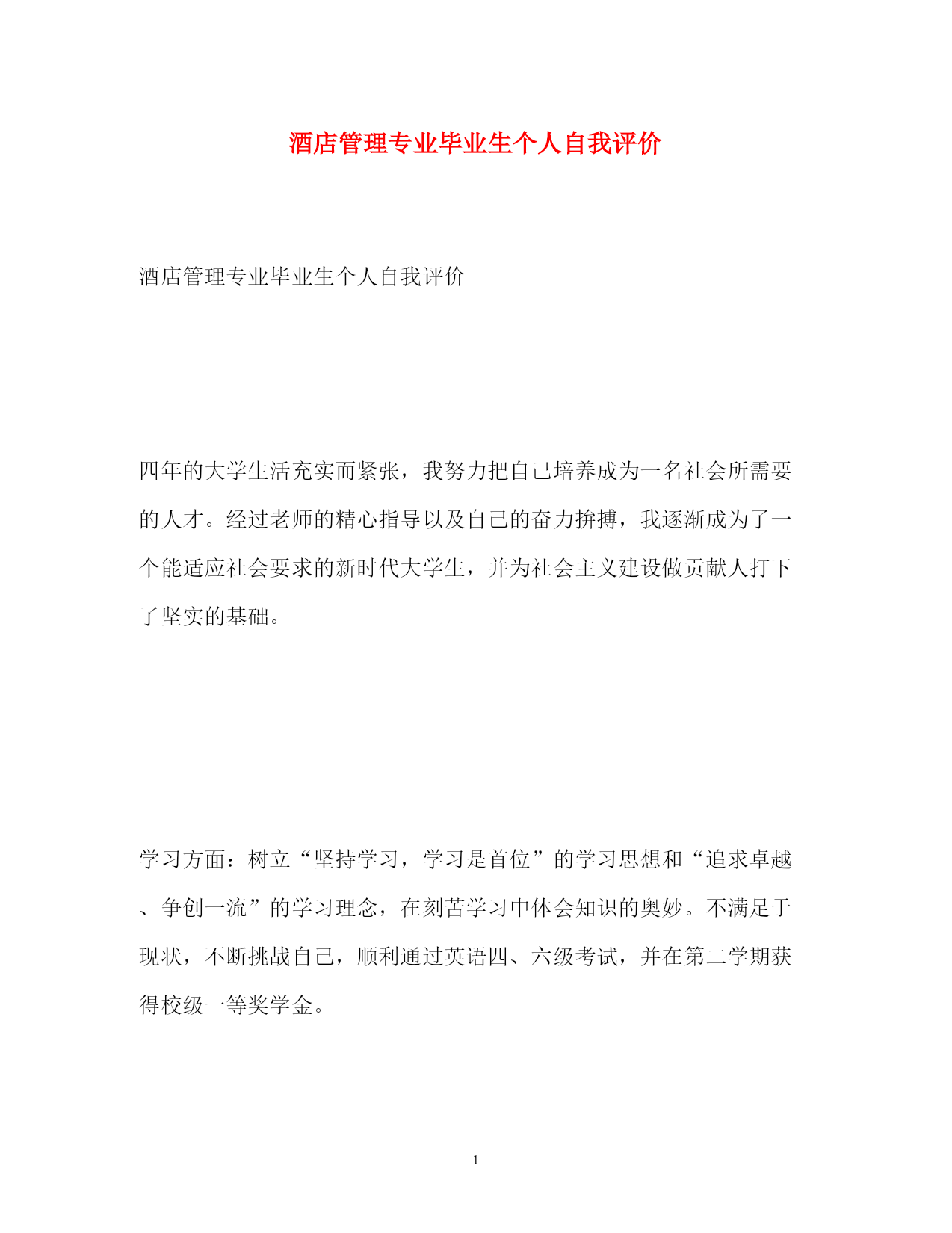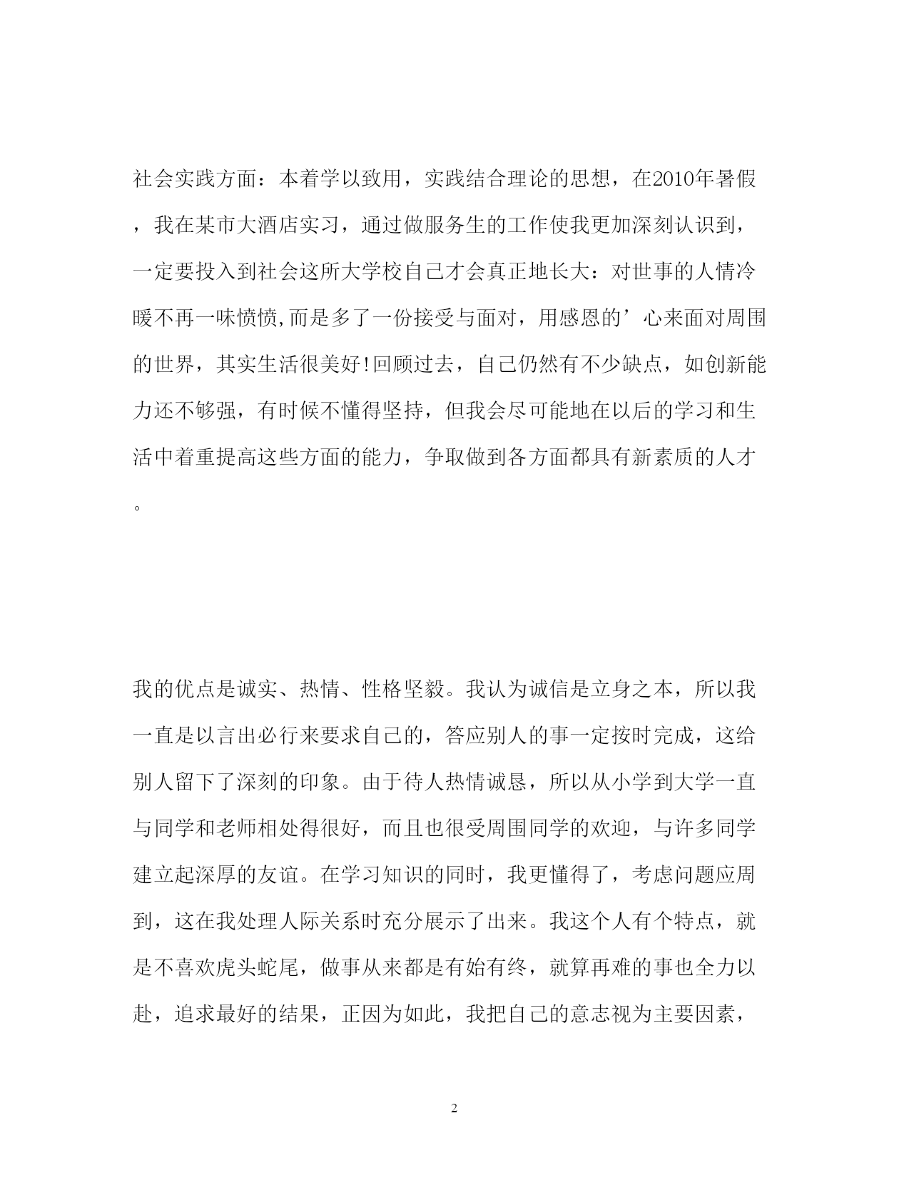 此资料由网络收集而来,如有侵权请告知上传者立即删除。资料共分享,我们负责传递知识。PAGEPAGE3酒店管理专业毕业生个人自我评价酒店管理专业毕业生个人自我评价四年的大学生活充实而紧张,我努力把自己培养成为一名社会所需要的人才。经过老师的精心指导以及自己的奋力拚搏,我逐渐成为了一个能适应社会要求的新时代大学生,并为社会主义建设做贡献人打下了坚实的基础。学习方面:树立“坚持学习,学习是首位”的学习思想和“追求卓越、争创一流”的学习理念,在刻苦学习中体会知识的奥妙。不满足于现状,不断挑战自己,顺利通过英语四、六级考试,并在第二学期获得校级一等奖学金。社会实践方面:本着学以致用,实践结合理论的思想,在2010年暑假,我在某市大酒店实习,通过做服务生的工作使我更加深刻认识到,一定要投入到社会这所大学校自己才会真正地长大:对世事的人情冷暖不再一味愤愤,而是多了一份接受与面对,用感恩的’心来面对周围的世界,其实生活很美好!回顾过去,自己仍然有不少缺点,如创新能力还不够强,有时候不懂得坚持,但我会尽可能地在以后的学习和生活中着重提高这些方面的能力,争取做到各方面都具有新素质的人才。我的优点是诚实、热情、性格坚毅。我认为诚信是立身之本,所以我一直是以言出必行来要求自己的,答应别人的事一定按时完成,这给别人留下了深刻的印象。由于待人热情诚恳,所以从小学到大学一直与同学和老师相处得很好,而且也很受周围同学的欢迎,与许多同学建立起深厚的友谊。在学习知识的同时,我更懂得了,考虑问题应周到,这在我处理人际关系时充分展示了出来。我这个人有个特点,就是不喜欢虎头蛇尾,做事从来都是有始有终,就算再难的事也全力以赴,追求最好的结果,正因为如此,我把自己的意志视为主要因素,相信只要有恒心铁棒就能磨成针。一个人最大的敌人不是别的什么人,而是他本身。通过这四年的求学生涯使我懂得了很多,从那天真幼稚的我,经过那人生的挫折和坎坷,到现在成熟、稳重的我。使我明白了一个道理,人生不可能存在一帆风顺的事,只有自己勇敢地面对人生中的每一个驿站。当然,成绩已成为过去,未来属于自己。人生的道路还很长、很长,我希望能继续努力,不断提高和完善自己。